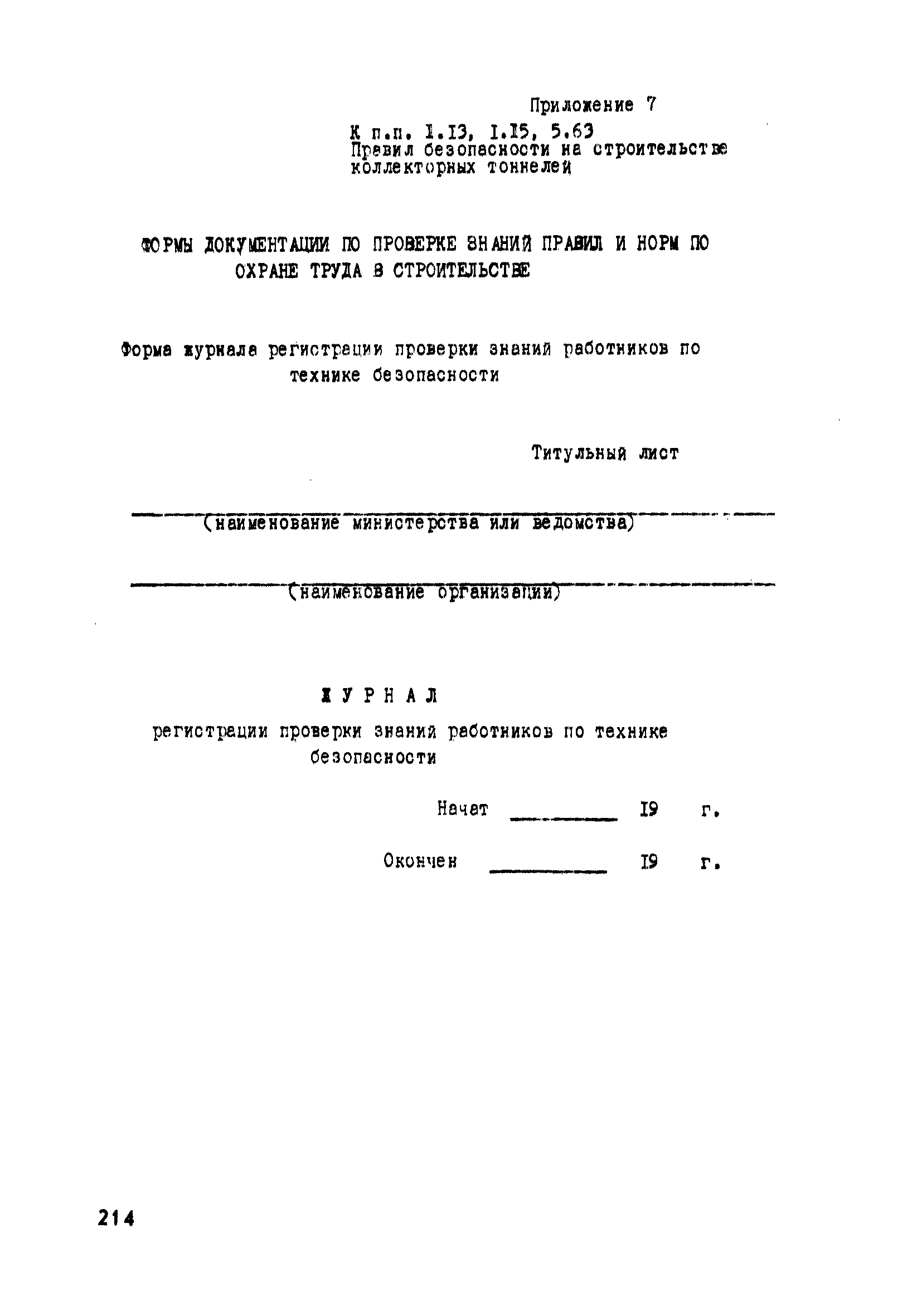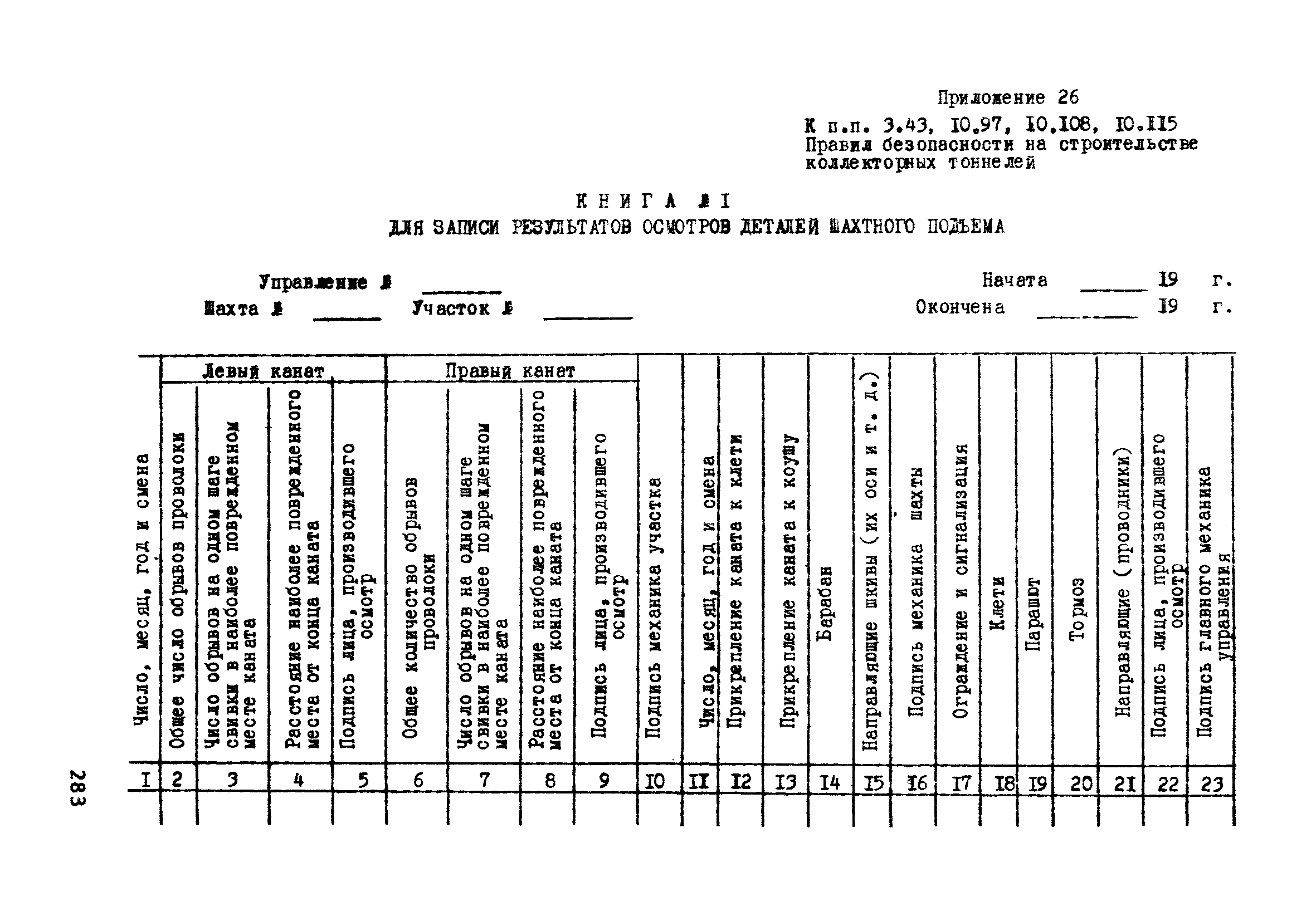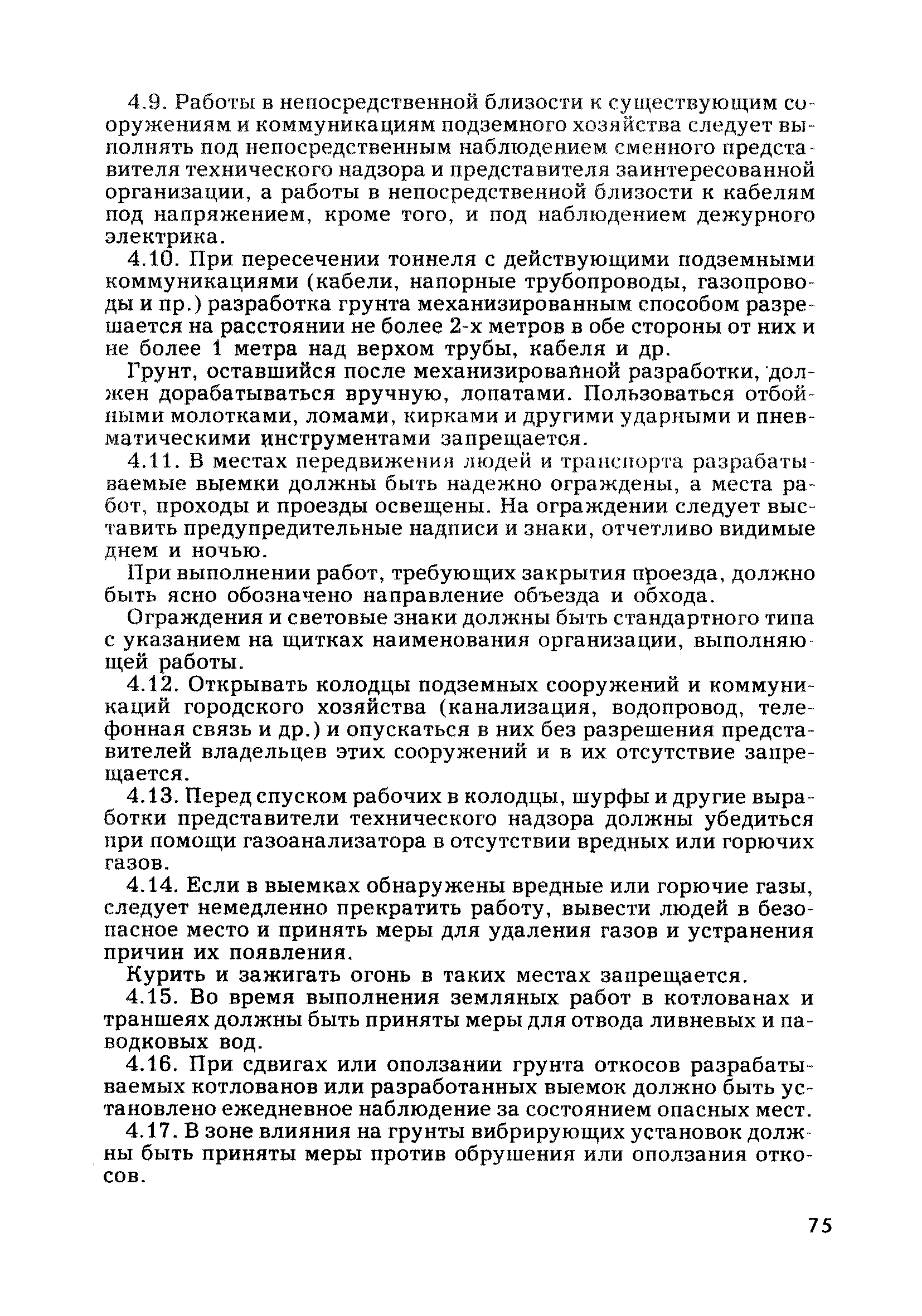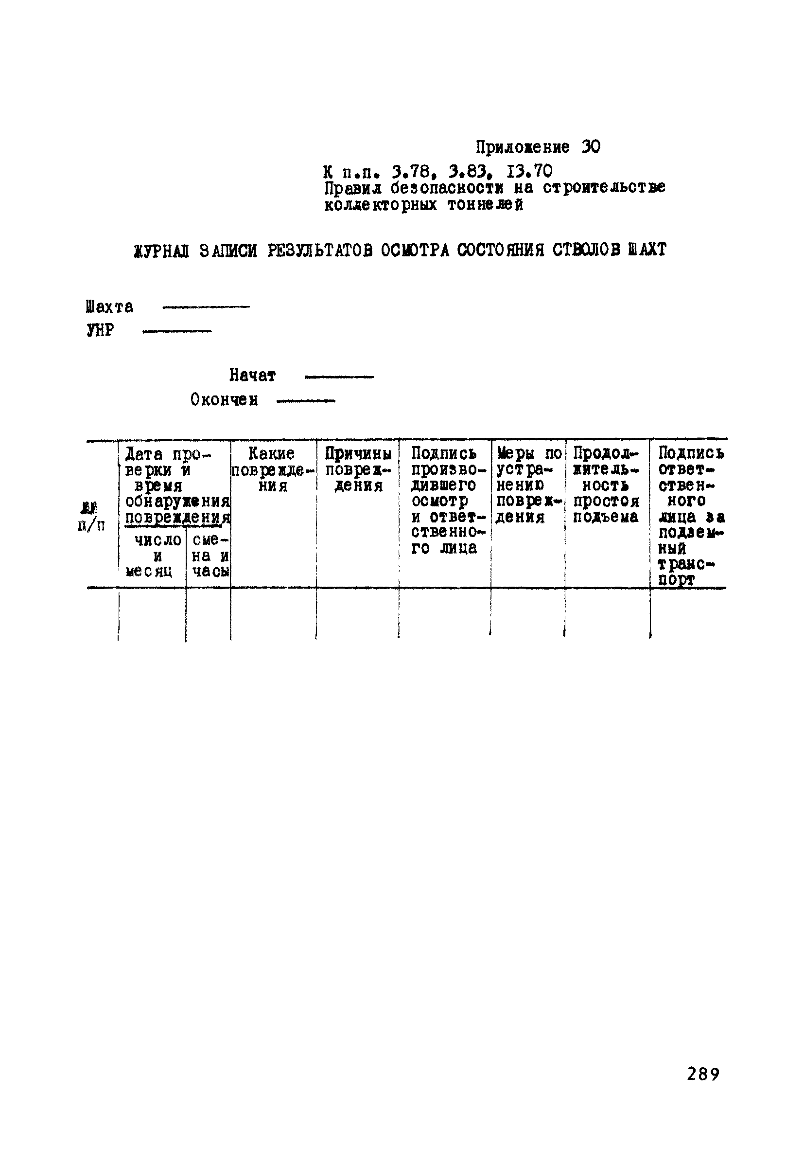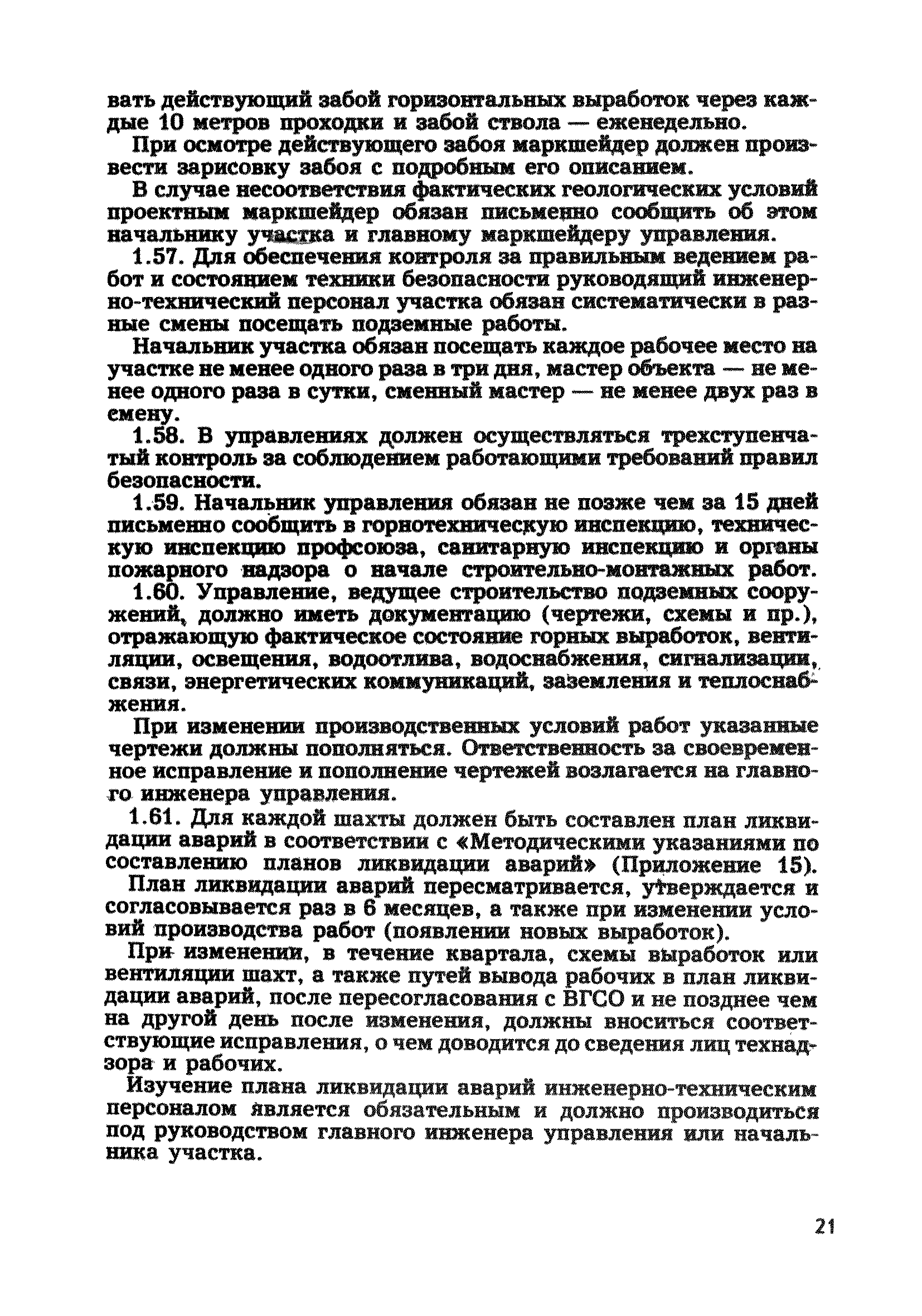 | Оглавление: | Глава 1. Общие правила Глава 2. Строительная площадка Глава 3. Проходка коллекторных тоннелей закрытым способом Глава 4. Сооружение тоннелей открытым способом Глава 5. Специальные способы работ Глава 6. Внутреннее обустройство тоннелей, канализационных насосных станций и стволов шахт Глава 7. Содержание и ликвидация подземных выработок Глава 8. Проветривание подземных выработок Глава 9. Водоотлив Глава 10. Подземный транспорт и шахтный подъем Глава 11. Электротехническое хозяйство Глава 12. Освещение Глава 13. Монтажные и демонтажные работы Глава 14. Строительные машины, механизмы и инструмент Глава 15. Ремонтные работы в действующих тоннельных канализационных коллекторах и шахтах Глава 16. Общие санитарные правила Глава 17. Ответственность за нарушение правил безопасности Приложение 1. Нормы и правила безопасности и производственной санитарии, которыми следует руководствоваться при проектировании и строительстве коллекторных тоннелей и других сооружений Приложение 2. Форма акта-допуска для производства строительно-монтажных работ на территории действующего предприятия Приложение 3. Форма наряда-допуска на производство работ повышенной опасности Приложение 4. Положение о порядке проведения инструктажа и об обучении безопасности труда Приложение 5. Журнал регистрации вводного инструктажа по охране труда Приложение 6. Журнал регистрации инструктажа на рабочем месте Приложение 7. Журнал регистрации проверки знаний работников по технике безопасности Приложение 8. Форма удостоверения для рабочих Приложение 9. Форма удостоверения для инженерно-технических работников Приложение 10. Нормы и сроки испытаний подъемных механизмов и приспособлений Приложение 11. Перечень документации по технике безопасности на объектах работ Приложение 12. Журнал горных работ Приложение 13. Положение о расследовании и учете несчастных случаев на производстве Приложение 14. Журнал проверки техники безопасности (3-ступенчатый контроль) Приложение 15. Методические указания по составлению планов ликвидации аварий Приложение 16. Журнал ознакомления рабочих с планом ликвидации аварий Приложение 17. Предельно допустимые концентрации некоторых вредных веществ в воздухе рабочей зоны Приложение 18. Инструкция по отбору проб воздуха в подземных выработках Приложение 19. Журнал учета результатов анализа воздуха Приложение 20. Книга осмотра вентиляторных установок Приложение 21. Нормы искусственного освещения подземных выработок и открытых строительных площадок при сооружении коллекторных тоннелей Приложение 22. Мероприятия по противопожарной защите при сооружении коллекторных тоннелей Приложение 23. Состав и содержание основных решений по технике безопасности в проектах производства работ (ППР) Приложение 24. Инструкция по составлению паспортов креплений подземных выработок Приложение 25. Книга осмотра крепи и состояния выработок Приложение 26. Книга № 1 для записи результатов осмотра деталей шахтного подъема Приложение 27. Книга № 2 для записи повреждений, обнаруженных на подъемной установке, и мер, принятых к их устранению Приложение 28. Книга № 3 для записи дат навески, снятия и испытания канатов Приложение 29. Нормы браковки стальных канатов Приложение 30. Журнал записи результатов осмотра состояния стволов шахт Приложение 31. Журнал для зап