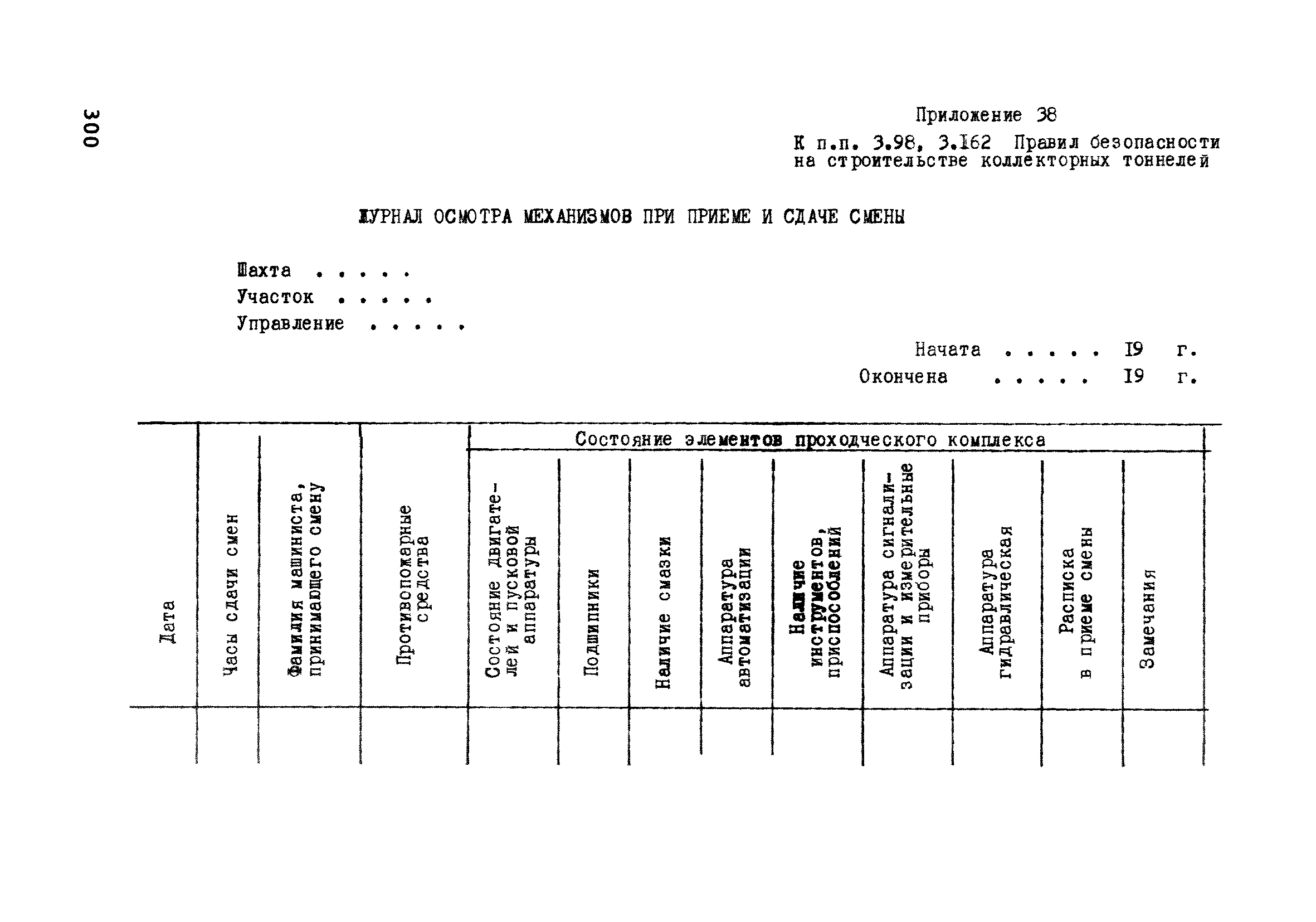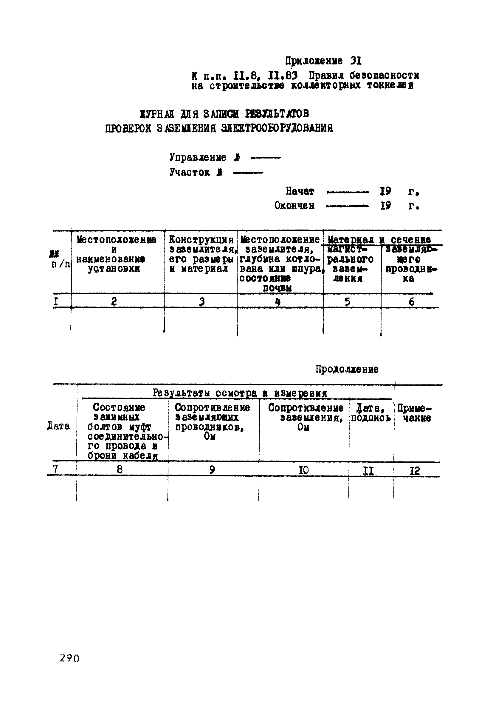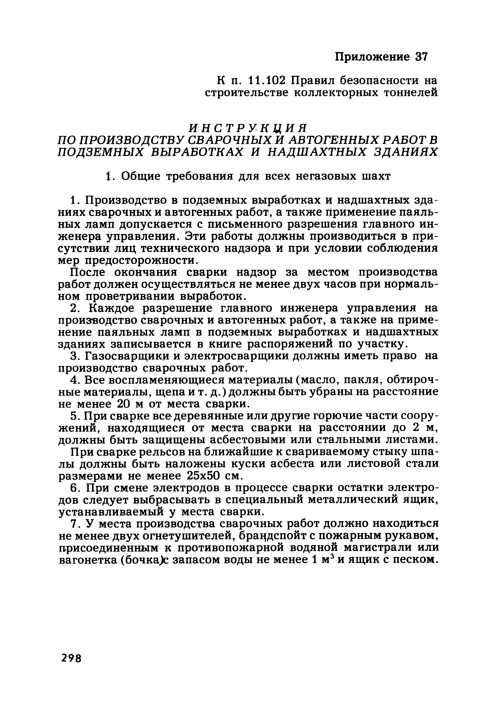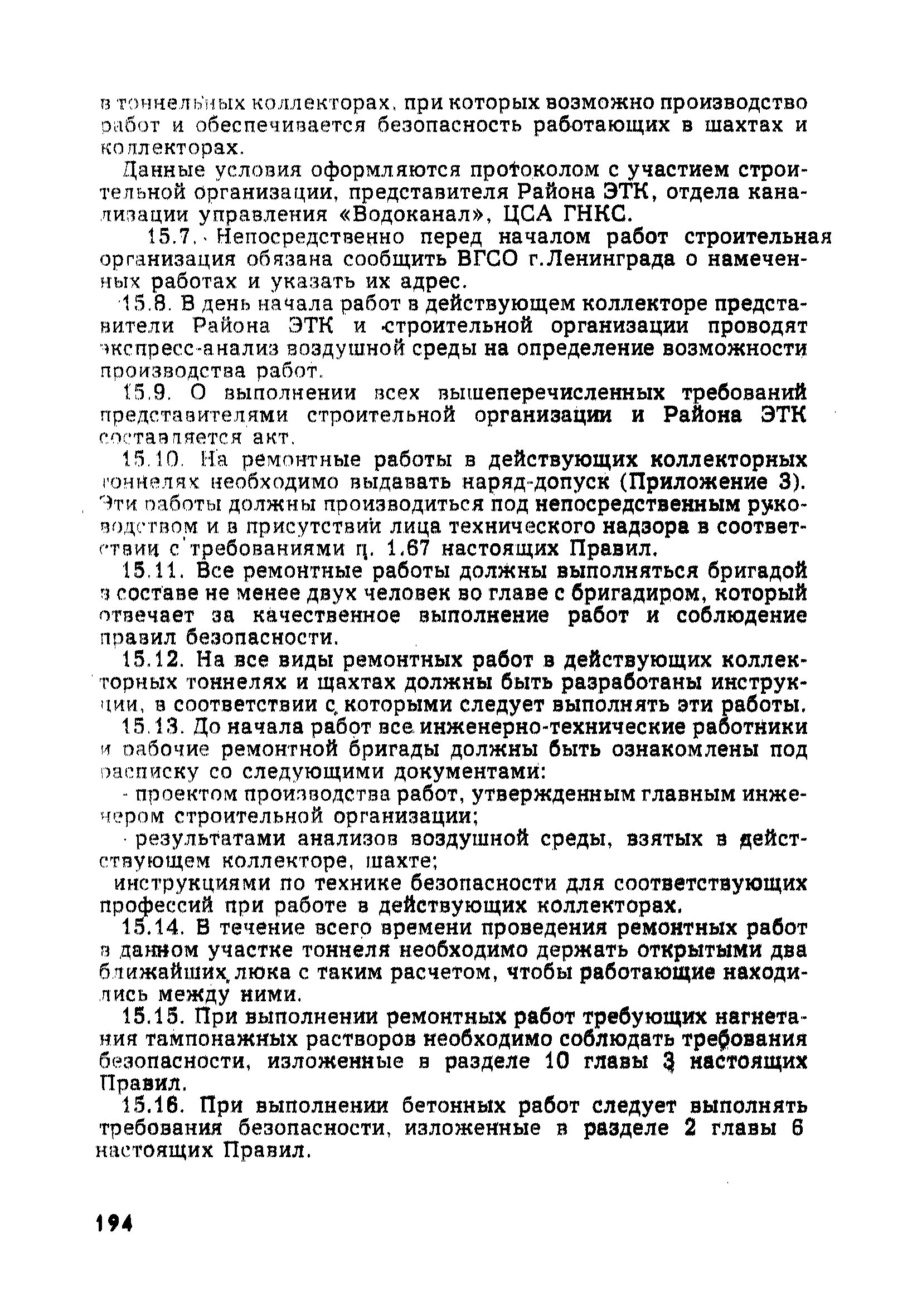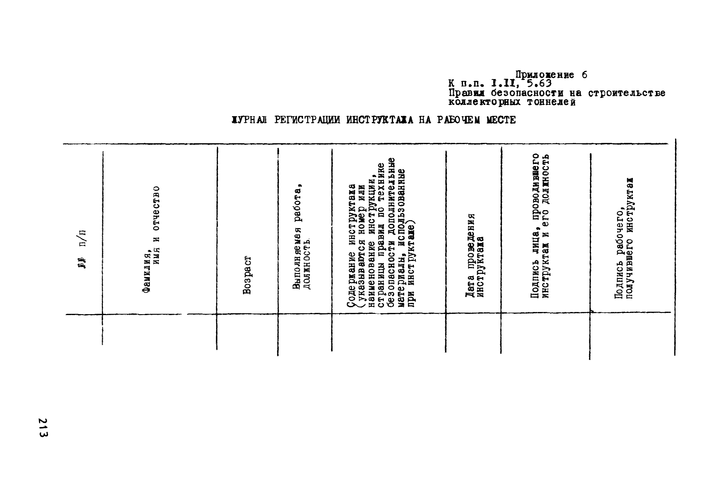 | Оглавление: | Глава 1. Общие правила Глава 2. Строительная площадка Глава 3. Проходка коллекторных тоннелей закрытым способом Глава 4. Сооружение тоннелей открытым способом Глава 5. Специальные способы работ Глава 6. Внутреннее обустройство тоннелей, канализационных насосных станций и стволов шахт Глава 7. Содержание и ликвидация подземных выработок Глава 8. Проветривание подземных выработок Глава 9. Водоотлив Глава 10. Подземный транспорт и шахтный подъем Глава 11. Электротехническое хозяйство Глава 12. Освещение Глава 13. Монтажные и демонтажные работы Глава 14. Строительные машины, механизмы и инструмент Глава 15. Ремонтные работы в действующих тоннельных канализационных коллекторах и шахтах Глава 16. Общие санитарные правила Глава 17. Ответственность за нарушение правил безопасности Приложение 1. Нормы и правила безопасности и производственной санитарии, которыми следует руководствоваться при проектировании и строительстве коллекторных тоннелей и других сооружений Приложение 2. Форма акта-допуска для производства строительно-монтажных работ на территории действующего предприятия Приложение 3. Форма наряда-допуска на производство работ повышенной опасности Приложение 4. Положение о порядке проведения инструктажа и об обучении безопасности труда Приложение 5. Журнал регистрации вводного инструктажа по охране труда Приложение 6. Журнал регистрации инструктажа на рабочем месте Приложение 7. Журнал регистрации проверки знаний работников по технике безопасности Приложение 8. Форма удостоверения для рабочих Приложение 9. Форма удостоверения для инженерно-технических работников Приложение 10. Нормы и сроки испытаний подъемных механизмов и приспособлений Приложение 11. Перечень документации по технике безопасности на объектах работ Приложение 12. Журнал горных работ Приложение 13. Положение о расследовании и учете несчастных случаев на производстве Приложение 14. Журнал проверки техники безопасности (3-ступенчатый контроль) Приложение 15. Методические указания по составлению планов ликвидации аварий Приложение 16. Журнал ознакомления рабочих с планом ликвидации аварий Приложение 17. Предельно допустимые концентрации некоторых вредных веществ в воздухе рабочей зоны Приложение 18. Инструкция по отбору проб воздуха в подземных выработках Приложение 19. Журнал учета результатов анализа воздуха Приложение 20. Книга осмотра вентиляторных установок Приложение 21. Нормы искусственного освещения подземных выработок и открытых строительных площадок при сооружении коллекторных тоннелей Приложение 22. Мероприятия по противопожарной защите при сооружении коллекторных тоннелей Приложение 23. Состав и содержание основных решений по технике безопасности в проектах производства работ (ППР) Приложение 24. Инструкция по составлению паспортов креплений подземных выработок Приложение 25. Книга осмотра крепи и состояния выработок Приложение 26. Книга № 1 для записи результатов осмотра деталей шахтного подъема Приложение 27. Книга № 2 для записи повреждений, обнаруженных на подъемной установке, и мер, принятых к их устранению Приложение 28. Книга № 3 для записи дат навески, снятия и испытания канатов Приложение 29. Нормы браковки стальных канатов Приложение 30. Журнал записи результатов осмотра состояния стволов шахт Приложение 31. Журнал для зап