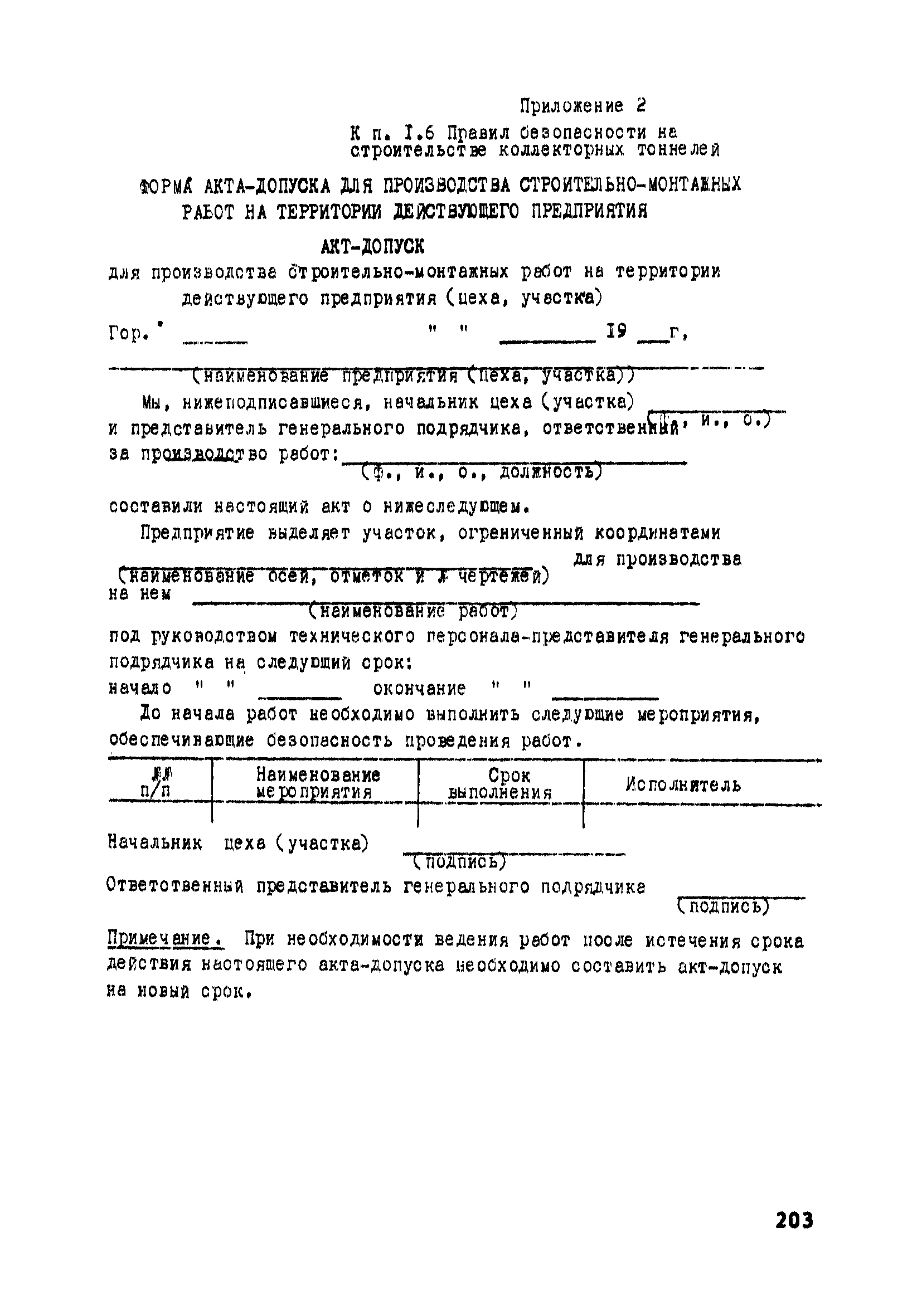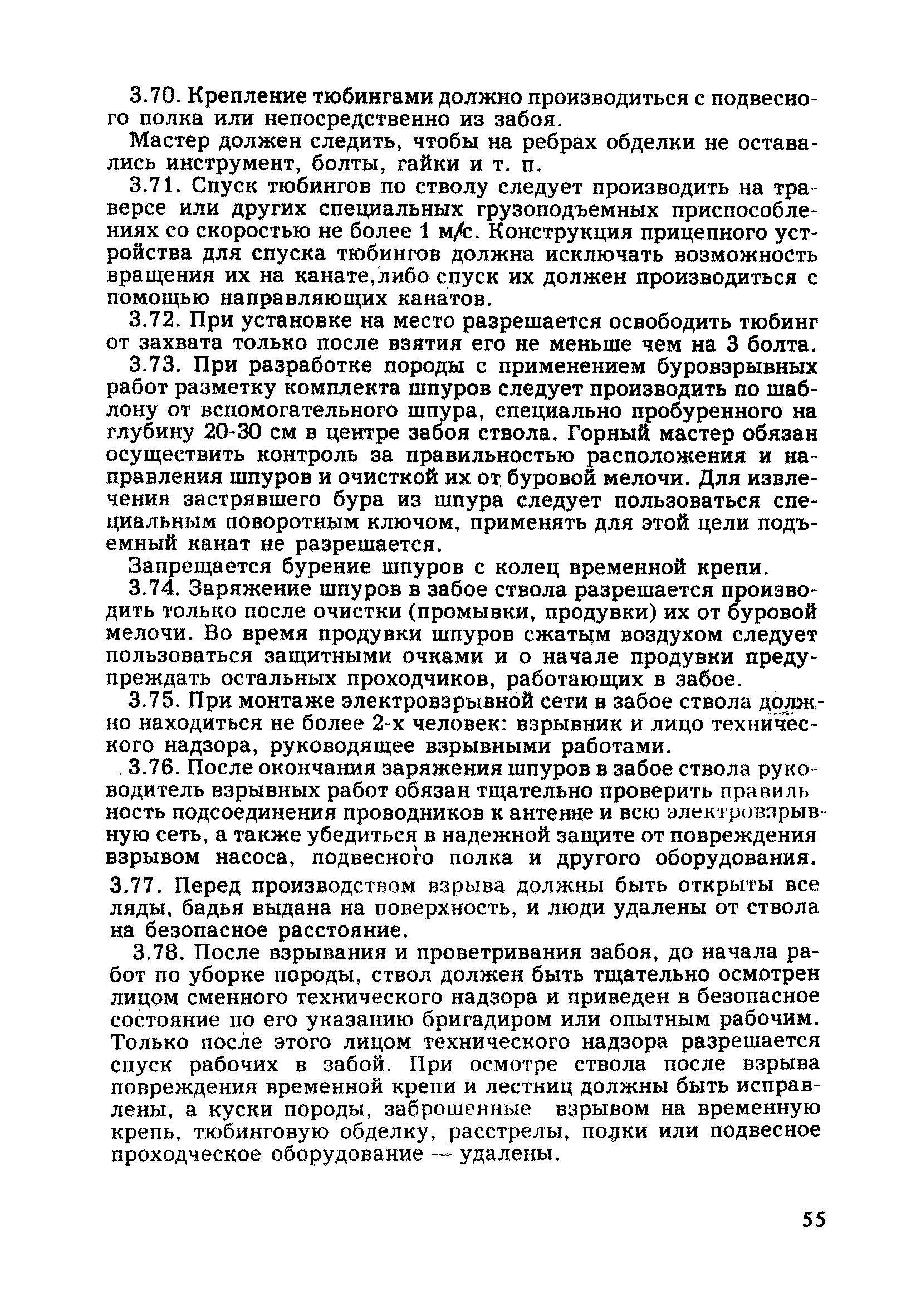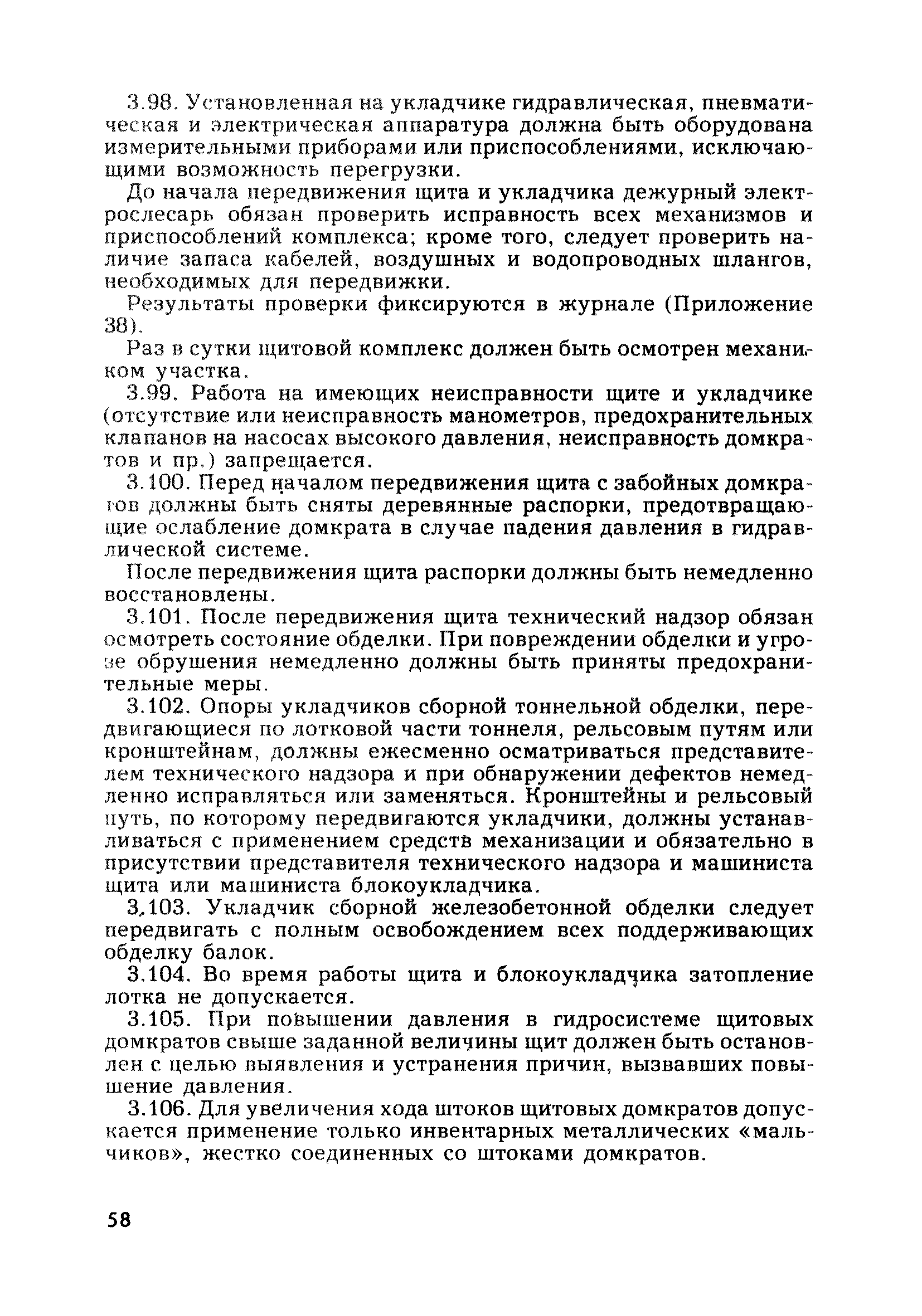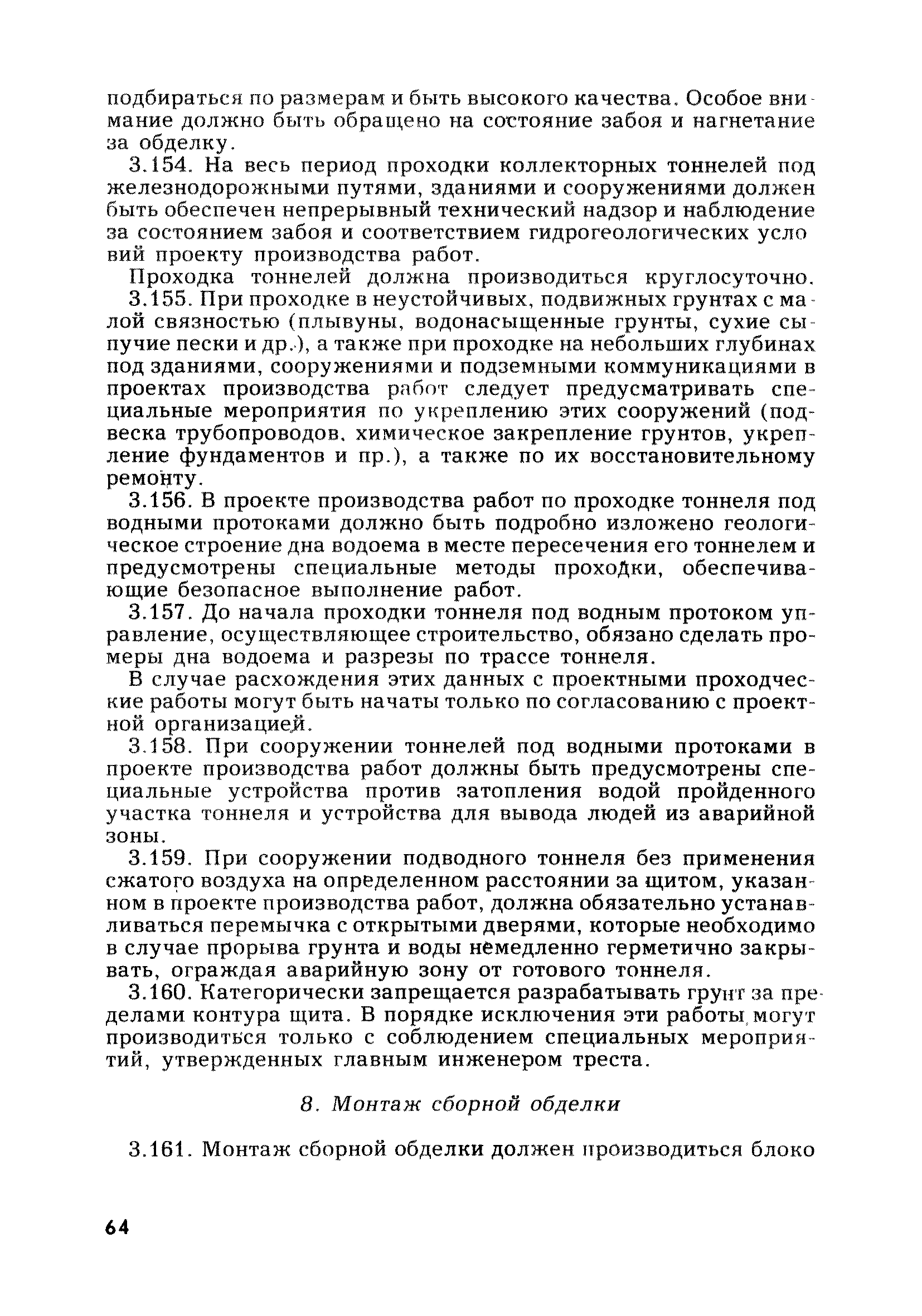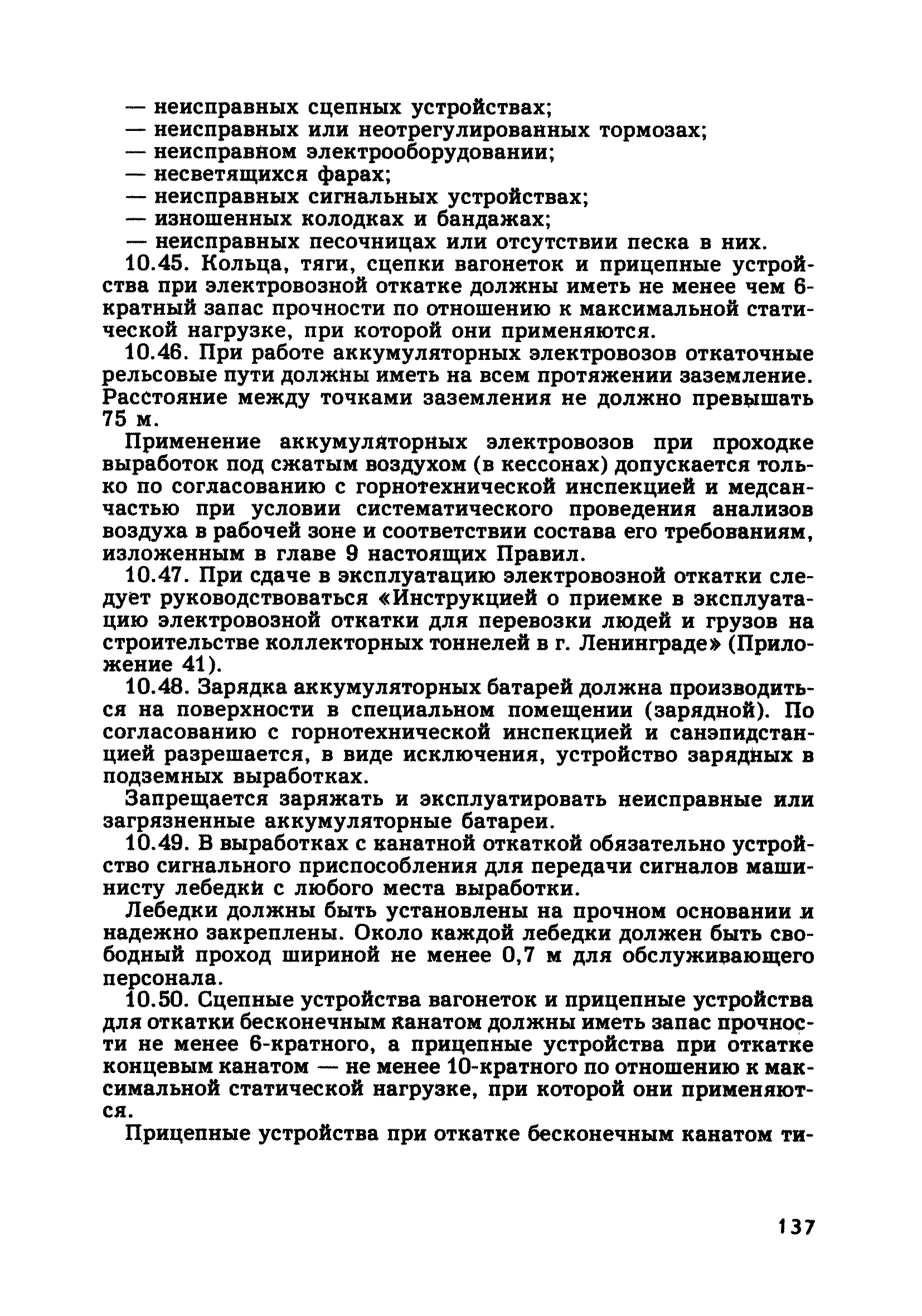 | Оглавление: | Глава 1. Общие правила Глава 2. Строительная площадка Глава 3. Проходка коллекторных тоннелей закрытым способом Глава 4. Сооружение тоннелей открытым способом Глава 5. Специальные способы работ Глава 6. Внутреннее обустройство тоннелей, канализационных насосных станций и стволов шахт Глава 7. Содержание и ликвидация подземных выработок Глава 8. Проветривание подземных выработок Глава 9. Водоотлив Глава 10. Подземный транспорт и шахтный подъем Глава 11. Электротехническое хозяйство Глава 12. Освещение Глава 13. Монтажные и демонтажные работы Глава 14. Строительные машины, механизмы и инструмент Глава 15. Ремонтные работы в действующих тоннельных канализационных коллекторах и шахтах Глава 16. Общие санитарные правила Глава 17. Ответственность за нарушение правил безопасности Приложение 1. Нормы и правила безопасности и производственной санитарии, которыми следует руководствоваться при проектировании и строительстве коллекторных тоннелей и других сооружений Приложение 2. Форма акта-допуска для производства строительно-монтажных работ на территории действующего предприятия Приложение 3. Форма наряда-допуска на производство работ повышенной опасности Приложение 4. Положение о порядке проведения инструктажа и об обучении безопасности труда Приложение 5. Журнал регистрации вводного инструктажа по охране труда Приложение 6. Журнал регистрации инструктажа на рабочем месте Приложение 7. Журнал регистрации проверки знаний работников по технике безопасности Приложение 8. Форма удостоверения для рабочих Приложение 9. Форма удостоверения для инженерно-технических работников Приложение 10. Нормы и сроки испытаний подъемных механизмов и приспособлений Приложение 11. Перечень документации по технике безопасности на объектах работ Приложение 12. Журнал горных работ Приложение 13. Положение о расследовании и учете несчастных случаев на производстве Приложение 14. Журнал проверки техники безопасности (3-ступенчатый контроль) Приложение 15. Методические указания по составлению планов ликвидации аварий Приложение 16. Журнал ознакомления рабочих с планом ликвидации аварий Приложение 17. Предельно допустимые концентрации некоторых вредных веществ в воздухе рабочей зоны Приложение 18. Инструкция по отбору проб воздуха в подземных выработках Приложение 19. Журнал учета результатов анализа воздуха Приложение 20. Книга осмотра вентиляторных установок Приложение 21. Нормы искусственного освещения подземных выработок и открытых строительных площадок при сооружении коллекторных тоннелей Приложение 22. Мероприятия по противопожарной защите при сооружении коллекторных тоннелей Приложение 23. Состав и содержание основных решений по технике безопасности в проектах производства работ (ППР) Приложение 24. Инструкция по составлению паспортов креплений подземных выработок Приложение 25. Книга осмотра крепи и состояния выработок Приложение 26. Книга № 1 для записи результатов осмотра деталей шахтного подъема Приложение 27. Книга № 2 для записи повреждений, обнаруженных на подъемной установке, и мер, принятых к их устранению Приложение 28. Книга № 3 для записи дат навески, снятия и испытания канатов Приложение 29. Нормы браковки стальных канатов Приложение 30. Журнал записи результатов осмотра состояния стволов шахт Приложение 31. Журнал для зап