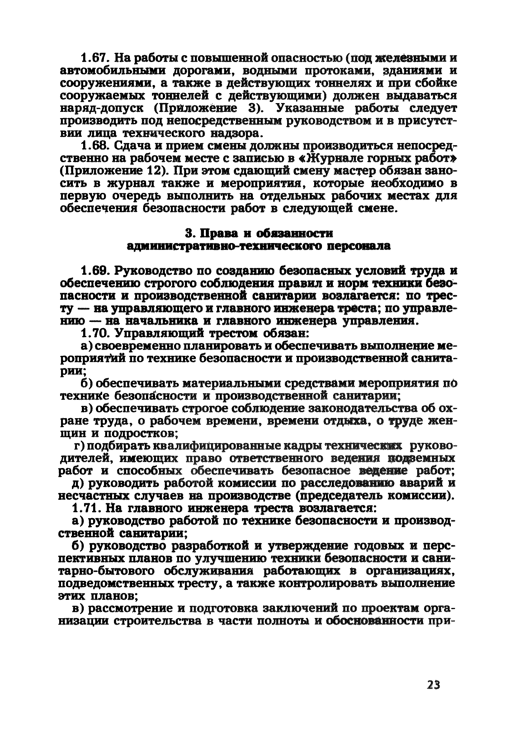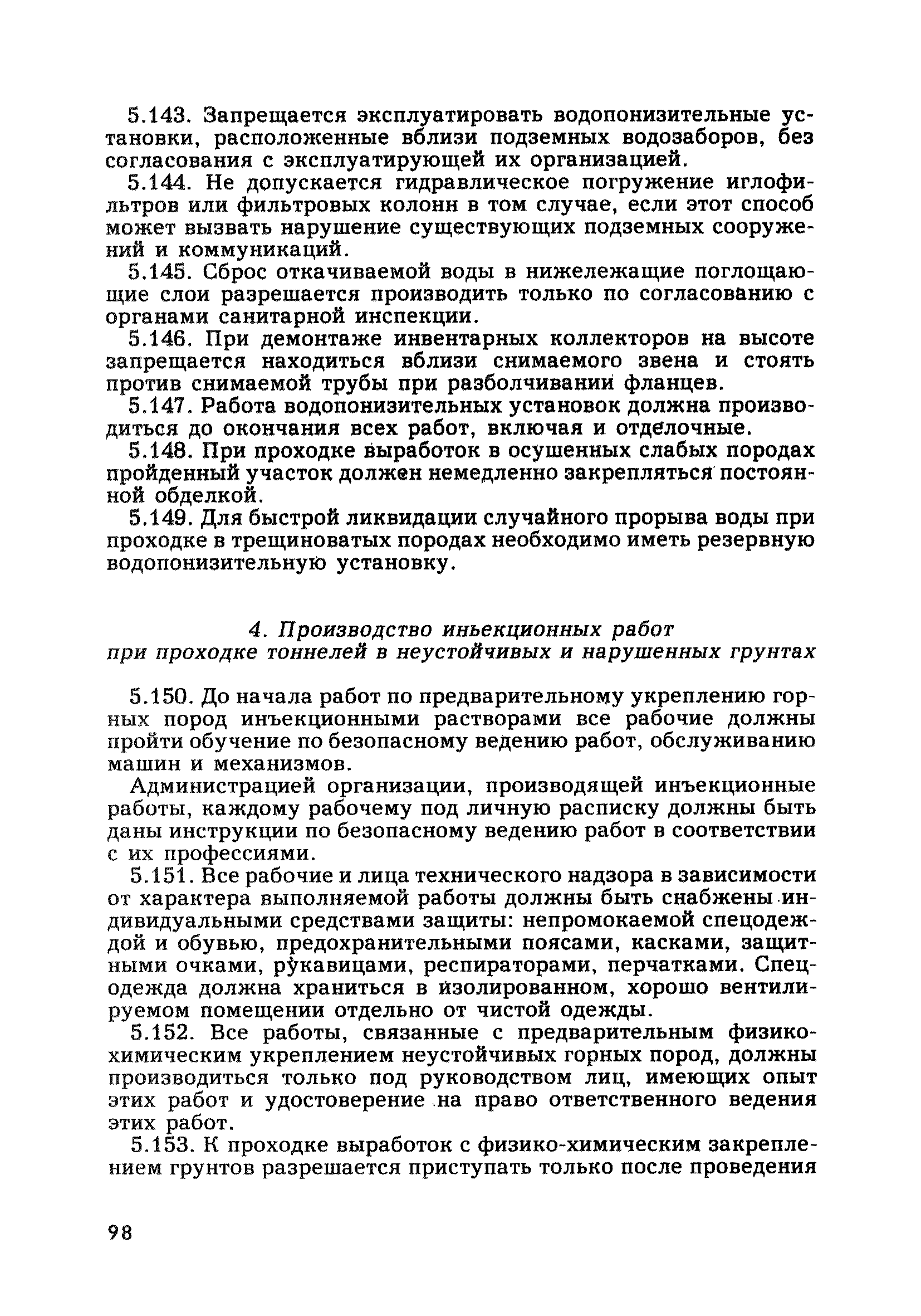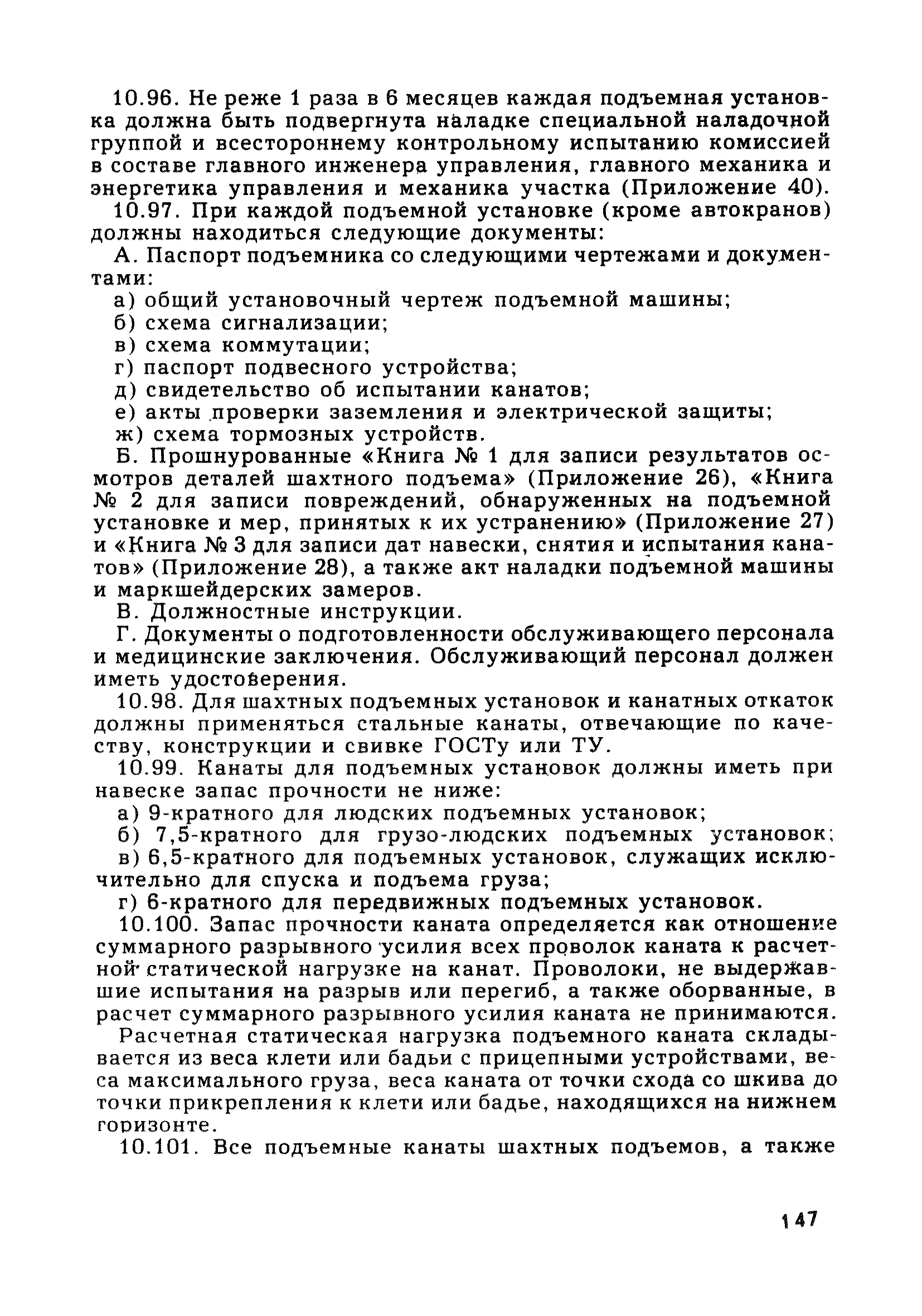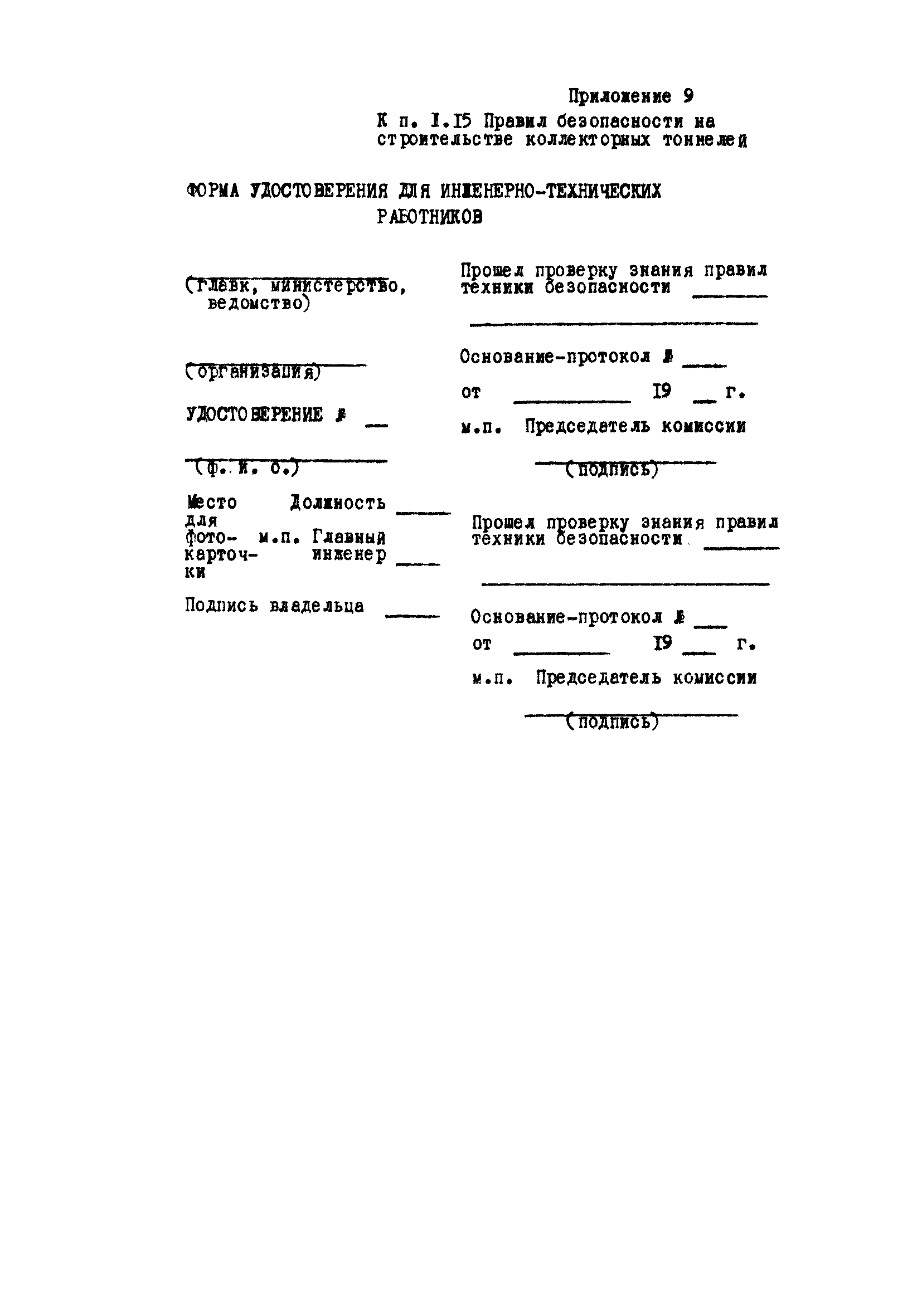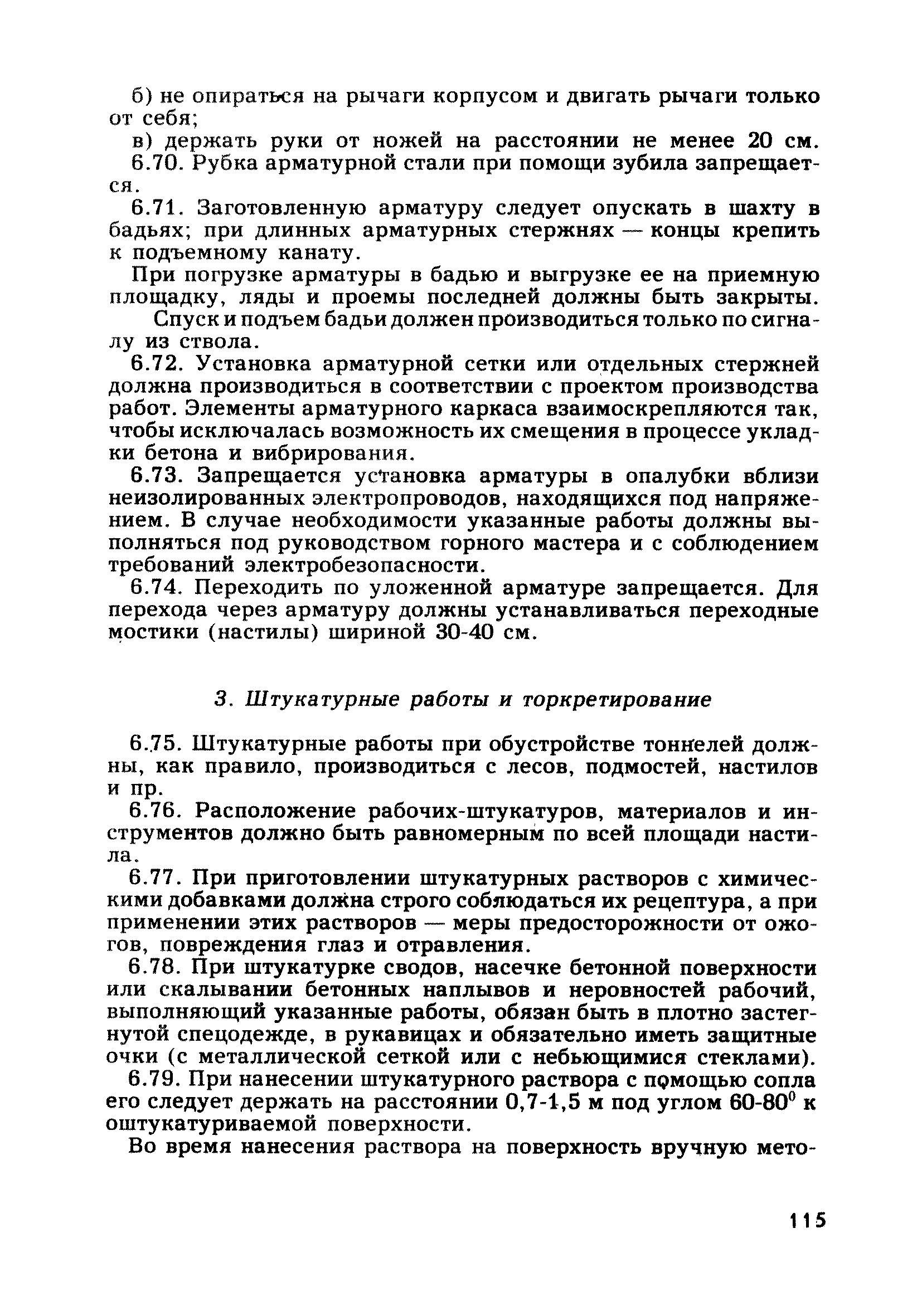 | Оглавление: | Глава 1. Общие правила Глава 2. Строительная площадка Глава 3. Проходка коллекторных тоннелей закрытым способом Глава 4. Сооружение тоннелей открытым способом Глава 5. Специальные способы работ Глава 6. Внутреннее обустройство тоннелей, канализационных насосных станций и стволов шахт Глава 7. Содержание и ликвидация подземных выработок Глава 8. Проветривание подземных выработок Глава 9. Водоотлив Глава 10. Подземный транспорт и шахтный подъем Глава 11. Электротехническое хозяйство Глава 12. Освещение Глава 13. Монтажные и демонтажные работы Глава 14. Строительные машины, механизмы и инструмент Глава 15. Ремонтные работы в действующих тоннельных канализационных коллекторах и шахтах Глава 16. Общие санитарные правила Глава 17. Ответственность за нарушение правил безопасности Приложение 1. Нормы и правила безопасности и производственной санитарии, которыми следует руководствоваться при проектировании и строительстве коллекторных тоннелей и других сооружений Приложение 2. Форма акта-допуска для производства строительно-монтажных работ на территории действующего предприятия Приложение 3. Форма наряда-допуска на производство работ повышенной опасности Приложение 4. Положение о порядке проведения инструктажа и об обучении безопасности труда Приложение 5. Журнал регистрации вводного инструктажа по охране труда Приложение 6. Журнал регистрации инструктажа на рабочем месте Приложение 7. Журнал регистрации проверки знаний работников по технике безопасности Приложение 8. Форма удостоверения для рабочих Приложение 9. Форма удостоверения для инженерно-технических работников Приложение 10. Нормы и сроки испытаний подъемных механизмов и приспособлений Приложение 11. Перечень документации по технике безопасности на объектах работ Приложение 12. Журнал горных работ Приложение 13. Положение о расследовании и учете несчастных случаев на производстве Приложение 14. Журнал проверки техники безопасности (3-ступенчатый контроль) Приложение 15. Методические указания по составлению планов ликвидации аварий Приложение 16. Журнал ознакомления рабочих с планом ликвидации аварий Приложение 17. Предельно допустимые концентрации некоторых вредных веществ в воздухе рабочей зоны Приложение 18. Инструкция по отбору проб воздуха в подземных выработках Приложение 19. Журнал учета результатов анализа воздуха Приложение 20. Книга осмотра вентиляторных установок Приложение 21. Нормы искусственного освещения подземных выработок и открытых строительных площадок при сооружении коллекторных тоннелей Приложение 22. Мероприятия по противопожарной защите при сооружении коллекторных тоннелей Приложение 23. Состав и содержание основных решений по технике безопасности в проектах производства работ (ППР) Приложение 24. Инструкция по составлению паспортов креплений подземных выработок Приложение 25. Книга осмотра крепи и состояния выработок Приложение 26. Книга № 1 для записи результатов осмотра деталей шахтного подъема Приложение 27. Книга № 2 для записи повреждений, обнаруженных на подъемной установке, и мер, принятых к их устранению Приложение 28. Книга № 3 для записи дат навески, снятия и испытания канатов Приложение 29. Нормы браковки стальных канатов Приложение 30. Журнал записи результатов осмотра состояния стволов шахт Приложение 31. Журнал для зап