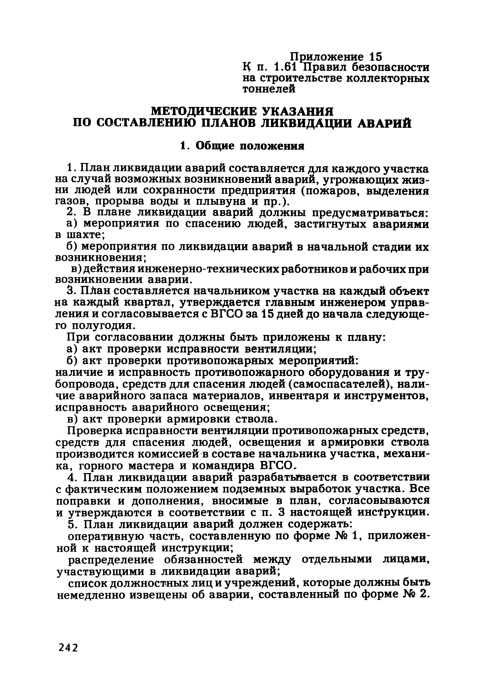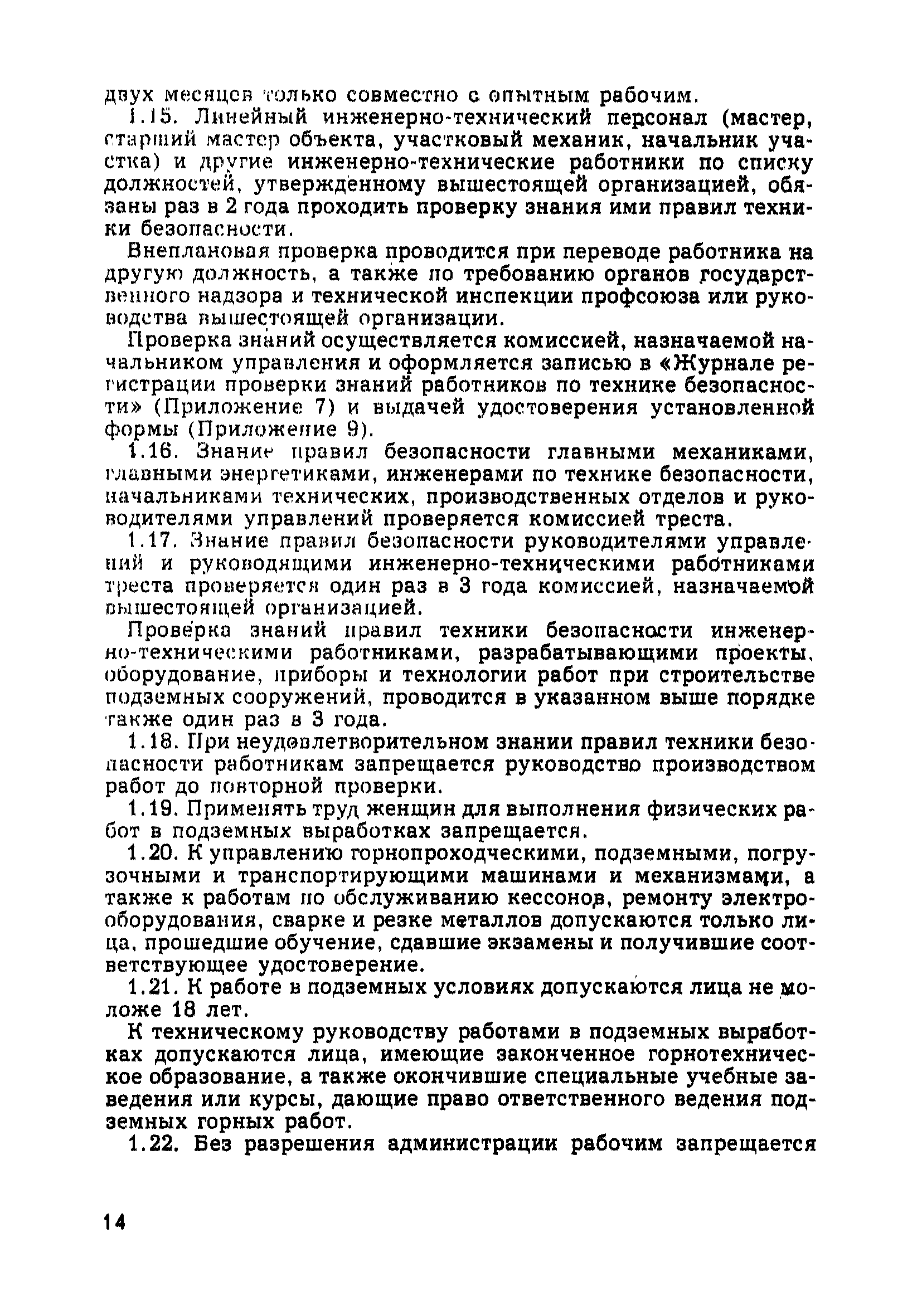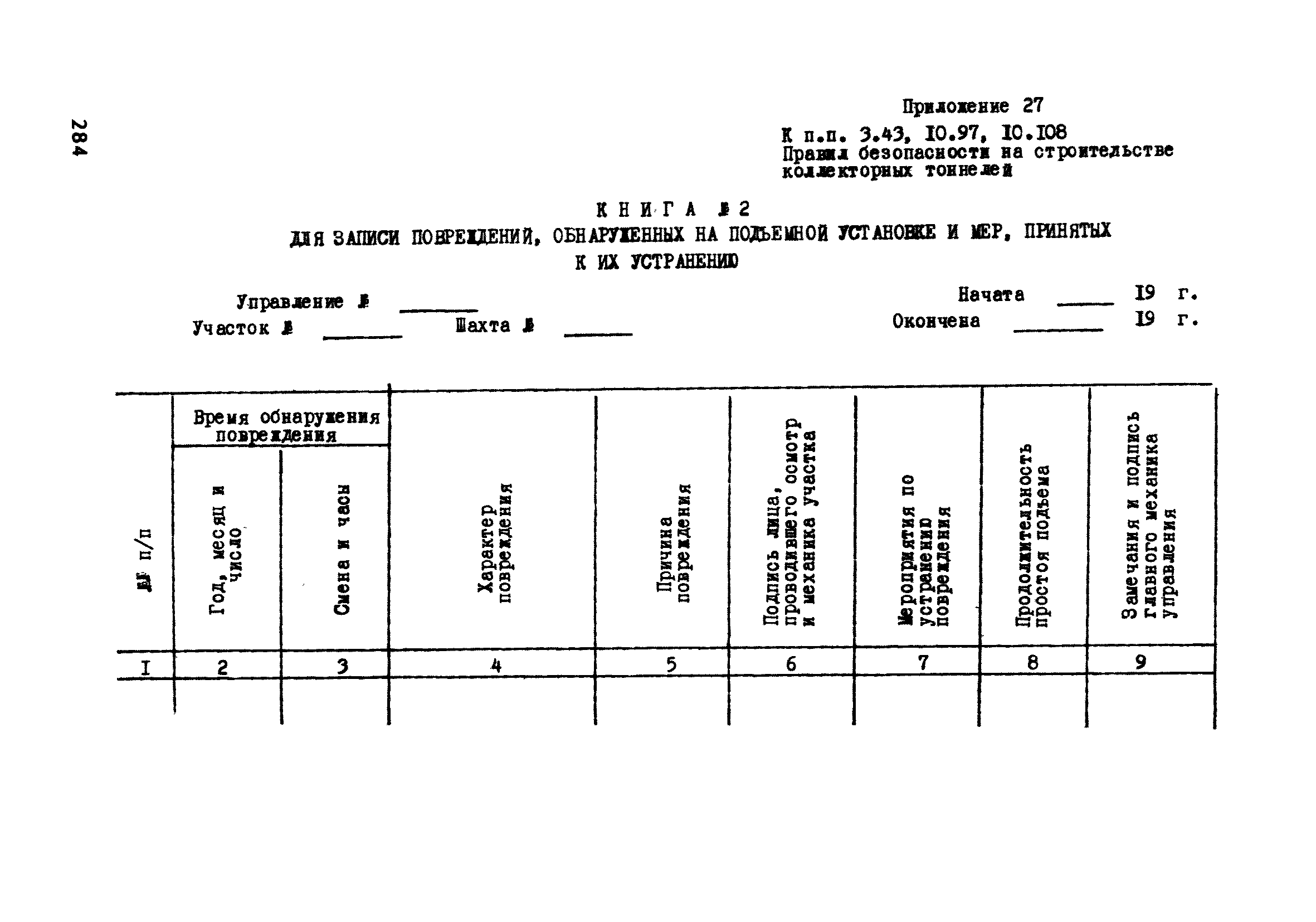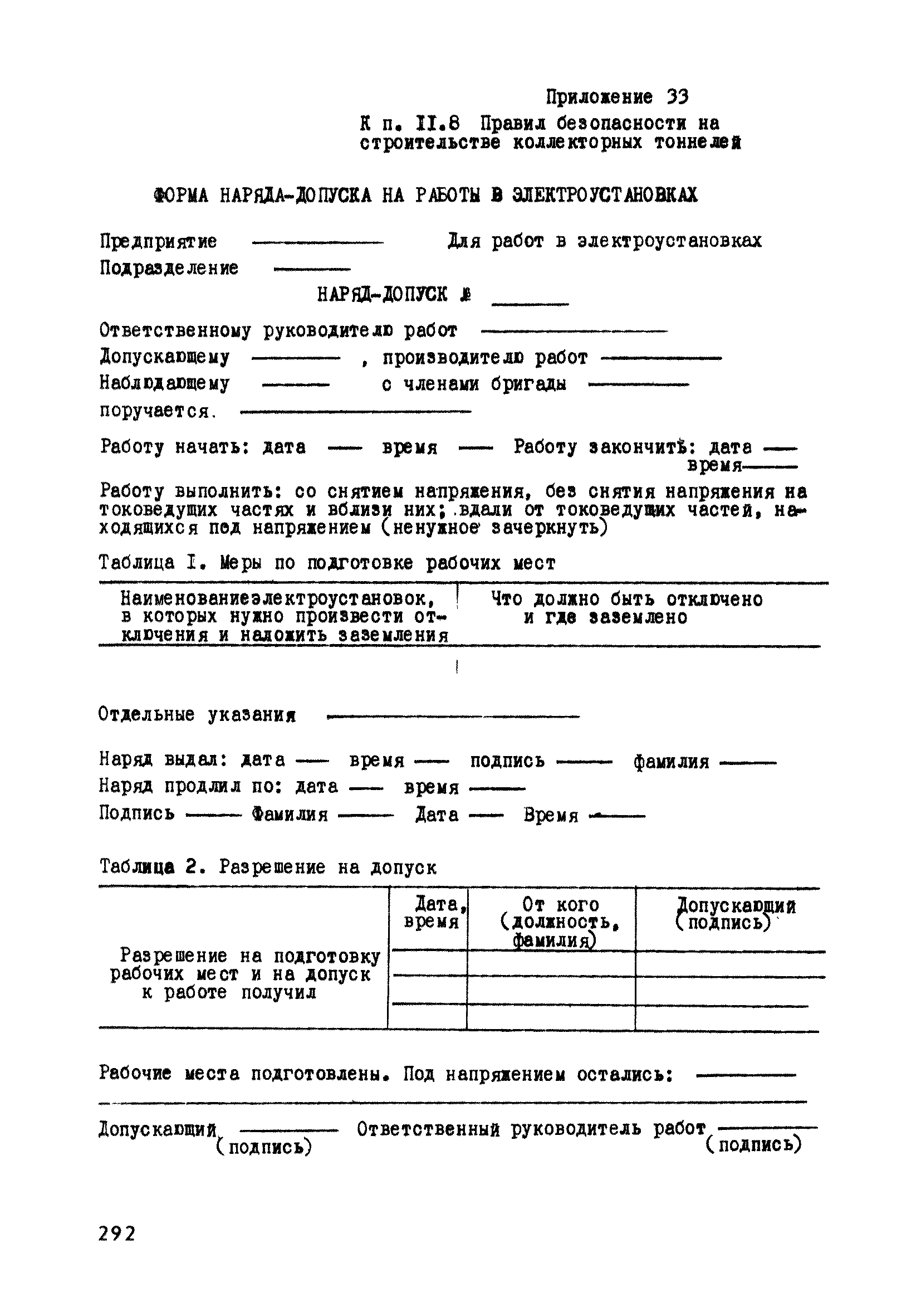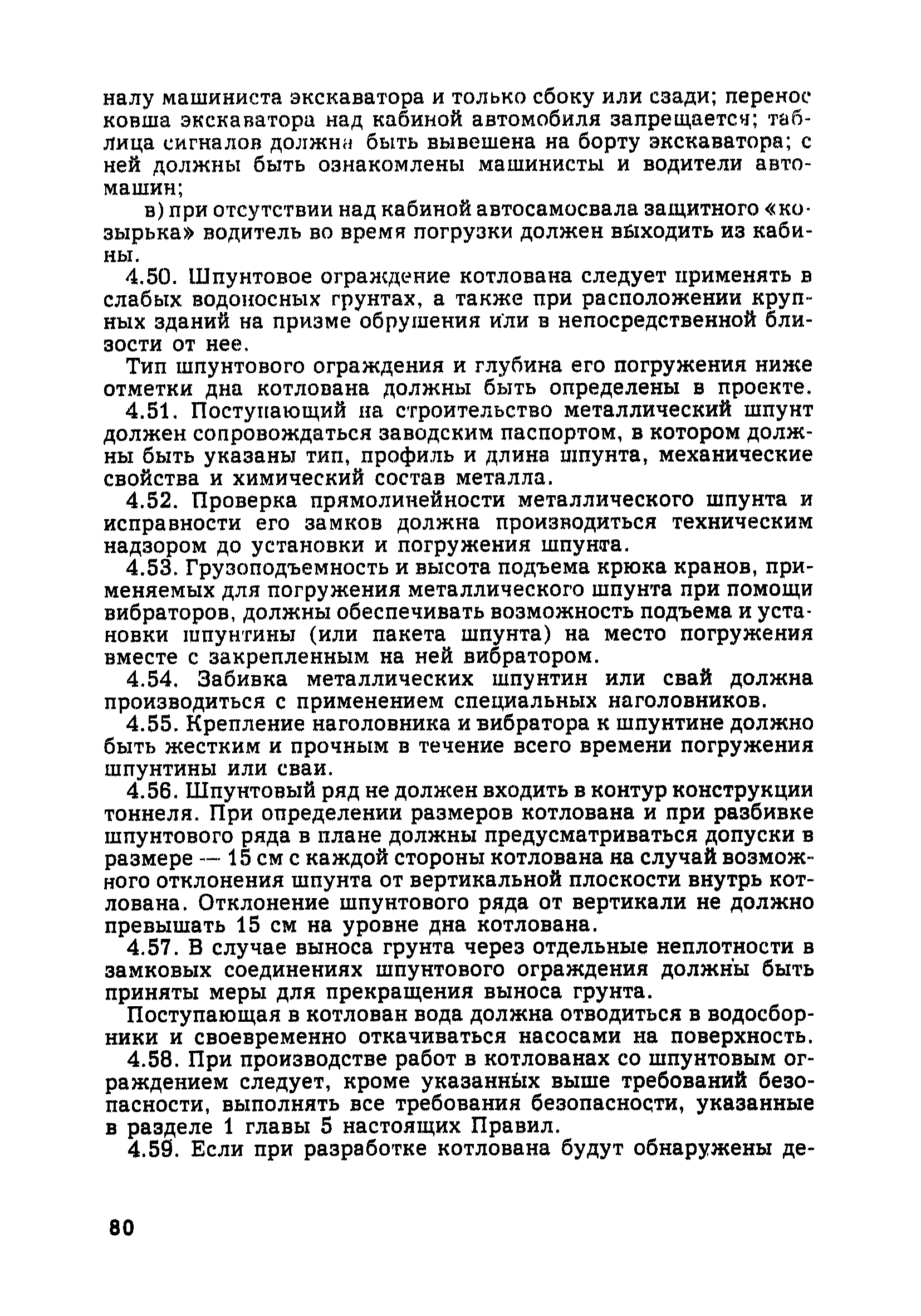 | Оглавление: | Глава 1. Общие правила Глава 2. Строительная площадка Глава 3. Проходка коллекторных тоннелей закрытым способом Глава 4. Сооружение тоннелей открытым способом Глава 5. Специальные способы работ Глава 6. Внутреннее обустройство тоннелей, канализационных насосных станций и стволов шахт Глава 7. Содержание и ликвидация подземных выработок Глава 8. Проветривание подземных выработок Глава 9. Водоотлив Глава 10. Подземный транспорт и шахтный подъем Глава 11. Электротехническое хозяйство Глава 12. Освещение Глава 13. Монтажные и демонтажные работы Глава 14. Строительные машины, механизмы и инструмент Глава 15. Ремонтные работы в действующих тоннельных канализационных коллекторах и шахтах Глава 16. Общие санитарные правила Глава 17. Ответственность за нарушение правил безопасности Приложение 1. Нормы и правила безопасности и производственной санитарии, которыми следует руководствоваться при проектировании и строительстве коллекторных тоннелей и других сооружений Приложение 2. Форма акта-допуска для производства строительно-монтажных работ на территории действующего предприятия Приложение 3. Форма наряда-допуска на производство работ повышенной опасности Приложение 4. Положение о порядке проведения инструктажа и об обучении безопасности труда Приложение 5. Журнал регистрации вводного инструктажа по охране труда Приложение 6. Журнал регистрации инструктажа на рабочем месте Приложение 7. Журнал регистрации проверки знаний работников по технике безопасности Приложение 8. Форма удостоверения для рабочих Приложение 9. Форма удостоверения для инженерно-технических работников Приложение 10. Нормы и сроки испытаний подъемных механизмов и приспособлений Приложение 11. Перечень документации по технике безопасности на объектах работ Приложение 12. Журнал горных работ Приложение 13. Положение о расследовании и учете несчастных случаев на производстве Приложение 14. Журнал проверки техники безопасности (3-ступенчатый контроль) Приложение 15. Методические указания по составлению планов ликвидации аварий Приложение 16. Журнал ознакомления рабочих с планом ликвидации аварий Приложение 17. Предельно допустимые концентрации некоторых вредных веществ в воздухе рабочей зоны Приложение 18. Инструкция по отбору проб воздуха в подземных выработках Приложение 19. Журнал учета результатов анализа воздуха Приложение 20. Книга осмотра вентиляторных установок Приложение 21. Нормы искусственного освещения подземных выработок и открытых строительных площадок при сооружении коллекторных тоннелей Приложение 22. Мероприятия по противопожарной защите при сооружении коллекторных тоннелей Приложение 23. Состав и содержание основных решений по технике безопасности в проектах производства работ (ППР) Приложение 24. Инструкция по составлению паспортов креплений подземных выработок Приложение 25. Книга осмотра крепи и состояния выработок Приложение 26. Книга № 1 для записи результатов осмотра деталей шахтного подъема Приложение 27. Книга № 2 для записи повреждений, обнаруженных на подъемной установке, и мер, принятых к их устранению Приложение 28. Книга № 3 для записи дат навески, снятия и испытания канатов Приложение 29. Нормы браковки стальных канатов Приложение 30. Журнал записи результатов осмотра состояния стволов шахт Приложение 31. Журнал для зап
