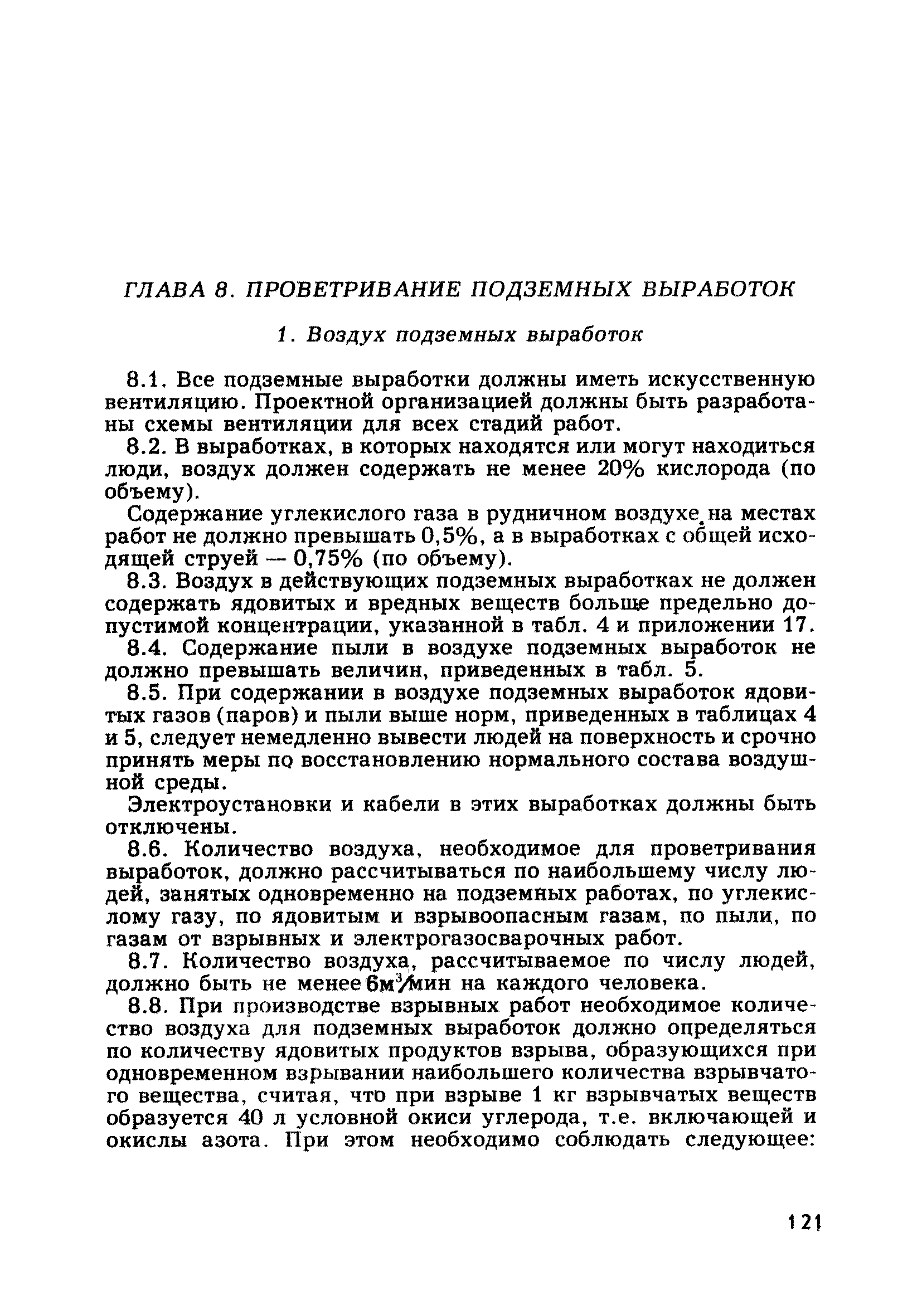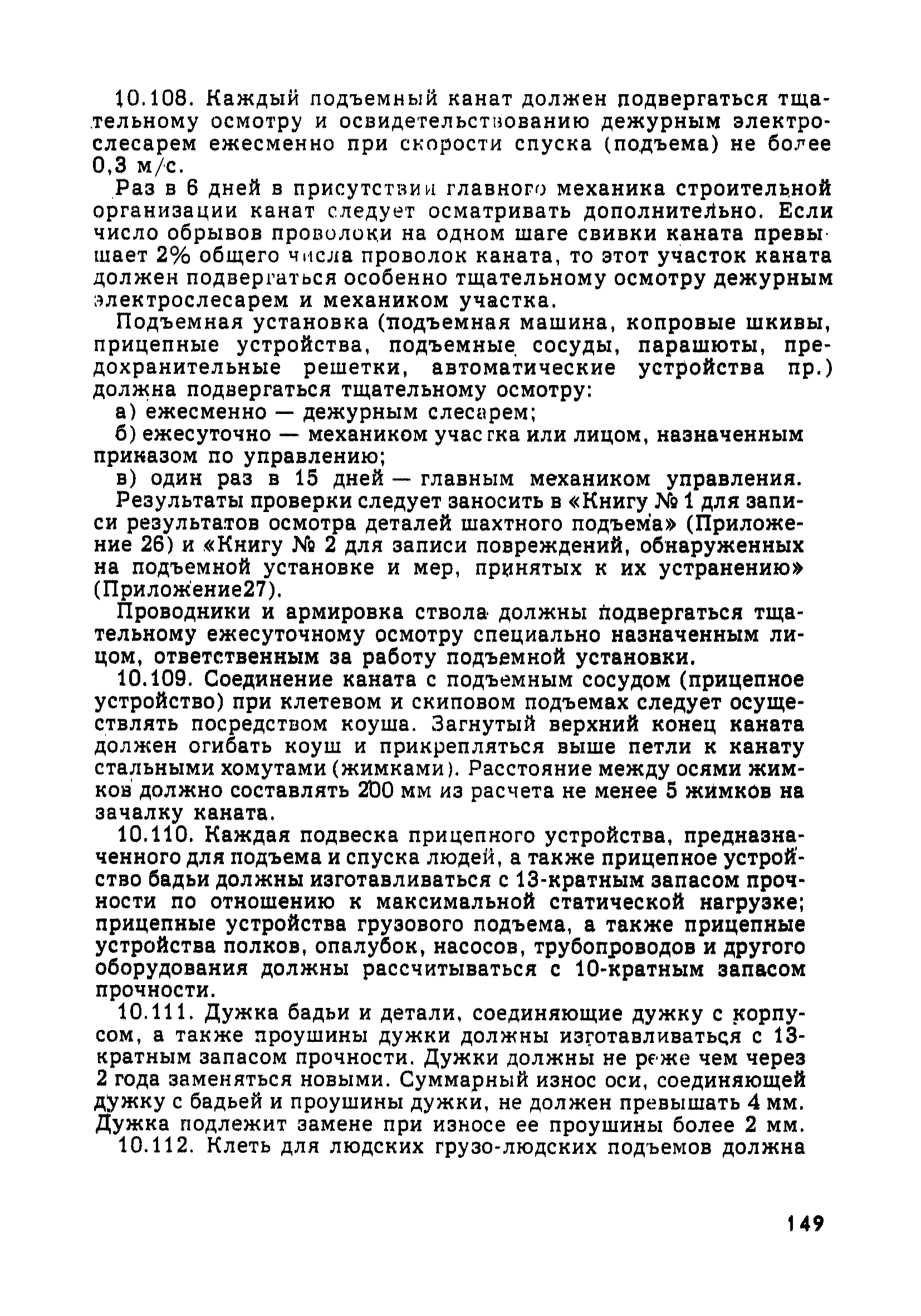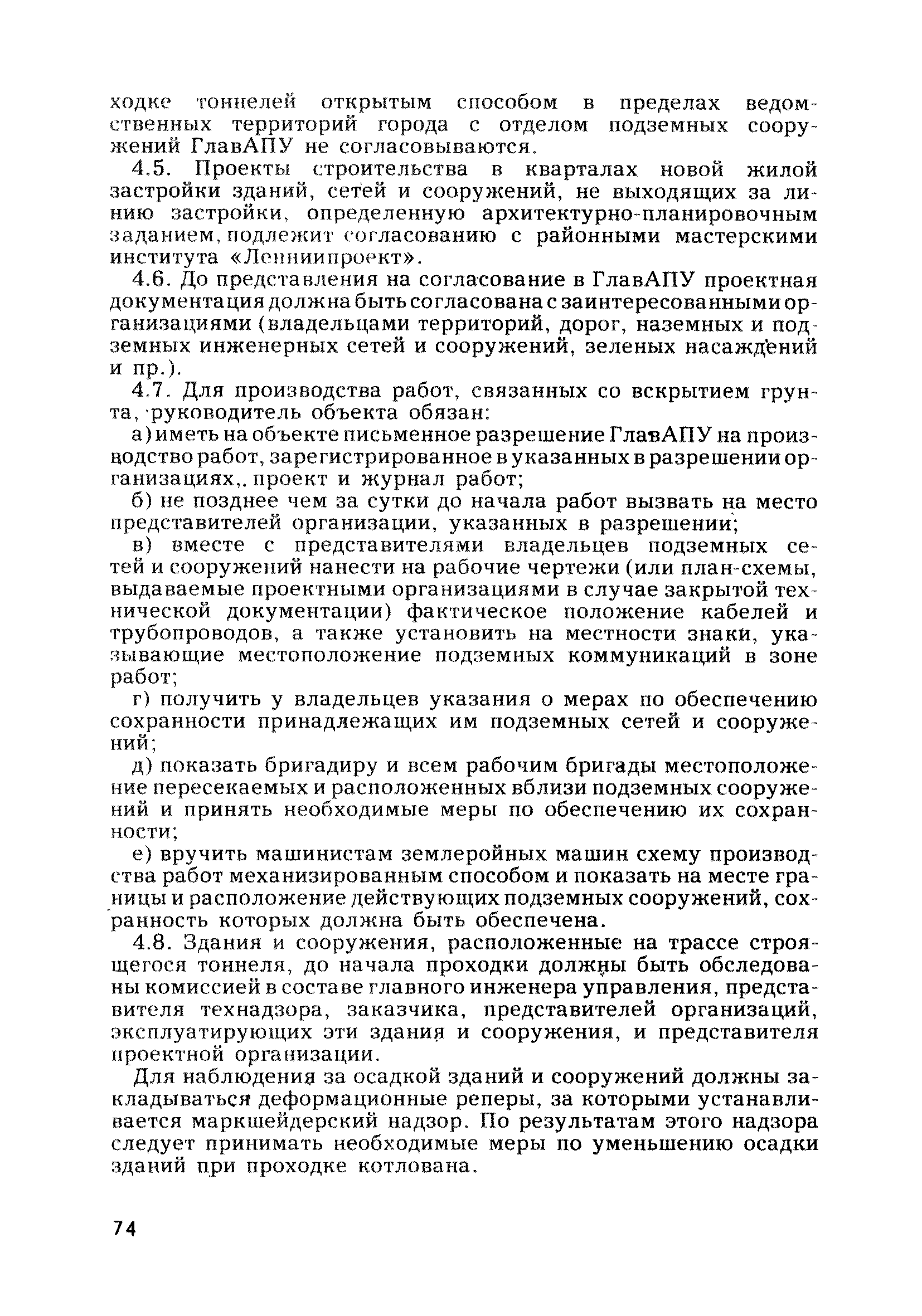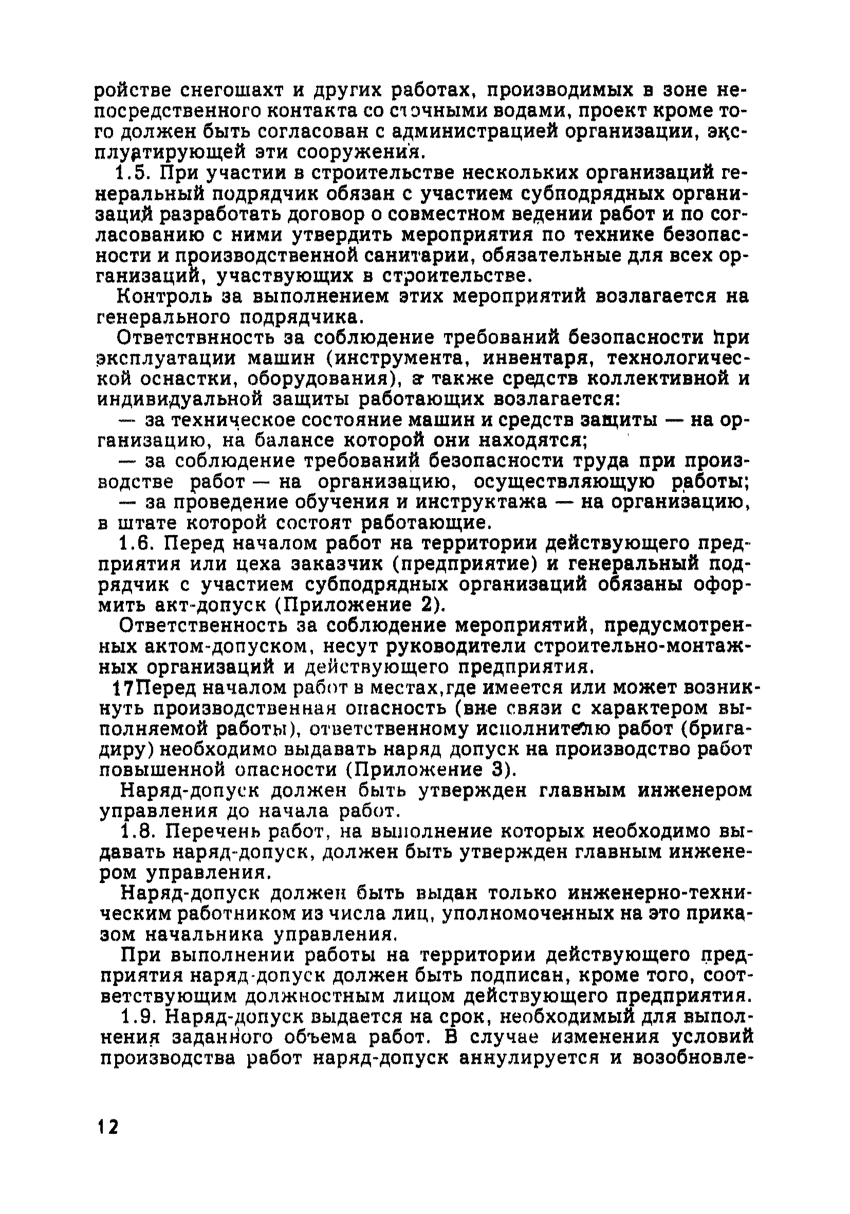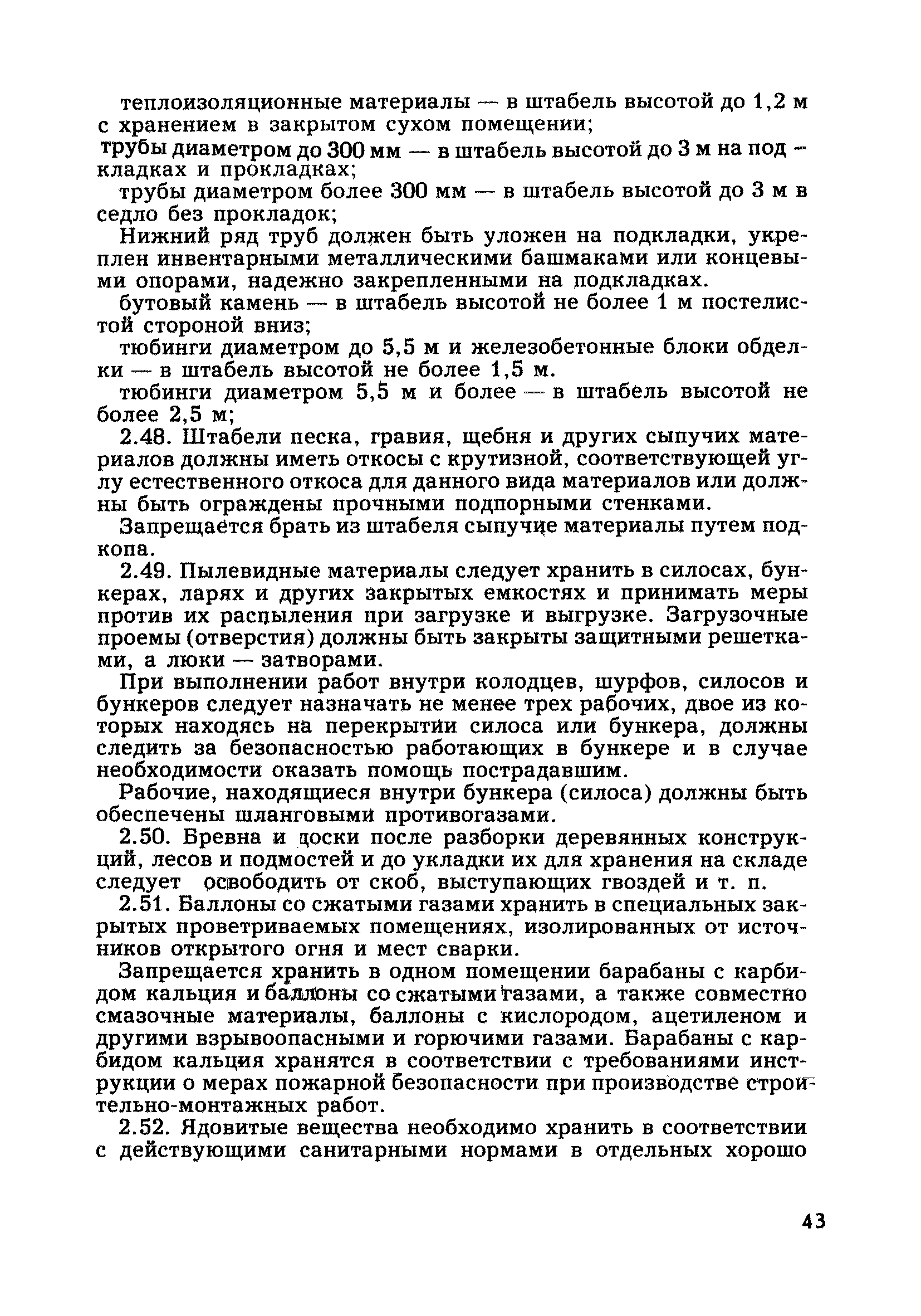 | Оглавление: | Глава 1. Общие правила Глава 2. Строительная площадка Глава 3. Проходка коллекторных тоннелей закрытым способом Глава 4. Сооружение тоннелей открытым способом Глава 5. Специальные способы работ Глава 6. Внутреннее обустройство тоннелей, канализационных насосных станций и стволов шахт Глава 7. Содержание и ликвидация подземных выработок Глава 8. Проветривание подземных выработок Глава 9. Водоотлив Глава 10. Подземный транспорт и шахтный подъем Глава 11. Электротехническое хозяйство Глава 12. Освещение Глава 13. Монтажные и демонтажные работы Глава 14. Строительные машины, механизмы и инструмент Глава 15. Ремонтные работы в действующих тоннельных канализационных коллекторах и шахтах Глава 16. Общие санитарные правила Глава 17. Ответственность за нарушение правил безопасности Приложение 1. Нормы и правила безопасности и производственной санитарии, которыми следует руководствоваться при проектировании и строительстве коллекторных тоннелей и других сооружений Приложение 2. Форма акта-допуска для производства строительно-монтажных работ на территории действующего предприятия Приложение 3. Форма наряда-допуска на производство работ повышенной опасности Приложение 4. Положение о порядке проведения инструктажа и об обучении безопасности труда Приложение 5. Журнал регистрации вводного инструктажа по охране труда Приложение 6. Журнал регистрации инструктажа на рабочем месте Приложение 7. Журнал регистрации проверки знаний работников по технике безопасности Приложение 8. Форма удостоверения для рабочих Приложение 9. Форма удостоверения для инженерно-технических работников Приложение 10. Нормы и сроки испытаний подъемных механизмов и приспособлений Приложение 11. Перечень документации по технике безопасности на объектах работ Приложение 12. Журнал горных работ Приложение 13. Положение о расследовании и учете несчастных случаев на производстве Приложение 14. Журнал проверки техники безопасности (3-ступенчатый контроль) Приложение 15. Методические указания по составлению планов ликвидации аварий Приложение 16. Журнал ознакомления рабочих с планом ликвидации аварий Приложение 17. Предельно допустимые концентрации некоторых вредных веществ в воздухе рабочей зоны Приложение 18. Инструкция по отбору проб воздуха в подземных выработках Приложение 19. Журнал учета результатов анализа воздуха Приложение 20. Книга осмотра вентиляторных установок Приложение 21. Нормы искусственного освещения подземных выработок и открытых строительных площадок при сооружении коллекторных тоннелей Приложение 22. Мероприятия по противопожарной защите при сооружении коллекторных тоннелей Приложение 23. Состав и содержание основных решений по технике безопасности в проектах производства работ (ППР) Приложение 24. Инструкция по составлению паспортов креплений подземных выработок Приложение 25. Книга осмотра крепи и состояния выработок Приложение 26. Книга № 1 для записи результатов осмотра деталей шахтного подъема Приложение 27. Книга № 2 для записи повреждений, обнаруженных на подъемной установке, и мер, принятых к их устранению Приложение 28. Книга № 3 для записи дат навески, снятия и испытания канатов Приложение 29. Нормы браковки стальных канатов Приложение 30. Журнал записи результатов осмотра состояния стволов шахт Приложение 31. Журнал для зап