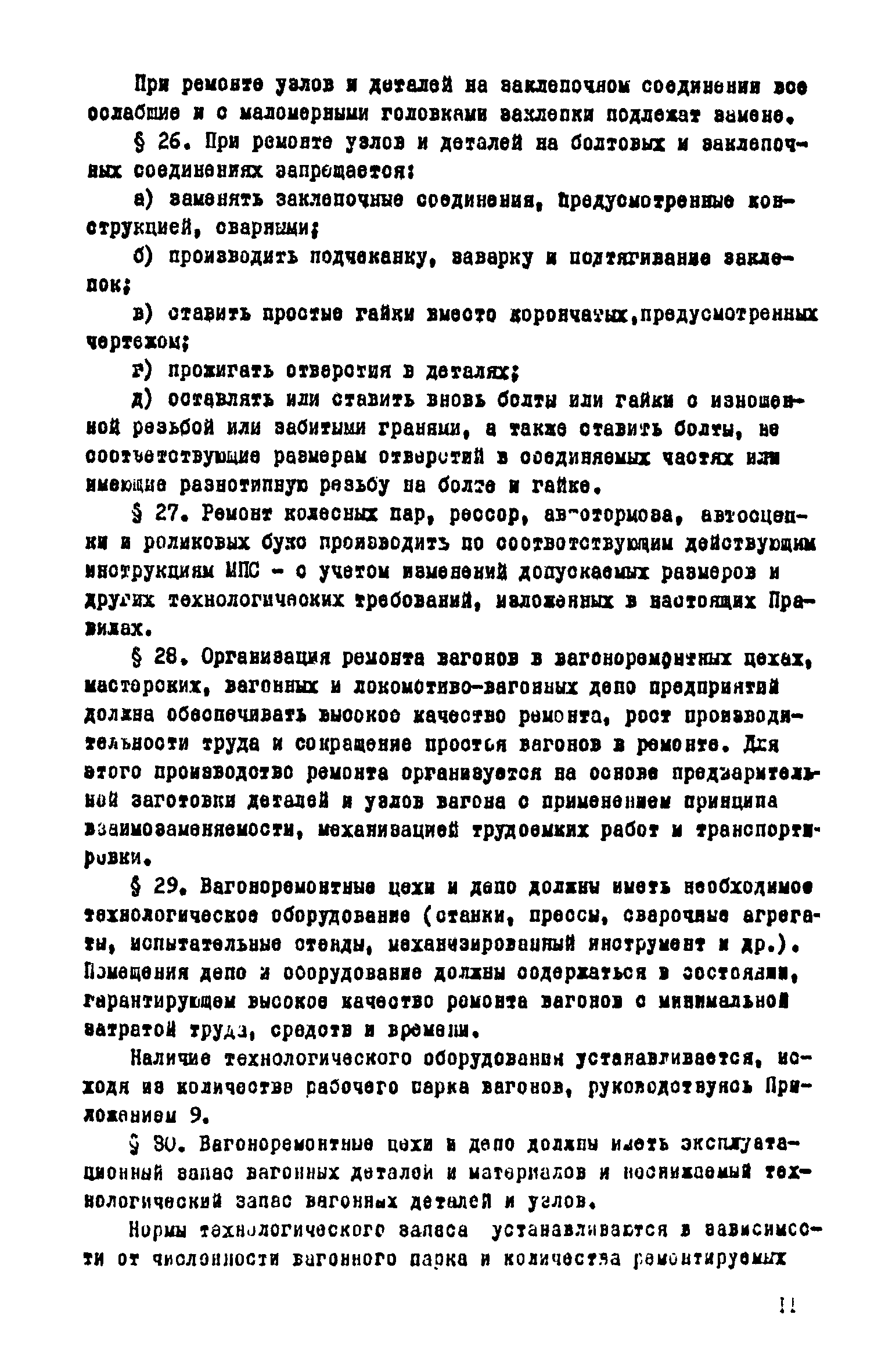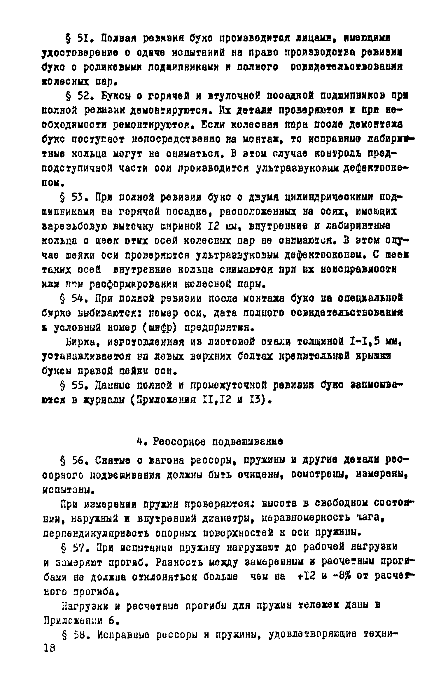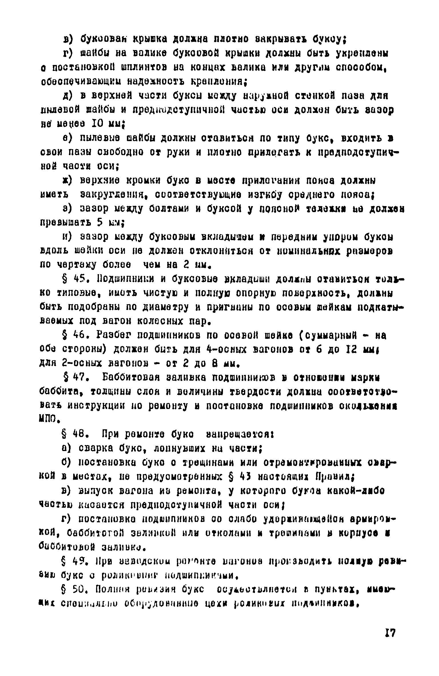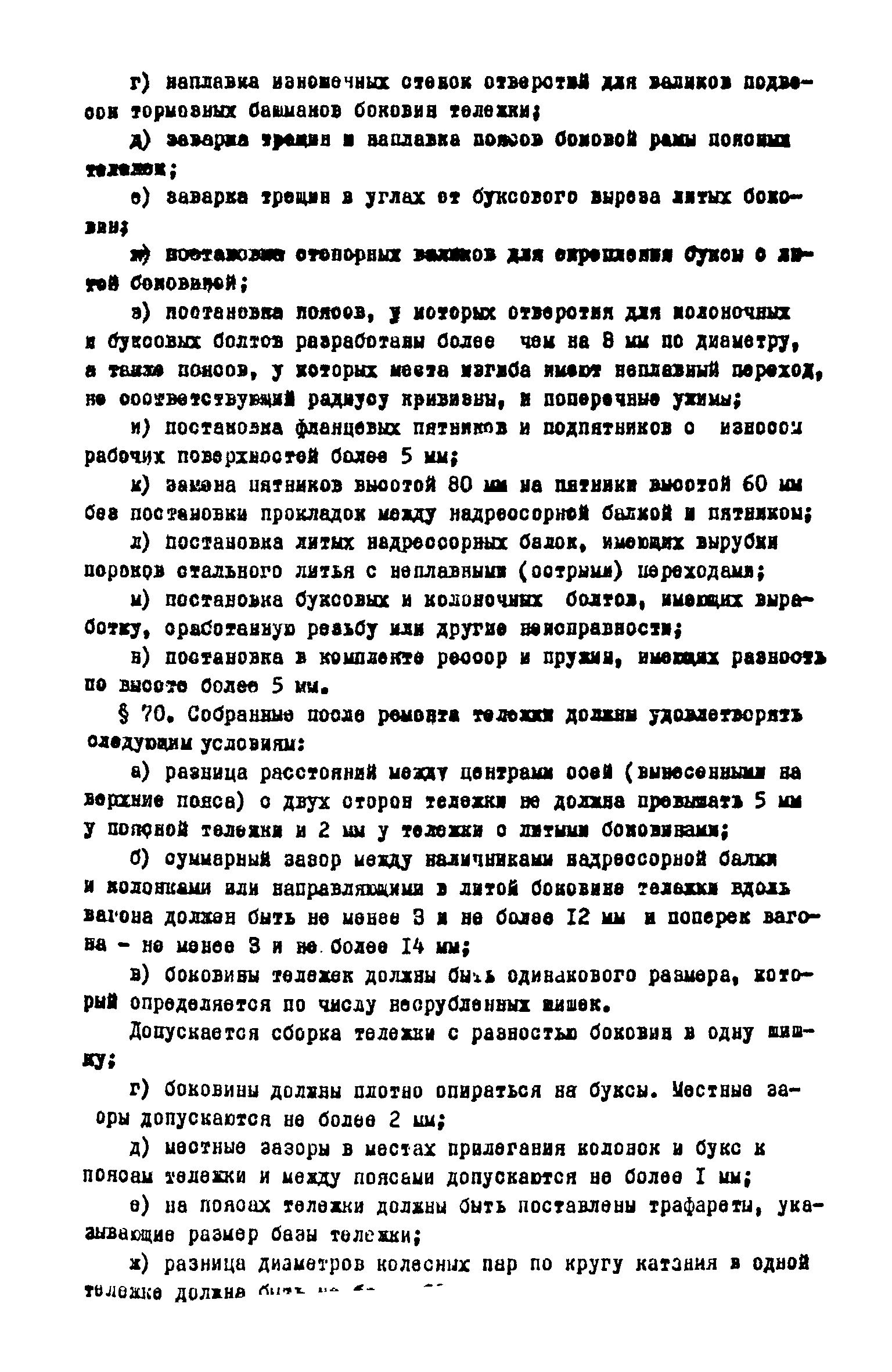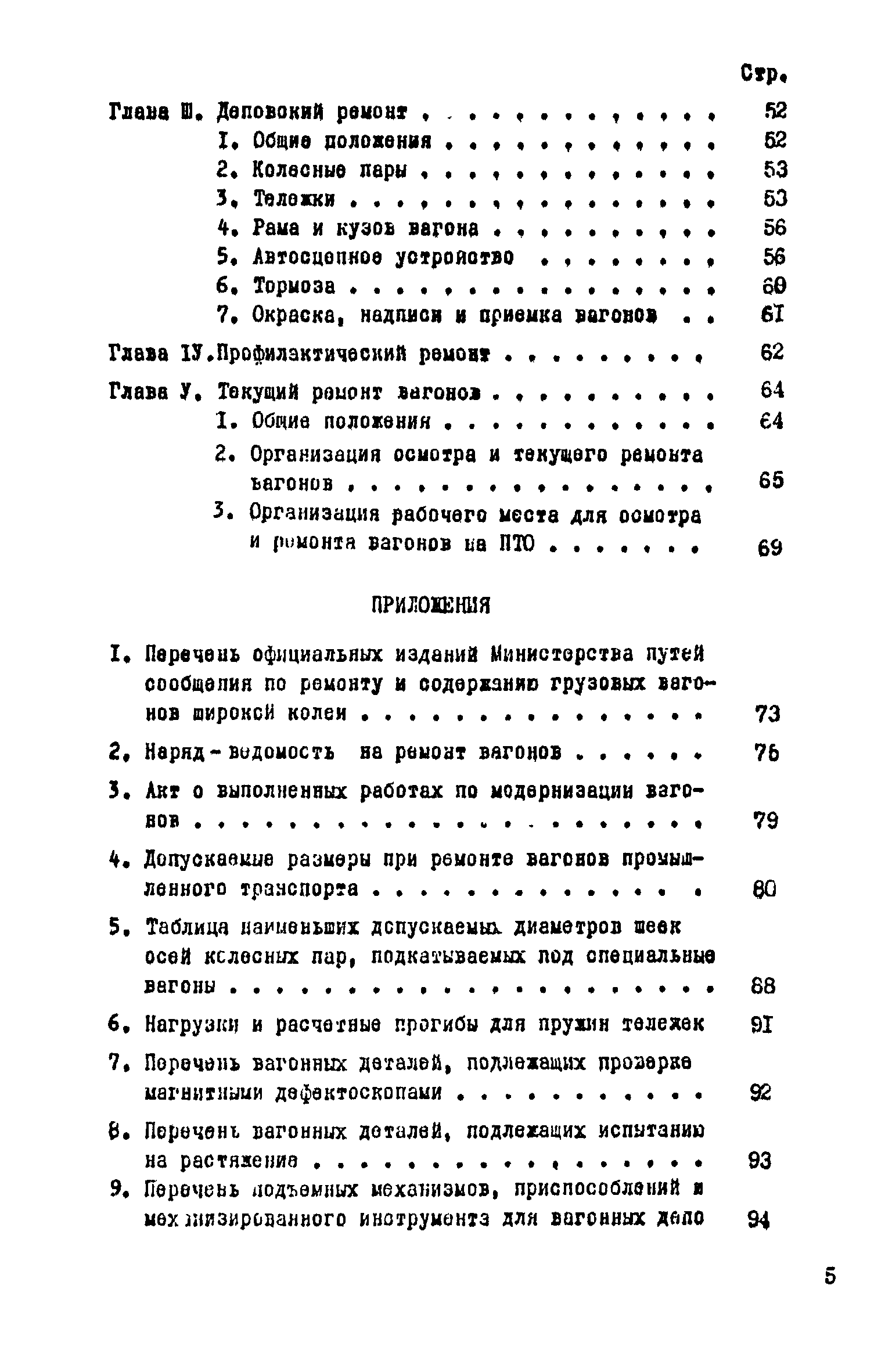 Правила заводского, деповского, профилактического и текущего ремонта вагонов промышленного транспорта колеи 1524 мм| Статус: | справочные материалы, мп, тпр | | Название рус.: | Правила заводского, деповского, профилактического и текущего ремонта вагонов промышленного транспорта колеи 1524 мм | | Дата добавления в базу: | 01.02.2020 | | Дата актуализации: | 01.01.2021 | | Область применения: | Правила ремонта вагонов являются обязательными для всех промышленных предприятий, имеющих и ремонтирующих вагоны серийной постройки (думпкары, хоппер-агломераторы, платформы для перевозки горячего чугуна, полувагоны для перевозки угля, скальных пород, руды и др. грузов), обращающиеся внутри предприятий без выхода на пути железных дорог Министерства путей сообщения. | | Оглавление: | Глава I. Общие положение по ремонту вагонов Глава II. Вагонный ремонт Глава III. Деповский ремонт Глава IV. Профилактический ремонт Глава V. Текущий ремонт вагонов Приложение 1 Перечень официальных изданий Министерства путей сообщения по ремонту и содержанию грузовых вагонов широкой колеи Приложение 2 Наряд-ведомость на ремонт вагонов Приложение 3 Акт о выполненных работах по модернизации вагонов Приложение 4 Допускаемые размеры при ремонте вагонов промышленного транспорта Приложение 5 Таблица наименьших допускаемых диаметров шеек осей колесных пар, подкатываемых под специальные вагоны Приложение 6 Нагрузки и расчетные прогибы для пружин тележек Приложение 7 Перечень вагонных деталей, подлежащих проверке магнитными дефектоскопами Приложение 8 Перечень вагонных деталей, подлежащих испытанию на растяжение Приложение 9 Перечень подъемных механизмов, приспособлений и механизированного инструмента для вагонных депо Приложение 10 Уведомление о приемке вагонов из ремонта Приложение 11 Журнал монтажа роликовых подшипников Приложение 12 Журнал демонтажа роликовых подшипников Приложение 13 Журнал промежуточной ревизии роликовых подшипников Приложение 14 Гарантия на прочность и исправность отремонтированных вагонов и их деталей Приложение 15 Натуральная книжка старшего осмотрщика вагонов на пункте технического осмотра Приложение 16 Уведомление на подачу неисправного вагона для ремонта на ремонтные пути Приложение 17 Справка о тормозах Приложение 18 Перечень подъемных механизмов, приспособлений и инструмента, применяемого при ремонте вагонов (для пунктов технического осмотра вагонов) | | Разработан: | Промтрансниипроект