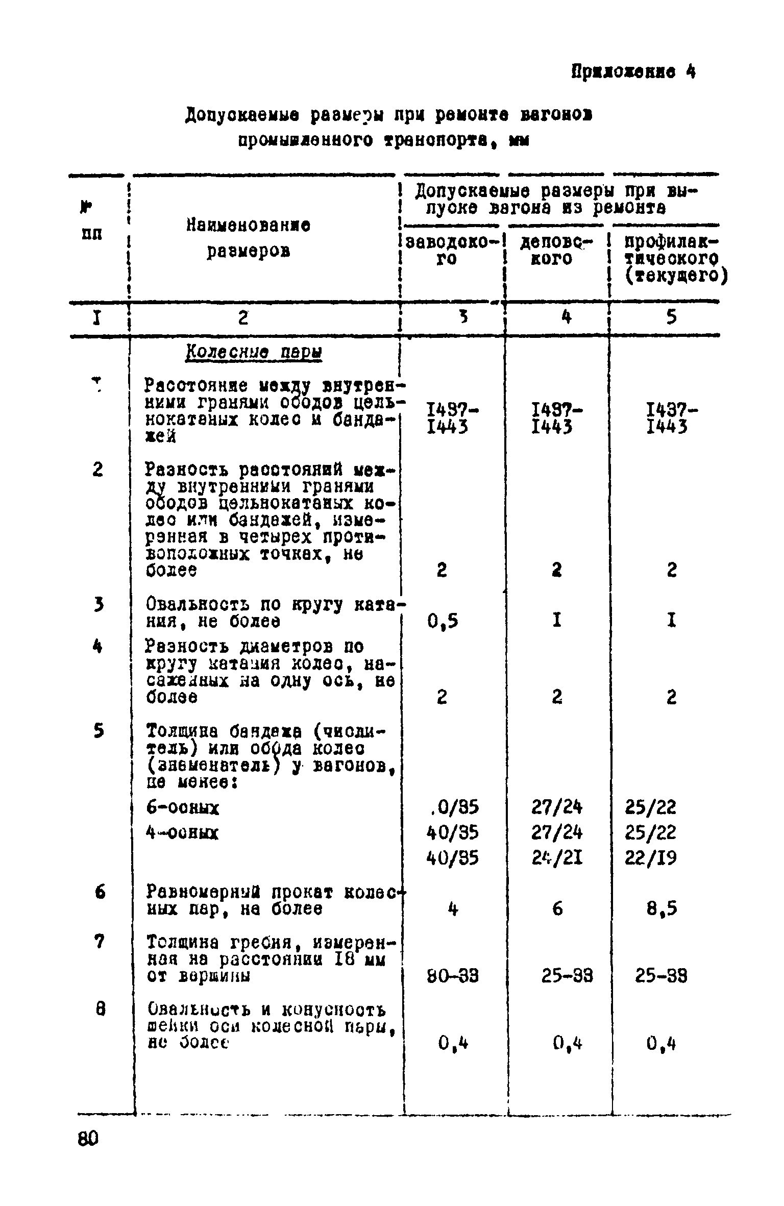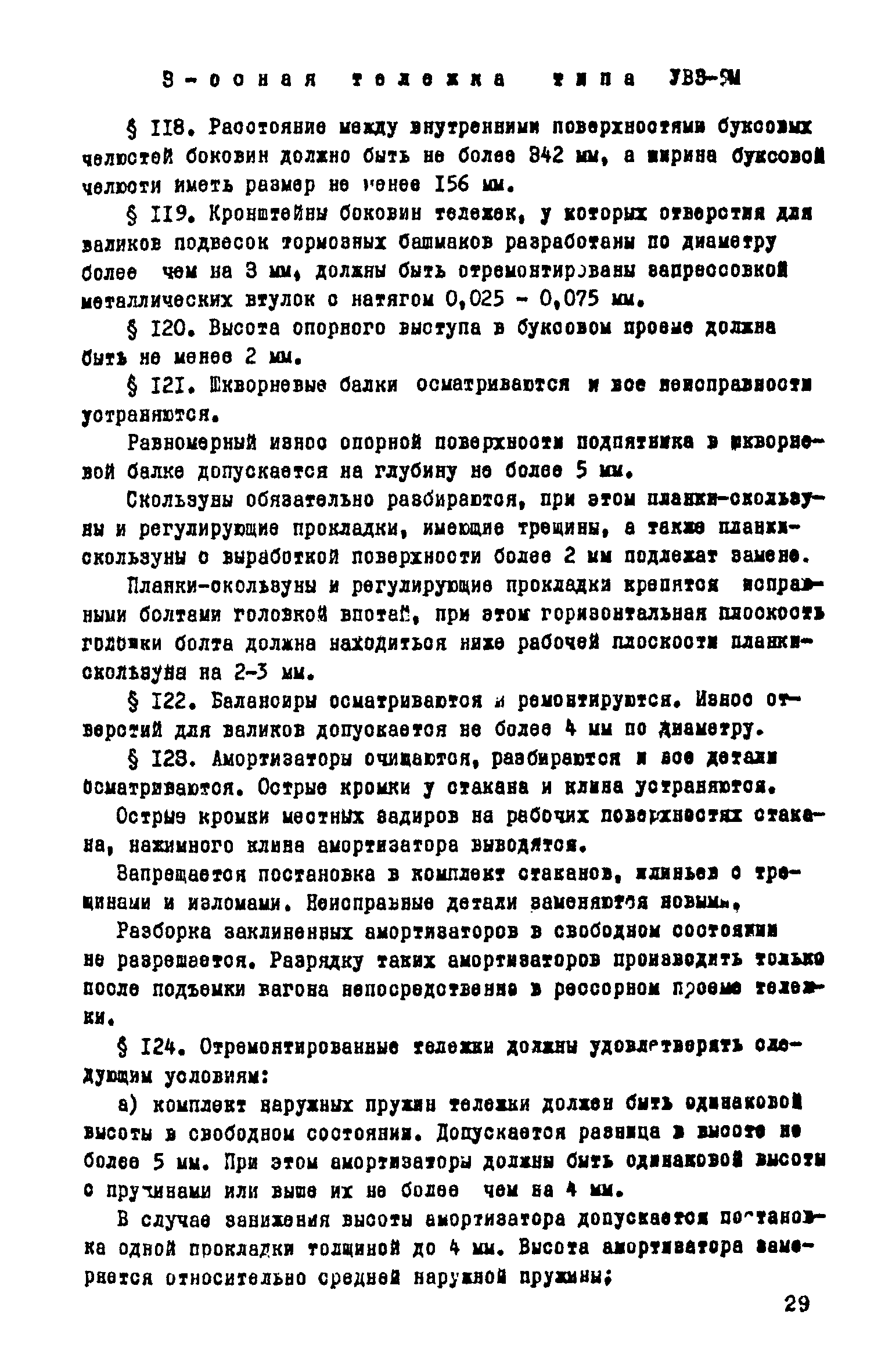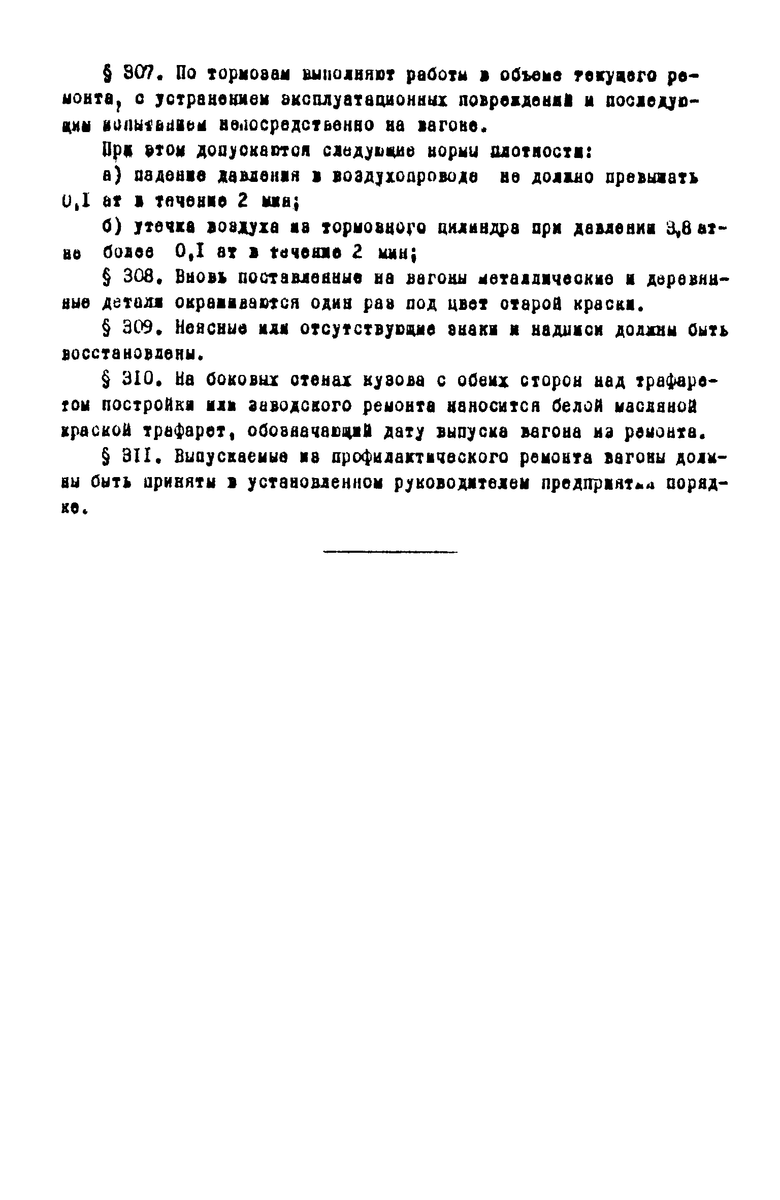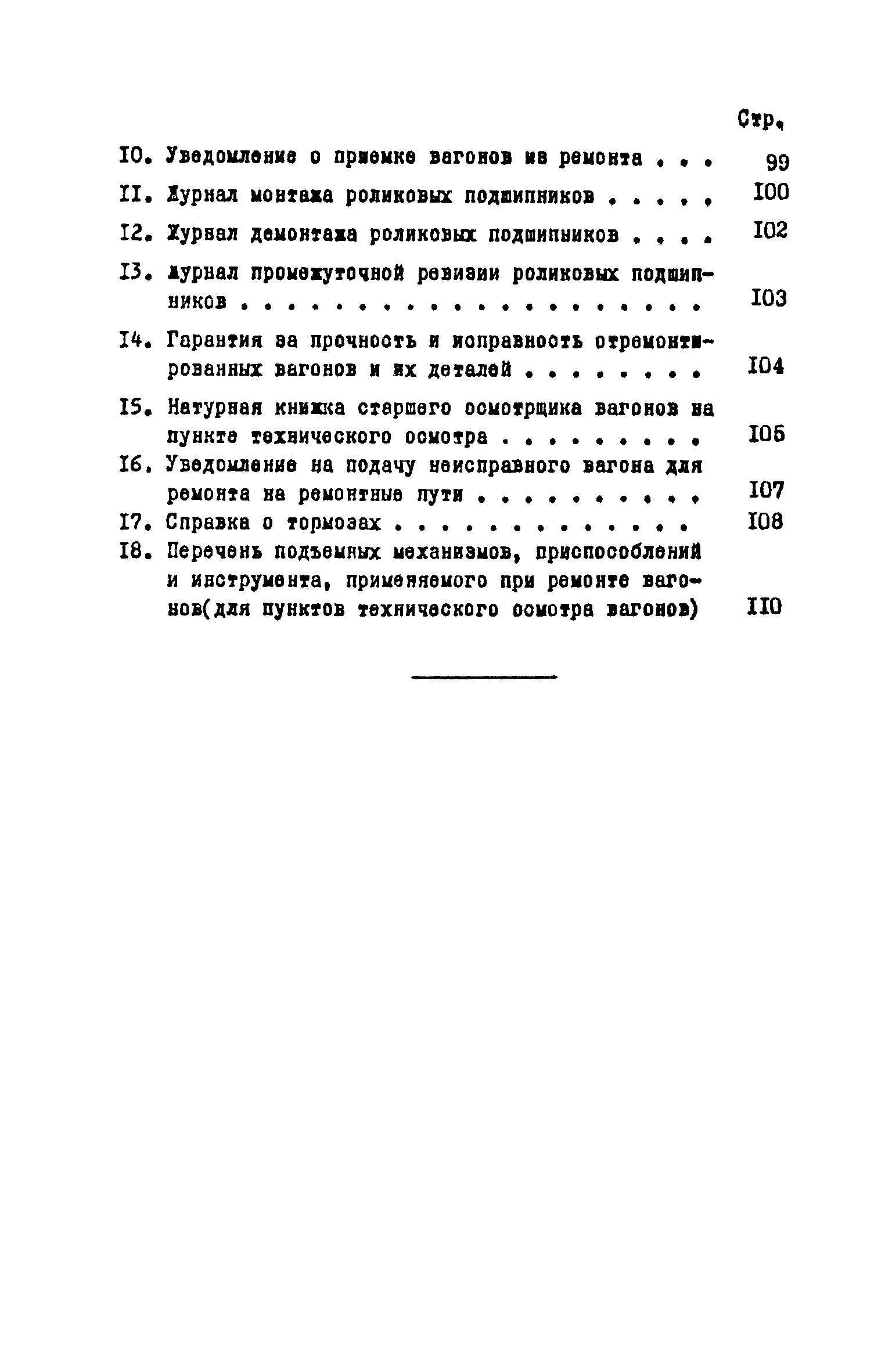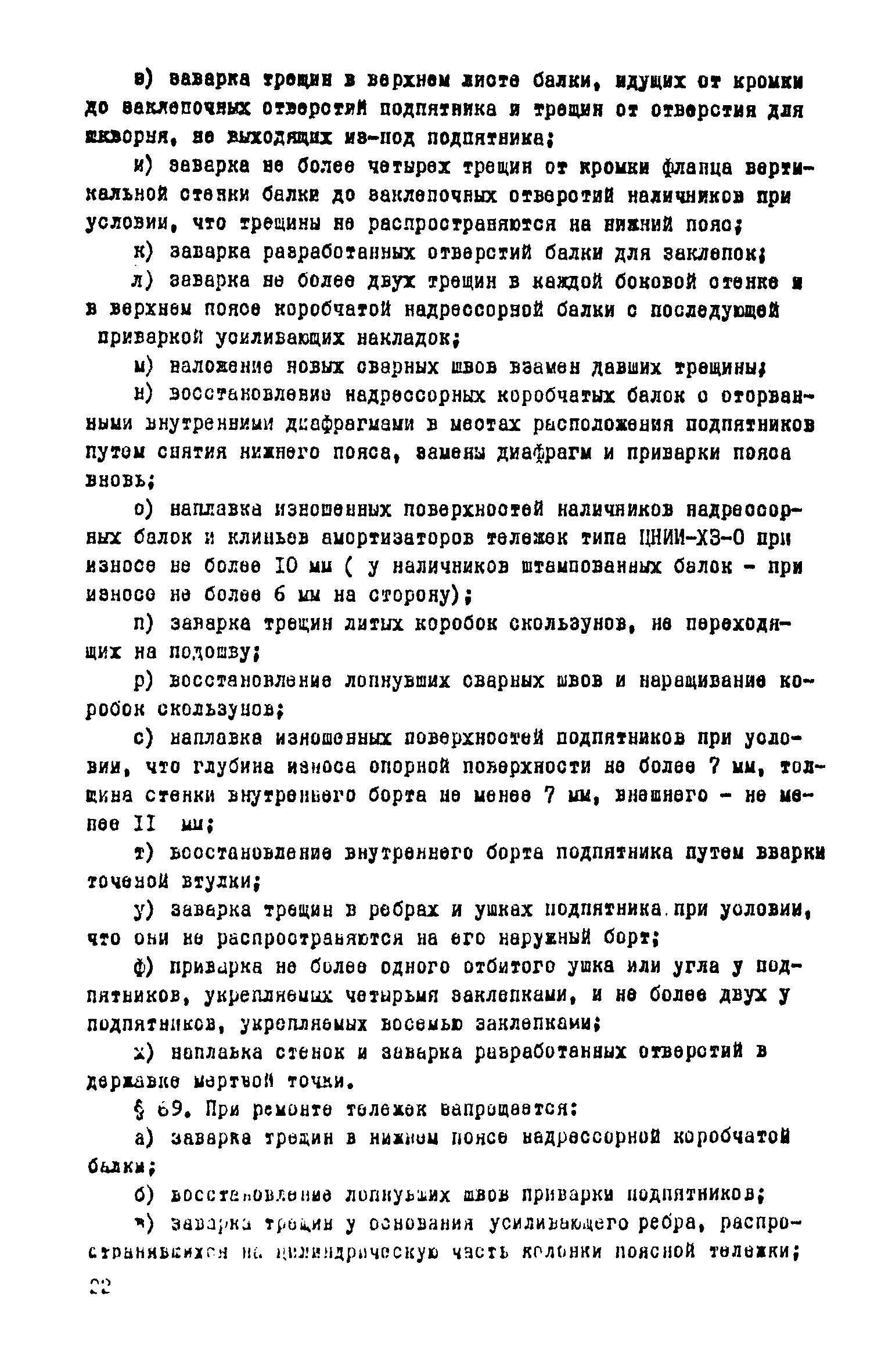 Правила заводского, деповского, профилактического и текущего ремонта вагонов промышленного транспорта колеи 1524 мм| Статус: | справочные материалы, мп, тпр | | Название рус.: | Правила заводского, деповского, профилактического и текущего ремонта вагонов промышленного транспорта колеи 1524 мм | | Дата добавления в базу: | 01.02.2020 | | Дата актуализации: | 01.01.2021 | | Область применения: | Правила ремонта вагонов являются обязательными для всех промышленных предприятий, имеющих и ремонтирующих вагоны серийной постройки (думпкары, хоппер-агломераторы, платформы для перевозки горячего чугуна, полувагоны для перевозки угля, скальных пород, руды и др. грузов), обращающиеся внутри предприятий без выхода на пути железных дорог Министерства путей сообщения. | | Оглавление: | Глава I. Общие положение по ремонту вагонов Глава II. Вагонный ремонт Глава III. Деповский ремонт Глава IV. Профилактический ремонт Глава V. Текущий ремонт вагонов Приложение 1 Перечень официальных изданий Министерства путей сообщения по ремонту и содержанию грузовых вагонов широкой колеи Приложение 2 Наряд-ведомость на ремонт вагонов Приложение 3 Акт о выполненных работах по модернизации вагонов Приложение 4 Допускаемые размеры при ремонте вагонов промышленного транспорта Приложение 5 Таблица наименьших допускаемых диаметров шеек осей колесных пар, подкатываемых под специальные вагоны Приложение 6 Нагрузки и расчетные прогибы для пружин тележек Приложение 7 Перечень вагонных деталей, подлежащих проверке магнитными дефектоскопами Приложение 8 Перечень вагонных деталей, подлежащих испытанию на растяжение Приложение 9 Перечень подъемных механизмов, приспособлений и механизированного инструмента для вагонных депо Приложение 10 Уведомление о приемке вагонов из ремонта Приложение 11 Журнал монтажа роликовых подшипников Приложение 12 Журнал демонтажа роликовых подшипников Приложение 13 Журнал промежуточной ревизии роликовых подшипников Приложение 14 Гарантия на прочность и исправность отремонтированных вагонов и их деталей Приложение 15 Натуральная книжка старшего осмотрщика вагонов на пункте технического осмотра Приложение 16 Уведомление на подачу неисправного вагона для ремонта на ремонтные пути Приложение 17 Справка о тормозах Приложение 18 Перечень подъемных механизмов, приспособлений и инструмента, применяемого при ремонте вагонов (для пунктов технического осмотра вагонов) | | Разработан: | Промтрансниипроект