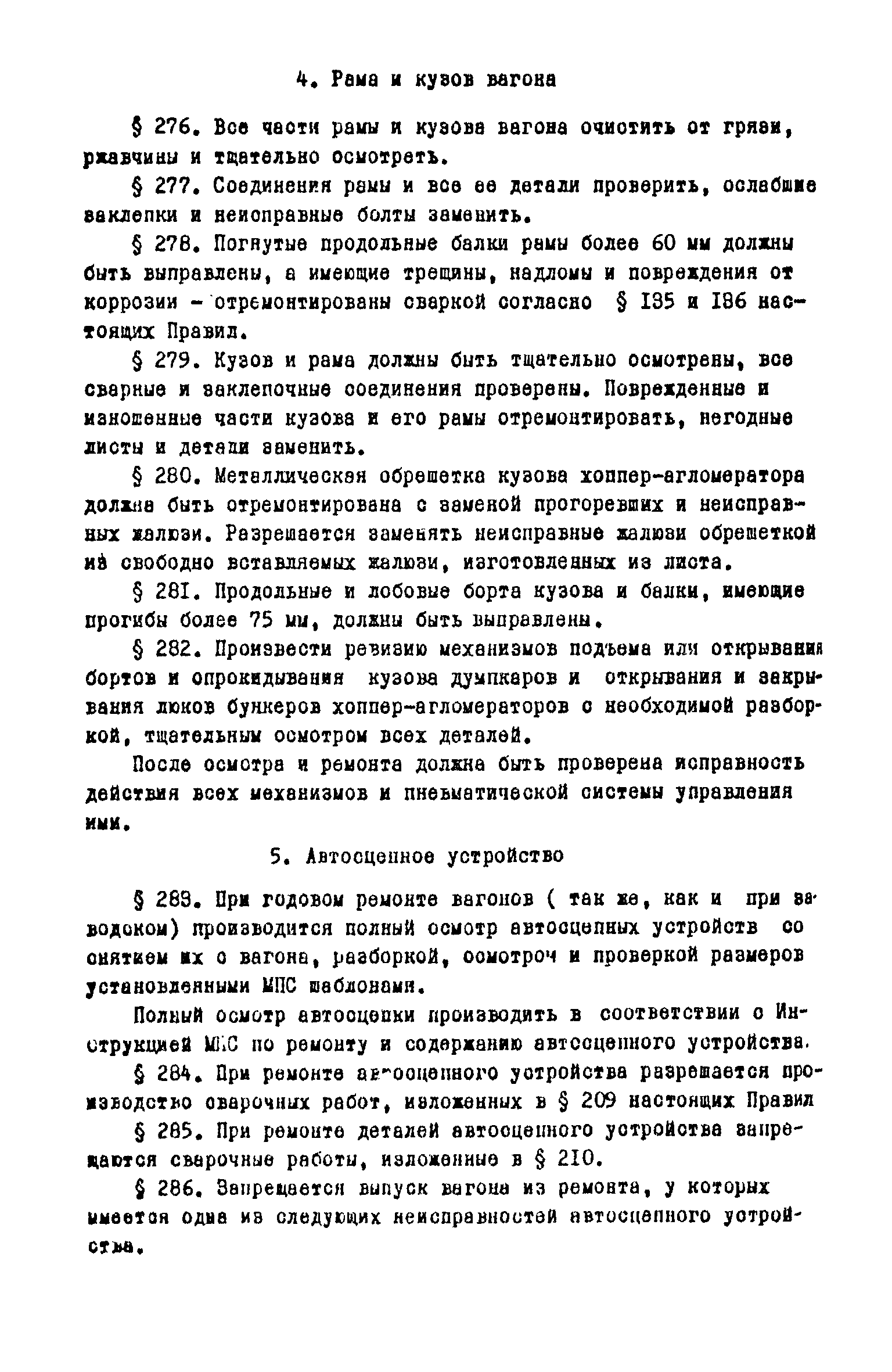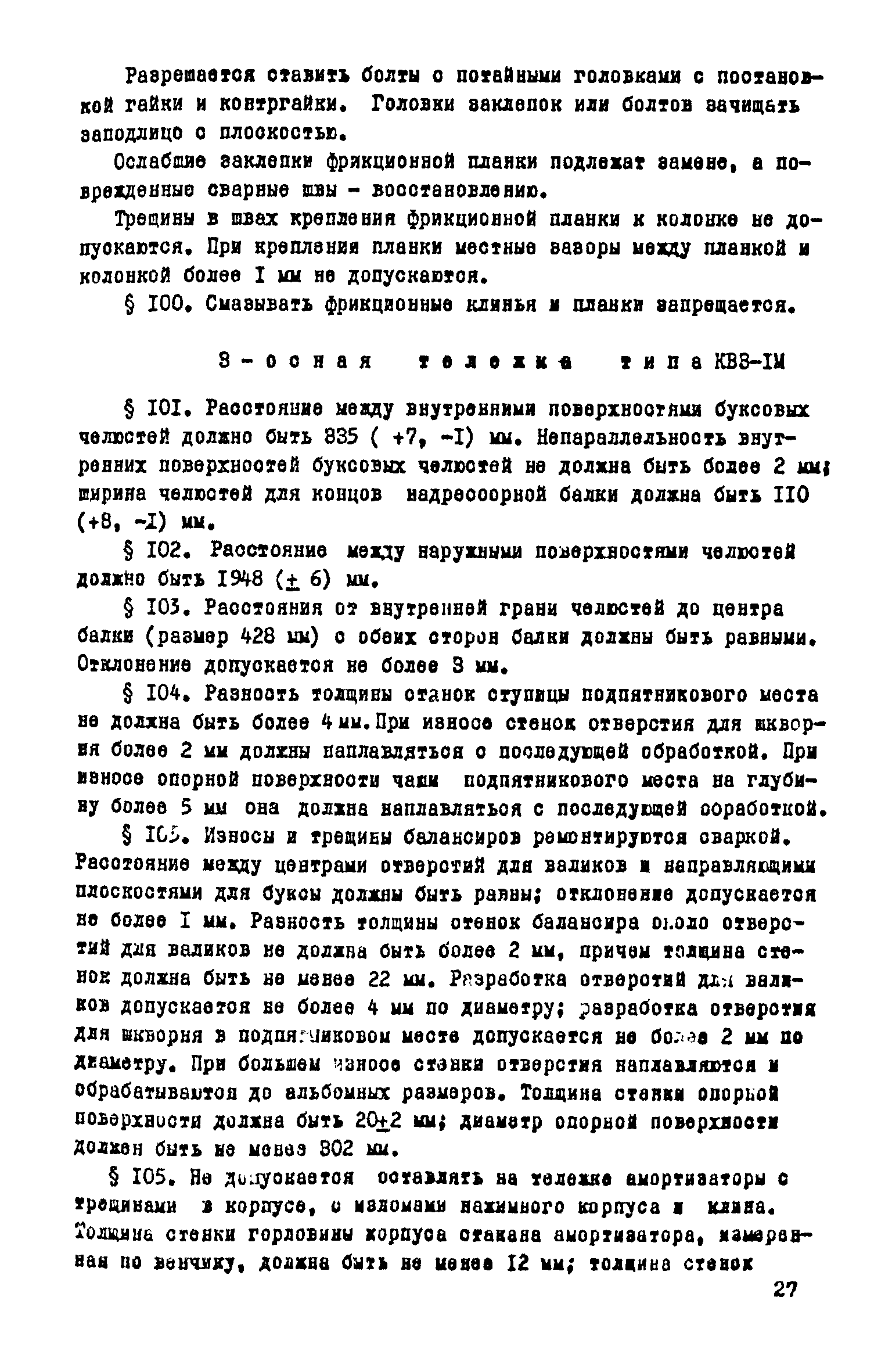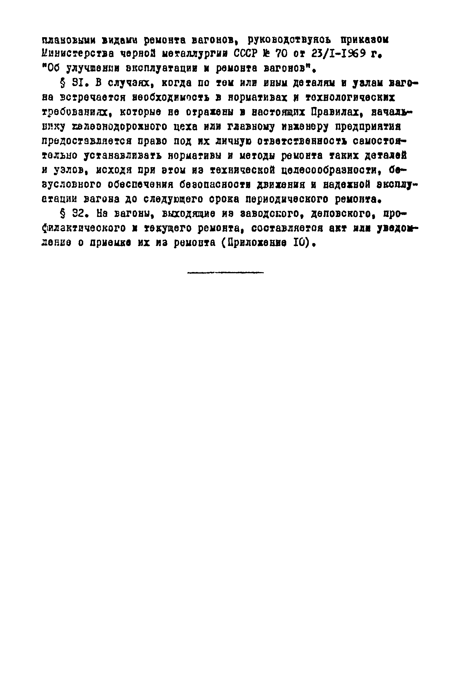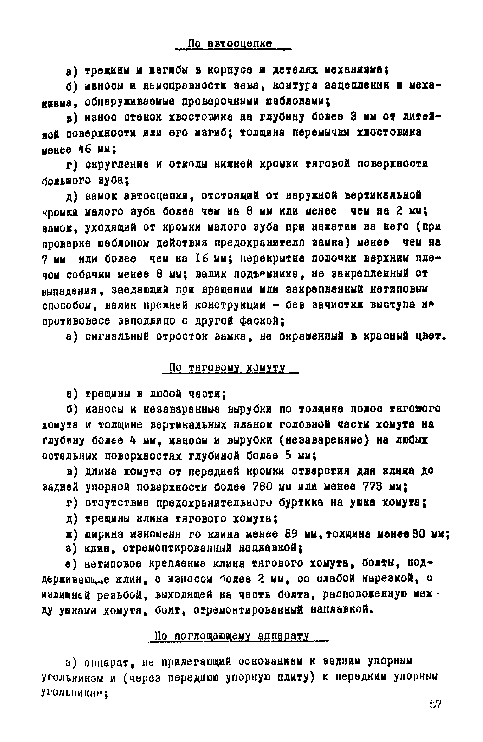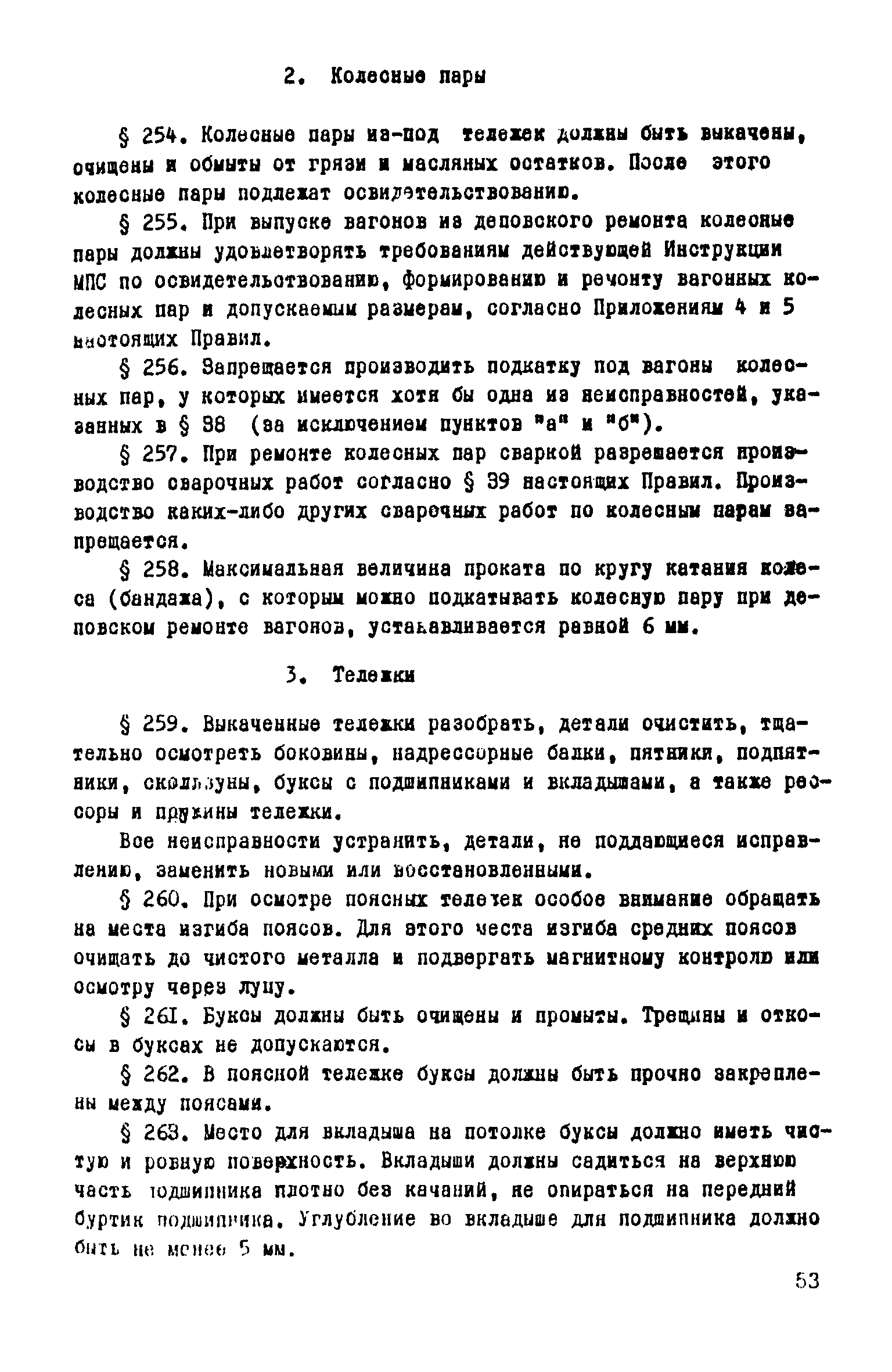 Правила заводского, деповского, профилактического и текущего ремонта вагонов промышленного транспорта колеи 1524 мм| Статус: | справочные материалы, мп, тпр | | Название рус.: | Правила заводского, деповского, профилактического и текущего ремонта вагонов промышленного транспорта колеи 1524 мм | | Дата добавления в базу: | 01.02.2020 | | Дата актуализации: | 01.01.2021 | | Область применения: | Правила ремонта вагонов являются обязательными для всех промышленных предприятий, имеющих и ремонтирующих вагоны серийной постройки (думпкары, хоппер-агломераторы, платформы для перевозки горячего чугуна, полувагоны для перевозки угля, скальных пород, руды и др. грузов), обращающиеся внутри предприятий без выхода на пути железных дорог Министерства путей сообщения. | | Оглавление: | Глава I. Общие положение по ремонту вагонов Глава II. Вагонный ремонт Глава III. Деповский ремонт Глава IV. Профилактический ремонт Глава V. Текущий ремонт вагонов Приложение 1 Перечень официальных изданий Министерства путей сообщения по ремонту и содержанию грузовых вагонов широкой колеи Приложение 2 Наряд-ведомость на ремонт вагонов Приложение 3 Акт о выполненных работах по модернизации вагонов Приложение 4 Допускаемые размеры при ремонте вагонов промышленного транспорта Приложение 5 Таблица наименьших допускаемых диаметров шеек осей колесных пар, подкатываемых под специальные вагоны Приложение 6 Нагрузки и расчетные прогибы для пружин тележек Приложение 7 Перечень вагонных деталей, подлежащих проверке магнитными дефектоскопами Приложение 8 Перечень вагонных деталей, подлежащих испытанию на растяжение Приложение 9 Перечень подъемных механизмов, приспособлений и механизированного инструмента для вагонных депо Приложение 10 Уведомление о приемке вагонов из ремонта Приложение 11 Журнал монтажа роликовых подшипников Приложение 12 Журнал демонтажа роликовых подшипников Приложение 13 Журнал промежуточной ревизии роликовых подшипников Приложение 14 Гарантия на прочность и исправность отремонтированных вагонов и их деталей Приложение 15 Натуральная книжка старшего осмотрщика вагонов на пункте технического осмотра Приложение 16 Уведомление на подачу неисправного вагона для ремонта на ремонтные пути Приложение 17 Справка о тормозах Приложение 18 Перечень подъемных механизмов, приспособлений и инструмента, применяемого при ремонте вагонов (для пунктов технического осмотра вагонов) | | Разработан: | Промтрансниипроект