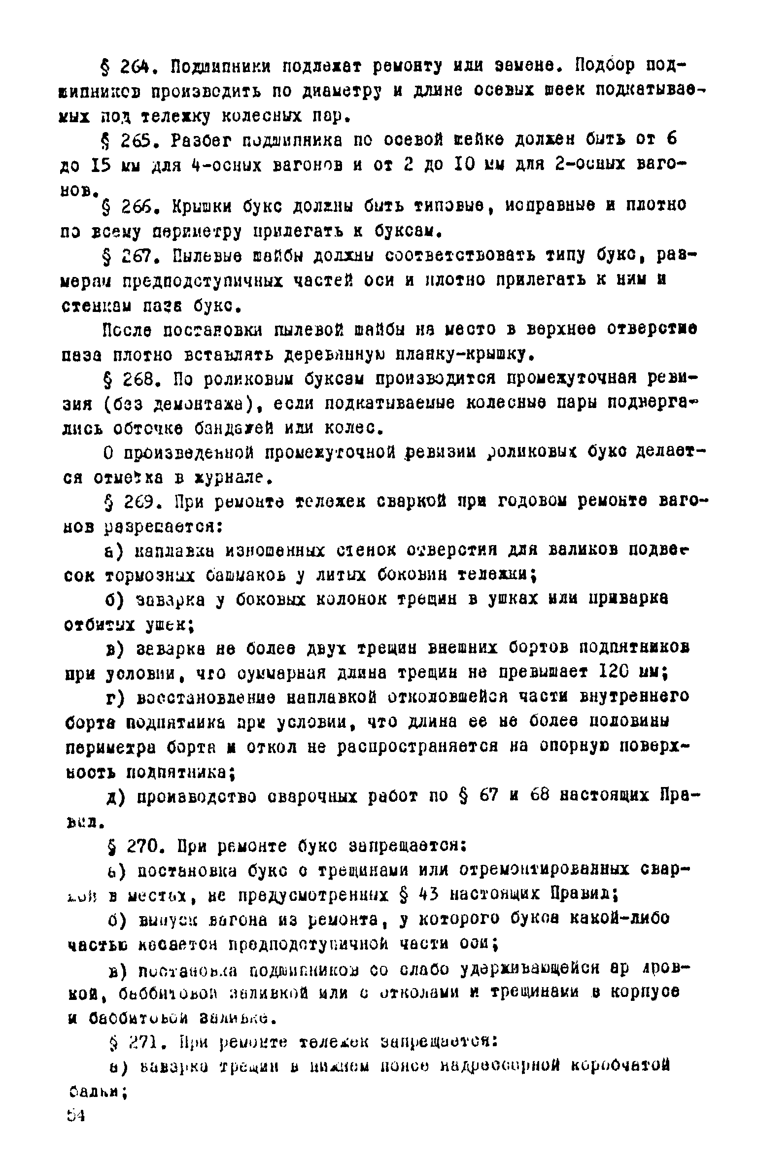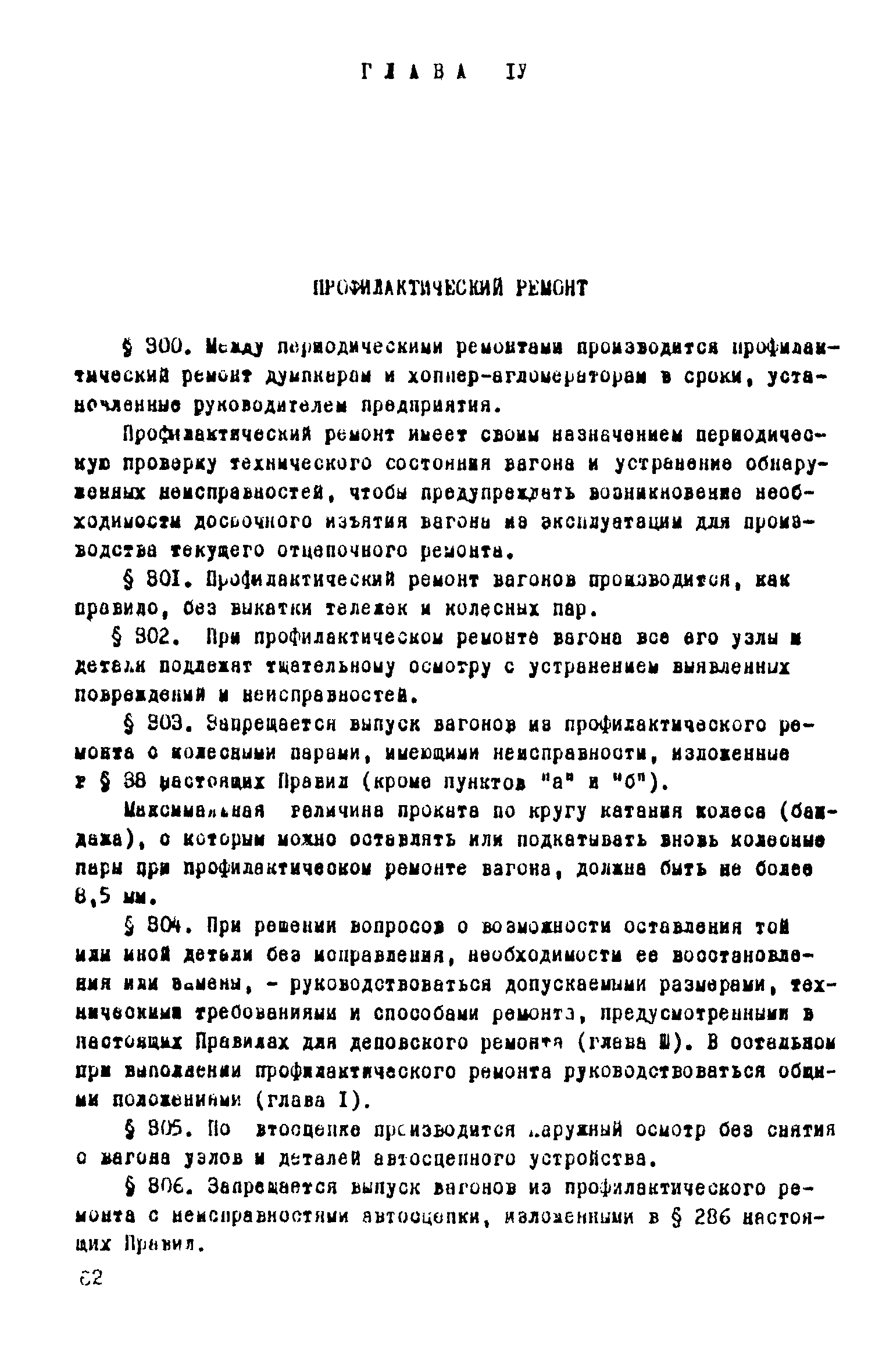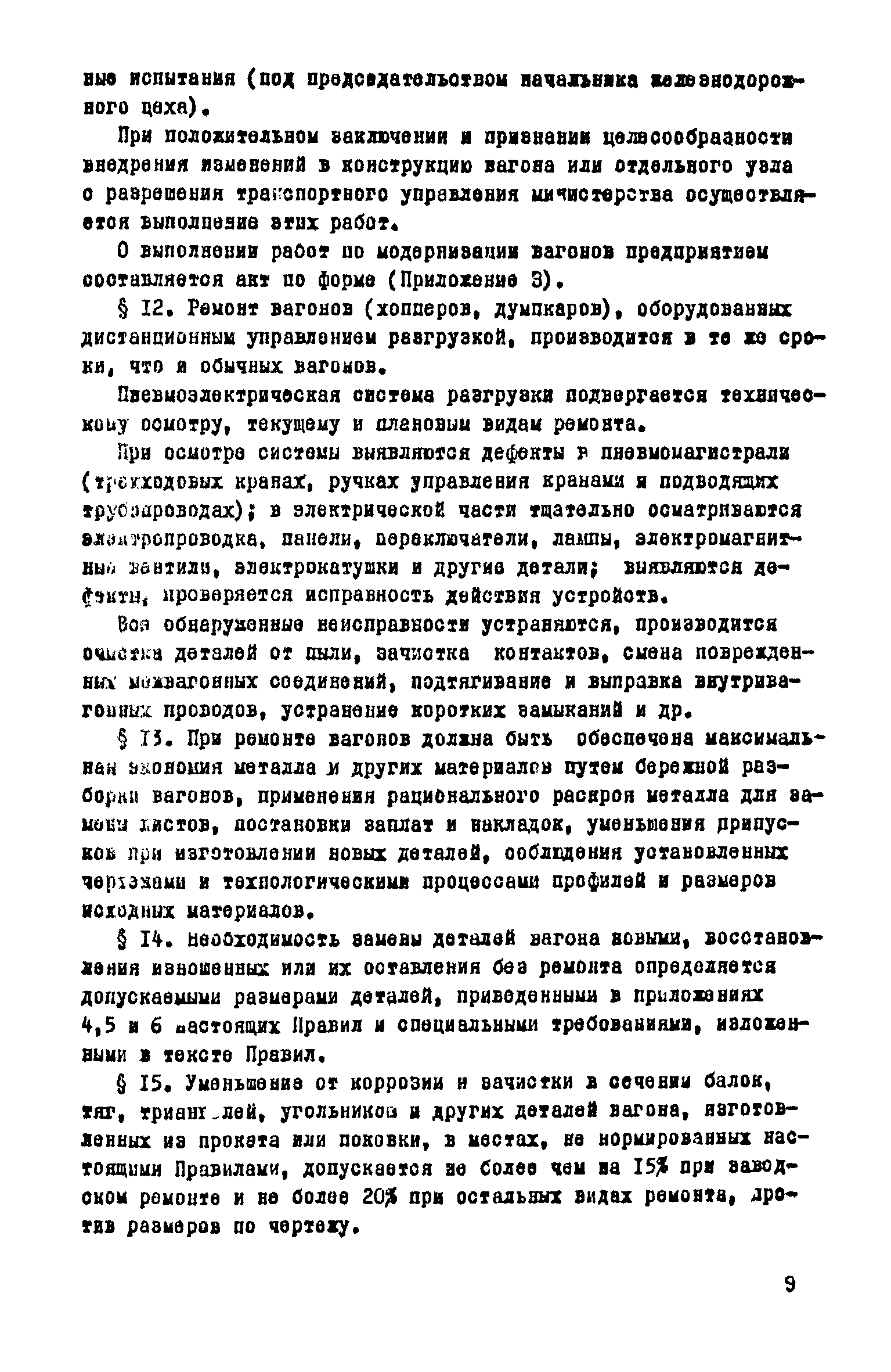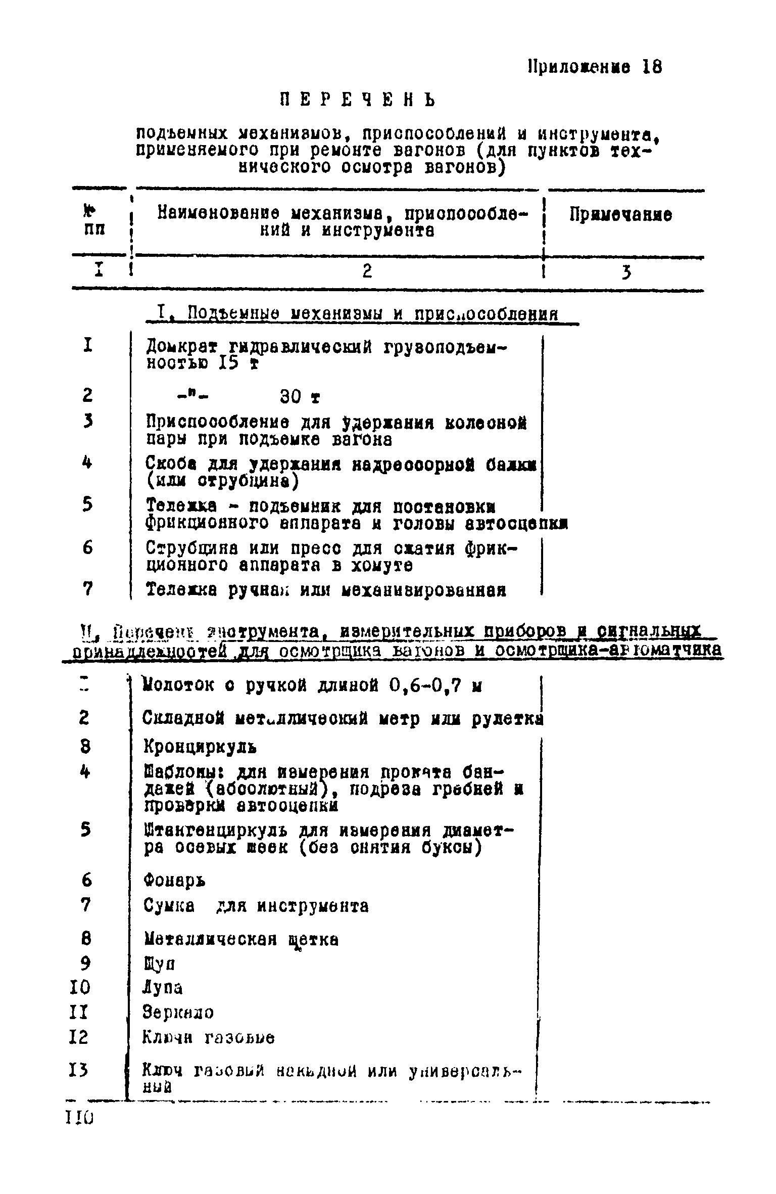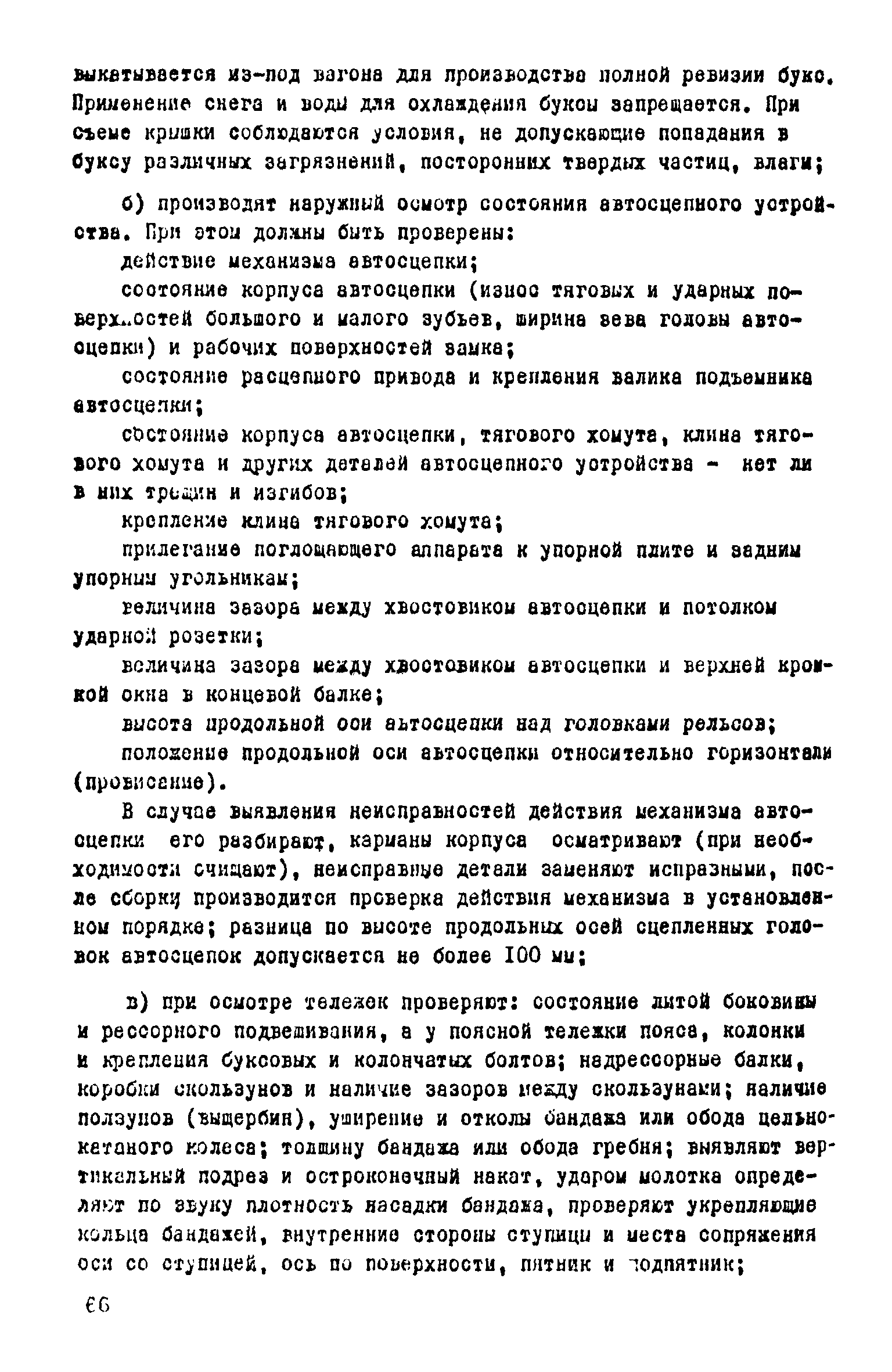 Правила заводского, деповского, профилактического и текущего ремонта вагонов промышленного транспорта колеи 1524 мм| Статус: | справочные материалы, мп, тпр | | Название рус.: | Правила заводского, деповского, профилактического и текущего ремонта вагонов промышленного транспорта колеи 1524 мм | | Дата добавления в базу: | 01.02.2020 | | Дата актуализации: | 01.01.2021 | | Область применения: | Правила ремонта вагонов являются обязательными для всех промышленных предприятий, имеющих и ремонтирующих вагоны серийной постройки (думпкары, хоппер-агломераторы, платформы для перевозки горячего чугуна, полувагоны для перевозки угля, скальных пород, руды и др. грузов), обращающиеся внутри предприятий без выхода на пути железных дорог Министерства путей сообщения. | | Оглавление: | Глава I. Общие положение по ремонту вагонов Глава II. Вагонный ремонт Глава III. Деповский ремонт Глава IV. Профилактический ремонт Глава V. Текущий ремонт вагонов Приложение 1 Перечень официальных изданий Министерства путей сообщения по ремонту и содержанию грузовых вагонов широкой колеи Приложение 2 Наряд-ведомость на ремонт вагонов Приложение 3 Акт о выполненных работах по модернизации вагонов Приложение 4 Допускаемые размеры при ремонте вагонов промышленного транспорта Приложение 5 Таблица наименьших допускаемых диаметров шеек осей колесных пар, подкатываемых под специальные вагоны Приложение 6 Нагрузки и расчетные прогибы для пружин тележек Приложение 7 Перечень вагонных деталей, подлежащих проверке магнитными дефектоскопами Приложение 8 Перечень вагонных деталей, подлежащих испытанию на растяжение Приложение 9 Перечень подъемных механизмов, приспособлений и механизированного инструмента для вагонных депо Приложение 10 Уведомление о приемке вагонов из ремонта Приложение 11 Журнал монтажа роликовых подшипников Приложение 12 Журнал демонтажа роликовых подшипников Приложение 13 Журнал промежуточной ревизии роликовых подшипников Приложение 14 Гарантия на прочность и исправность отремонтированных вагонов и их деталей Приложение 15 Натуральная книжка старшего осмотрщика вагонов на пункте технического осмотра Приложение 16 Уведомление на подачу неисправного вагона для ремонта на ремонтные пути Приложение 17 Справка о тормозах Приложение 18 Перечень подъемных механизмов, приспособлений и инструмента, применяемого при ремонте вагонов (для пунктов технического осмотра вагонов) | | Разработан: | Промтрансниипроект