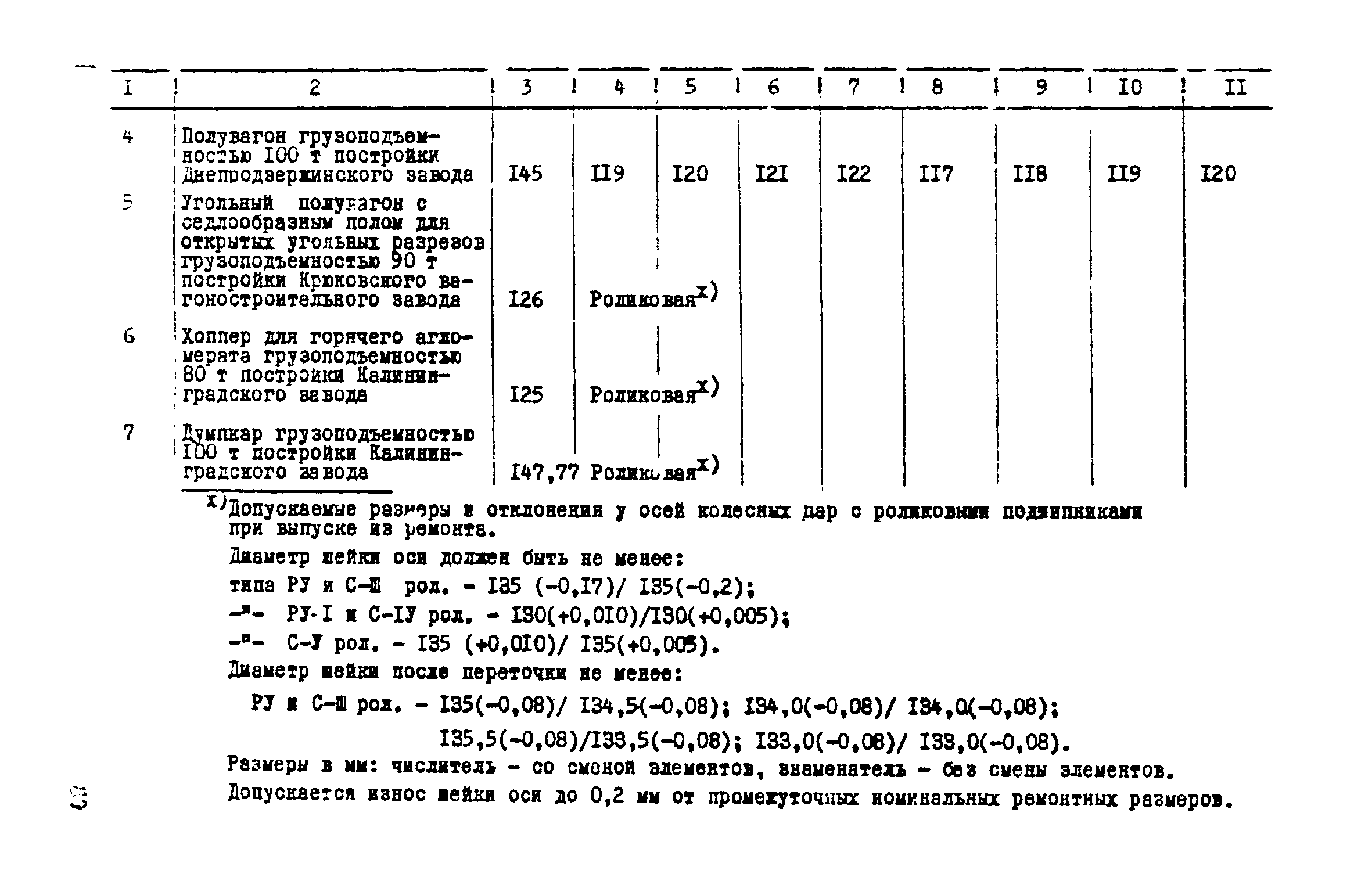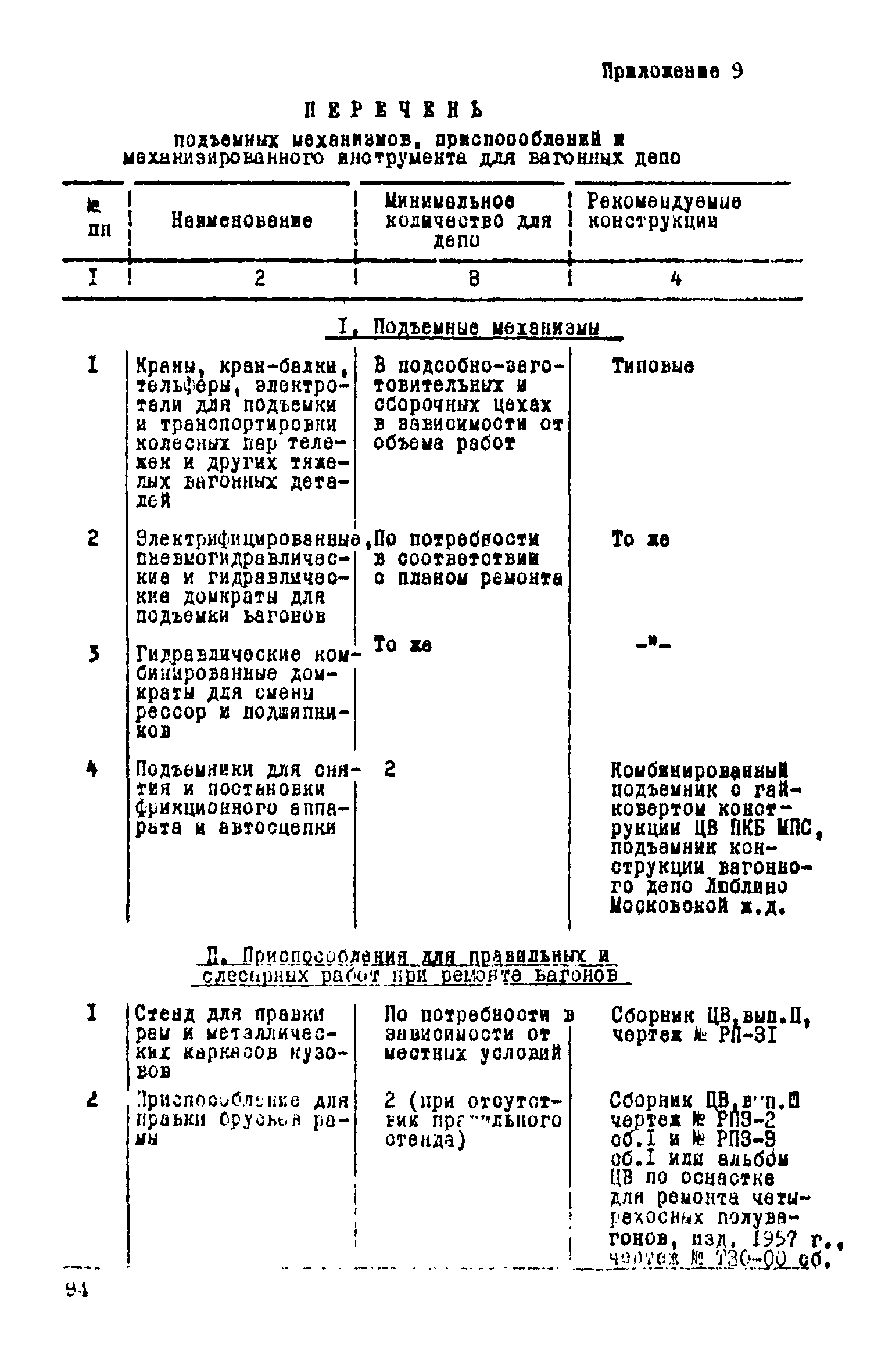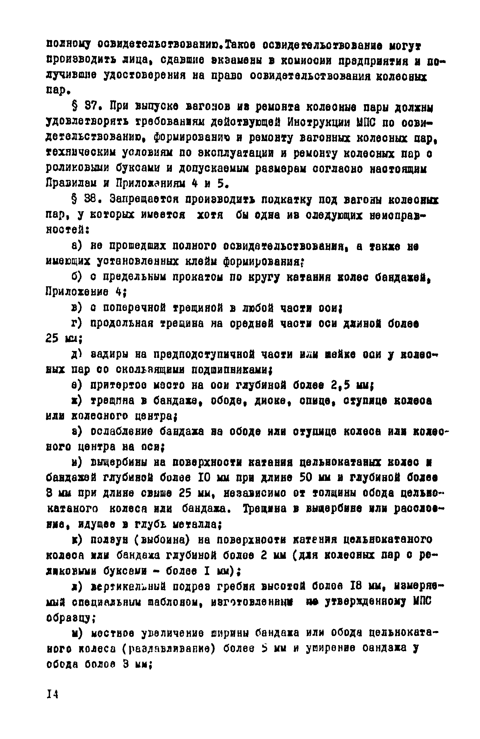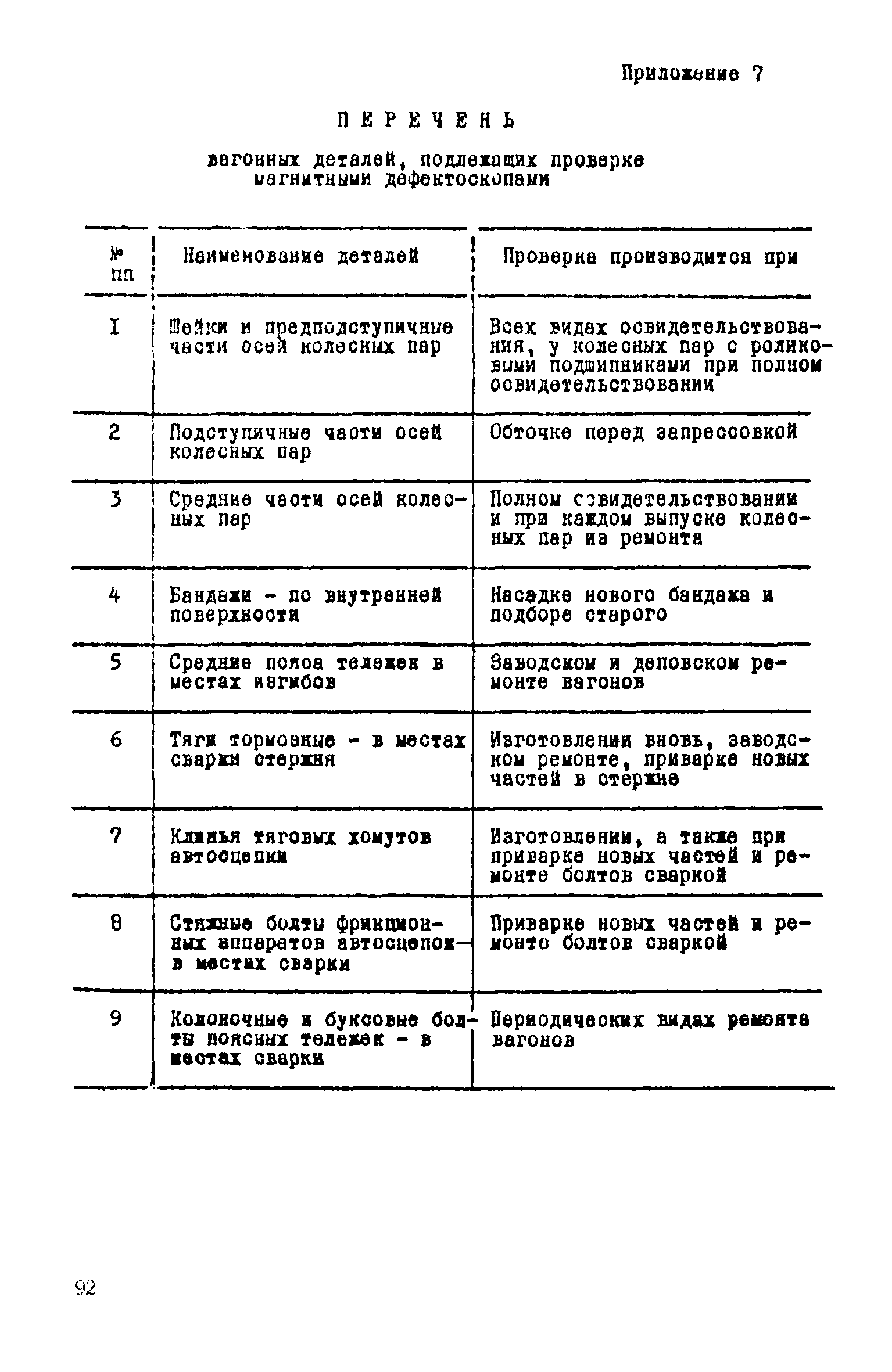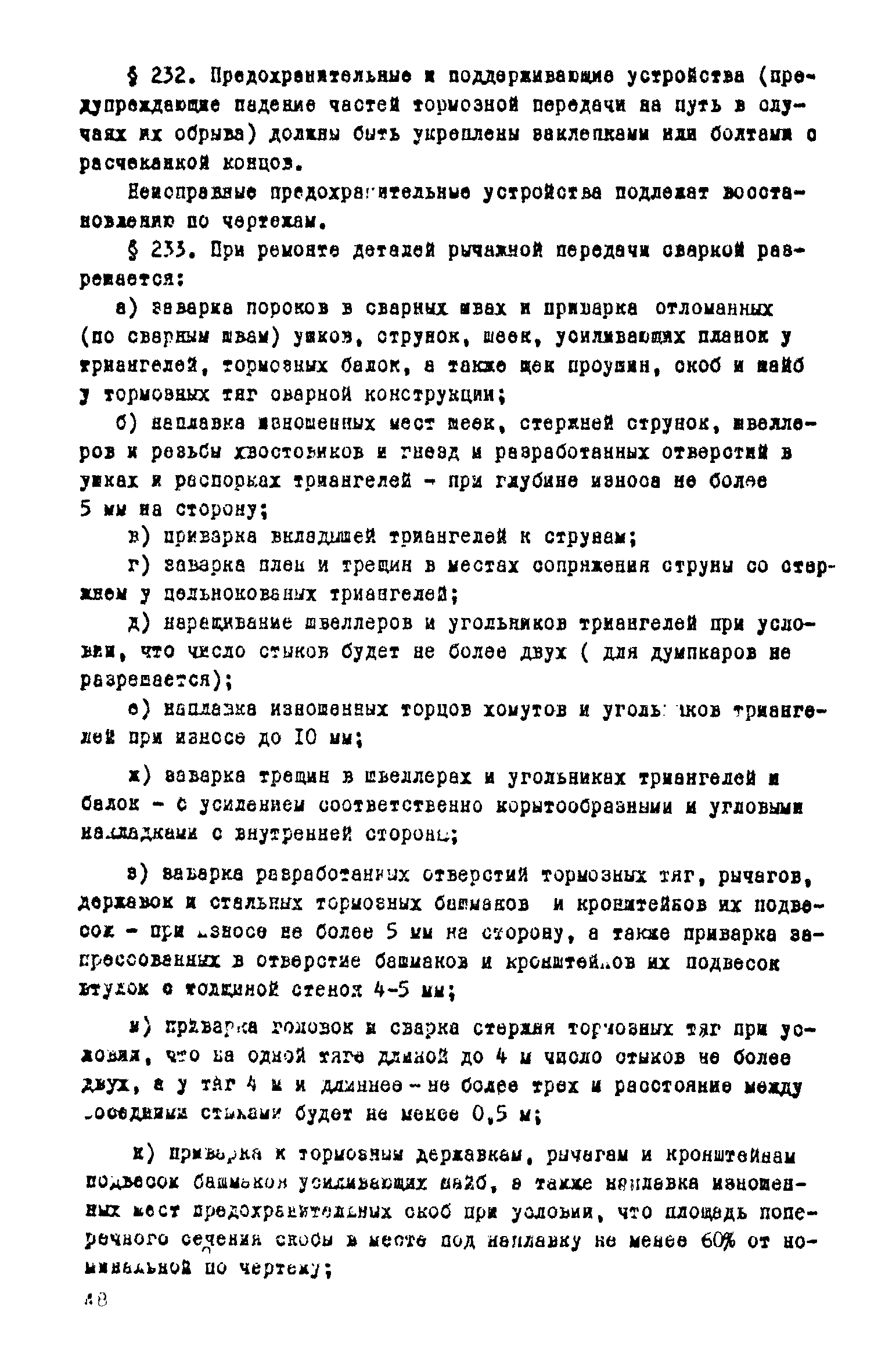 Правила заводского, деповского, профилактического и текущего ремонта вагонов промышленного транспорта колеи 1524 мм| Статус: | справочные материалы, мп, тпр | | Название рус.: | Правила заводского, деповского, профилактического и текущего ремонта вагонов промышленного транспорта колеи 1524 мм | | Дата добавления в базу: | 01.02.2020 | | Дата актуализации: | 01.01.2021 | | Область применения: | Правила ремонта вагонов являются обязательными для всех промышленных предприятий, имеющих и ремонтирующих вагоны серийной постройки (думпкары, хоппер-агломераторы, платформы для перевозки горячего чугуна, полувагоны для перевозки угля, скальных пород, руды и др. грузов), обращающиеся внутри предприятий без выхода на пути железных дорог Министерства путей сообщения. | | Оглавление: | Глава I. Общие положение по ремонту вагонов Глава II. Вагонный ремонт Глава III. Деповский ремонт Глава IV. Профилактический ремонт Глава V. Текущий ремонт вагонов Приложение 1 Перечень официальных изданий Министерства путей сообщения по ремонту и содержанию грузовых вагонов широкой колеи Приложение 2 Наряд-ведомость на ремонт вагонов Приложение 3 Акт о выполненных работах по модернизации вагонов Приложение 4 Допускаемые размеры при ремонте вагонов промышленного транспорта Приложение 5 Таблица наименьших допускаемых диаметров шеек осей колесных пар, подкатываемых под специальные вагоны Приложение 6 Нагрузки и расчетные прогибы для пружин тележек Приложение 7 Перечень вагонных деталей, подлежащих проверке магнитными дефектоскопами Приложение 8 Перечень вагонных деталей, подлежащих испытанию на растяжение Приложение 9 Перечень подъемных механизмов, приспособлений и механизированного инструмента для вагонных депо Приложение 10 Уведомление о приемке вагонов из ремонта Приложение 11 Журнал монтажа роликовых подшипников Приложение 12 Журнал демонтажа роликовых подшипников Приложение 13 Журнал промежуточной ревизии роликовых подшипников Приложение 14 Гарантия на прочность и исправность отремонтированных вагонов и их деталей Приложение 15 Натуральная книжка старшего осмотрщика вагонов на пункте технического осмотра Приложение 16 Уведомление на подачу неисправного вагона для ремонта на ремонтные пути Приложение 17 Справка о тормозах Приложение 18 Перечень подъемных механизмов, приспособлений и инструмента, применяемого при ремонте вагонов (для пунктов технического осмотра вагонов) | | Разработан: | Промтрансниипроект
