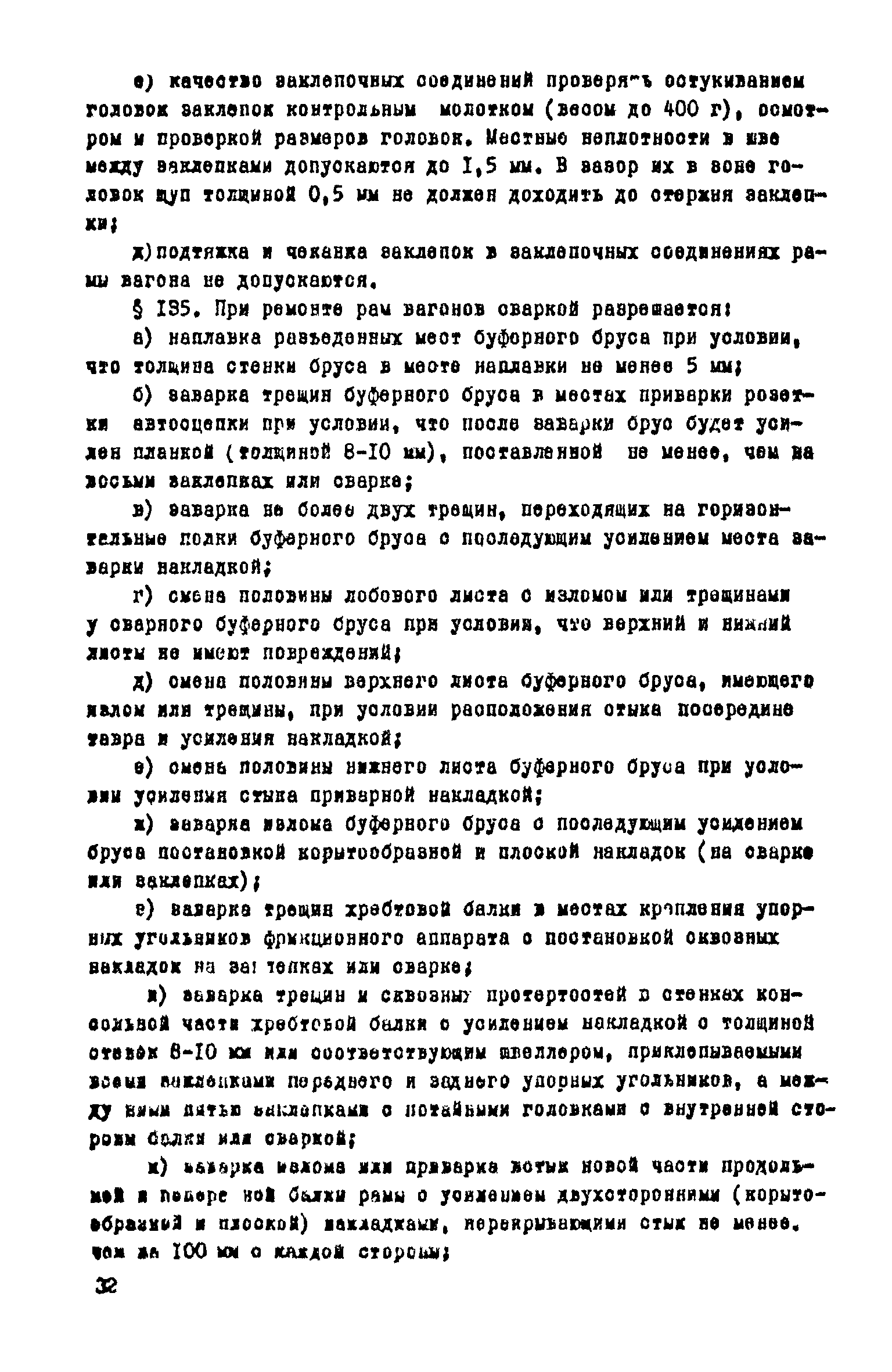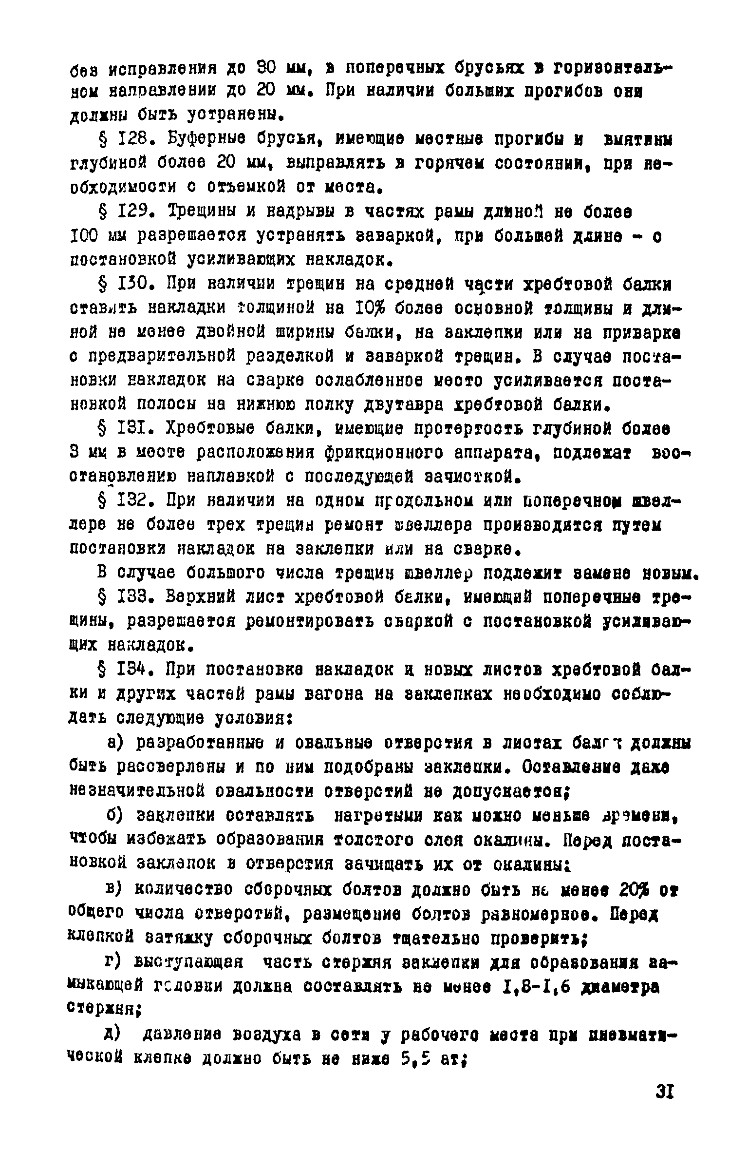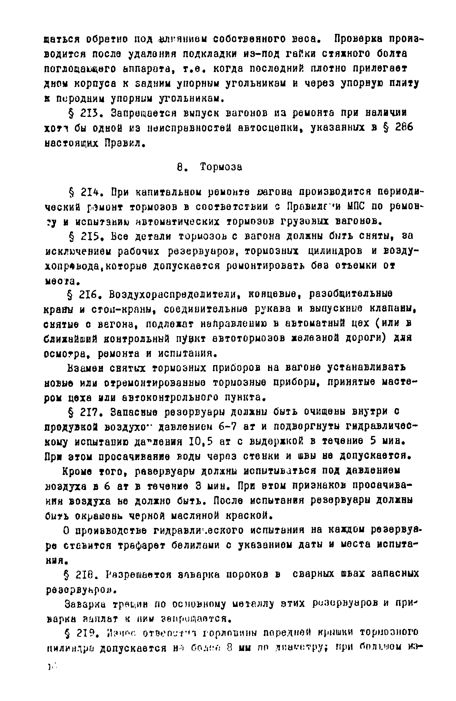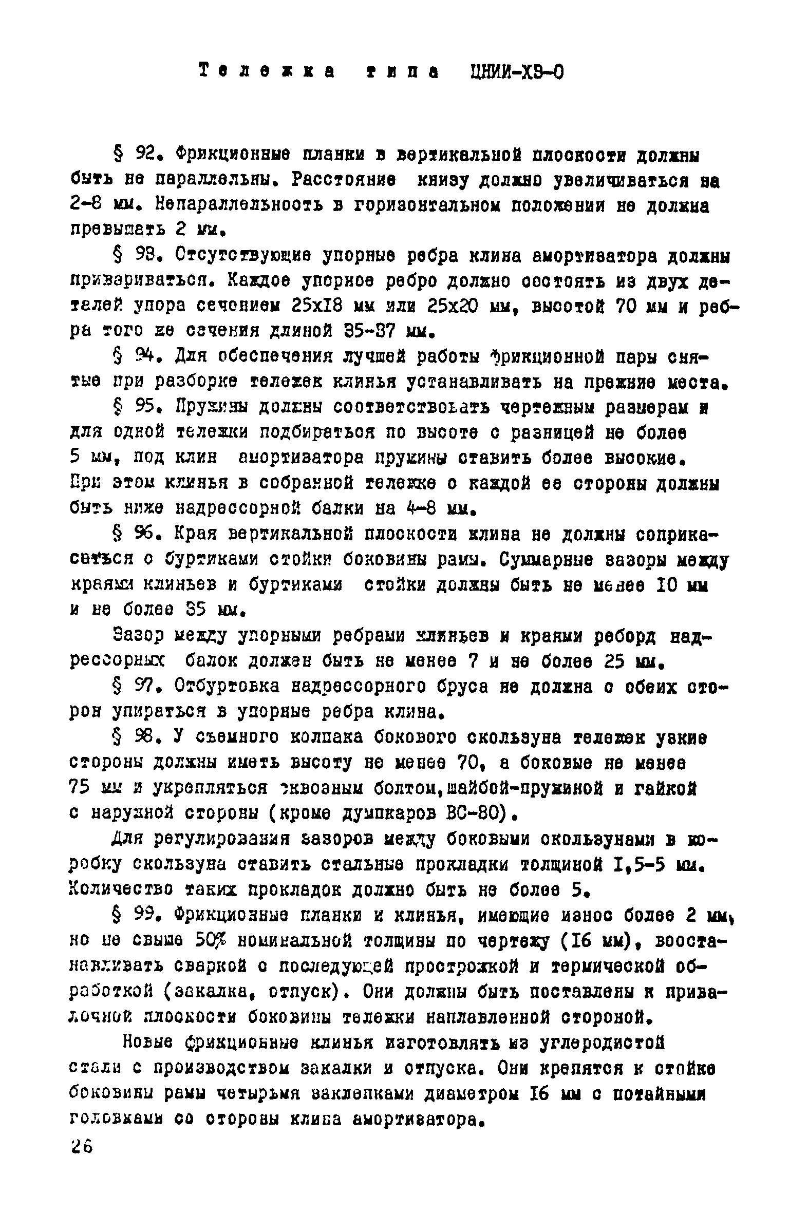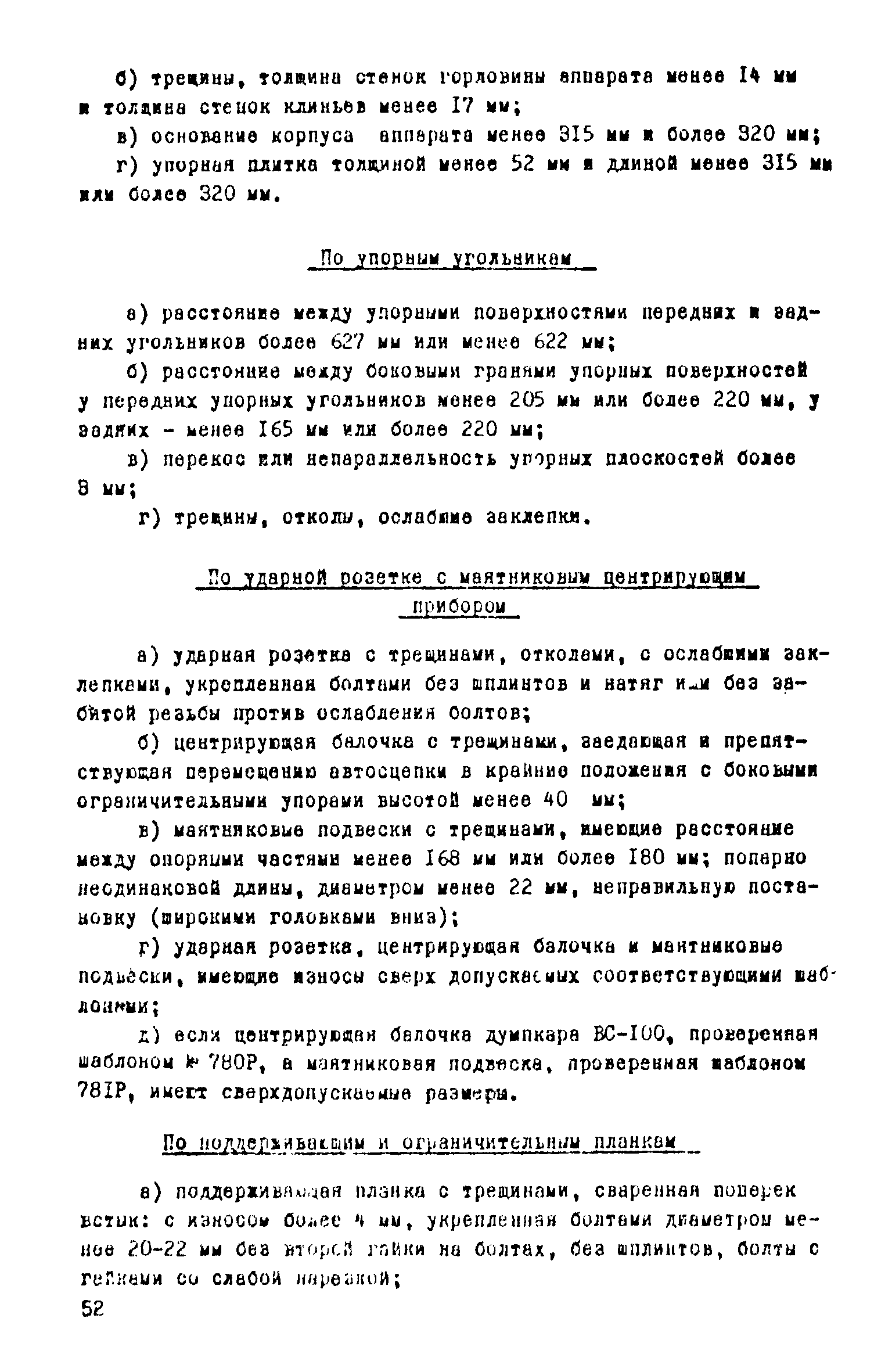 Правила заводского, деповского, профилактического и текущего ремонта вагонов промышленного транспорта колеи 1524 мм| Статус: | справочные материалы, мп, тпр | | Название рус.: | Правила заводского, деповского, профилактического и текущего ремонта вагонов промышленного транспорта колеи 1524 мм | | Дата добавления в базу: | 01.02.2020 | | Дата актуализации: | 01.01.2021 | | Область применения: | Правила ремонта вагонов являются обязательными для всех промышленных предприятий, имеющих и ремонтирующих вагоны серийной постройки (думпкары, хоппер-агломераторы, платформы для перевозки горячего чугуна, полувагоны для перевозки угля, скальных пород, руды и др. грузов), обращающиеся внутри предприятий без выхода на пути железных дорог Министерства путей сообщения. | | Оглавление: | Глава I. Общие положение по ремонту вагонов Глава II. Вагонный ремонт Глава III. Деповский ремонт Глава IV. Профилактический ремонт Глава V. Текущий ремонт вагонов Приложение 1 Перечень официальных изданий Министерства путей сообщения по ремонту и содержанию грузовых вагонов широкой колеи Приложение 2 Наряд-ведомость на ремонт вагонов Приложение 3 Акт о выполненных работах по модернизации вагонов Приложение 4 Допускаемые размеры при ремонте вагонов промышленного транспорта Приложение 5 Таблица наименьших допускаемых диаметров шеек осей колесных пар, подкатываемых под специальные вагоны Приложение 6 Нагрузки и расчетные прогибы для пружин тележек Приложение 7 Перечень вагонных деталей, подлежащих проверке магнитными дефектоскопами Приложение 8 Перечень вагонных деталей, подлежащих испытанию на растяжение Приложение 9 Перечень подъемных механизмов, приспособлений и механизированного инструмента для вагонных депо Приложение 10 Уведомление о приемке вагонов из ремонта Приложение 11 Журнал монтажа роликовых подшипников Приложение 12 Журнал демонтажа роликовых подшипников Приложение 13 Журнал промежуточной ревизии роликовых подшипников Приложение 14 Гарантия на прочность и исправность отремонтированных вагонов и их деталей Приложение 15 Натуральная книжка старшего осмотрщика вагонов на пункте технического осмотра Приложение 16 Уведомление на подачу неисправного вагона для ремонта на ремонтные пути Приложение 17 Справка о тормозах Приложение 18 Перечень подъемных механизмов, приспособлений и инструмента, применяемого при ремонте вагонов (для пунктов технического осмотра вагонов) | | Разработан: | Промтрансниипроект