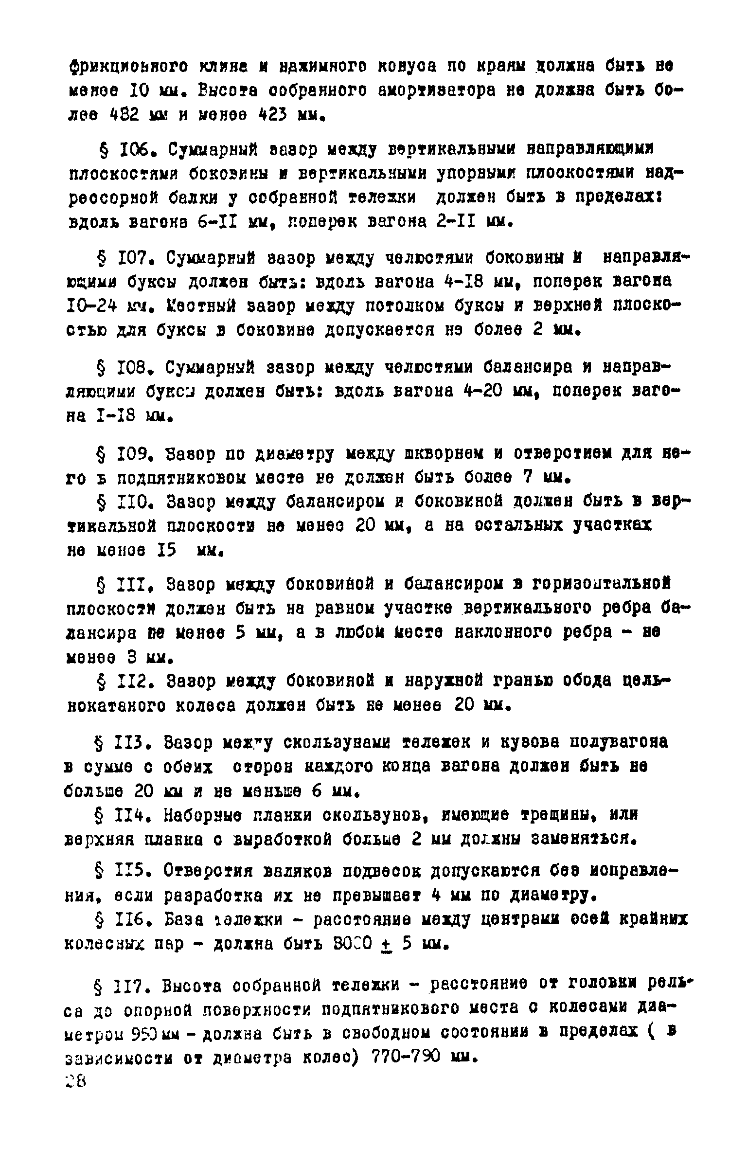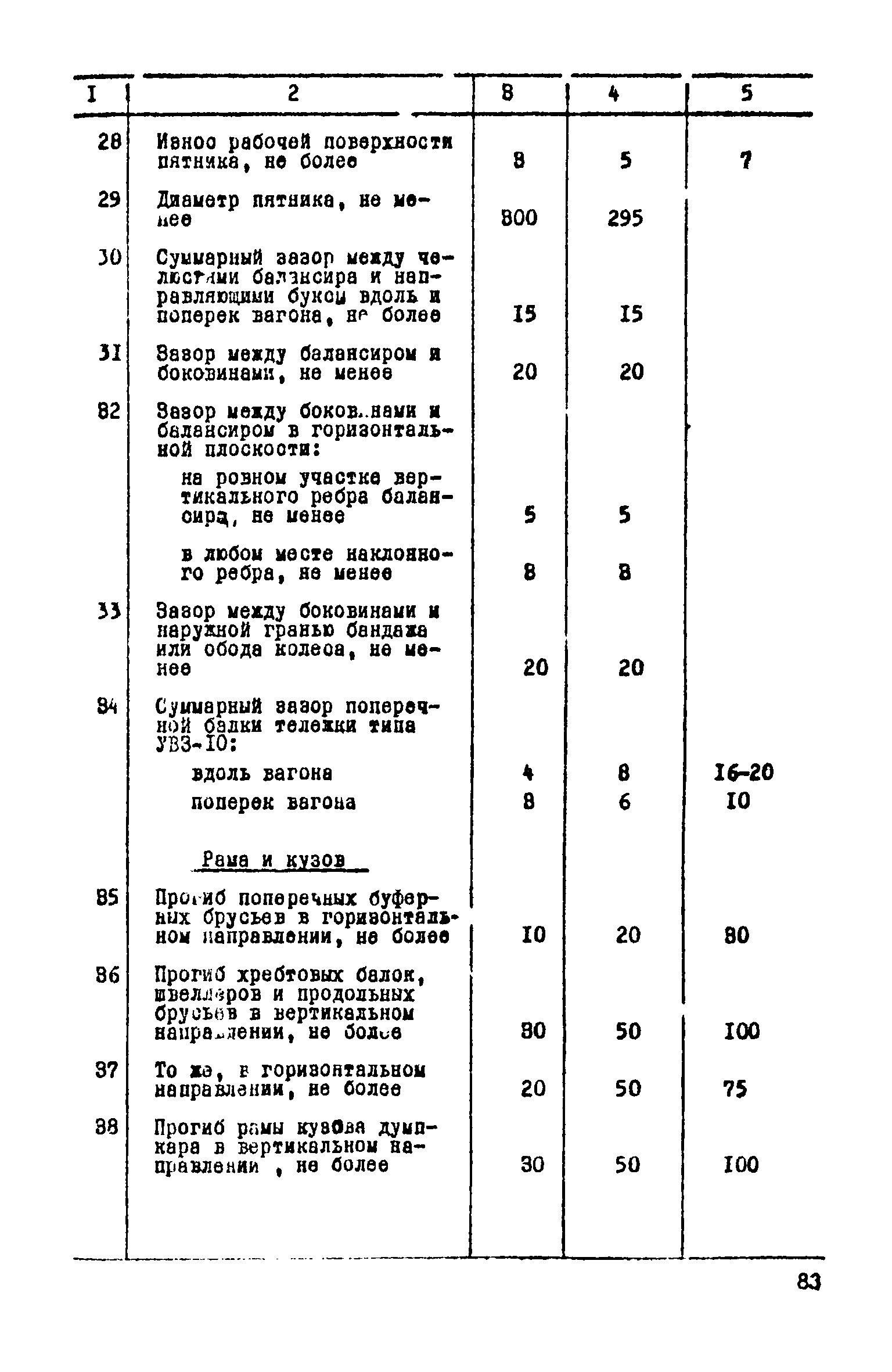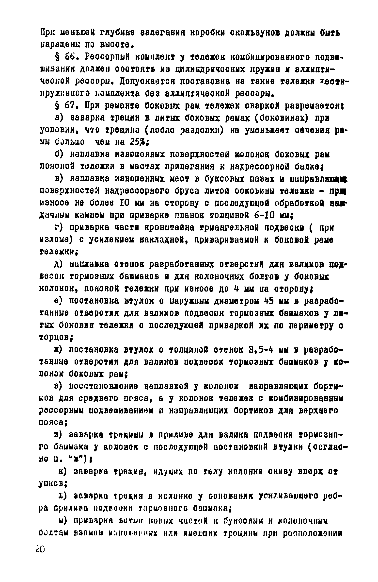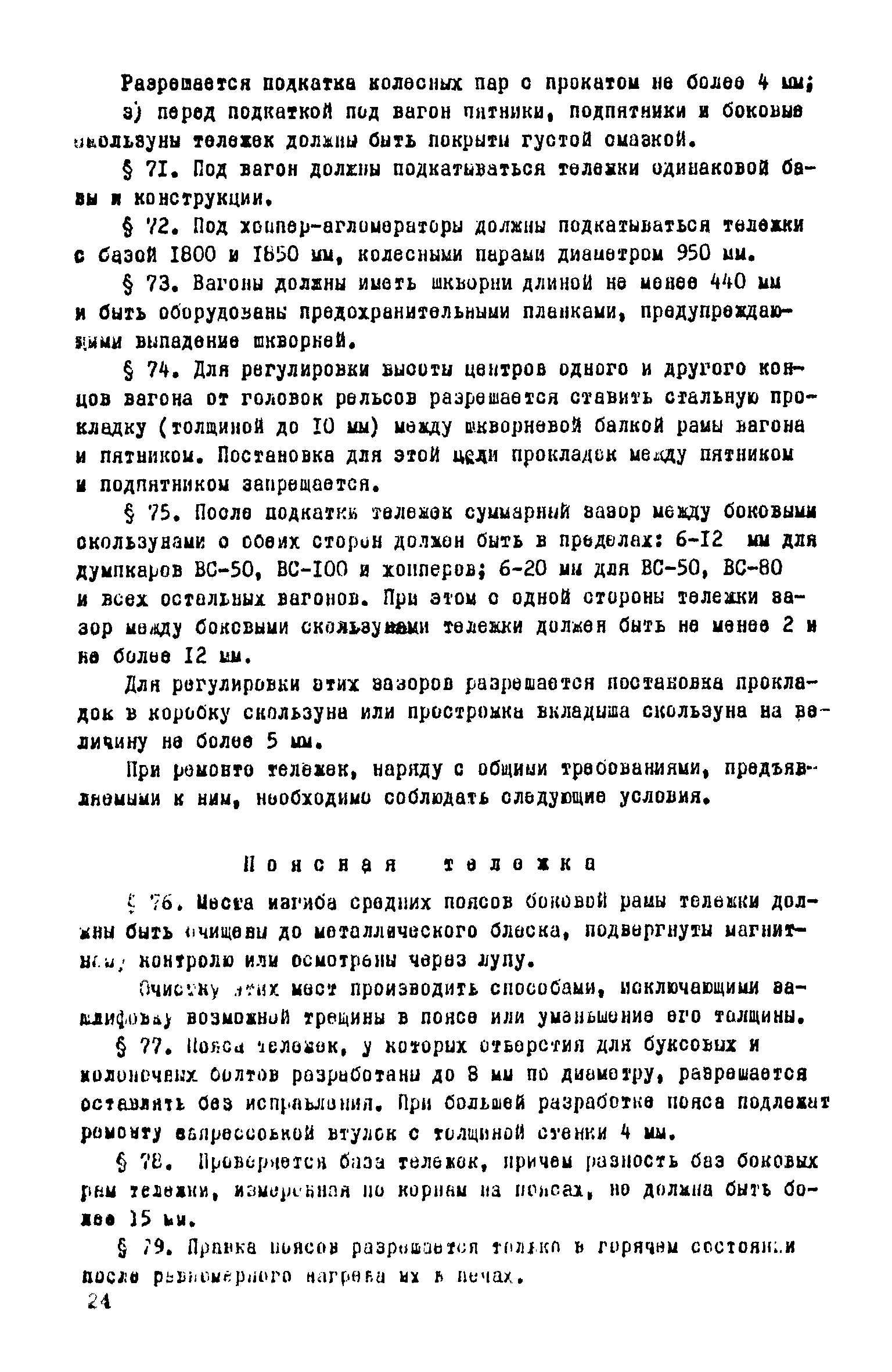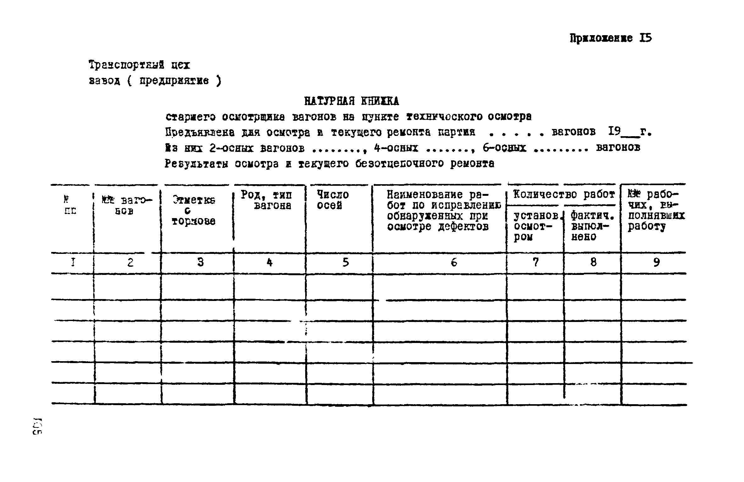 Правила заводского, деповского, профилактического и текущего ремонта вагонов промышленного транспорта колеи 1524 мм| Статус: | справочные материалы, мп, тпр | | Название рус.: | Правила заводского, деповского, профилактического и текущего ремонта вагонов промышленного транспорта колеи 1524 мм | | Дата добавления в базу: | 01.02.2020 | | Дата актуализации: | 01.01.2021 | | Область применения: | Правила ремонта вагонов являются обязательными для всех промышленных предприятий, имеющих и ремонтирующих вагоны серийной постройки (думпкары, хоппер-агломераторы, платформы для перевозки горячего чугуна, полувагоны для перевозки угля, скальных пород, руды и др. грузов), обращающиеся внутри предприятий без выхода на пути железных дорог Министерства путей сообщения. | | Оглавление: | Глава I. Общие положение по ремонту вагонов Глава II. Вагонный ремонт Глава III. Деповский ремонт Глава IV. Профилактический ремонт Глава V. Текущий ремонт вагонов Приложение 1 Перечень официальных изданий Министерства путей сообщения по ремонту и содержанию грузовых вагонов широкой колеи Приложение 2 Наряд-ведомость на ремонт вагонов Приложение 3 Акт о выполненных работах по модернизации вагонов Приложение 4 Допускаемые размеры при ремонте вагонов промышленного транспорта Приложение 5 Таблица наименьших допускаемых диаметров шеек осей колесных пар, подкатываемых под специальные вагоны Приложение 6 Нагрузки и расчетные прогибы для пружин тележек Приложение 7 Перечень вагонных деталей, подлежащих проверке магнитными дефектоскопами Приложение 8 Перечень вагонных деталей, подлежащих испытанию на растяжение Приложение 9 Перечень подъемных механизмов, приспособлений и механизированного инструмента для вагонных депо Приложение 10 Уведомление о приемке вагонов из ремонта Приложение 11 Журнал монтажа роликовых подшипников Приложение 12 Журнал демонтажа роликовых подшипников Приложение 13 Журнал промежуточной ревизии роликовых подшипников Приложение 14 Гарантия на прочность и исправность отремонтированных вагонов и их деталей Приложение 15 Натуральная книжка старшего осмотрщика вагонов на пункте технического осмотра Приложение 16 Уведомление на подачу неисправного вагона для ремонта на ремонтные пути Приложение 17 Справка о тормозах Приложение 18 Перечень подъемных механизмов, приспособлений и инструмента, применяемого при ремонте вагонов (для пунктов технического осмотра вагонов) | | Разработан: | Промтрансниипроект