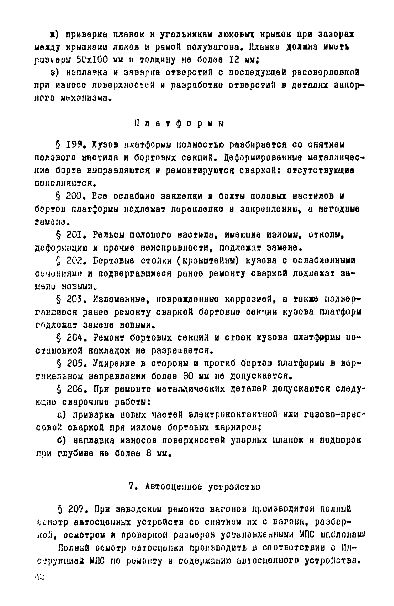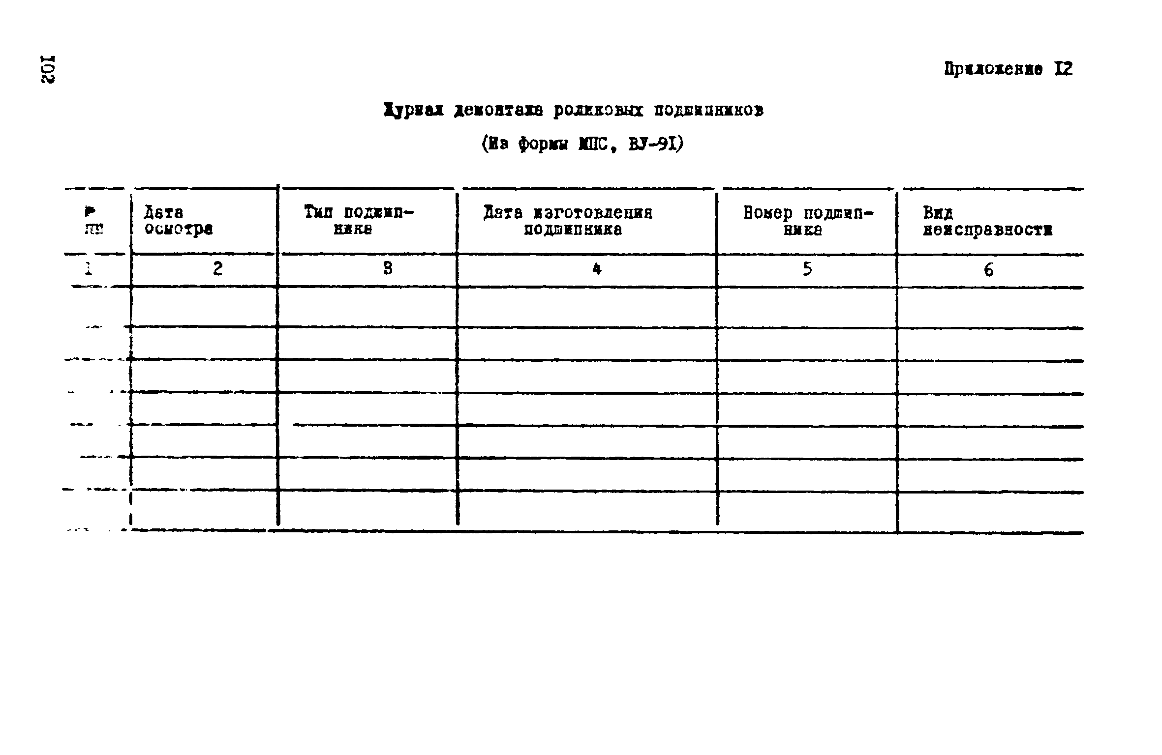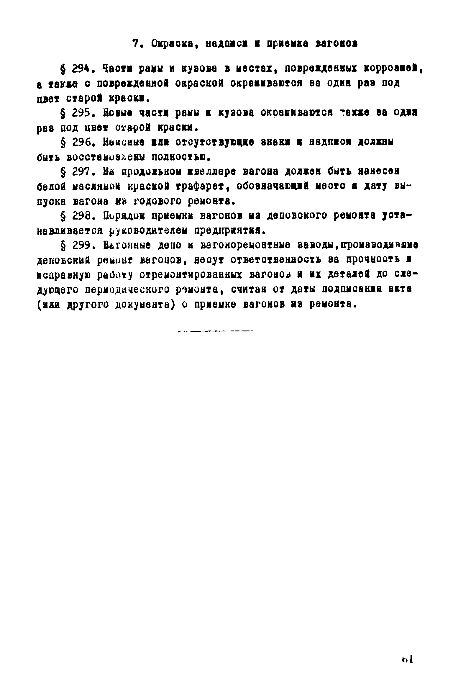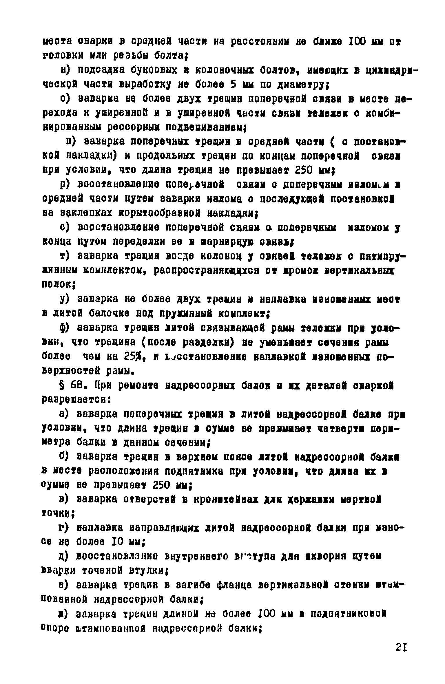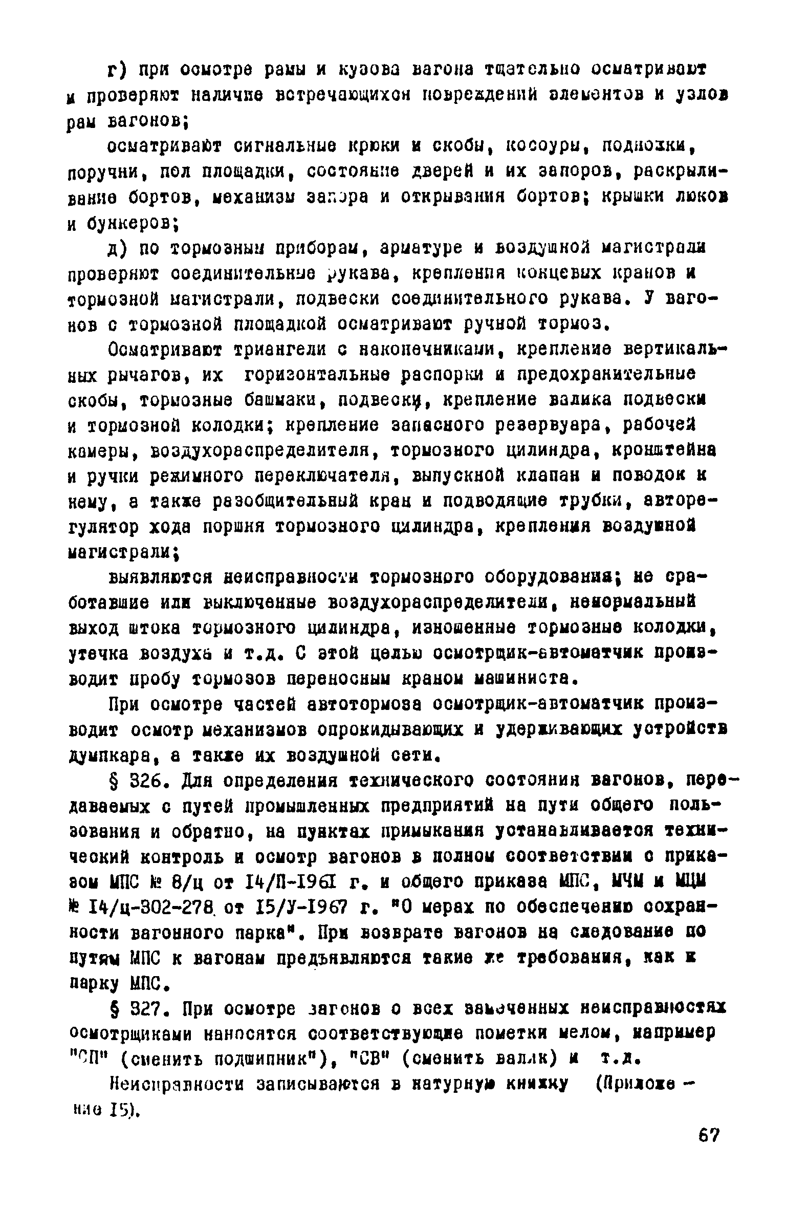 Правила заводского, деповского, профилактического и текущего ремонта вагонов промышленного транспорта колеи 1524 мм| Статус: | справочные материалы, мп, тпр | | Название рус.: | Правила заводского, деповского, профилактического и текущего ремонта вагонов промышленного транспорта колеи 1524 мм | | Дата добавления в базу: | 01.02.2020 | | Дата актуализации: | 01.01.2021 | | Область применения: | Правила ремонта вагонов являются обязательными для всех промышленных предприятий, имеющих и ремонтирующих вагоны серийной постройки (думпкары, хоппер-агломераторы, платформы для перевозки горячего чугуна, полувагоны для перевозки угля, скальных пород, руды и др. грузов), обращающиеся внутри предприятий без выхода на пути железных дорог Министерства путей сообщения. | | Оглавление: | Глава I. Общие положение по ремонту вагонов Глава II. Вагонный ремонт Глава III. Деповский ремонт Глава IV. Профилактический ремонт Глава V. Текущий ремонт вагонов Приложение 1 Перечень официальных изданий Министерства путей сообщения по ремонту и содержанию грузовых вагонов широкой колеи Приложение 2 Наряд-ведомость на ремонт вагонов Приложение 3 Акт о выполненных работах по модернизации вагонов Приложение 4 Допускаемые размеры при ремонте вагонов промышленного транспорта Приложение 5 Таблица наименьших допускаемых диаметров шеек осей колесных пар, подкатываемых под специальные вагоны Приложение 6 Нагрузки и расчетные прогибы для пружин тележек Приложение 7 Перечень вагонных деталей, подлежащих проверке магнитными дефектоскопами Приложение 8 Перечень вагонных деталей, подлежащих испытанию на растяжение Приложение 9 Перечень подъемных механизмов, приспособлений и механизированного инструмента для вагонных депо Приложение 10 Уведомление о приемке вагонов из ремонта Приложение 11 Журнал монтажа роликовых подшипников Приложение 12 Журнал демонтажа роликовых подшипников Приложение 13 Журнал промежуточной ревизии роликовых подшипников Приложение 14 Гарантия на прочность и исправность отремонтированных вагонов и их деталей Приложение 15 Натуральная книжка старшего осмотрщика вагонов на пункте технического осмотра Приложение 16 Уведомление на подачу неисправного вагона для ремонта на ремонтные пути Приложение 17 Справка о тормозах Приложение 18 Перечень подъемных механизмов, приспособлений и инструмента, применяемого при ремонте вагонов (для пунктов технического осмотра вагонов) | | Разработан: | Промтрансниипроект