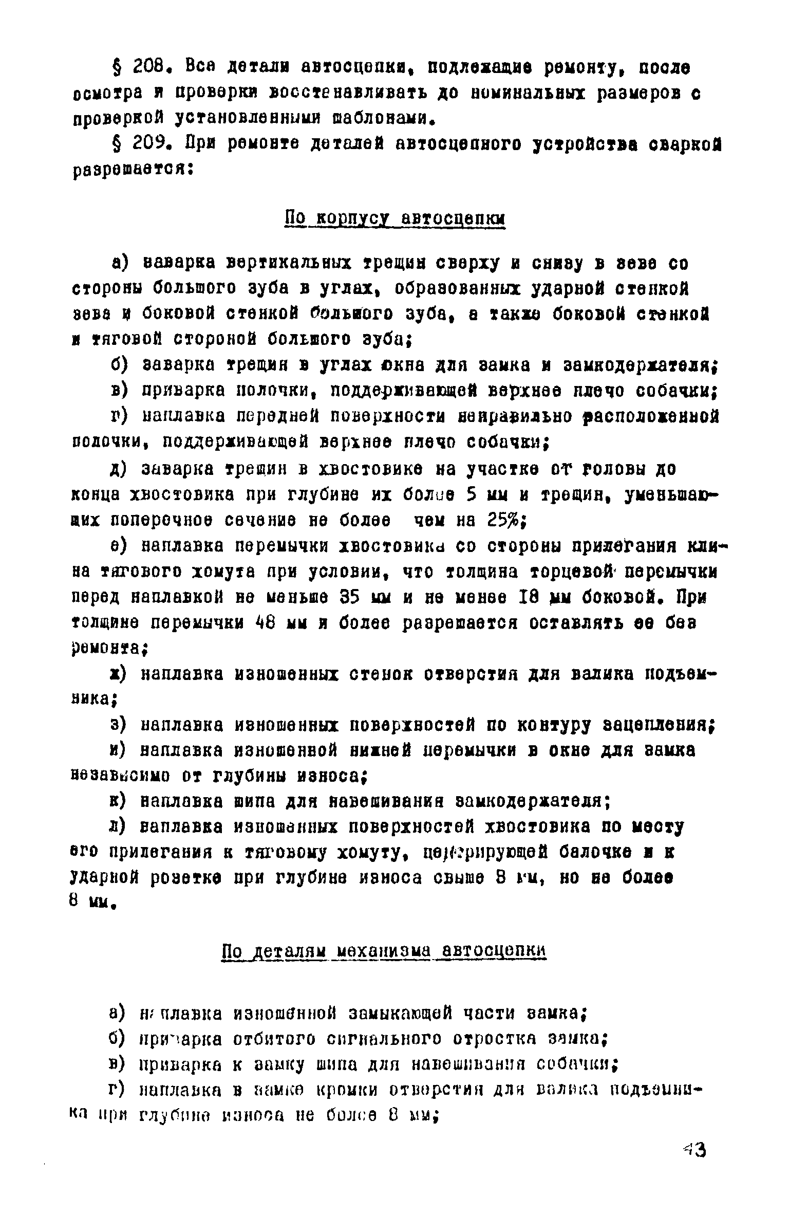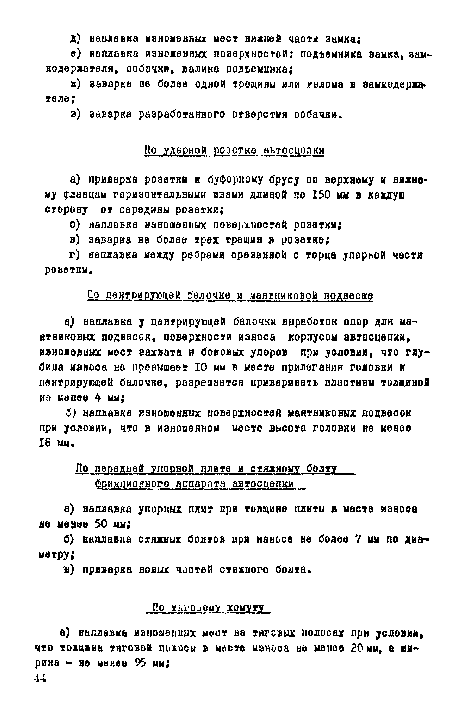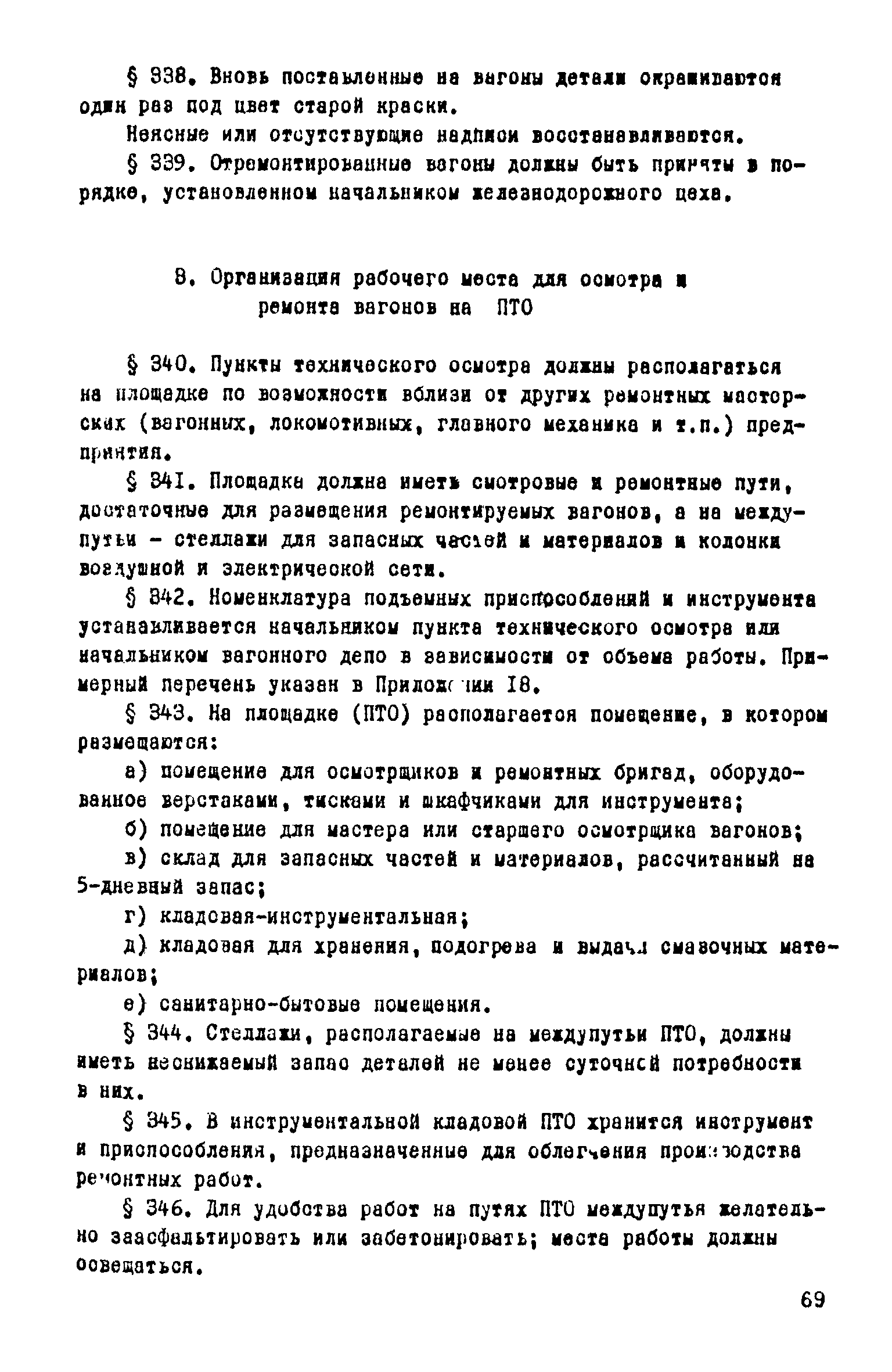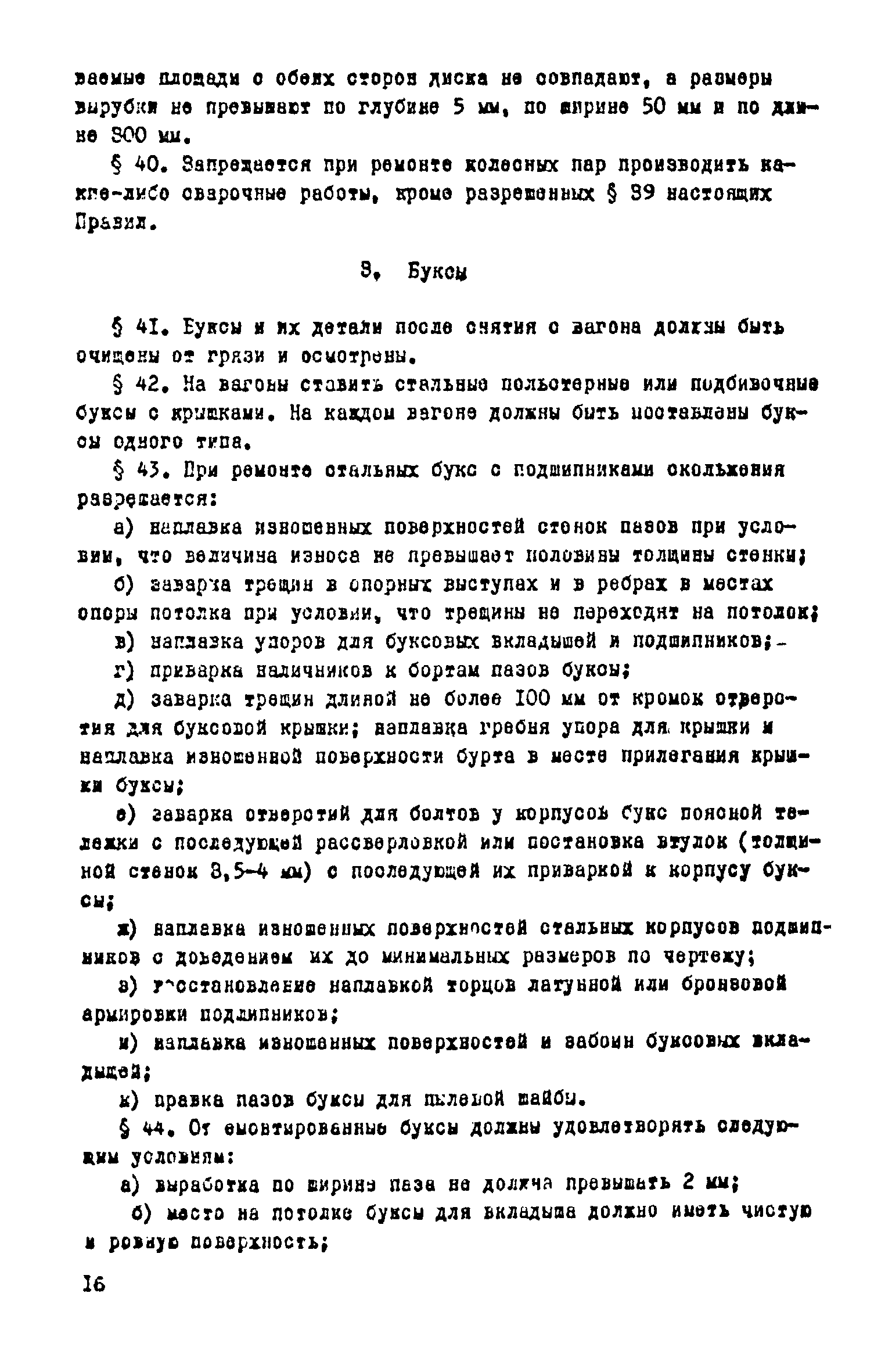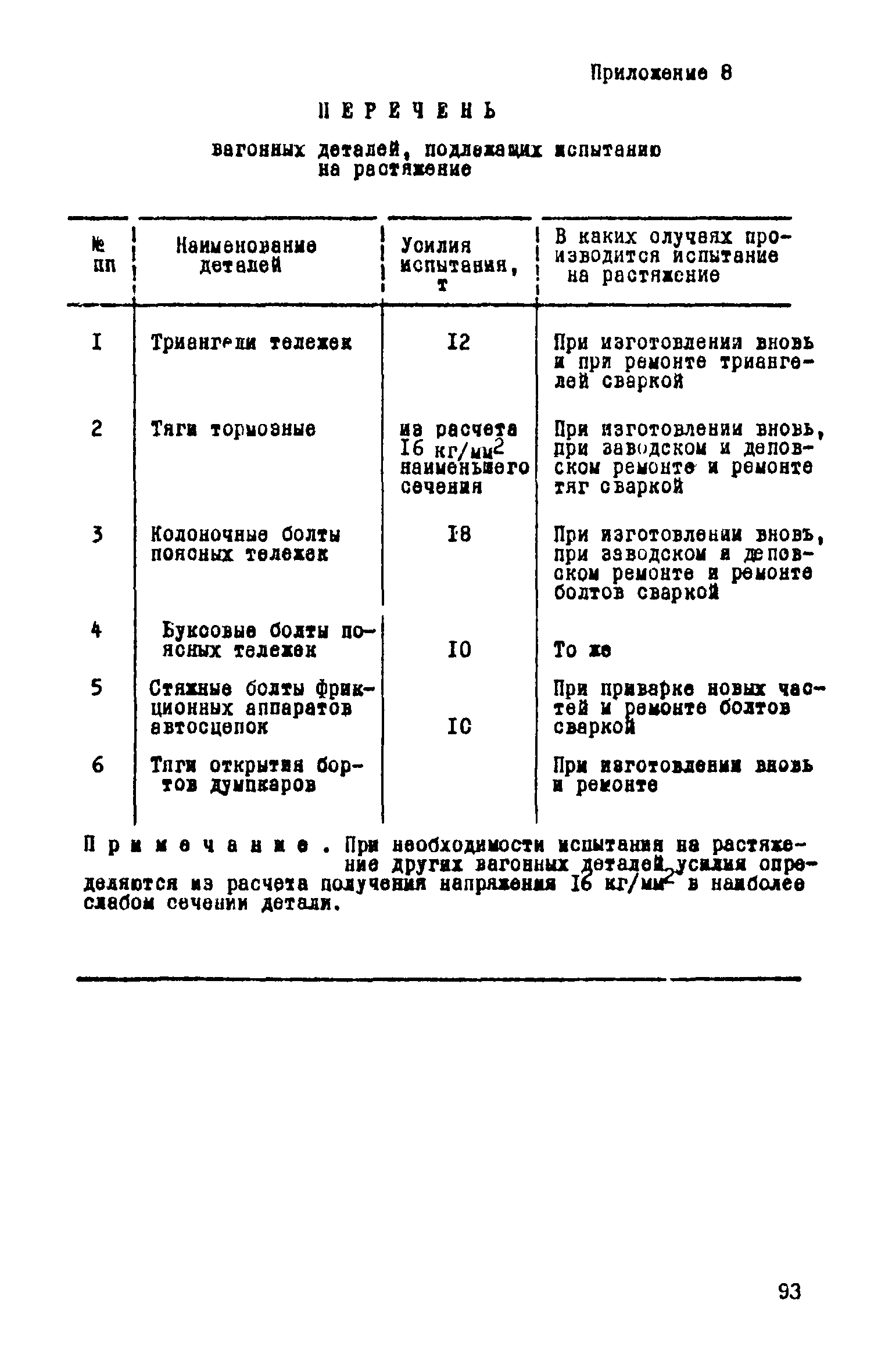 Правила заводского, деповского, профилактического и текущего ремонта вагонов промышленного транспорта колеи 1524 мм| Статус: | справочные материалы, мп, тпр | | Название рус.: | Правила заводского, деповского, профилактического и текущего ремонта вагонов промышленного транспорта колеи 1524 мм | | Дата добавления в базу: | 01.02.2020 | | Дата актуализации: | 01.01.2021 | | Область применения: | Правила ремонта вагонов являются обязательными для всех промышленных предприятий, имеющих и ремонтирующих вагоны серийной постройки (думпкары, хоппер-агломераторы, платформы для перевозки горячего чугуна, полувагоны для перевозки угля, скальных пород, руды и др. грузов), обращающиеся внутри предприятий без выхода на пути железных дорог Министерства путей сообщения. | | Оглавление: | Глава I. Общие положение по ремонту вагонов Глава II. Вагонный ремонт Глава III. Деповский ремонт Глава IV. Профилактический ремонт Глава V. Текущий ремонт вагонов Приложение 1 Перечень официальных изданий Министерства путей сообщения по ремонту и содержанию грузовых вагонов широкой колеи Приложение 2 Наряд-ведомость на ремонт вагонов Приложение 3 Акт о выполненных работах по модернизации вагонов Приложение 4 Допускаемые размеры при ремонте вагонов промышленного транспорта Приложение 5 Таблица наименьших допускаемых диаметров шеек осей колесных пар, подкатываемых под специальные вагоны Приложение 6 Нагрузки и расчетные прогибы для пружин тележек Приложение 7 Перечень вагонных деталей, подлежащих проверке магнитными дефектоскопами Приложение 8 Перечень вагонных деталей, подлежащих испытанию на растяжение Приложение 9 Перечень подъемных механизмов, приспособлений и механизированного инструмента для вагонных депо Приложение 10 Уведомление о приемке вагонов из ремонта Приложение 11 Журнал монтажа роликовых подшипников Приложение 12 Журнал демонтажа роликовых подшипников Приложение 13 Журнал промежуточной ревизии роликовых подшипников Приложение 14 Гарантия на прочность и исправность отремонтированных вагонов и их деталей Приложение 15 Натуральная книжка старшего осмотрщика вагонов на пункте технического осмотра Приложение 16 Уведомление на подачу неисправного вагона для ремонта на ремонтные пути Приложение 17 Справка о тормозах Приложение 18 Перечень подъемных механизмов, приспособлений и инструмента, применяемого при ремонте вагонов (для пунктов технического осмотра вагонов) | | Разработан: | Промтрансниипроект