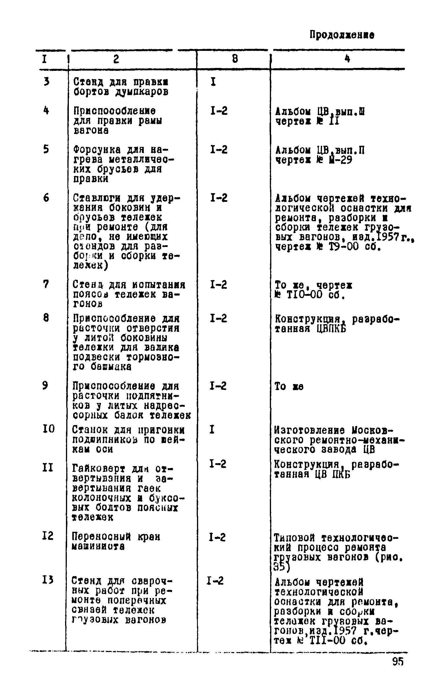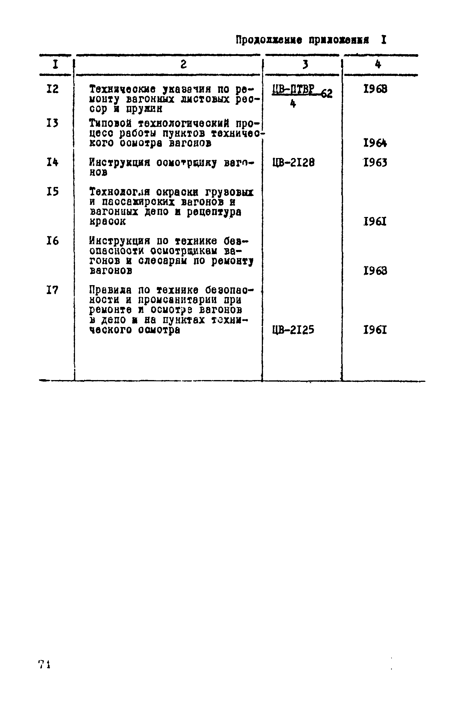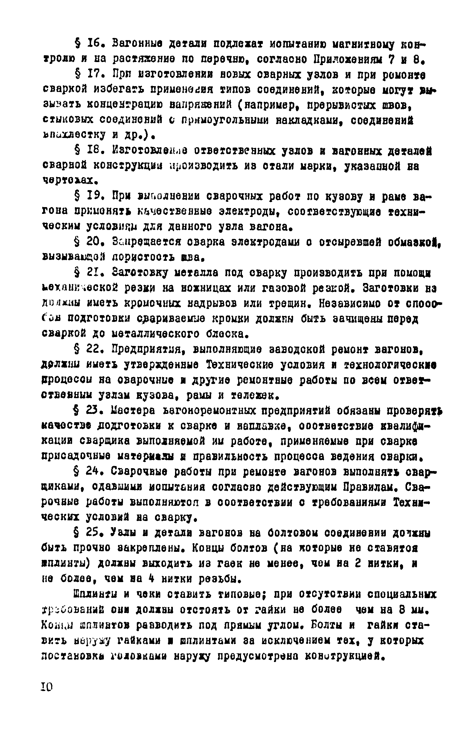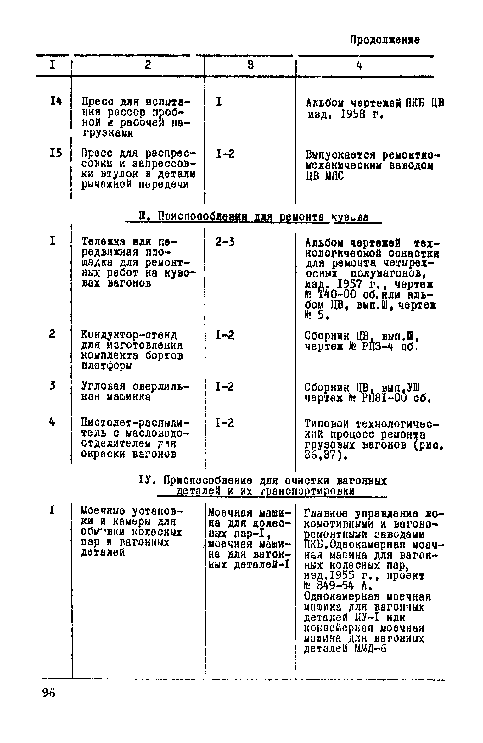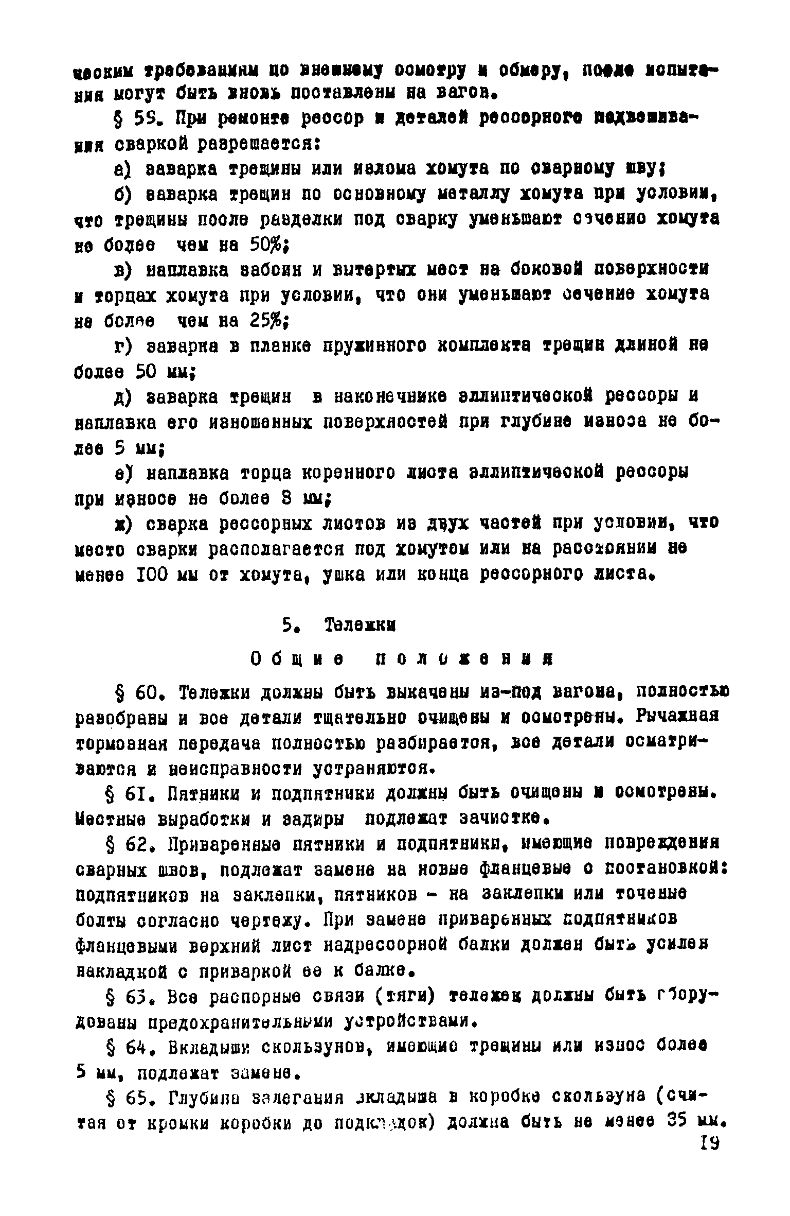 Правила заводского, деповского, профилактического и текущего ремонта вагонов промышленного транспорта колеи 1524 мм| Статус: | справочные материалы, мп, тпр | | Название рус.: | Правила заводского, деповского, профилактического и текущего ремонта вагонов промышленного транспорта колеи 1524 мм | | Дата добавления в базу: | 01.02.2020 | | Дата актуализации: | 01.01.2021 | | Область применения: | Правила ремонта вагонов являются обязательными для всех промышленных предприятий, имеющих и ремонтирующих вагоны серийной постройки (думпкары, хоппер-агломераторы, платформы для перевозки горячего чугуна, полувагоны для перевозки угля, скальных пород, руды и др. грузов), обращающиеся внутри предприятий без выхода на пути железных дорог Министерства путей сообщения. | | Оглавление: | Глава I. Общие положение по ремонту вагонов Глава II. Вагонный ремонт Глава III. Деповский ремонт Глава IV. Профилактический ремонт Глава V. Текущий ремонт вагонов Приложение 1 Перечень официальных изданий Министерства путей сообщения по ремонту и содержанию грузовых вагонов широкой колеи Приложение 2 Наряд-ведомость на ремонт вагонов Приложение 3 Акт о выполненных работах по модернизации вагонов Приложение 4 Допускаемые размеры при ремонте вагонов промышленного транспорта Приложение 5 Таблица наименьших допускаемых диаметров шеек осей колесных пар, подкатываемых под специальные вагоны Приложение 6 Нагрузки и расчетные прогибы для пружин тележек Приложение 7 Перечень вагонных деталей, подлежащих проверке магнитными дефектоскопами Приложение 8 Перечень вагонных деталей, подлежащих испытанию на растяжение Приложение 9 Перечень подъемных механизмов, приспособлений и механизированного инструмента для вагонных депо Приложение 10 Уведомление о приемке вагонов из ремонта Приложение 11 Журнал монтажа роликовых подшипников Приложение 12 Журнал демонтажа роликовых подшипников Приложение 13 Журнал промежуточной ревизии роликовых подшипников Приложение 14 Гарантия на прочность и исправность отремонтированных вагонов и их деталей Приложение 15 Натуральная книжка старшего осмотрщика вагонов на пункте технического осмотра Приложение 16 Уведомление на подачу неисправного вагона для ремонта на ремонтные пути Приложение 17 Справка о тормозах Приложение 18 Перечень подъемных механизмов, приспособлений и инструмента, применяемого при ремонте вагонов (для пунктов технического осмотра вагонов) | | Разработан: | Промтрансниипроект