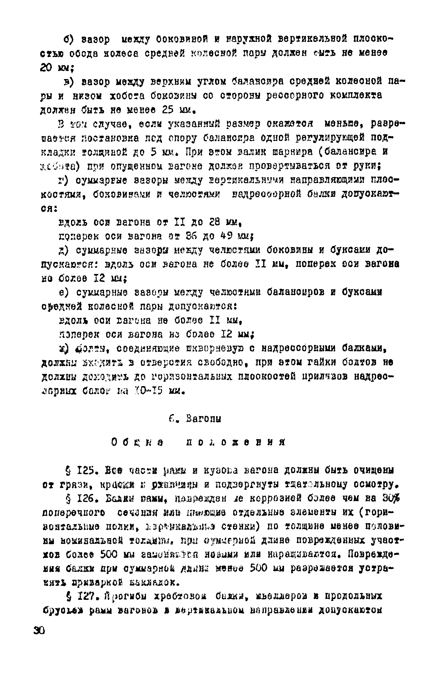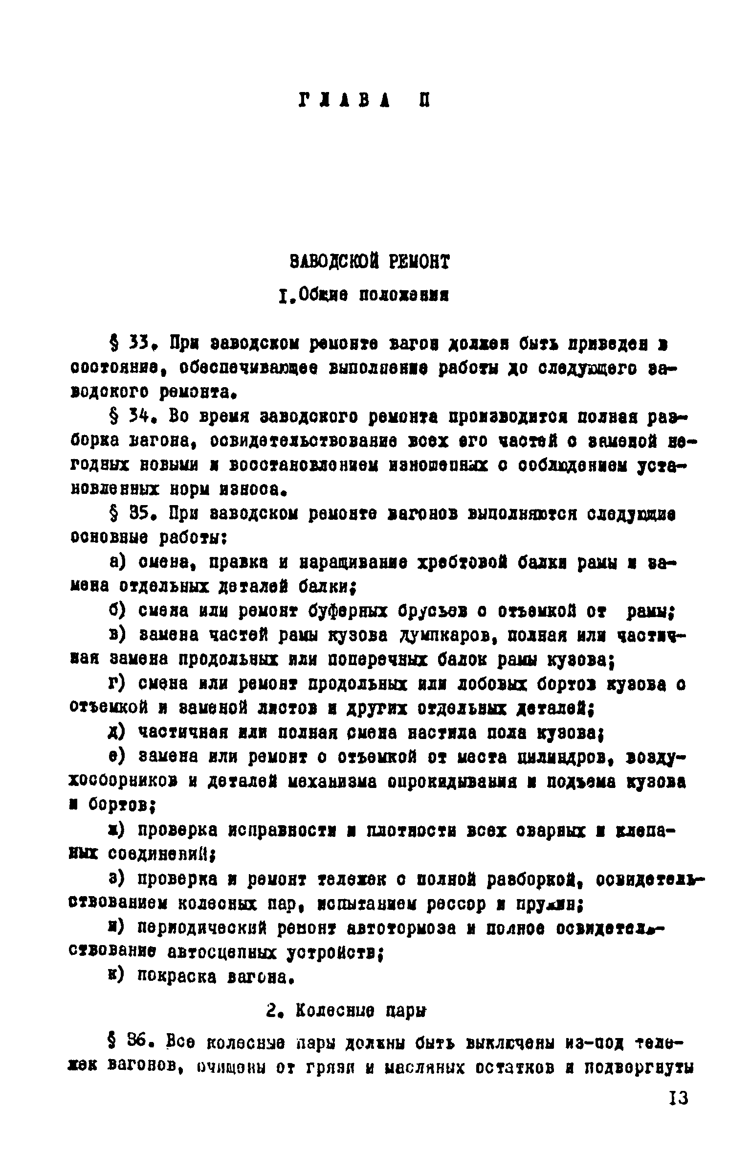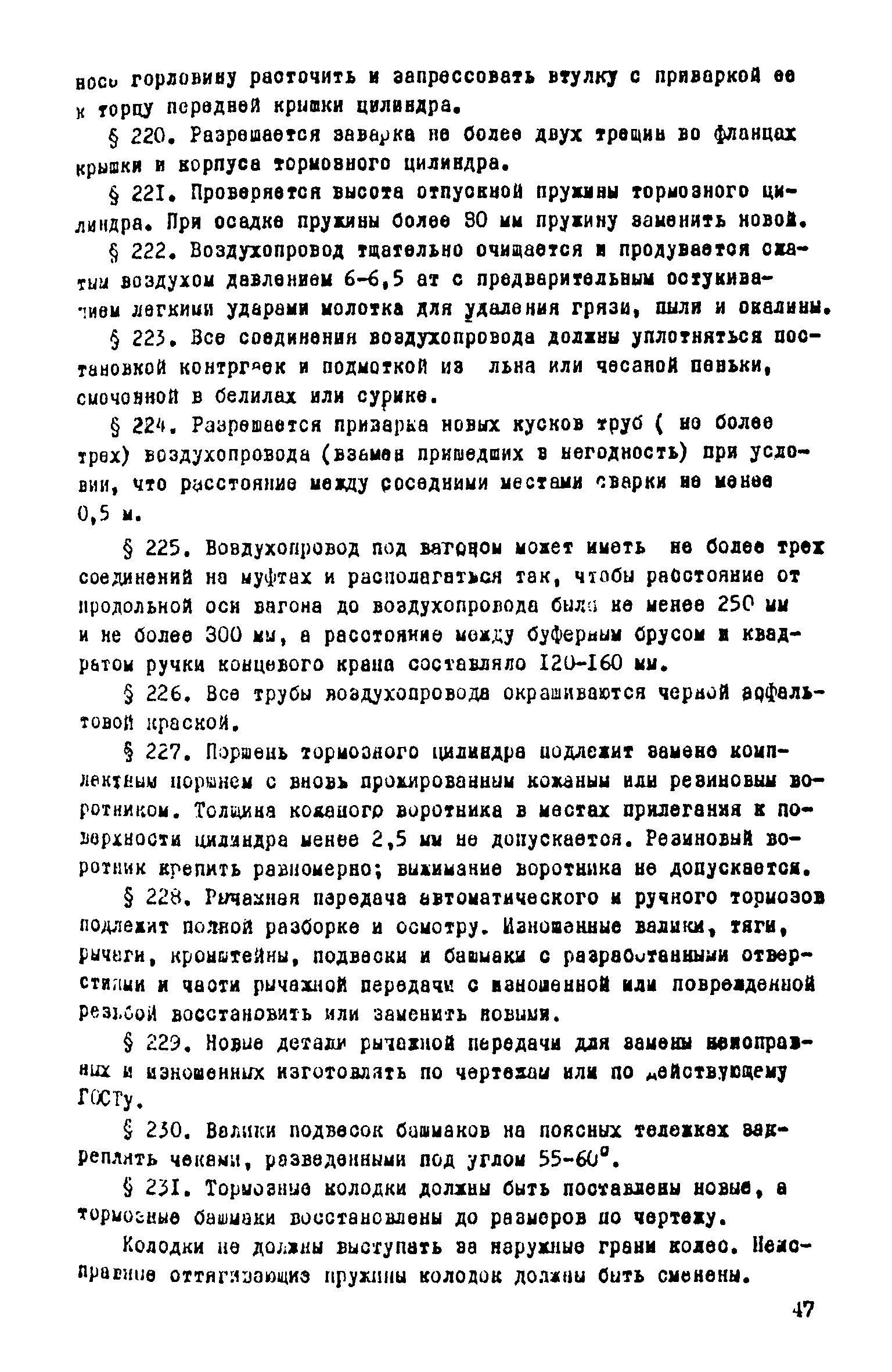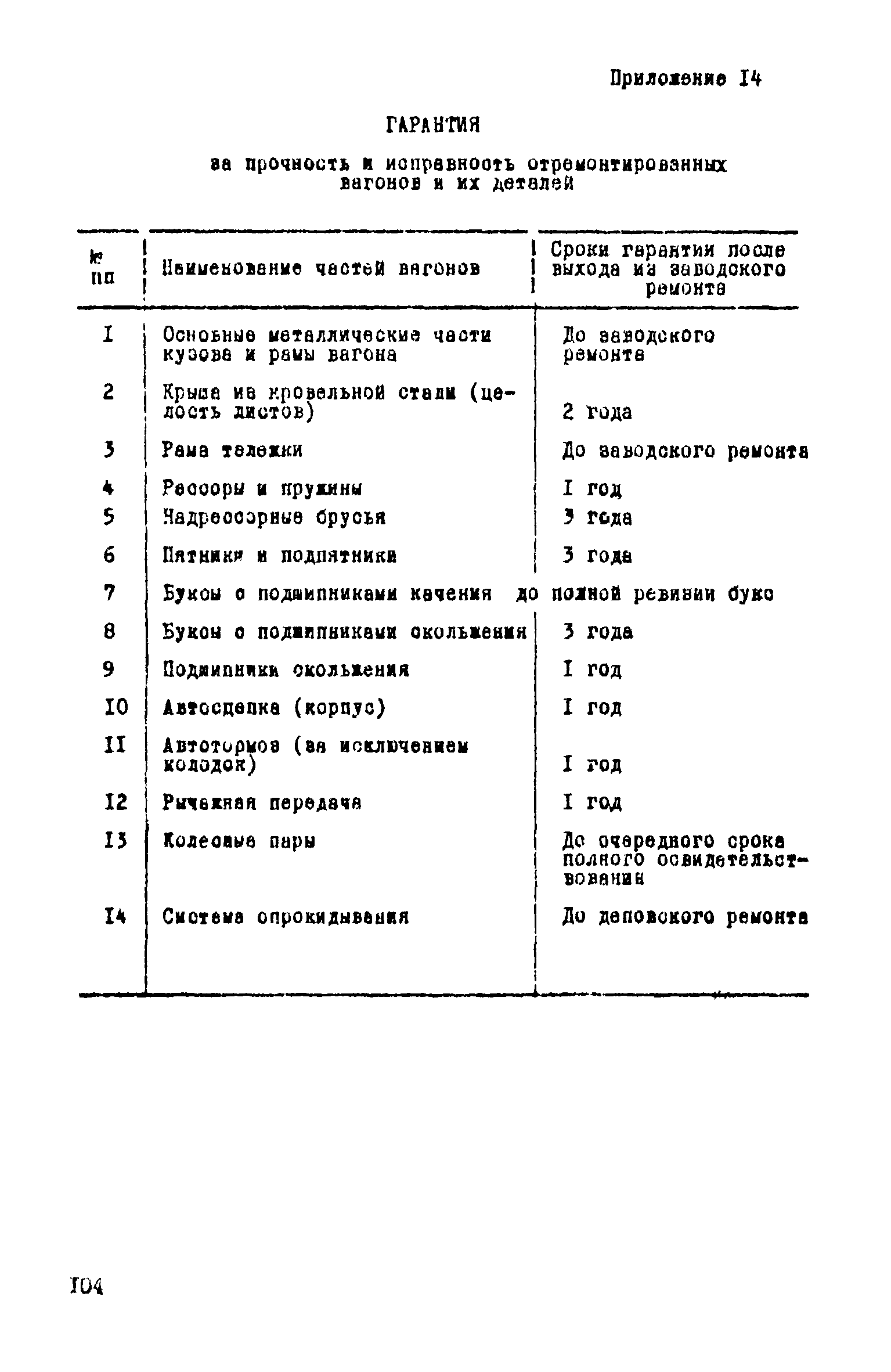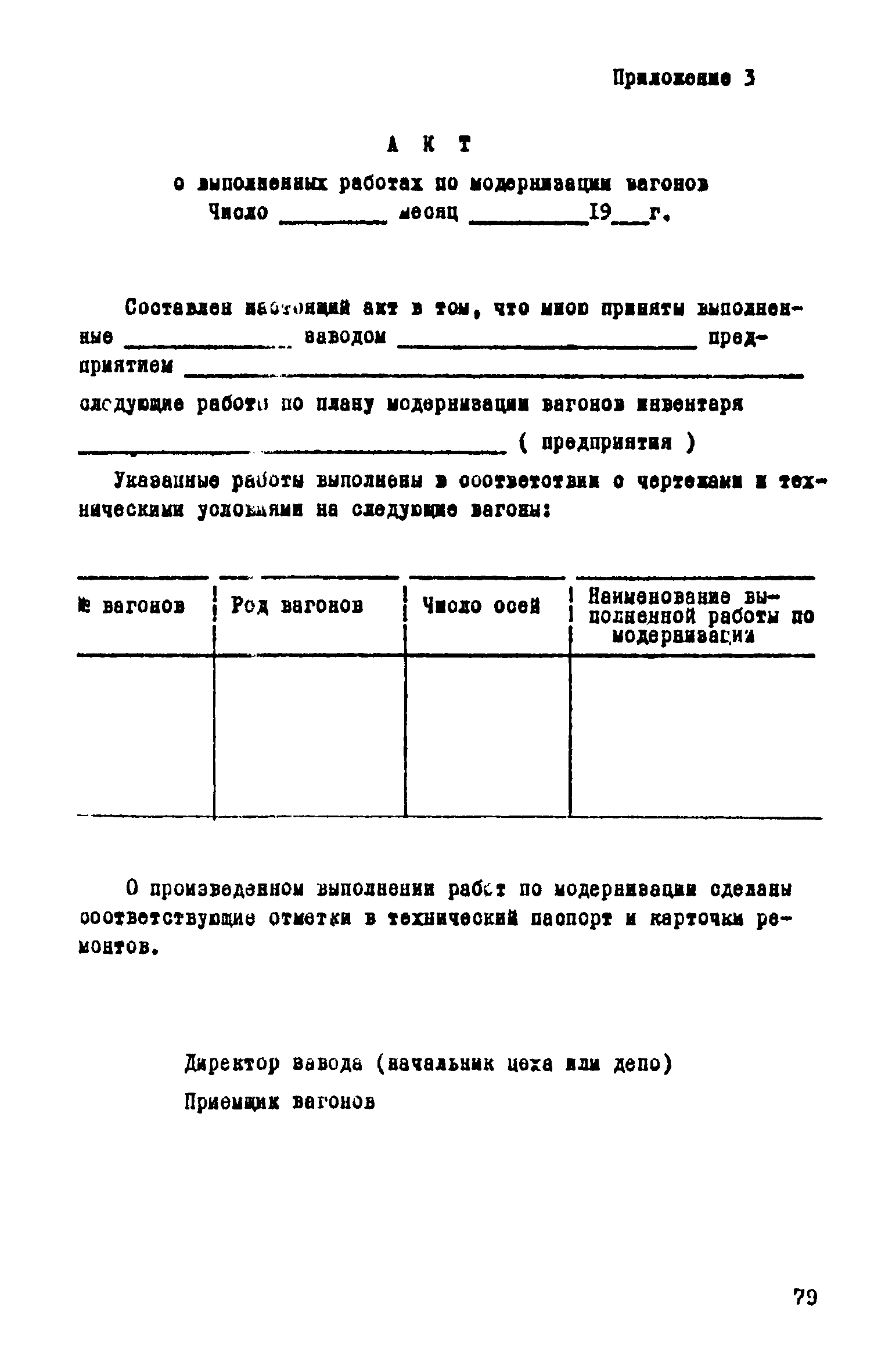 Правила заводского, деповского, профилактического и текущего ремонта вагонов промышленного транспорта колеи 1524 мм| Статус: | справочные материалы, мп, тпр | | Название рус.: | Правила заводского, деповского, профилактического и текущего ремонта вагонов промышленного транспорта колеи 1524 мм | | Дата добавления в базу: | 01.02.2020 | | Дата актуализации: | 01.01.2021 | | Область применения: | Правила ремонта вагонов являются обязательными для всех промышленных предприятий, имеющих и ремонтирующих вагоны серийной постройки (думпкары, хоппер-агломераторы, платформы для перевозки горячего чугуна, полувагоны для перевозки угля, скальных пород, руды и др. грузов), обращающиеся внутри предприятий без выхода на пути железных дорог Министерства путей сообщения. | | Оглавление: | Глава I. Общие положение по ремонту вагонов Глава II. Вагонный ремонт Глава III. Деповский ремонт Глава IV. Профилактический ремонт Глава V. Текущий ремонт вагонов Приложение 1 Перечень официальных изданий Министерства путей сообщения по ремонту и содержанию грузовых вагонов широкой колеи Приложение 2 Наряд-ведомость на ремонт вагонов Приложение 3 Акт о выполненных работах по модернизации вагонов Приложение 4 Допускаемые размеры при ремонте вагонов промышленного транспорта Приложение 5 Таблица наименьших допускаемых диаметров шеек осей колесных пар, подкатываемых под специальные вагоны Приложение 6 Нагрузки и расчетные прогибы для пружин тележек Приложение 7 Перечень вагонных деталей, подлежащих проверке магнитными дефектоскопами Приложение 8 Перечень вагонных деталей, подлежащих испытанию на растяжение Приложение 9 Перечень подъемных механизмов, приспособлений и механизированного инструмента для вагонных депо Приложение 10 Уведомление о приемке вагонов из ремонта Приложение 11 Журнал монтажа роликовых подшипников Приложение 12 Журнал демонтажа роликовых подшипников Приложение 13 Журнал промежуточной ревизии роликовых подшипников Приложение 14 Гарантия на прочность и исправность отремонтированных вагонов и их деталей Приложение 15 Натуральная книжка старшего осмотрщика вагонов на пункте технического осмотра Приложение 16 Уведомление на подачу неисправного вагона для ремонта на ремонтные пути Приложение 17 Справка о тормозах Приложение 18 Перечень подъемных механизмов, приспособлений и инструмента, применяемого при ремонте вагонов (для пунктов технического осмотра вагонов) | | Разработан: | Промтрансниипроект