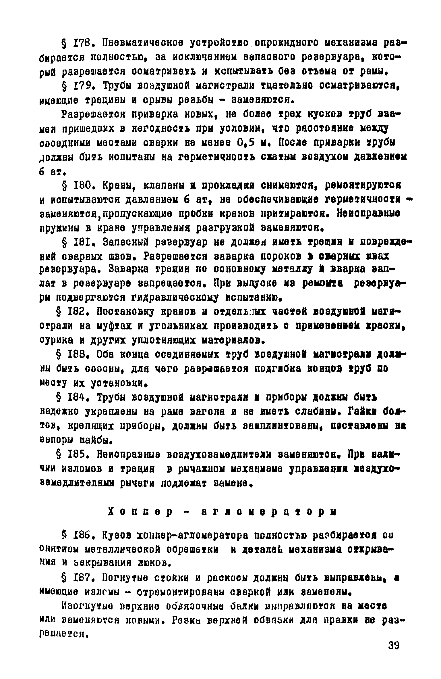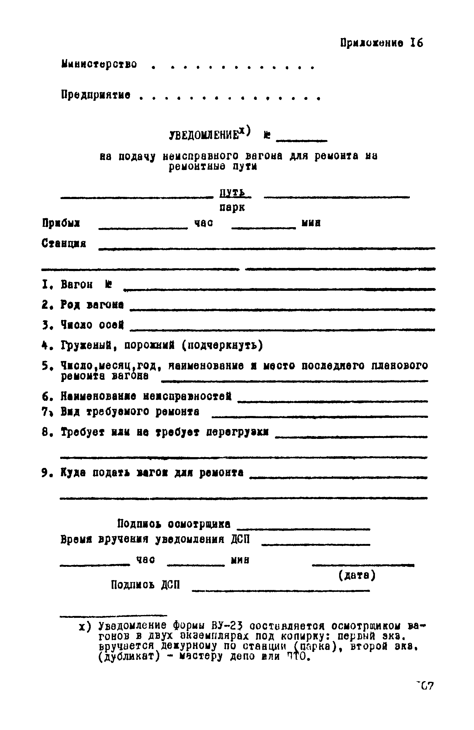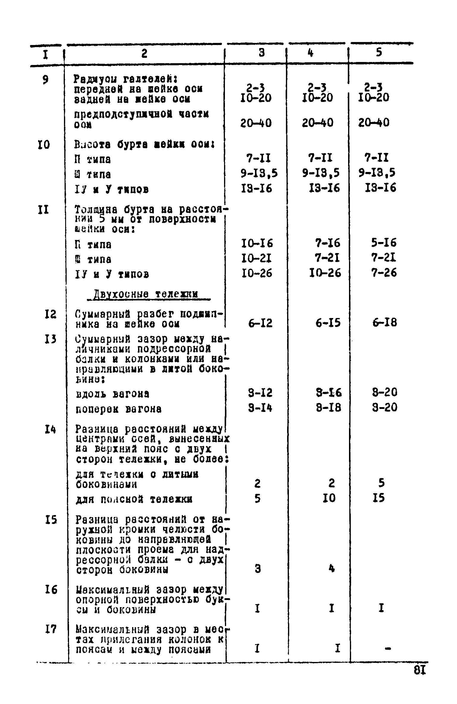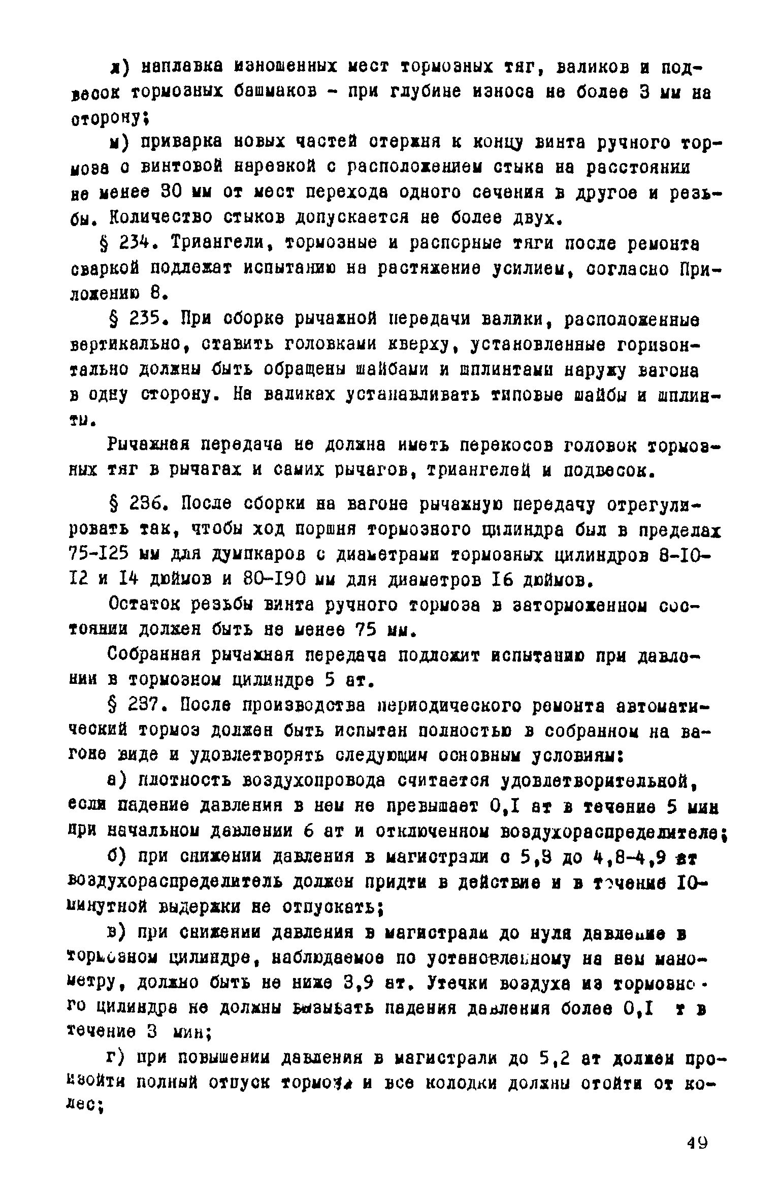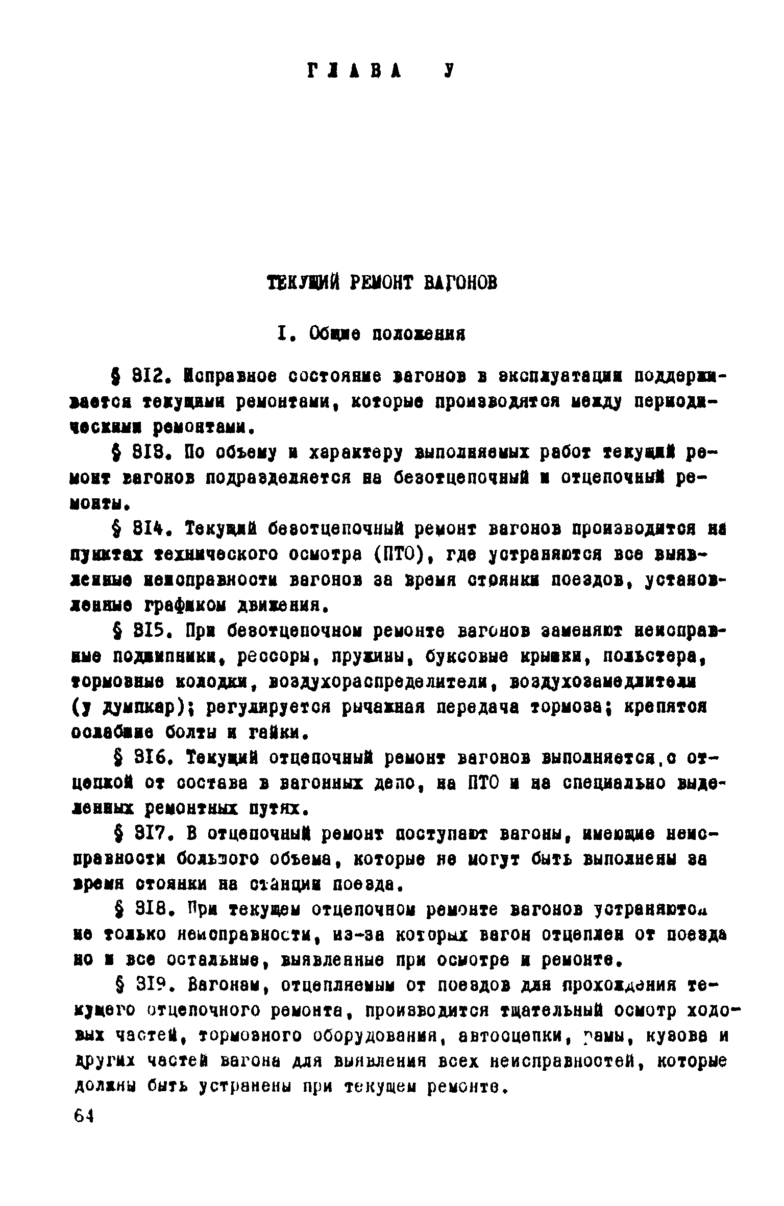 Правила заводского, деповского, профилактического и текущего ремонта вагонов промышленного транспорта колеи 1524 мм| Статус: | справочные материалы, мп, тпр | | Название рус.: | Правила заводского, деповского, профилактического и текущего ремонта вагонов промышленного транспорта колеи 1524 мм | | Дата добавления в базу: | 01.02.2020 | | Дата актуализации: | 01.01.2021 | | Область применения: | Правила ремонта вагонов являются обязательными для всех промышленных предприятий, имеющих и ремонтирующих вагоны серийной постройки (думпкары, хоппер-агломераторы, платформы для перевозки горячего чугуна, полувагоны для перевозки угля, скальных пород, руды и др. грузов), обращающиеся внутри предприятий без выхода на пути железных дорог Министерства путей сообщения. | | Оглавление: | Глава I. Общие положение по ремонту вагонов Глава II. Вагонный ремонт Глава III. Деповский ремонт Глава IV. Профилактический ремонт Глава V. Текущий ремонт вагонов Приложение 1 Перечень официальных изданий Министерства путей сообщения по ремонту и содержанию грузовых вагонов широкой колеи Приложение 2 Наряд-ведомость на ремонт вагонов Приложение 3 Акт о выполненных работах по модернизации вагонов Приложение 4 Допускаемые размеры при ремонте вагонов промышленного транспорта Приложение 5 Таблица наименьших допускаемых диаметров шеек осей колесных пар, подкатываемых под специальные вагоны Приложение 6 Нагрузки и расчетные прогибы для пружин тележек Приложение 7 Перечень вагонных деталей, подлежащих проверке магнитными дефектоскопами Приложение 8 Перечень вагонных деталей, подлежащих испытанию на растяжение Приложение 9 Перечень подъемных механизмов, приспособлений и механизированного инструмента для вагонных депо Приложение 10 Уведомление о приемке вагонов из ремонта Приложение 11 Журнал монтажа роликовых подшипников Приложение 12 Журнал демонтажа роликовых подшипников Приложение 13 Журнал промежуточной ревизии роликовых подшипников Приложение 14 Гарантия на прочность и исправность отремонтированных вагонов и их деталей Приложение 15 Натуральная книжка старшего осмотрщика вагонов на пункте технического осмотра Приложение 16 Уведомление на подачу неисправного вагона для ремонта на ремонтные пути Приложение 17 Справка о тормозах Приложение 18 Перечень подъемных механизмов, приспособлений и инструмента, применяемого при ремонте вагонов (для пунктов технического осмотра вагонов) | | Разработан: | Промтрансниипроект