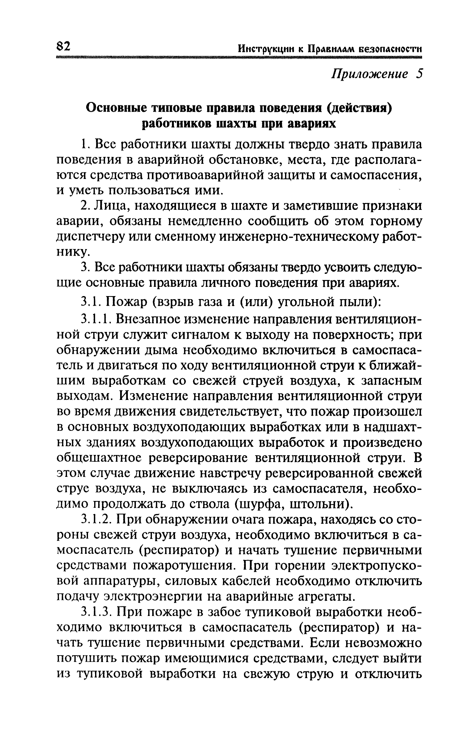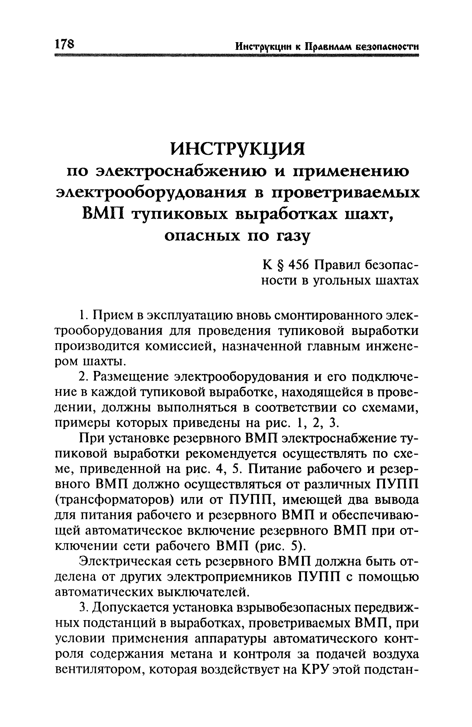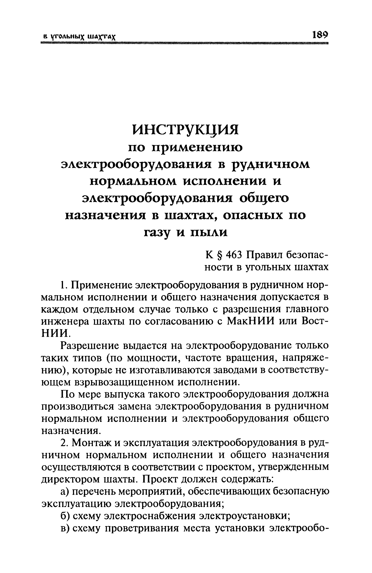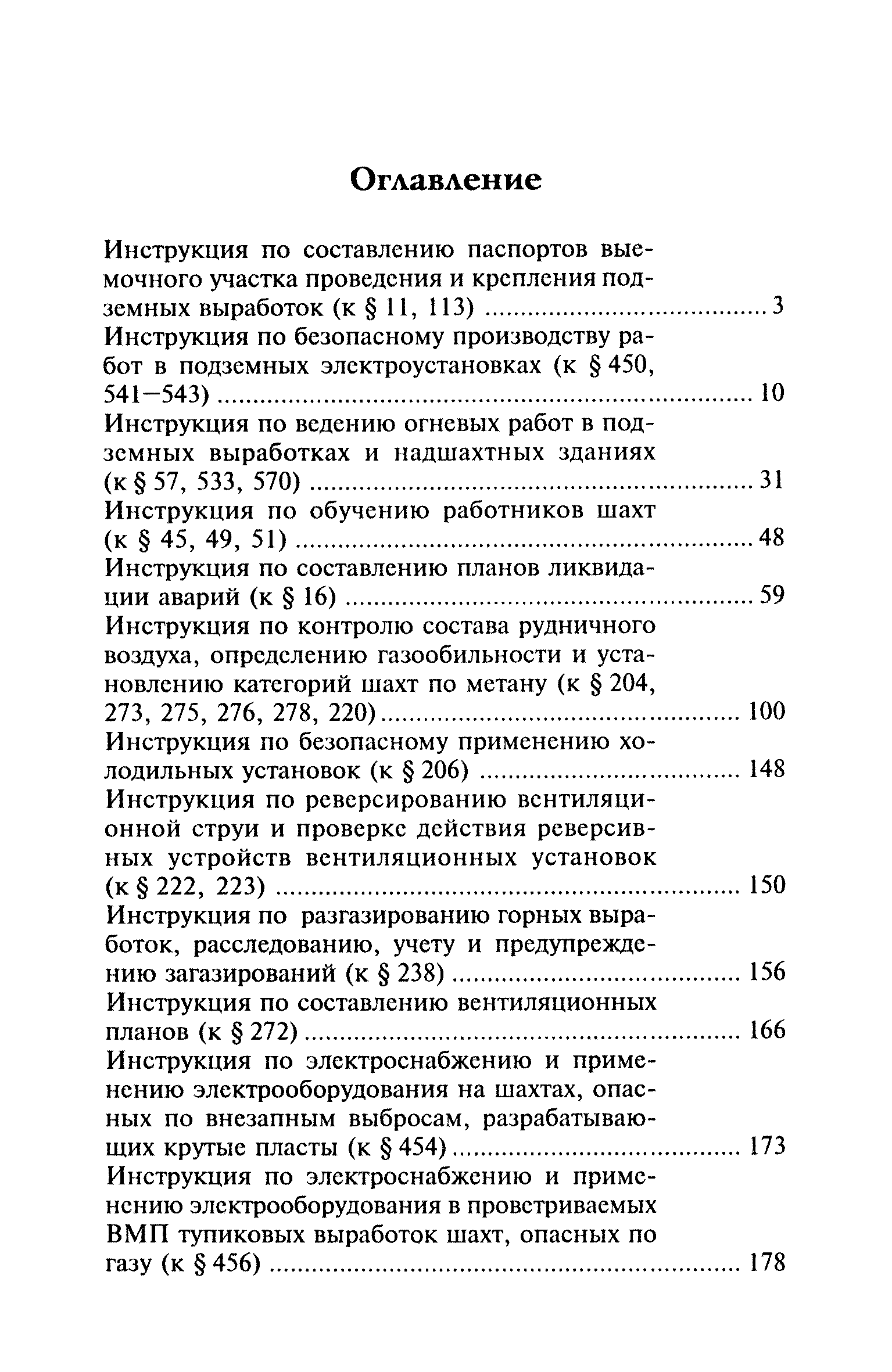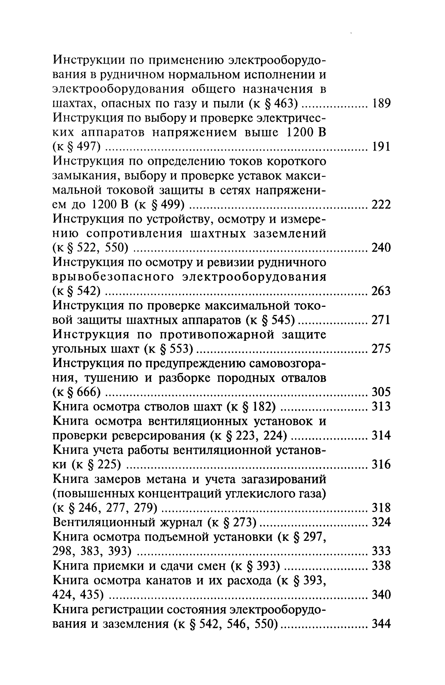Правила безопасности в угольных шахтах (Инструкции). Книга 2| Статус: | справочные материалы, мп, тпр | | Название рус.: | Правила безопасности в угольных шахтах (Инструкции). Книга 2 | | Дата добавления в базу: | 01.02.2020 | | Дата актуализации: | 01.01.2021 | | Область применения: | В книгу 2 "Правил безопасности в угольных шахтах" включены Инструкции, определяющие вопросы безопасности при ведении горных работ, а также порядок выполнения ряда требований "Правил безопасности в угольных шахтах" (по составлению паспортов выемочных участков, проведению и креплению горных выработок; по ведению огневых работ в подземных выработках и надшахтных зданиях; по обеспечению безопасности при эксплуатации электромеханического оборудования, соблюдению пылегазового режима; противопожарной защите и др.). Приведены формы книг и журналов, ведение которых предусмотрено "Правилами безопасности в угольных шахтах". Все инструкции являются неотъемлемой частью "Правил безопасности в угольных шахтах» и на них полностью распространяются положения, изложенные в главе IХ "Правил безопасности в угольных шахтах" - "Ответственность за нарушение правил безопасности". | | Оглавление: | Инструкция по составлению паспортов выемочного участка проведения и крепления подземных выработок (к § 11, 113) Инструкция по безопасному производству работ в подземных электроустановках (к § 450, 541 - 543) Инструкция по ведению огневых работ в подземных выработках и надшахтных зданиях (к § 57, 533, 570) Инструкция по обучению работников шахт (к § 45, 49, 51) Инструкция по составлению планов ликвидации аварий (к § 16) Инструкция по контролю состава рудничного воздуха, определению газообильности и установлению категорий шахт по метану (к § 204, 273, 275, 276, 278, 220) Инструкция по безопасному применению холодильных установок (к § 206) Инструкция по реверсированию вснтиляционной струи и проверке действия реверсивных устройств вентиляционных установок (к § 222, 223) Инструкция по разгазированию горных выработок, расследованию, учету и предупреждению загазирований (к § 238) Инструкция по составлению вентиляционных планов (к § 272) Инструкция по электроснабжению и применению электрооборудования на шахтах, опасных по внезапным выбросам, разрабатывающих крутые пласты (к § 454) Инструкция по электроснабжению и применению электрооборудования в проветриваемых ВМП тупиковых выработок шахт, опасных по газу(к § 456) Инструкции по применению электрооборудования в рудничном нормальном исполнении и электрооборудования общего назначения в шахтах, опасных по газу и пыли (к § 463) Инструкция по выбору и проверке электрических аппаратов напряжением выше 1200 В (к § 497) Инструкция по определению токов короткого замыкания, выбору и проверке уставок максимальной токовой защиты в сетях напряжением до 1200 В (к § 499) Инструкция по устройству, осмотру и измерению сопротивления шахтных заземлений (к § 522, 550) Инструкция по осмотру и ревизии рудничного взрывобезопасного электрооборудования (к § 542) Инструкция по проверке максимальной токовой защиты шахтных аппаратов (к § 545) Инструкция по противопожарной защите угольных шахт (к § 553) Инструкция по предупреждению самовозгорания, тушению и разборке породных отвалов (к § 666) Книга осмотра стволов шахт (к § 182) Книга осмотра вентиляционных установок и проверки реверсирования (к § 223, 224) Книга учета работы вентиляцион