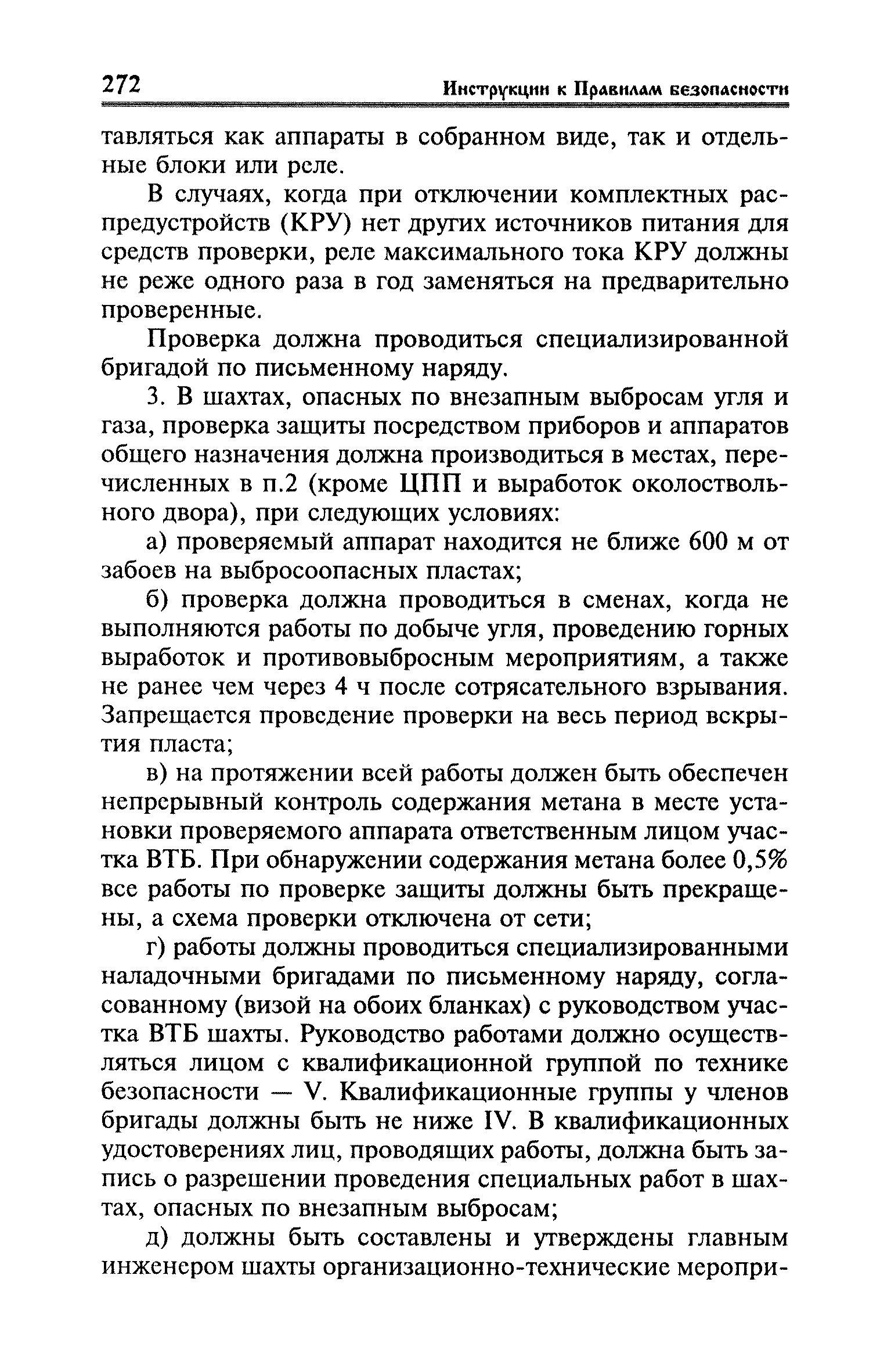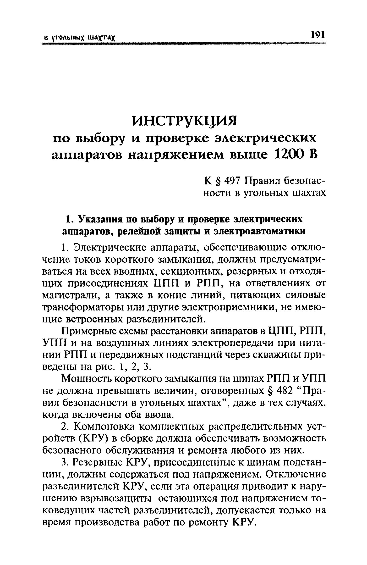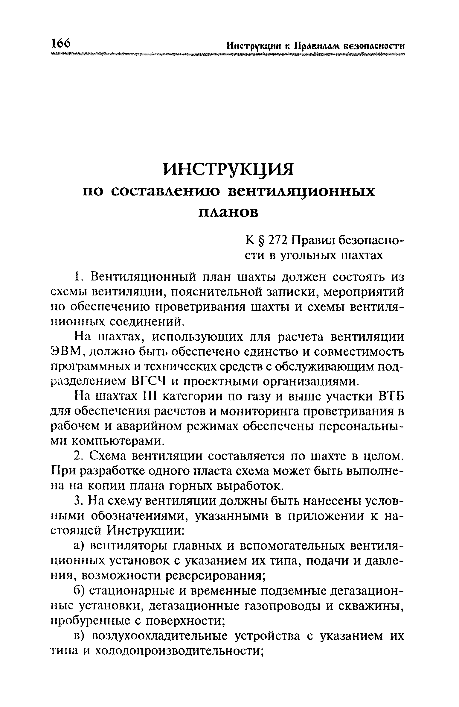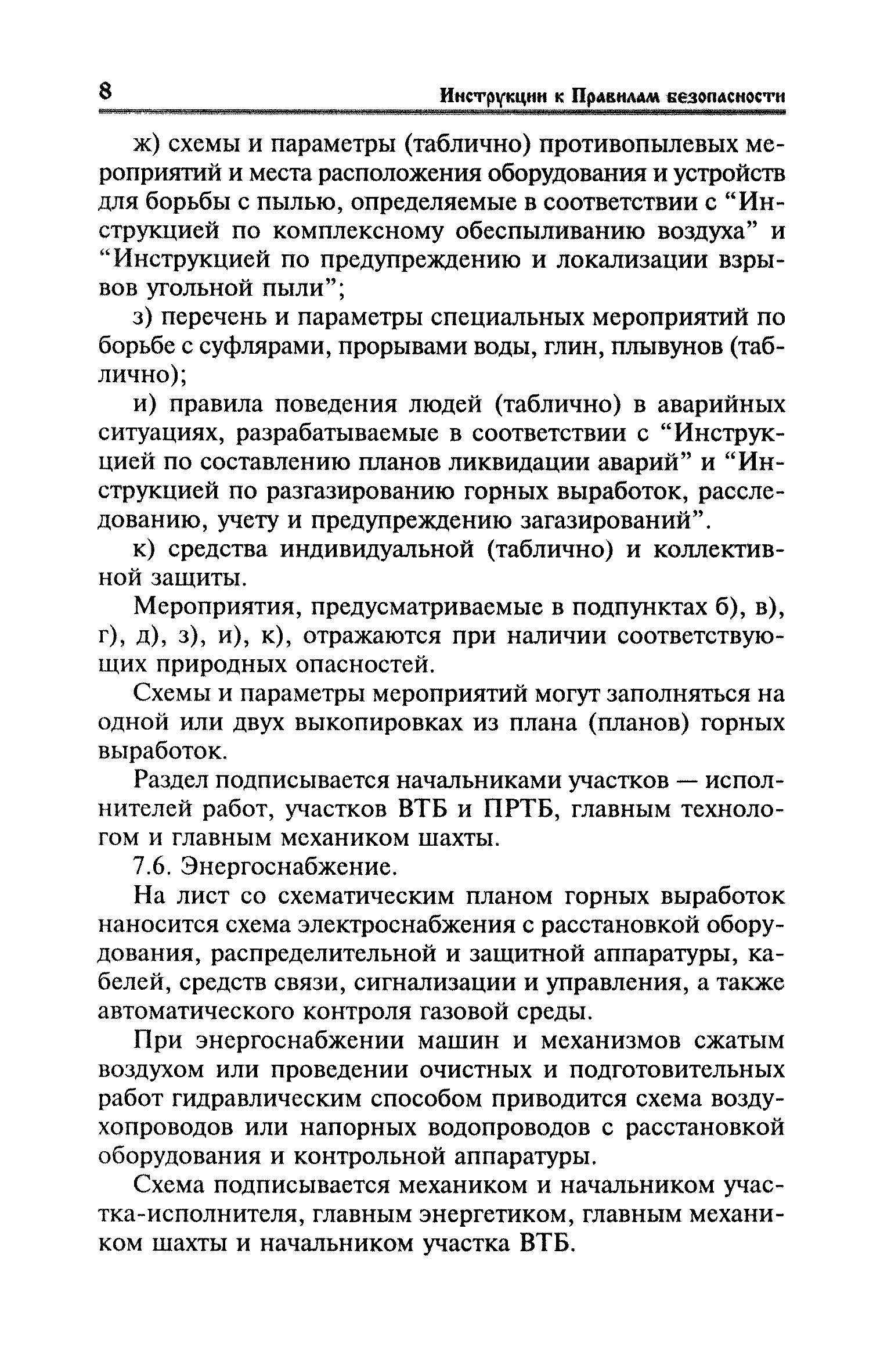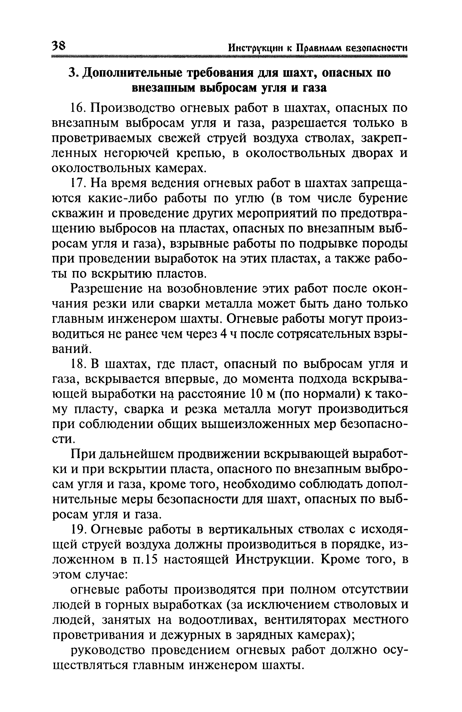 Правила безопасности в угольных шахтах (Инструкции). Книга 2| Статус: | справочные материалы, мп, тпр | | Название рус.: | Правила безопасности в угольных шахтах (Инструкции). Книга 2 | | Дата добавления в базу: | 01.02.2020 | | Дата актуализации: | 01.01.2021 | | Область применения: | В книгу 2 "Правил безопасности в угольных шахтах" включены Инструкции, определяющие вопросы безопасности при ведении горных работ, а также порядок выполнения ряда требований "Правил безопасности в угольных шахтах" (по составлению паспортов выемочных участков, проведению и креплению горных выработок; по ведению огневых работ в подземных выработках и надшахтных зданиях; по обеспечению безопасности при эксплуатации электромеханического оборудования, соблюдению пылегазового режима; противопожарной защите и др.). Приведены формы книг и журналов, ведение которых предусмотрено "Правилами безопасности в угольных шахтах". Все инструкции являются неотъемлемой частью "Правил безопасности в угольных шахтах» и на них полностью распространяются положения, изложенные в главе IХ "Правил безопасности в угольных шахтах" - "Ответственность за нарушение правил безопасности". | | Оглавление: | Инструкция по составлению паспортов выемочного участка проведения и крепления подземных выработок (к § 11, 113) Инструкция по безопасному производству работ в подземных электроустановках (к § 450, 541 - 543) Инструкция по ведению огневых работ в подземных выработках и надшахтных зданиях (к § 57, 533, 570) Инструкция по обучению работников шахт (к § 45, 49, 51) Инструкция по составлению планов ликвидации аварий (к § 16) Инструкция по контролю состава рудничного воздуха, определению газообильности и установлению категорий шахт по метану (к § 204, 273, 275, 276, 278, 220) Инструкция по безопасному применению холодильных установок (к § 206) Инструкция по реверсированию вснтиляционной струи и проверке действия реверсивных устройств вентиляционных установок (к § 222, 223) Инструкция по разгазированию горных выработок, расследованию, учету и предупреждению загазирований (к § 238) Инструкция по составлению вентиляционных планов (к § 272) Инструкция по электроснабжению и применению электрооборудования на шахтах, опасных по внезапным выбросам, разрабатывающих крутые пласты (к § 454) Инструкция по электроснабжению и применению электрооборудования в проветриваемых ВМП тупиковых выработок шахт, опасных по газу(к § 456) Инструкции по применению электрооборудования в рудничном нормальном исполнении и электрооборудования общего назначения в шахтах, опасных по газу и пыли (к § 463) Инструкция по выбору и проверке электрических аппаратов напряжением выше 1200 В (к § 497) Инструкция по определению токов короткого замыкания, выбору и проверке уставок максимальной токовой защиты в сетях напряжением до 1200 В (к § 499) Инструкция по устройству, осмотру и измерению сопротивления шахтных заземлений (к § 522, 550) Инструкция по осмотру и ревизии рудничного взрывобезопасного электрооборудования (к § 542) Инструкция по проверке максимальной токовой защиты шахтных аппаратов (к § 545) Инструкция по противопожарной защите угольных шахт (к § 553) Инструкция по предупреждению самовозгорания, тушению и разборке породных отвалов (к § 666) Книга осмотра стволов шахт (к § 182) Книга осмотра вентиляционных установок и проверки реверсирования (к § 223, 224) Книга учета работы вентиляцион