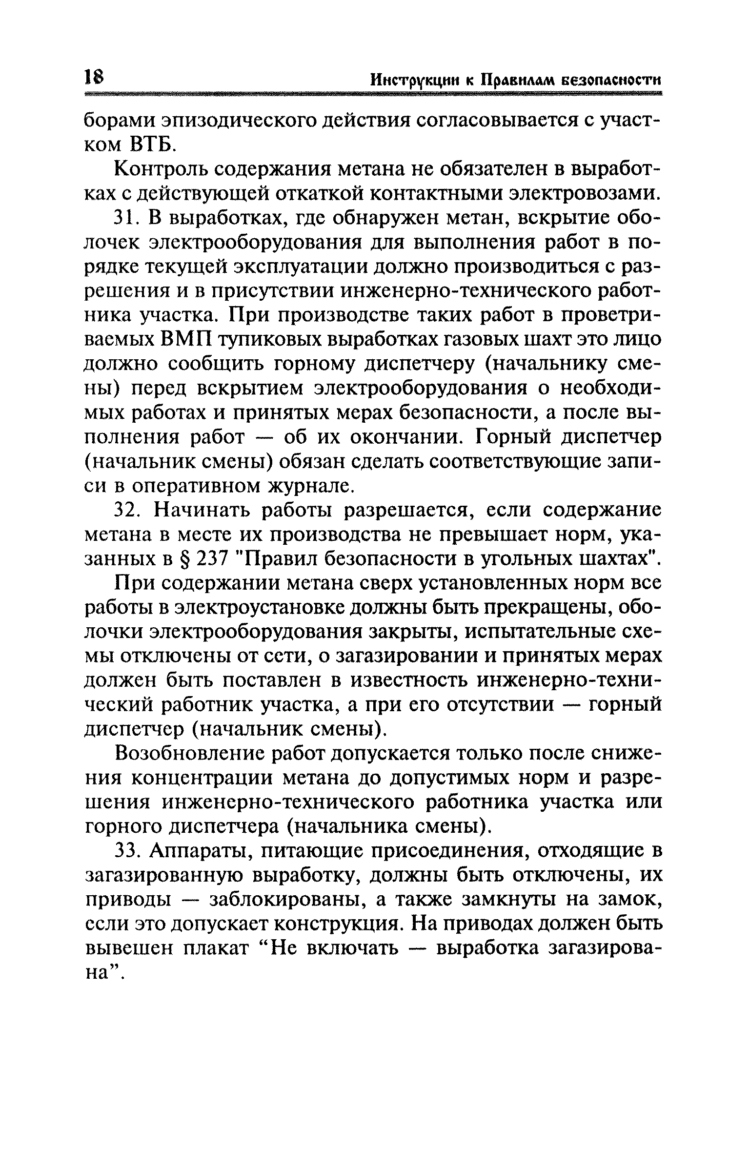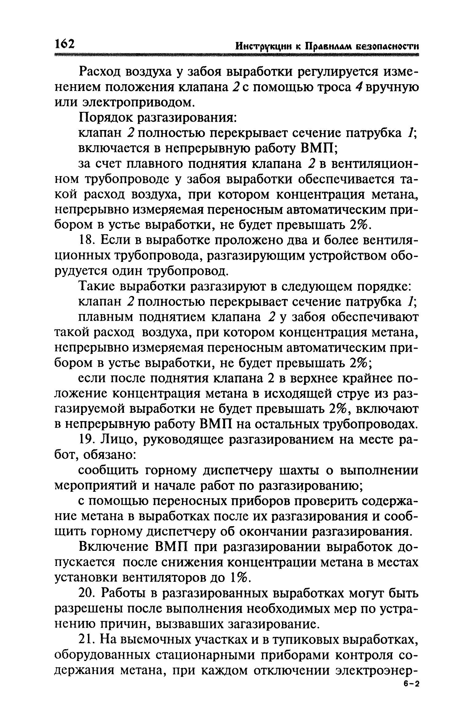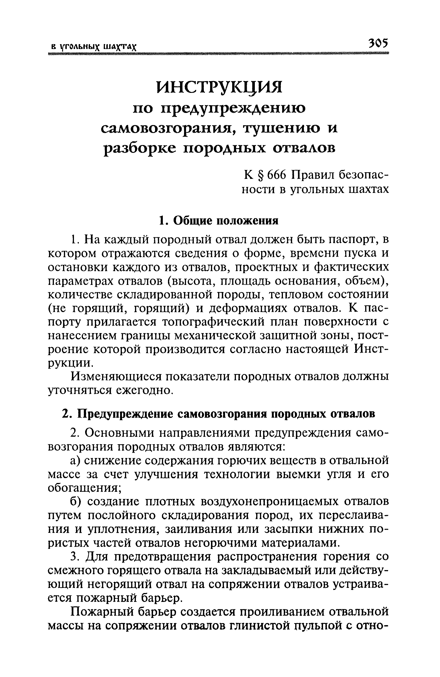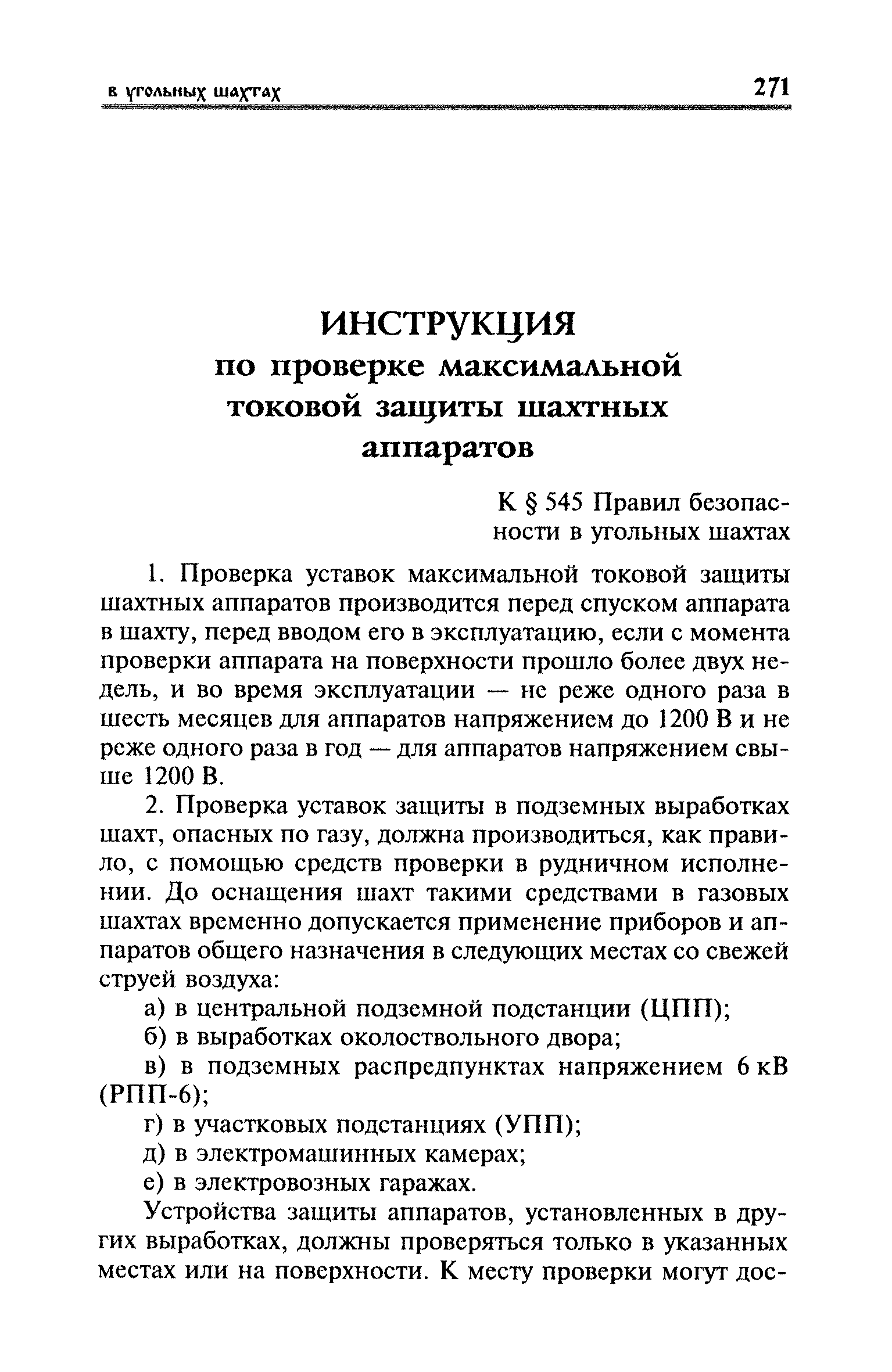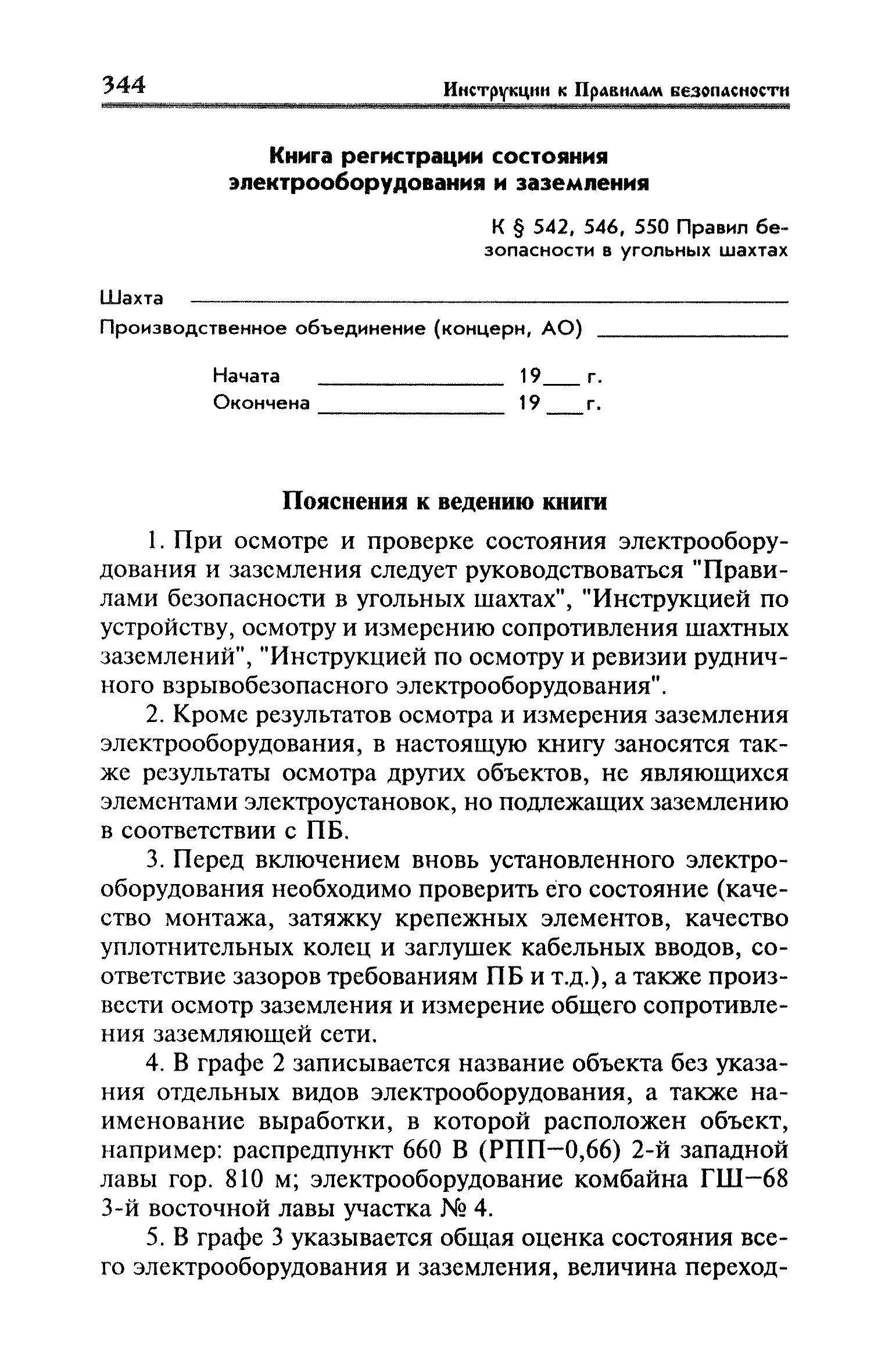 Правила безопасности в угольных шахтах (Инструкции). Книга 2| Статус: | справочные материалы, мп, тпр | | Название рус.: | Правила безопасности в угольных шахтах (Инструкции). Книга 2 | | Дата добавления в базу: | 01.02.2020 | | Дата актуализации: | 01.01.2021 | | Область применения: | В книгу 2 "Правил безопасности в угольных шахтах" включены Инструкции, определяющие вопросы безопасности при ведении горных работ, а также порядок выполнения ряда требований "Правил безопасности в угольных шахтах" (по составлению паспортов выемочных участков, проведению и креплению горных выработок; по ведению огневых работ в подземных выработках и надшахтных зданиях; по обеспечению безопасности при эксплуатации электромеханического оборудования, соблюдению пылегазового режима; противопожарной защите и др.). Приведены формы книг и журналов, ведение которых предусмотрено "Правилами безопасности в угольных шахтах". Все инструкции являются неотъемлемой частью "Правил безопасности в угольных шахтах» и на них полностью распространяются положения, изложенные в главе IХ "Правил безопасности в угольных шахтах" - "Ответственность за нарушение правил безопасности". | | Оглавление: | Инструкция по составлению паспортов выемочного участка проведения и крепления подземных выработок (к § 11, 113) Инструкция по безопасному производству работ в подземных электроустановках (к § 450, 541 - 543) Инструкция по ведению огневых работ в подземных выработках и надшахтных зданиях (к § 57, 533, 570) Инструкция по обучению работников шахт (к § 45, 49, 51) Инструкция по составлению планов ликвидации аварий (к § 16) Инструкция по контролю состава рудничного воздуха, определению газообильности и установлению категорий шахт по метану (к § 204, 273, 275, 276, 278, 220) Инструкция по безопасному применению холодильных установок (к § 206) Инструкция по реверсированию вснтиляционной струи и проверке действия реверсивных устройств вентиляционных установок (к § 222, 223) Инструкция по разгазированию горных выработок, расследованию, учету и предупреждению загазирований (к § 238) Инструкция по составлению вентиляционных планов (к § 272) Инструкция по электроснабжению и применению электрооборудования на шахтах, опасных по внезапным выбросам, разрабатывающих крутые пласты (к § 454) Инструкция по электроснабжению и применению электрооборудования в проветриваемых ВМП тупиковых выработок шахт, опасных по газу(к § 456) Инструкции по применению электрооборудования в рудничном нормальном исполнении и электрооборудования общего назначения в шахтах, опасных по газу и пыли (к § 463) Инструкция по выбору и проверке электрических аппаратов напряжением выше 1200 В (к § 497) Инструкция по определению токов короткого замыкания, выбору и проверке уставок максимальной токовой защиты в сетях напряжением до 1200 В (к § 499) Инструкция по устройству, осмотру и измерению сопротивления шахтных заземлений (к § 522, 550) Инструкция по осмотру и ревизии рудничного взрывобезопасного электрооборудования (к § 542) Инструкция по проверке максимальной токовой защиты шахтных аппаратов (к § 545) Инструкция по противопожарной защите угольных шахт (к § 553) Инструкция по предупреждению самовозгорания, тушению и разборке породных отвалов (к § 666) Книга осмотра стволов шахт (к § 182) Книга осмотра вентиляционных установок и проверки реверсирования (к § 223, 224) Книга учета работы вентиляцион