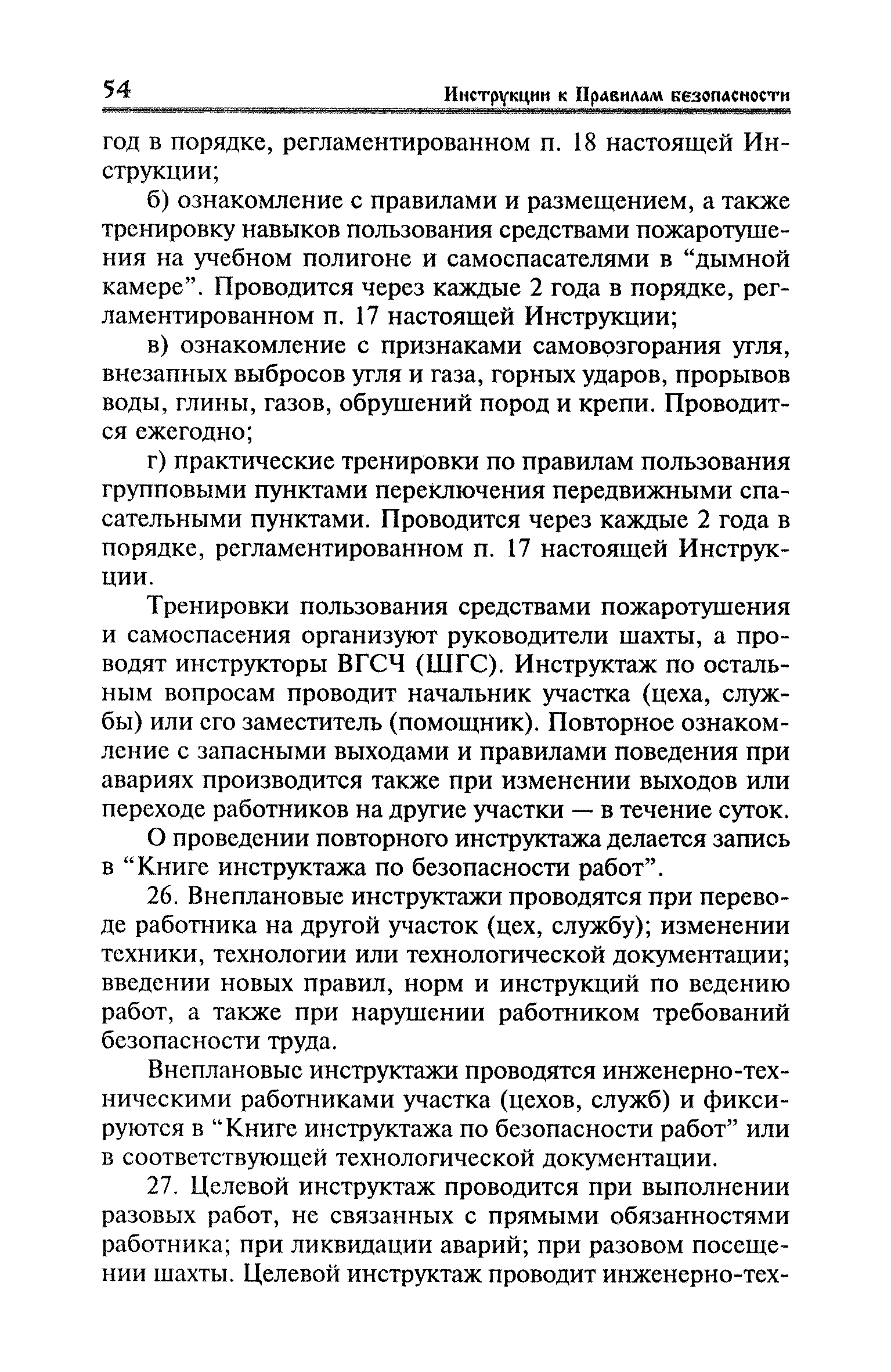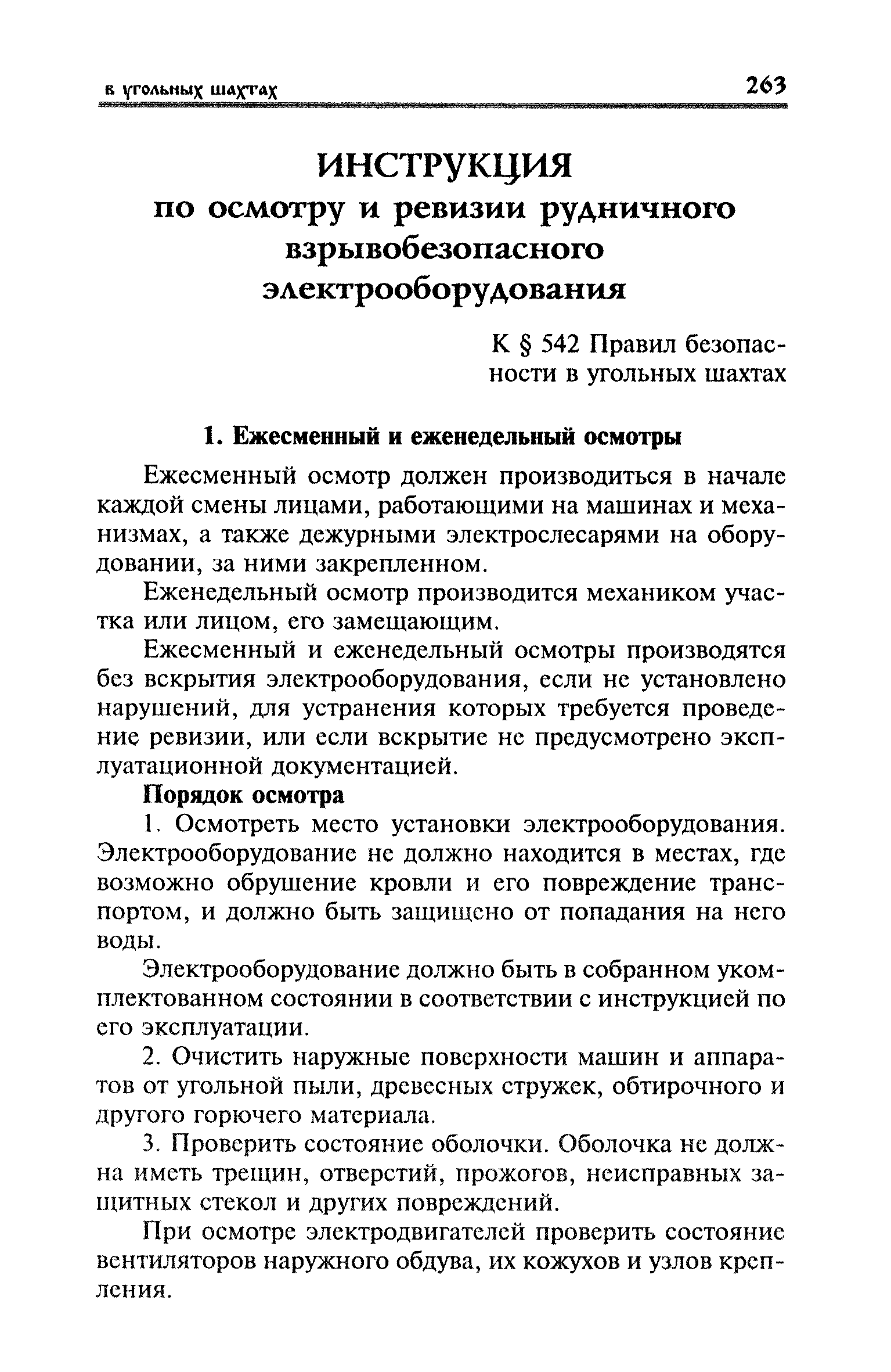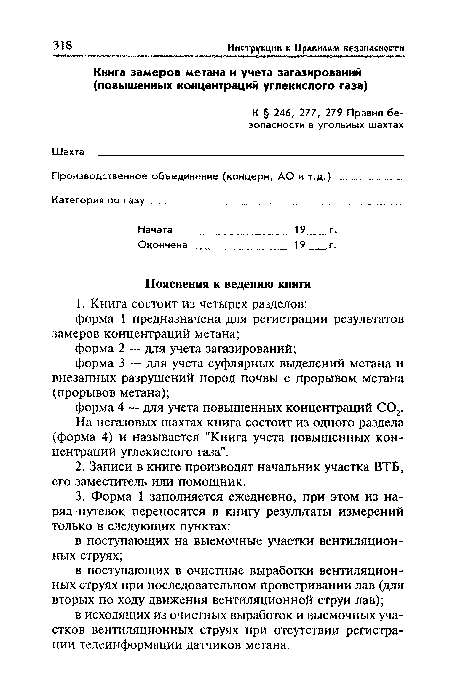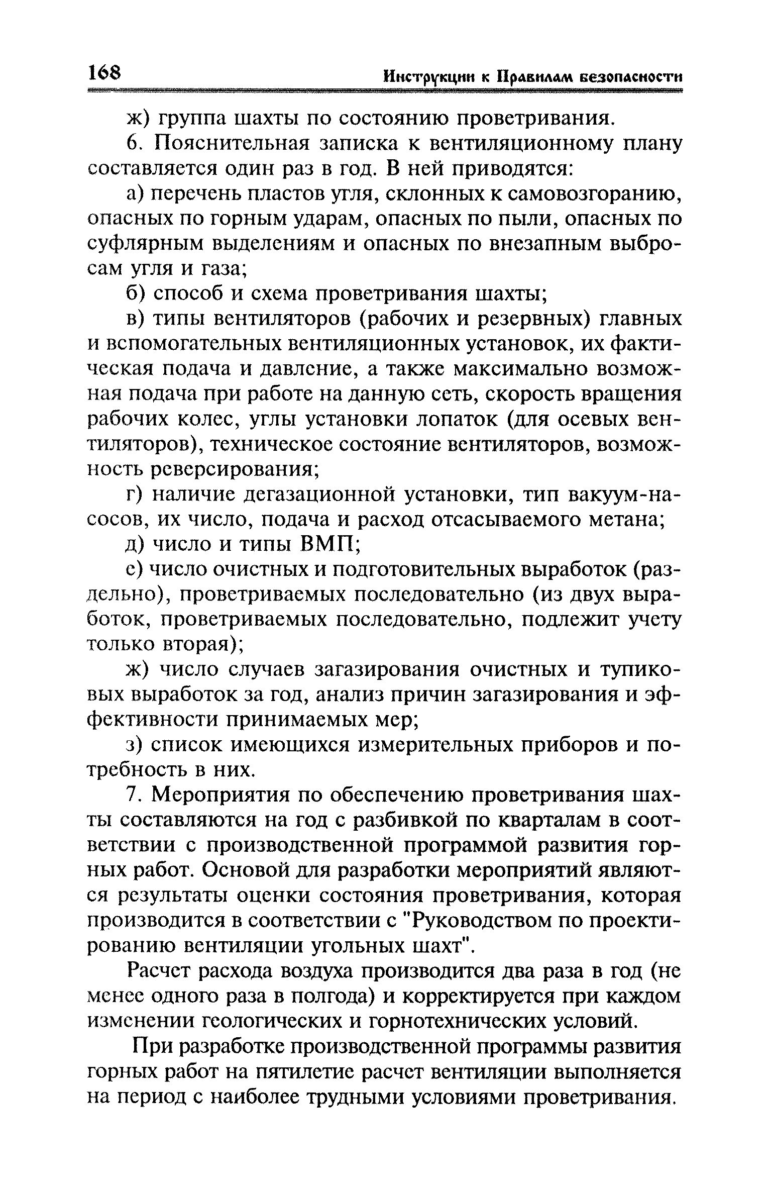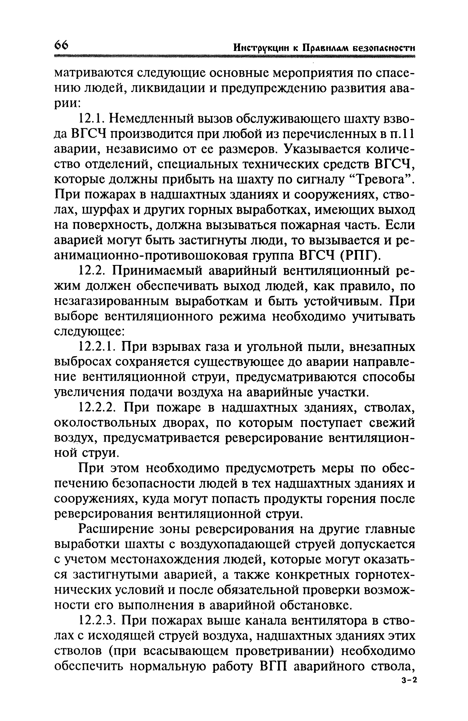 Правила безопасности в угольных шахтах (Инструкции). Книга 2| Статус: | справочные материалы, мп, тпр | | Название рус.: | Правила безопасности в угольных шахтах (Инструкции). Книга 2 | | Дата добавления в базу: | 01.02.2020 | | Дата актуализации: | 01.01.2021 | | Область применения: | В книгу 2 "Правил безопасности в угольных шахтах" включены Инструкции, определяющие вопросы безопасности при ведении горных работ, а также порядок выполнения ряда требований "Правил безопасности в угольных шахтах" (по составлению паспортов выемочных участков, проведению и креплению горных выработок; по ведению огневых работ в подземных выработках и надшахтных зданиях; по обеспечению безопасности при эксплуатации электромеханического оборудования, соблюдению пылегазового режима; противопожарной защите и др.). Приведены формы книг и журналов, ведение которых предусмотрено "Правилами безопасности в угольных шахтах". Все инструкции являются неотъемлемой частью "Правил безопасности в угольных шахтах» и на них полностью распространяются положения, изложенные в главе IХ "Правил безопасности в угольных шахтах" - "Ответственность за нарушение правил безопасности". | | Оглавление: | Инструкция по составлению паспортов выемочного участка проведения и крепления подземных выработок (к § 11, 113) Инструкция по безопасному производству работ в подземных электроустановках (к § 450, 541 - 543) Инструкция по ведению огневых работ в подземных выработках и надшахтных зданиях (к § 57, 533, 570) Инструкция по обучению работников шахт (к § 45, 49, 51) Инструкция по составлению планов ликвидации аварий (к § 16) Инструкция по контролю состава рудничного воздуха, определению газообильности и установлению категорий шахт по метану (к § 204, 273, 275, 276, 278, 220) Инструкция по безопасному применению холодильных установок (к § 206) Инструкция по реверсированию вснтиляционной струи и проверке действия реверсивных устройств вентиляционных установок (к § 222, 223) Инструкция по разгазированию горных выработок, расследованию, учету и предупреждению загазирований (к § 238) Инструкция по составлению вентиляционных планов (к § 272) Инструкция по электроснабжению и применению электрооборудования на шахтах, опасных по внезапным выбросам, разрабатывающих крутые пласты (к § 454) Инструкция по электроснабжению и применению электрооборудования в проветриваемых ВМП тупиковых выработок шахт, опасных по газу(к § 456) Инструкции по применению электрооборудования в рудничном нормальном исполнении и электрооборудования общего назначения в шахтах, опасных по газу и пыли (к § 463) Инструкция по выбору и проверке электрических аппаратов напряжением выше 1200 В (к § 497) Инструкция по определению токов короткого замыкания, выбору и проверке уставок максимальной токовой защиты в сетях напряжением до 1200 В (к § 499) Инструкция по устройству, осмотру и измерению сопротивления шахтных заземлений (к § 522, 550) Инструкция по осмотру и ревизии рудничного взрывобезопасного электрооборудования (к § 542) Инструкция по проверке максимальной токовой защиты шахтных аппаратов (к § 545) Инструкция по противопожарной защите угольных шахт (к § 553) Инструкция по предупреждению самовозгорания, тушению и разборке породных отвалов (к § 666) Книга осмотра стволов шахт (к § 182) Книга осмотра вентиляционных установок и проверки реверсирования (к § 223, 224) Книга учета работы вентиляцион