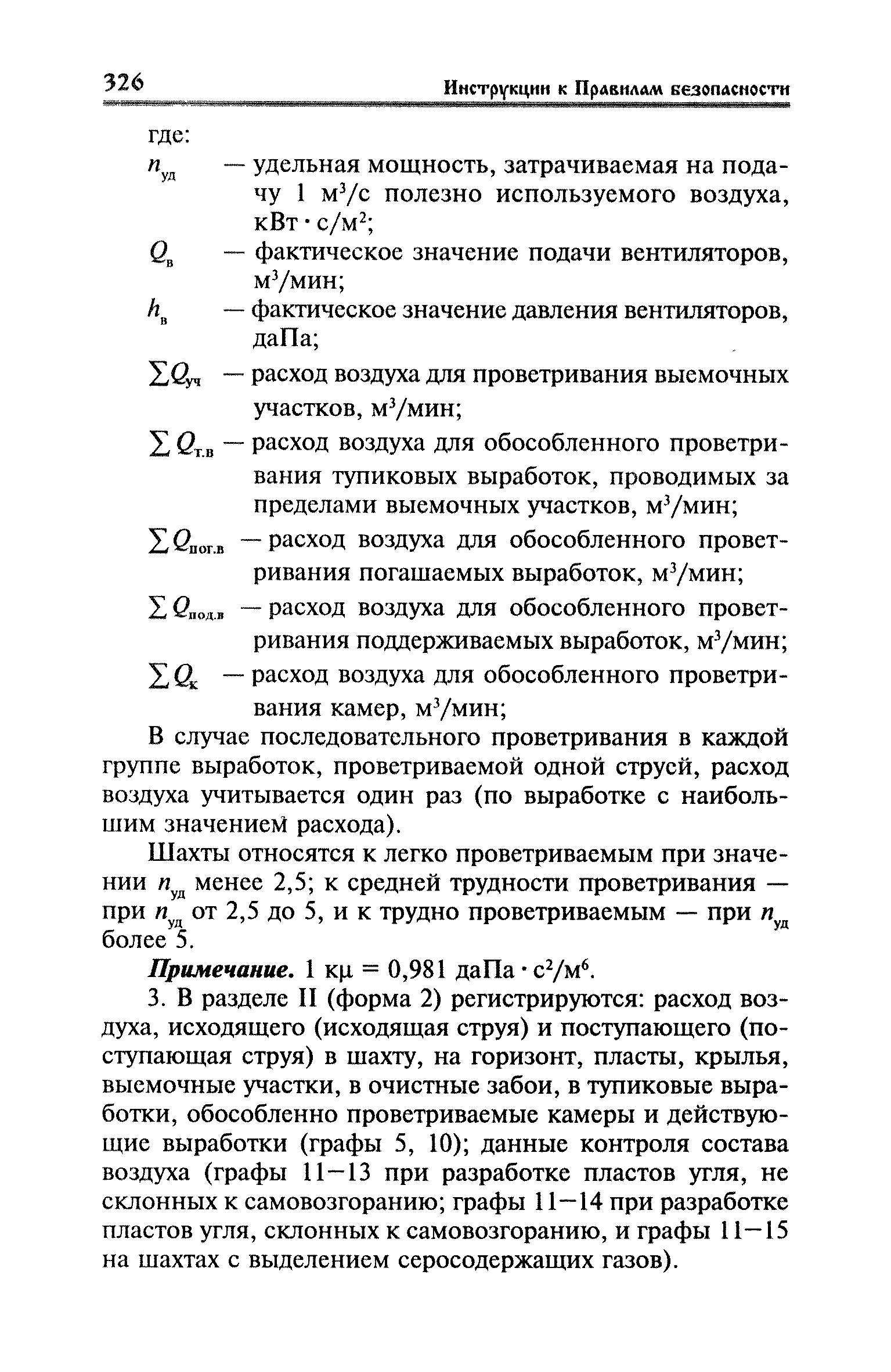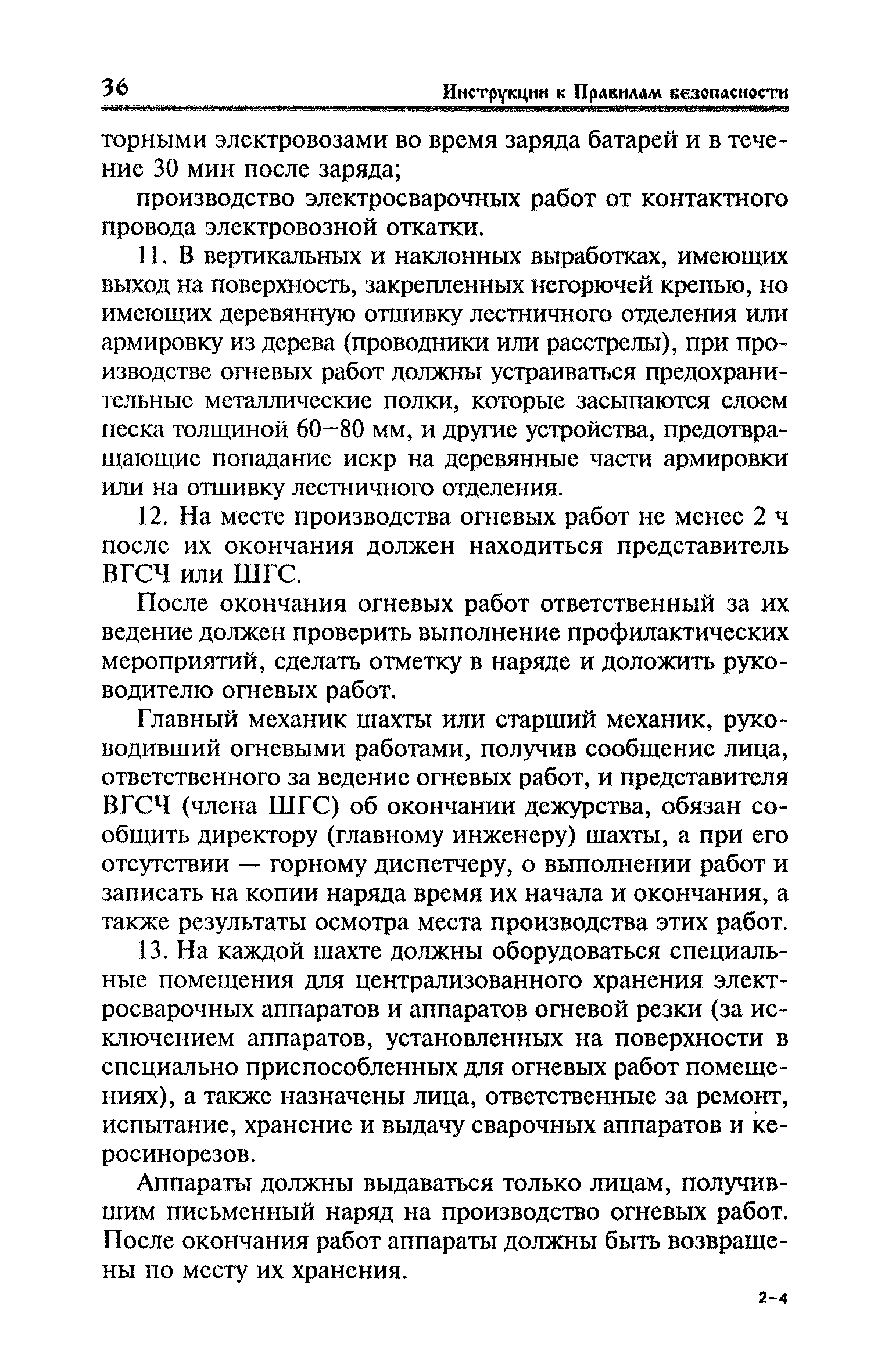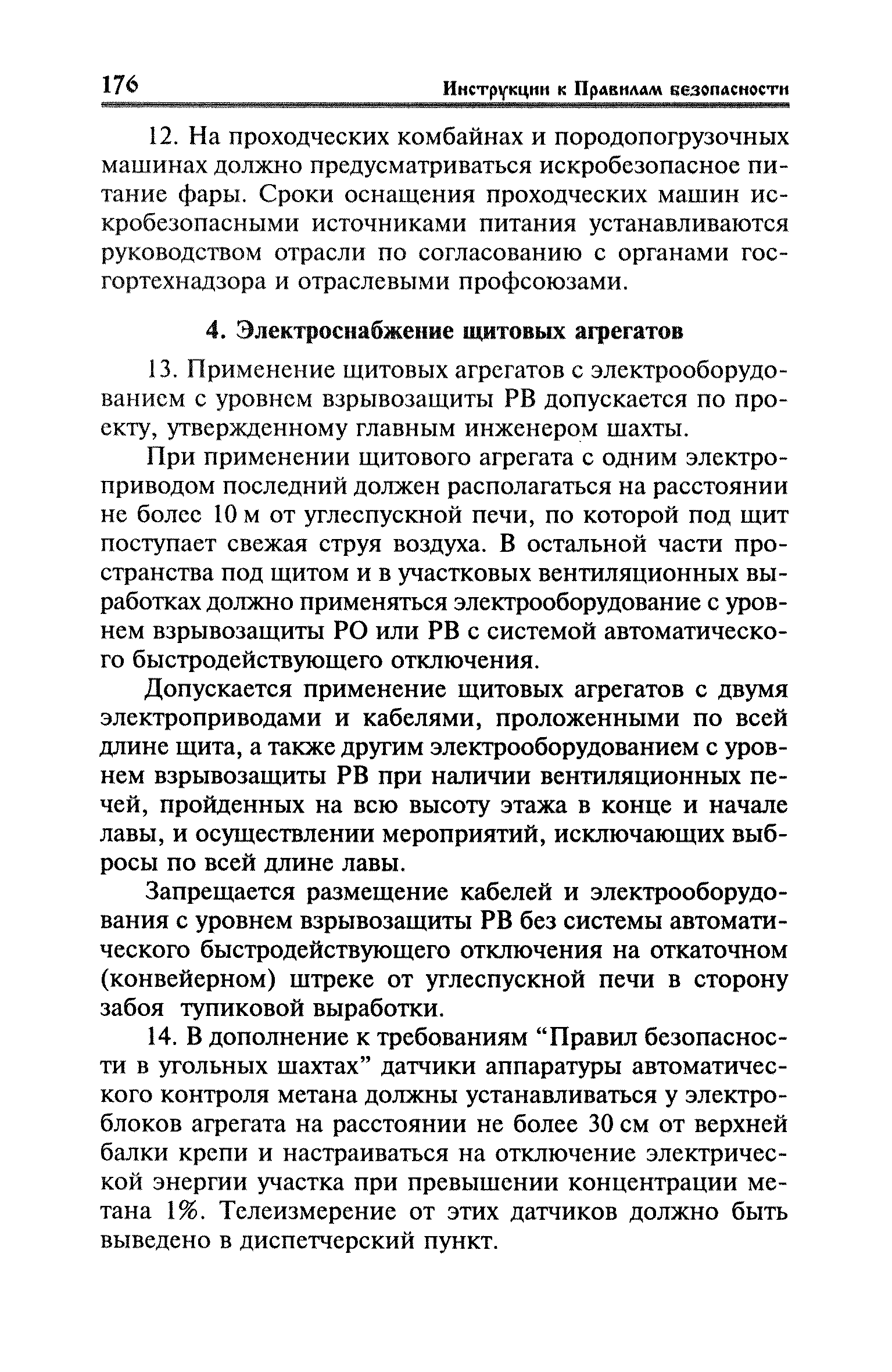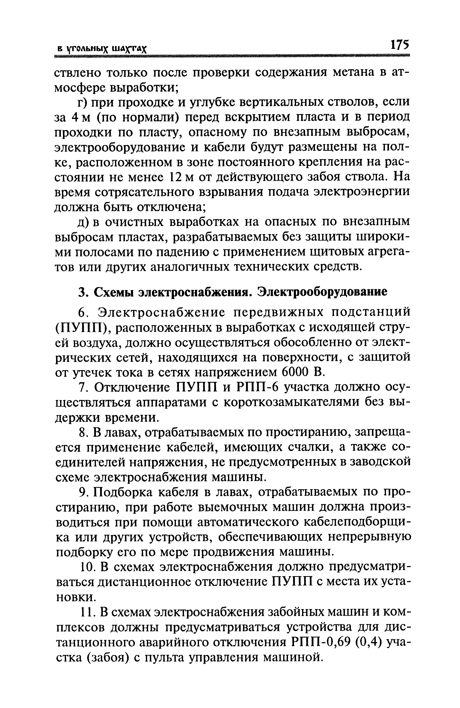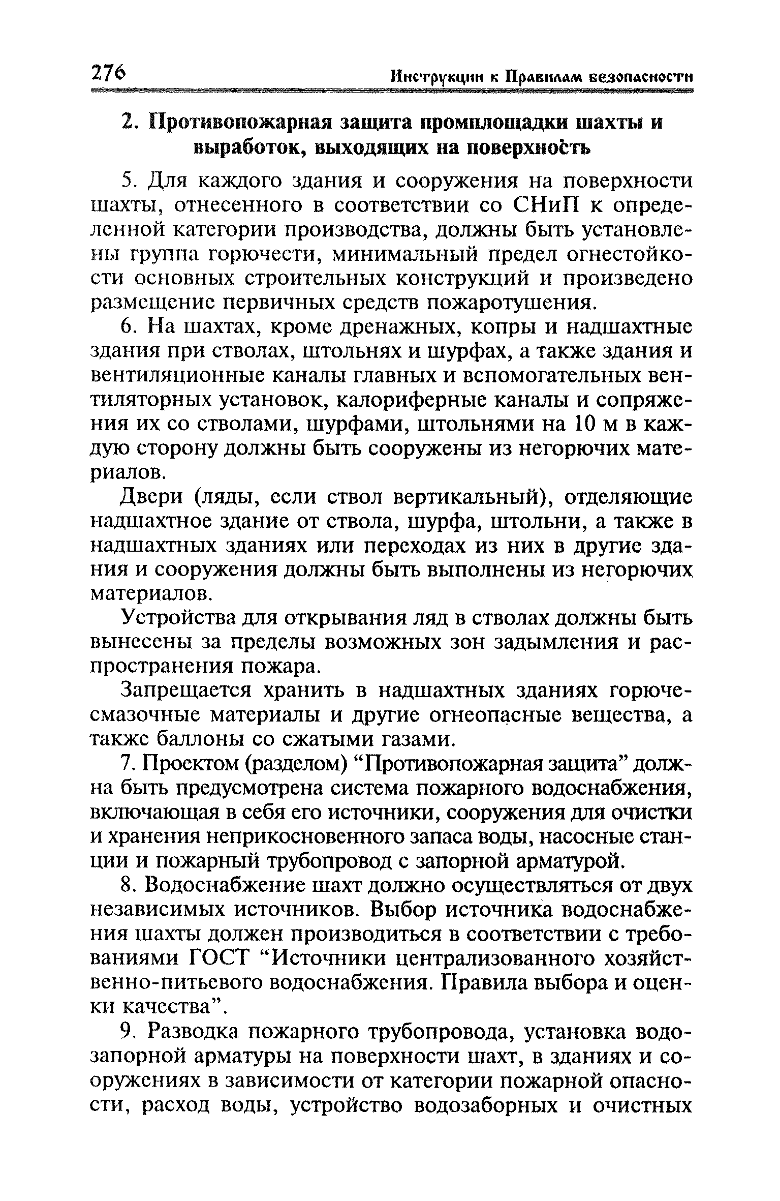 Правила безопасности в угольных шахтах (Инструкции). Книга 2| Статус: | справочные материалы, мп, тпр | | Название рус.: | Правила безопасности в угольных шахтах (Инструкции). Книга 2 | | Дата добавления в базу: | 01.02.2020 | | Дата актуализации: | 01.01.2021 | | Область применения: | В книгу 2 "Правил безопасности в угольных шахтах" включены Инструкции, определяющие вопросы безопасности при ведении горных работ, а также порядок выполнения ряда требований "Правил безопасности в угольных шахтах" (по составлению паспортов выемочных участков, проведению и креплению горных выработок; по ведению огневых работ в подземных выработках и надшахтных зданиях; по обеспечению безопасности при эксплуатации электромеханического оборудования, соблюдению пылегазового режима; противопожарной защите и др.). Приведены формы книг и журналов, ведение которых предусмотрено "Правилами безопасности в угольных шахтах". Все инструкции являются неотъемлемой частью "Правил безопасности в угольных шахтах» и на них полностью распространяются положения, изложенные в главе IХ "Правил безопасности в угольных шахтах" - "Ответственность за нарушение правил безопасности". | | Оглавление: | Инструкция по составлению паспортов выемочного участка проведения и крепления подземных выработок (к § 11, 113) Инструкция по безопасному производству работ в подземных электроустановках (к § 450, 541 - 543) Инструкция по ведению огневых работ в подземных выработках и надшахтных зданиях (к § 57, 533, 570) Инструкция по обучению работников шахт (к § 45, 49, 51) Инструкция по составлению планов ликвидации аварий (к § 16) Инструкция по контролю состава рудничного воздуха, определению газообильности и установлению категорий шахт по метану (к § 204, 273, 275, 276, 278, 220) Инструкция по безопасному применению холодильных установок (к § 206) Инструкция по реверсированию вснтиляционной струи и проверке действия реверсивных устройств вентиляционных установок (к § 222, 223) Инструкция по разгазированию горных выработок, расследованию, учету и предупреждению загазирований (к § 238) Инструкция по составлению вентиляционных планов (к § 272) Инструкция по электроснабжению и применению электрооборудования на шахтах, опасных по внезапным выбросам, разрабатывающих крутые пласты (к § 454) Инструкция по электроснабжению и применению электрооборудования в проветриваемых ВМП тупиковых выработок шахт, опасных по газу(к § 456) Инструкции по применению электрооборудования в рудничном нормальном исполнении и электрооборудования общего назначения в шахтах, опасных по газу и пыли (к § 463) Инструкция по выбору и проверке электрических аппаратов напряжением выше 1200 В (к § 497) Инструкция по определению токов короткого замыкания, выбору и проверке уставок максимальной токовой защиты в сетях напряжением до 1200 В (к § 499) Инструкция по устройству, осмотру и измерению сопротивления шахтных заземлений (к § 522, 550) Инструкция по осмотру и ревизии рудничного взрывобезопасного электрооборудования (к § 542) Инструкция по проверке максимальной токовой защиты шахтных аппаратов (к § 545) Инструкция по противопожарной защите угольных шахт (к § 553) Инструкция по предупреждению самовозгорания, тушению и разборке породных отвалов (к § 666) Книга осмотра стволов шахт (к § 182) Книга осмотра вентиляционных установок и проверки реверсирования (к § 223, 224) Книга учета работы вентиляцион