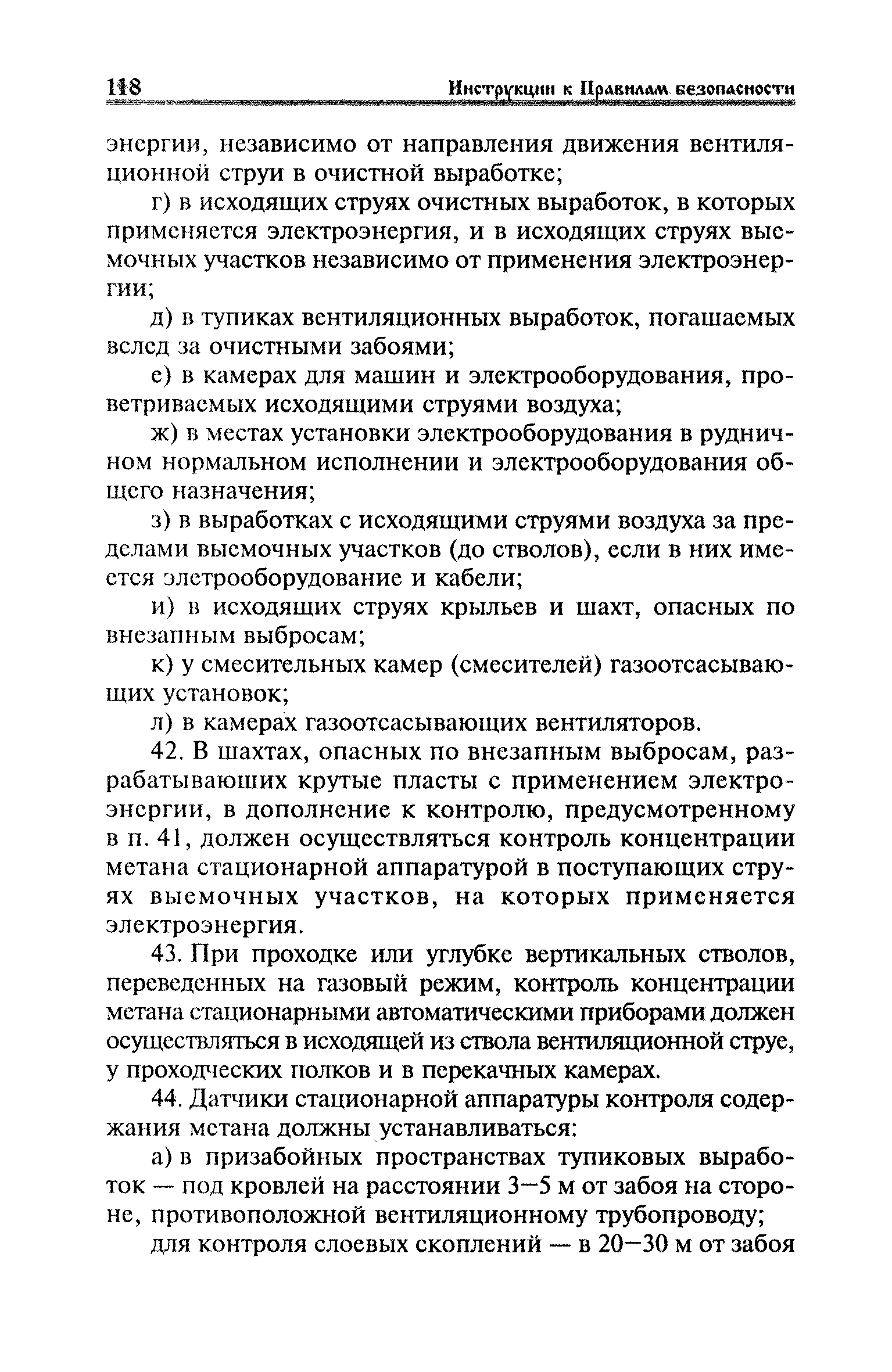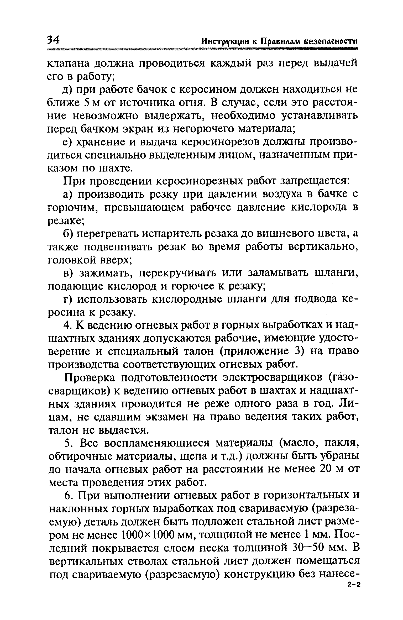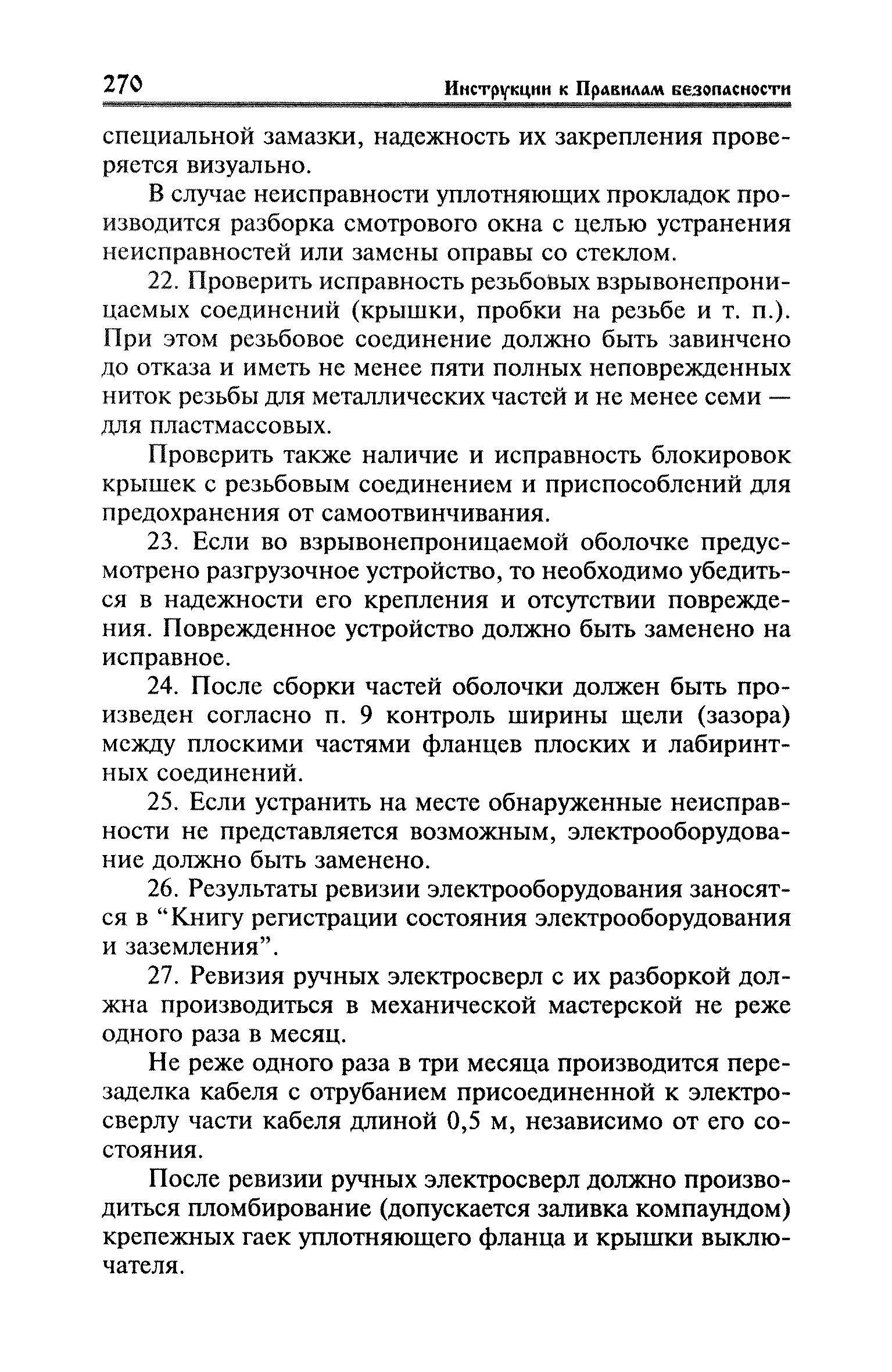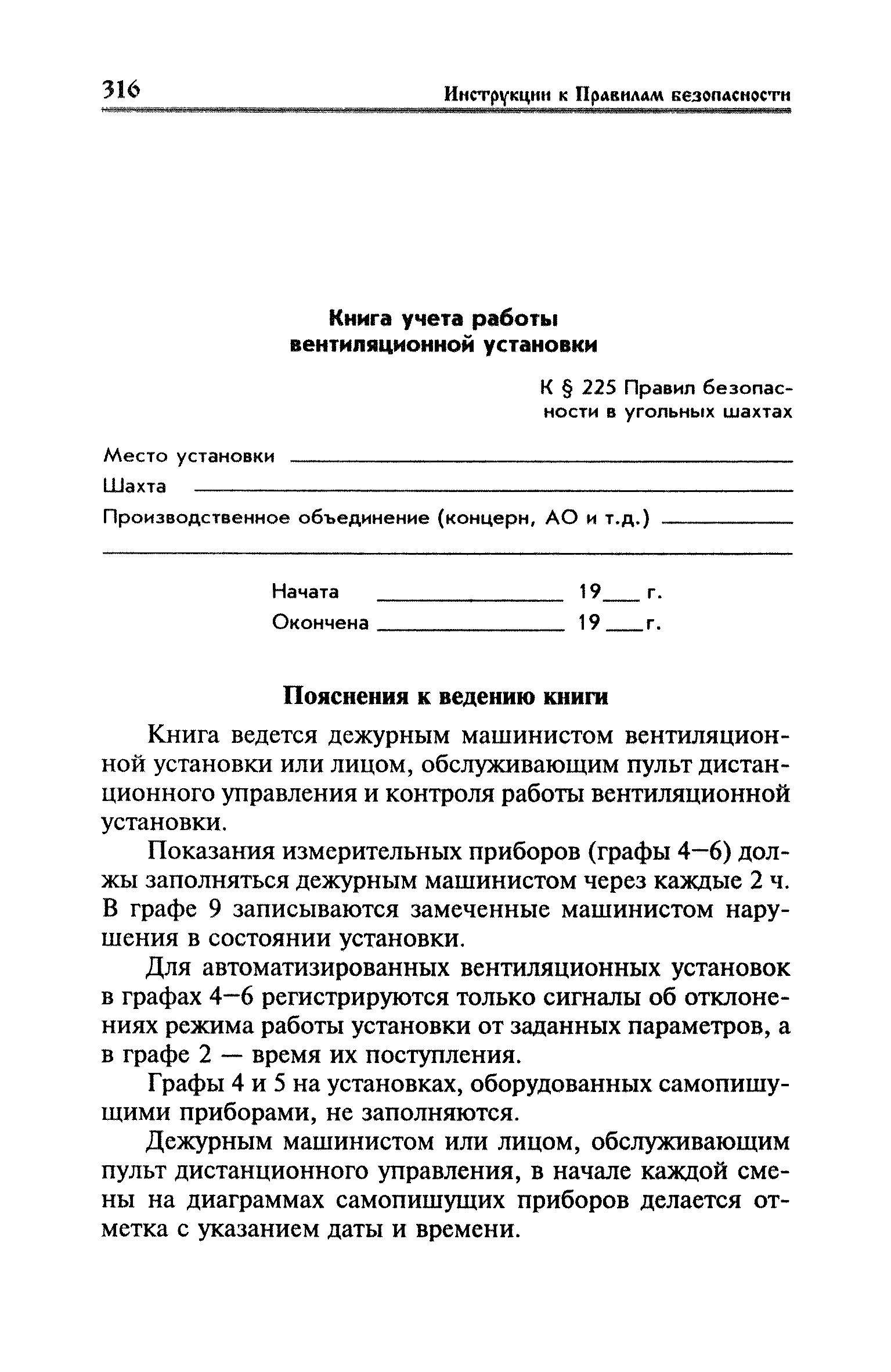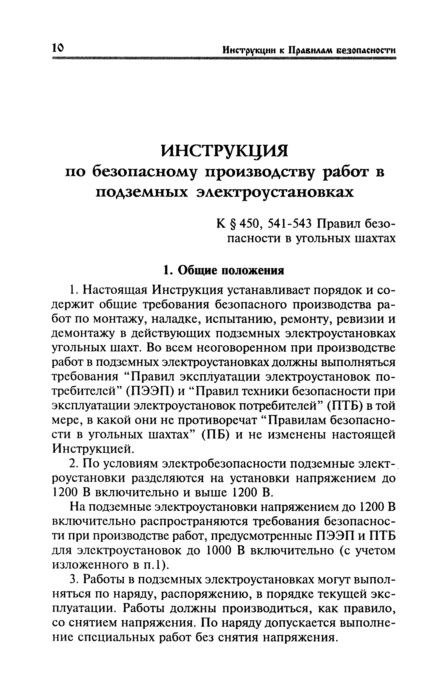 Правила безопасности в угольных шахтах (Инструкции). Книга 2| Статус: | справочные материалы, мп, тпр | | Название рус.: | Правила безопасности в угольных шахтах (Инструкции). Книга 2 | | Дата добавления в базу: | 01.02.2020 | | Дата актуализации: | 01.01.2021 | | Область применения: | В книгу 2 "Правил безопасности в угольных шахтах" включены Инструкции, определяющие вопросы безопасности при ведении горных работ, а также порядок выполнения ряда требований "Правил безопасности в угольных шахтах" (по составлению паспортов выемочных участков, проведению и креплению горных выработок; по ведению огневых работ в подземных выработках и надшахтных зданиях; по обеспечению безопасности при эксплуатации электромеханического оборудования, соблюдению пылегазового режима; противопожарной защите и др.). Приведены формы книг и журналов, ведение которых предусмотрено "Правилами безопасности в угольных шахтах". Все инструкции являются неотъемлемой частью "Правил безопасности в угольных шахтах» и на них полностью распространяются положения, изложенные в главе IХ "Правил безопасности в угольных шахтах" - "Ответственность за нарушение правил безопасности". | | Оглавление: | Инструкция по составлению паспортов выемочного участка проведения и крепления подземных выработок (к § 11, 113) Инструкция по безопасному производству работ в подземных электроустановках (к § 450, 541 - 543) Инструкция по ведению огневых работ в подземных выработках и надшахтных зданиях (к § 57, 533, 570) Инструкция по обучению работников шахт (к § 45, 49, 51) Инструкция по составлению планов ликвидации аварий (к § 16) Инструкция по контролю состава рудничного воздуха, определению газообильности и установлению категорий шахт по метану (к § 204, 273, 275, 276, 278, 220) Инструкция по безопасному применению холодильных установок (к § 206) Инструкция по реверсированию вснтиляционной струи и проверке действия реверсивных устройств вентиляционных установок (к § 222, 223) Инструкция по разгазированию горных выработок, расследованию, учету и предупреждению загазирований (к § 238) Инструкция по составлению вентиляционных планов (к § 272) Инструкция по электроснабжению и применению электрооборудования на шахтах, опасных по внезапным выбросам, разрабатывающих крутые пласты (к § 454) Инструкция по электроснабжению и применению электрооборудования в проветриваемых ВМП тупиковых выработок шахт, опасных по газу(к § 456) Инструкции по применению электрооборудования в рудничном нормальном исполнении и электрооборудования общего назначения в шахтах, опасных по газу и пыли (к § 463) Инструкция по выбору и проверке электрических аппаратов напряжением выше 1200 В (к § 497) Инструкция по определению токов короткого замыкания, выбору и проверке уставок максимальной токовой защиты в сетях напряжением до 1200 В (к § 499) Инструкция по устройству, осмотру и измерению сопротивления шахтных заземлений (к § 522, 550) Инструкция по осмотру и ревизии рудничного взрывобезопасного электрооборудования (к § 542) Инструкция по проверке максимальной токовой защиты шахтных аппаратов (к § 545) Инструкция по противопожарной защите угольных шахт (к § 553) Инструкция по предупреждению самовозгорания, тушению и разборке породных отвалов (к § 666) Книга осмотра стволов шахт (к § 182) Книга осмотра вентиляционных установок и проверки реверсирования (к § 223, 224) Книга учета работы вентиляцион