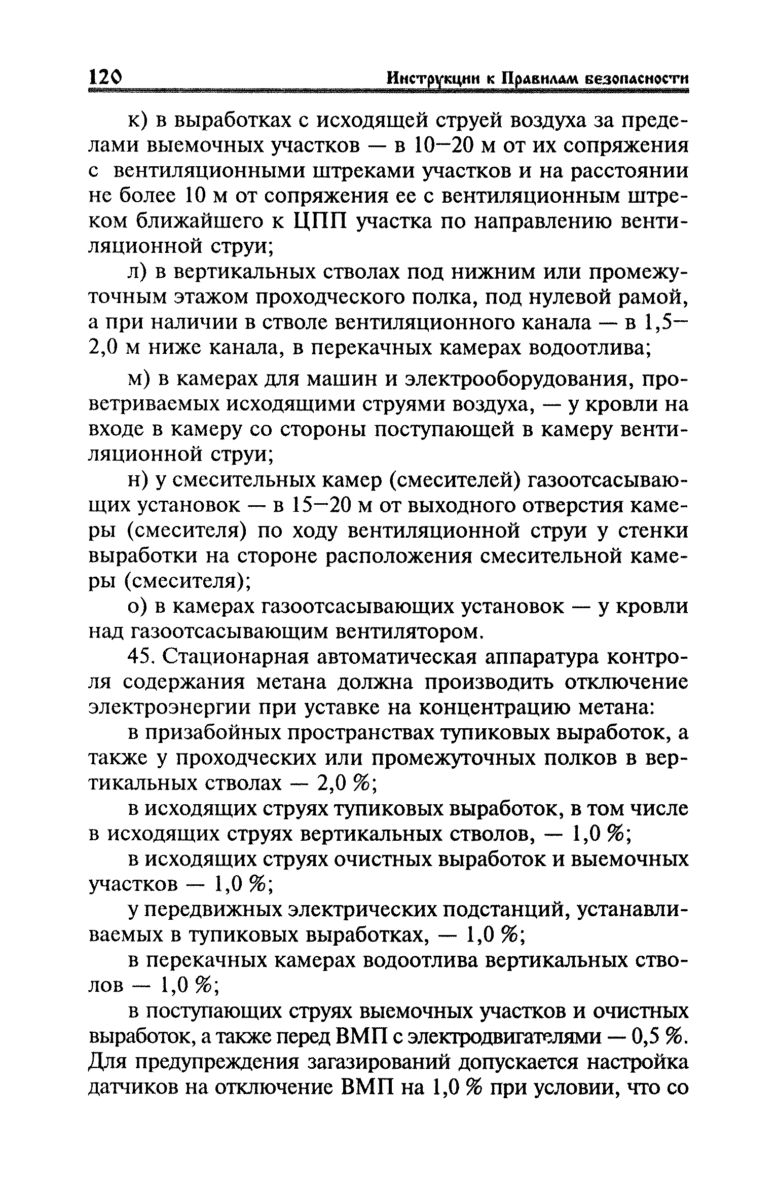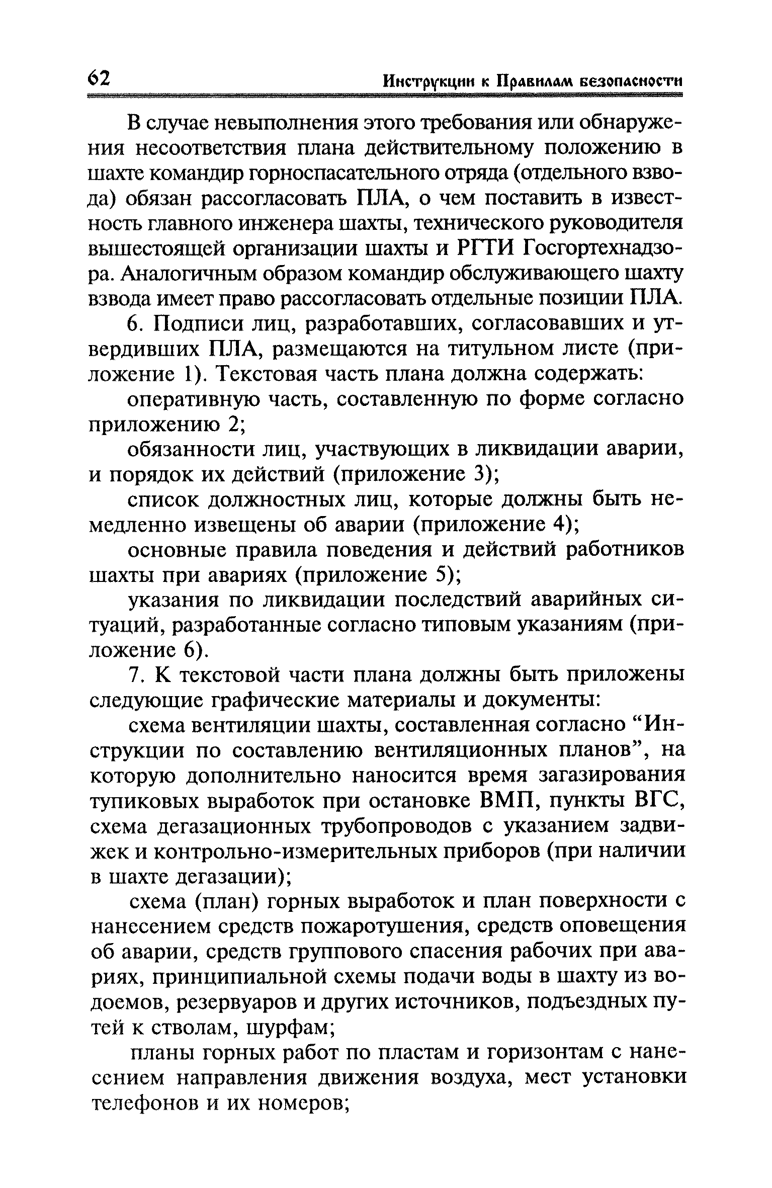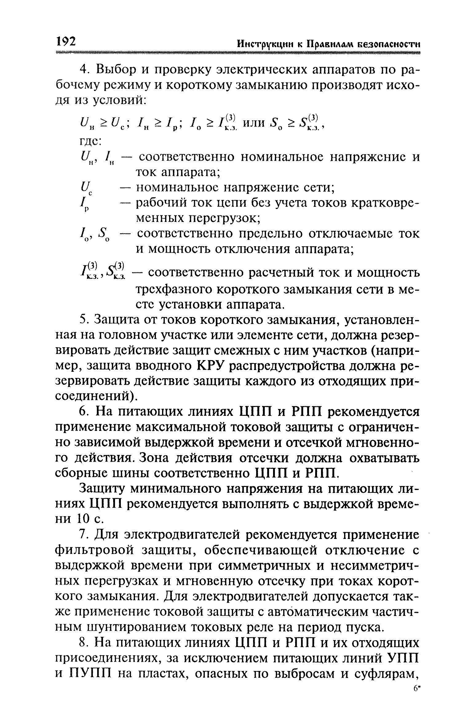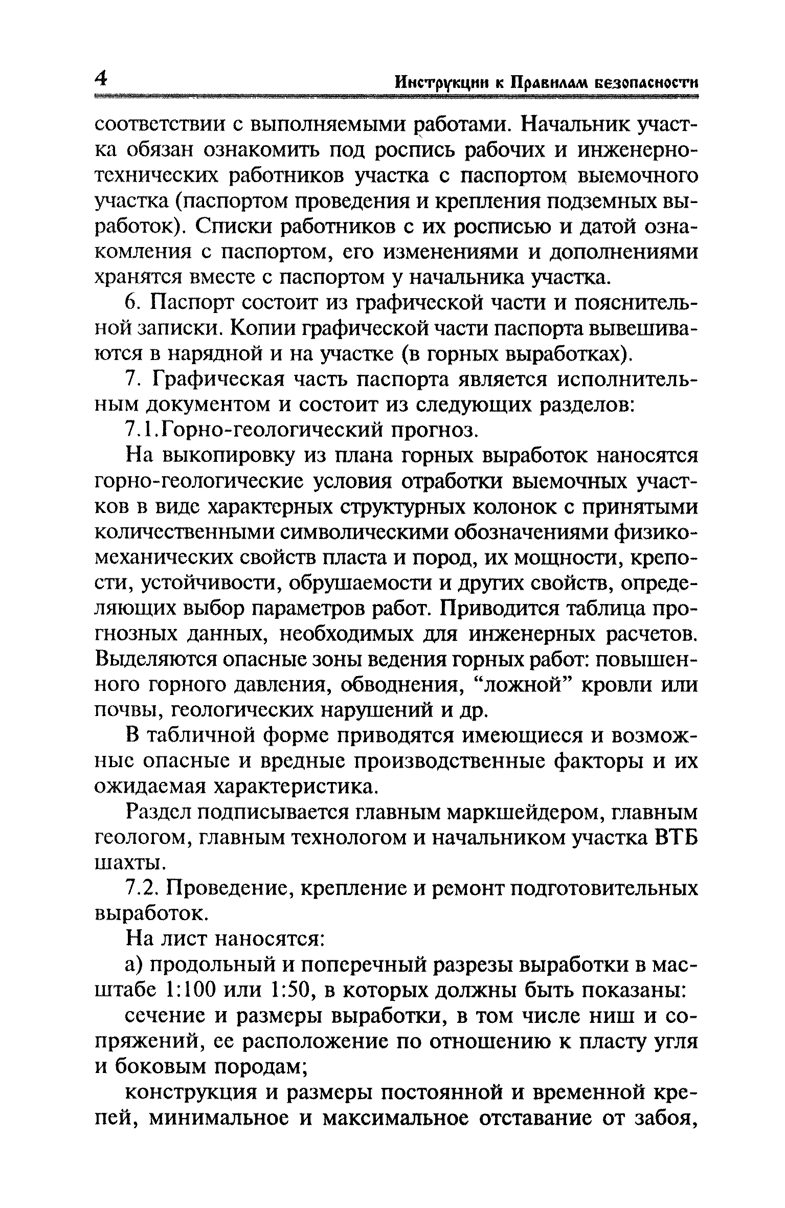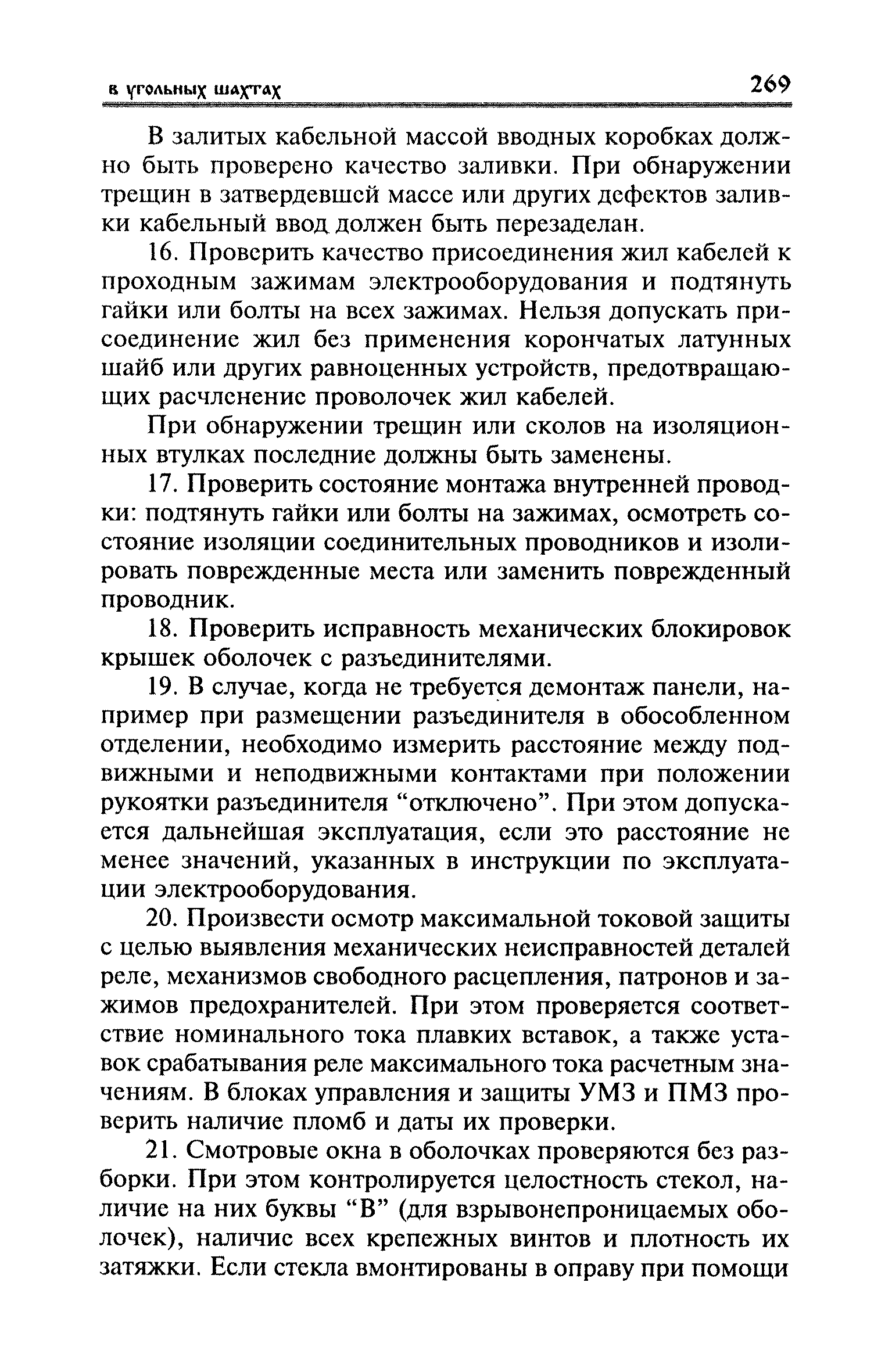 Правила безопасности в угольных шахтах (Инструкции). Книга 2| Статус: | справочные материалы, мп, тпр | | Название рус.: | Правила безопасности в угольных шахтах (Инструкции). Книга 2 | | Дата добавления в базу: | 01.02.2020 | | Дата актуализации: | 01.01.2021 | | Область применения: | В книгу 2 "Правил безопасности в угольных шахтах" включены Инструкции, определяющие вопросы безопасности при ведении горных работ, а также порядок выполнения ряда требований "Правил безопасности в угольных шахтах" (по составлению паспортов выемочных участков, проведению и креплению горных выработок; по ведению огневых работ в подземных выработках и надшахтных зданиях; по обеспечению безопасности при эксплуатации электромеханического оборудования, соблюдению пылегазового режима; противопожарной защите и др.). Приведены формы книг и журналов, ведение которых предусмотрено "Правилами безопасности в угольных шахтах". Все инструкции являются неотъемлемой частью "Правил безопасности в угольных шахтах» и на них полностью распространяются положения, изложенные в главе IХ "Правил безопасности в угольных шахтах" - "Ответственность за нарушение правил безопасности". | | Оглавление: | Инструкция по составлению паспортов выемочного участка проведения и крепления подземных выработок (к § 11, 113) Инструкция по безопасному производству работ в подземных электроустановках (к § 450, 541 - 543) Инструкция по ведению огневых работ в подземных выработках и надшахтных зданиях (к § 57, 533, 570) Инструкция по обучению работников шахт (к § 45, 49, 51) Инструкция по составлению планов ликвидации аварий (к § 16) Инструкция по контролю состава рудничного воздуха, определению газообильности и установлению категорий шахт по метану (к § 204, 273, 275, 276, 278, 220) Инструкция по безопасному применению холодильных установок (к § 206) Инструкция по реверсированию вснтиляционной струи и проверке действия реверсивных устройств вентиляционных установок (к § 222, 223) Инструкция по разгазированию горных выработок, расследованию, учету и предупреждению загазирований (к § 238) Инструкция по составлению вентиляционных планов (к § 272) Инструкция по электроснабжению и применению электрооборудования на шахтах, опасных по внезапным выбросам, разрабатывающих крутые пласты (к § 454) Инструкция по электроснабжению и применению электрооборудования в проветриваемых ВМП тупиковых выработок шахт, опасных по газу(к § 456) Инструкции по применению электрооборудования в рудничном нормальном исполнении и электрооборудования общего назначения в шахтах, опасных по газу и пыли (к § 463) Инструкция по выбору и проверке электрических аппаратов напряжением выше 1200 В (к § 497) Инструкция по определению токов короткого замыкания, выбору и проверке уставок максимальной токовой защиты в сетях напряжением до 1200 В (к § 499) Инструкция по устройству, осмотру и измерению сопротивления шахтных заземлений (к § 522, 550) Инструкция по осмотру и ревизии рудничного взрывобезопасного электрооборудования (к § 542) Инструкция по проверке максимальной токовой защиты шахтных аппаратов (к § 545) Инструкция по противопожарной защите угольных шахт (к § 553) Инструкция по предупреждению самовозгорания, тушению и разборке породных отвалов (к § 666) Книга осмотра стволов шахт (к § 182) Книга осмотра вентиляционных установок и проверки реверсирования (к § 223, 224) Книга учета работы вентиляцион