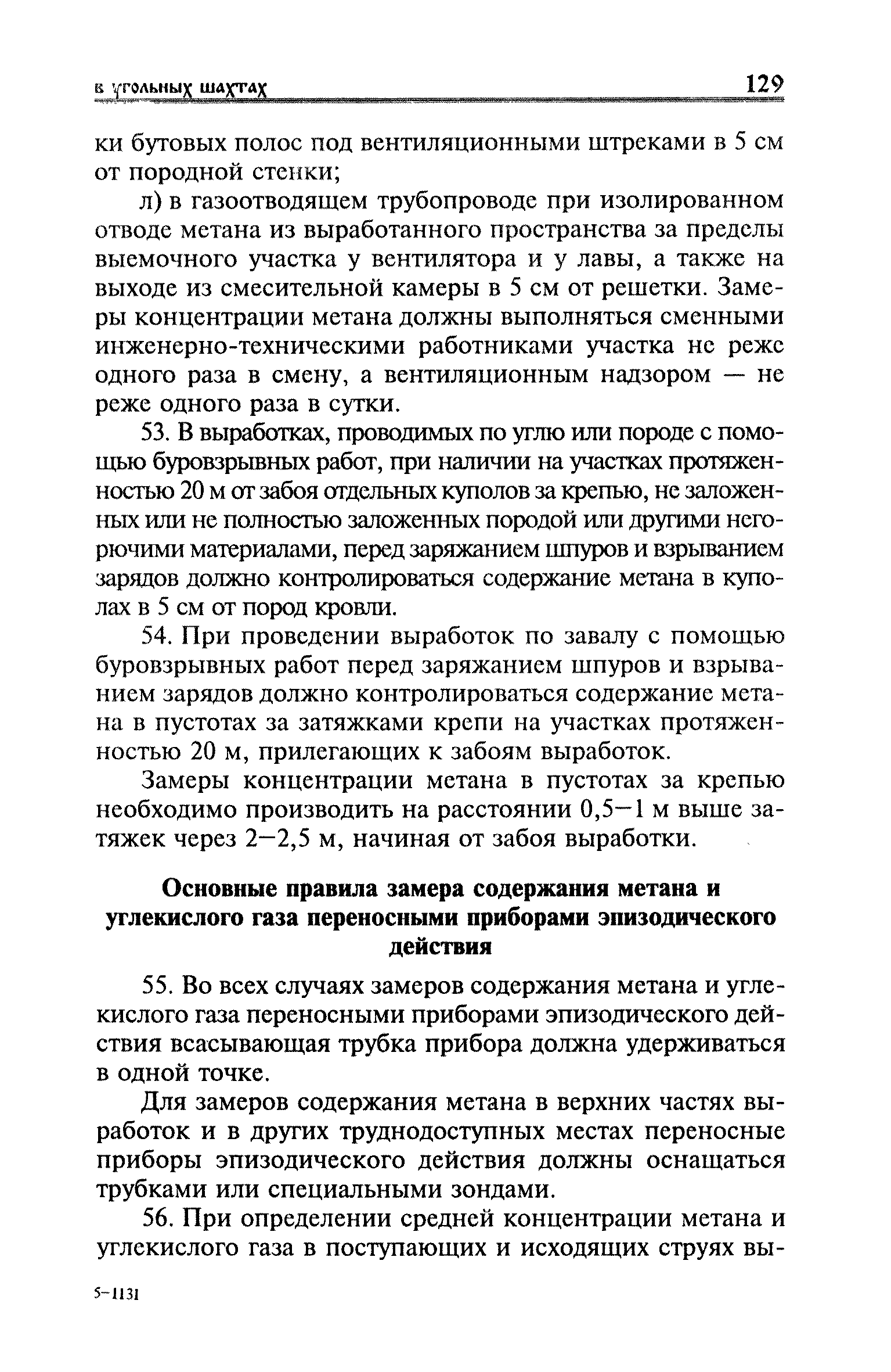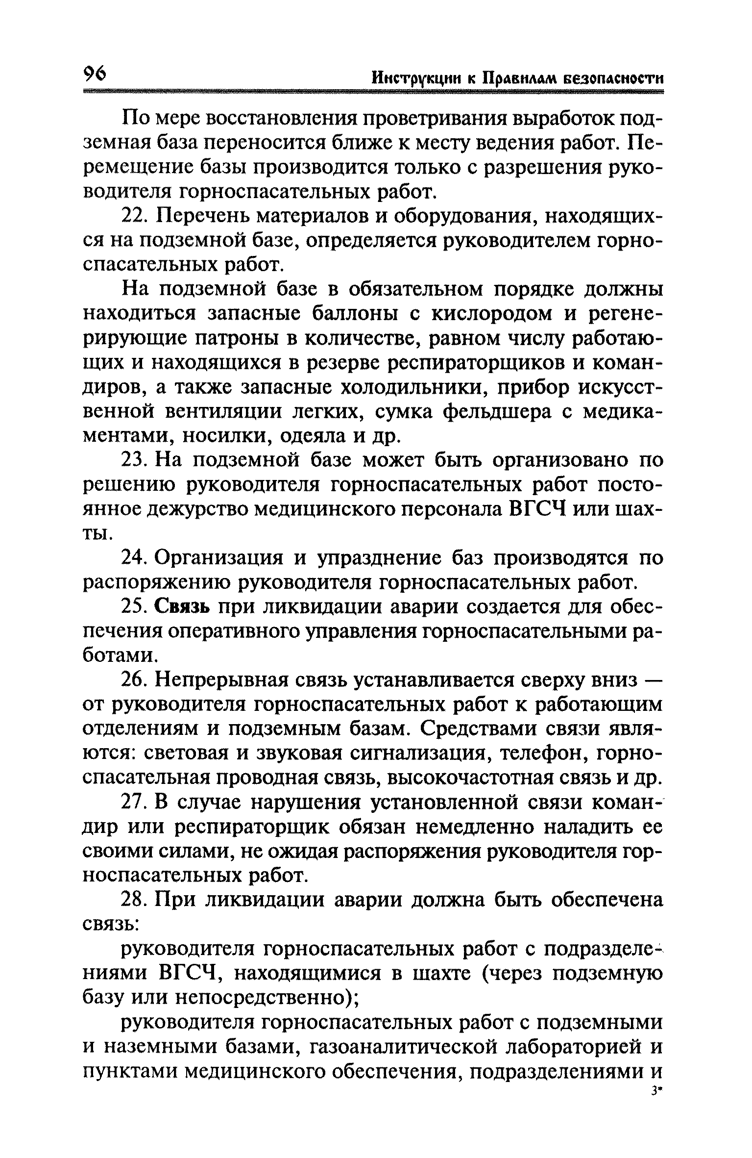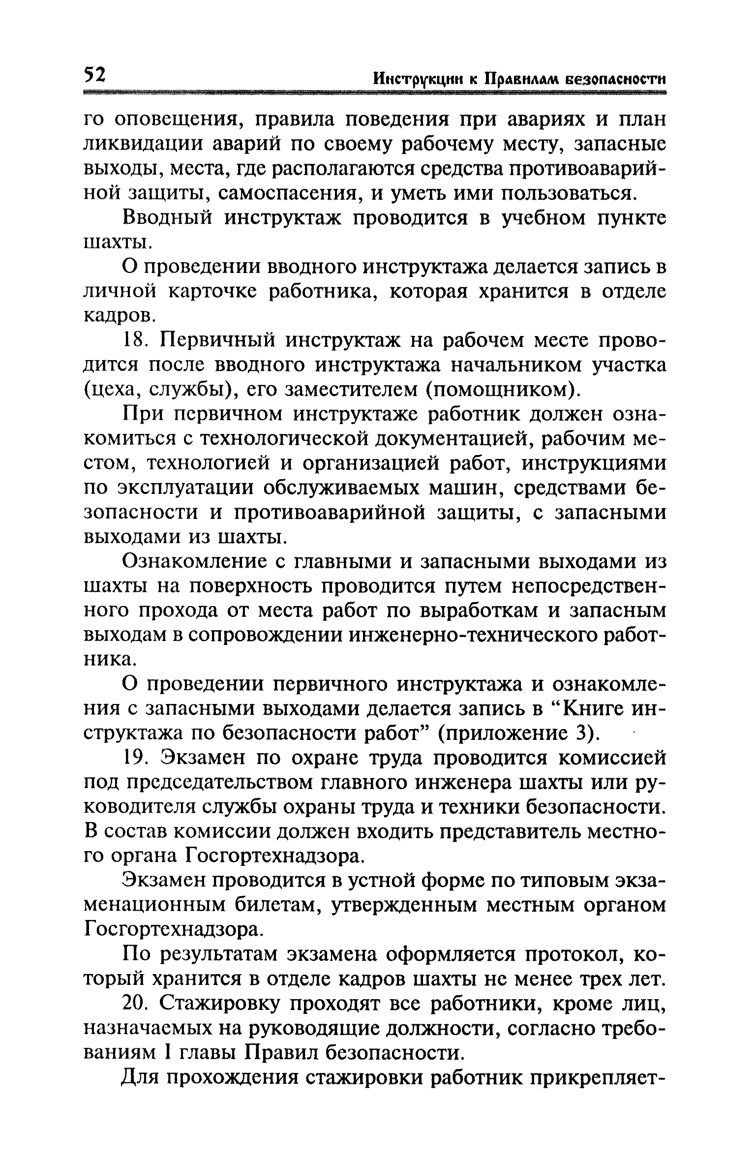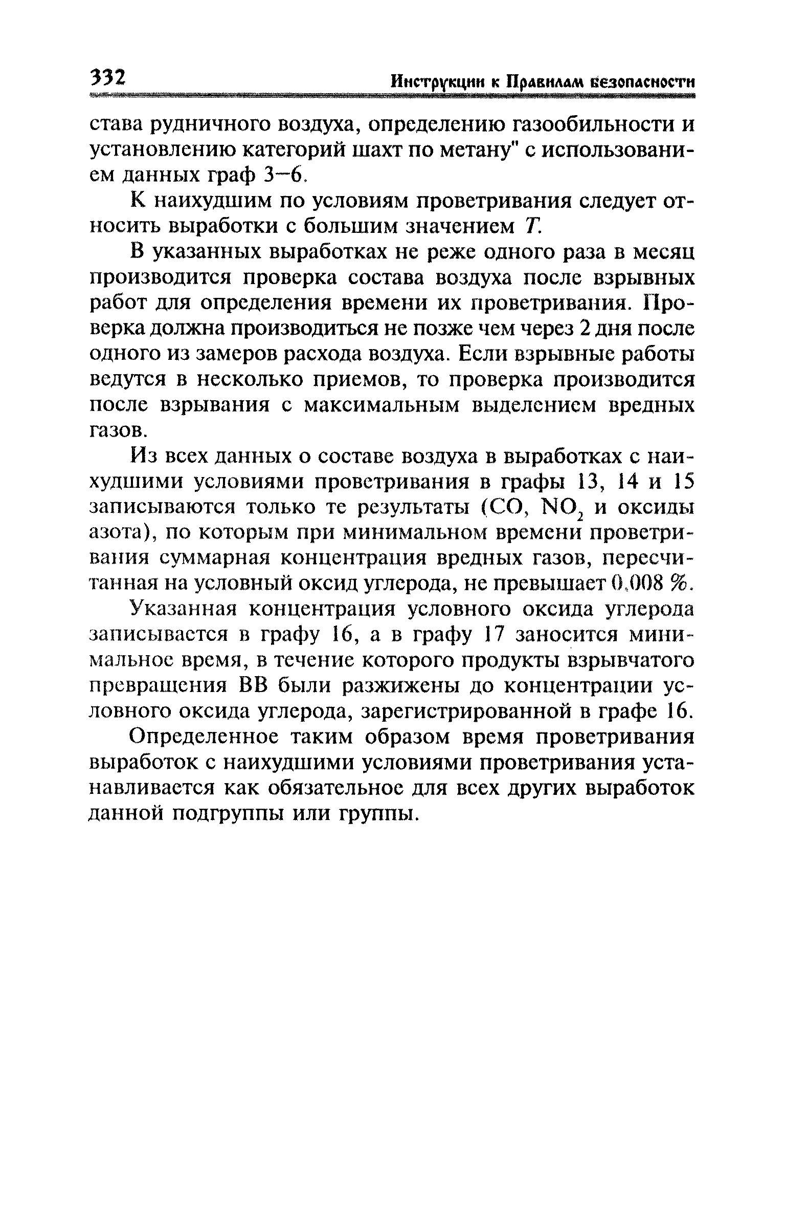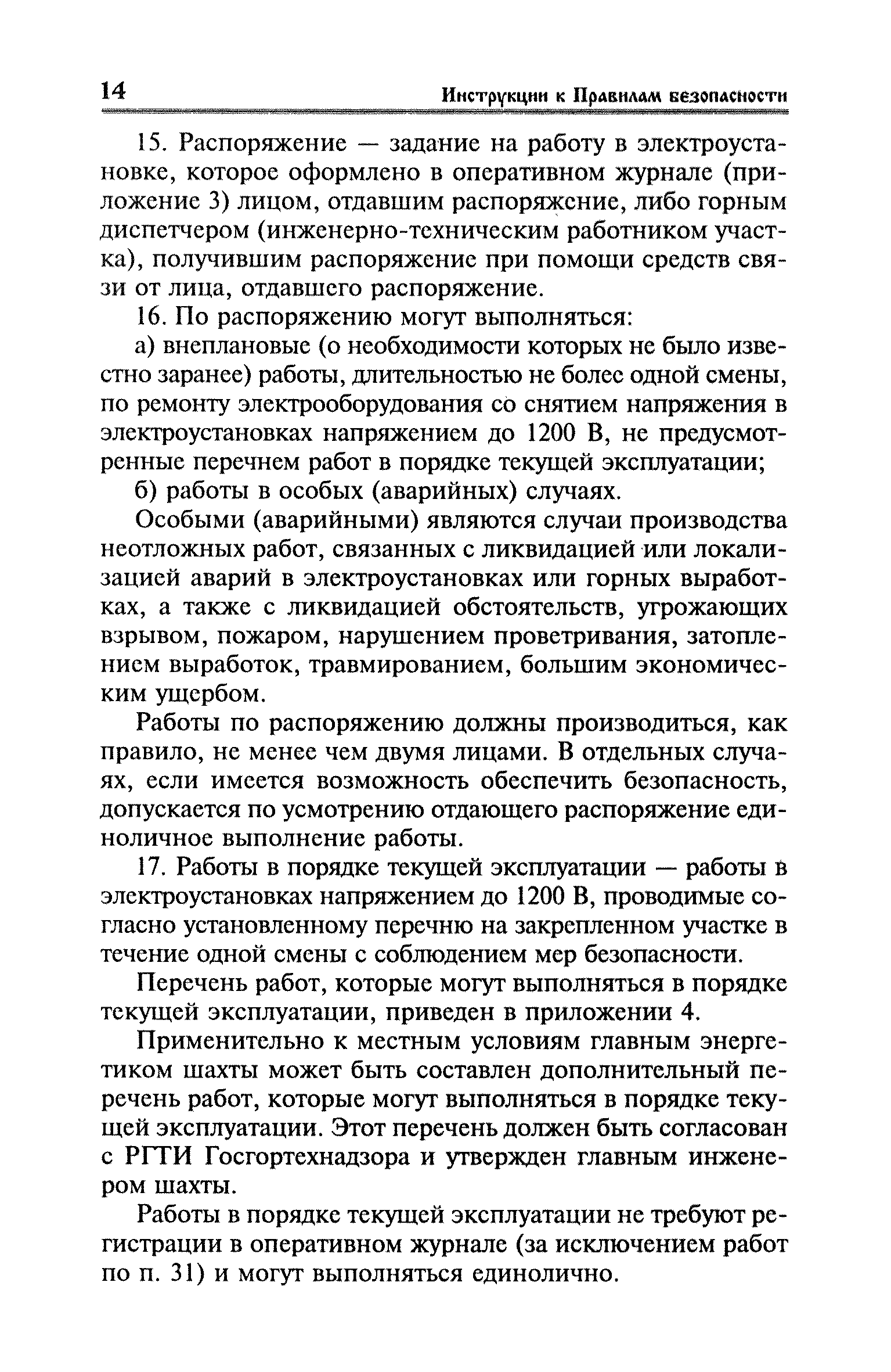 Правила безопасности в угольных шахтах (Инструкции). Книга 2| Статус: | справочные материалы, мп, тпр | | Название рус.: | Правила безопасности в угольных шахтах (Инструкции). Книга 2 | | Дата добавления в базу: | 01.02.2020 | | Дата актуализации: | 01.01.2021 | | Область применения: | В книгу 2 "Правил безопасности в угольных шахтах" включены Инструкции, определяющие вопросы безопасности при ведении горных работ, а также порядок выполнения ряда требований "Правил безопасности в угольных шахтах" (по составлению паспортов выемочных участков, проведению и креплению горных выработок; по ведению огневых работ в подземных выработках и надшахтных зданиях; по обеспечению безопасности при эксплуатации электромеханического оборудования, соблюдению пылегазового режима; противопожарной защите и др.). Приведены формы книг и журналов, ведение которых предусмотрено "Правилами безопасности в угольных шахтах". Все инструкции являются неотъемлемой частью "Правил безопасности в угольных шахтах» и на них полностью распространяются положения, изложенные в главе IХ "Правил безопасности в угольных шахтах" - "Ответственность за нарушение правил безопасности". | | Оглавление: | Инструкция по составлению паспортов выемочного участка проведения и крепления подземных выработок (к § 11, 113) Инструкция по безопасному производству работ в подземных электроустановках (к § 450, 541 - 543) Инструкция по ведению огневых работ в подземных выработках и надшахтных зданиях (к § 57, 533, 570) Инструкция по обучению работников шахт (к § 45, 49, 51) Инструкция по составлению планов ликвидации аварий (к § 16) Инструкция по контролю состава рудничного воздуха, определению газообильности и установлению категорий шахт по метану (к § 204, 273, 275, 276, 278, 220) Инструкция по безопасному применению холодильных установок (к § 206) Инструкция по реверсированию вснтиляционной струи и проверке действия реверсивных устройств вентиляционных установок (к § 222, 223) Инструкция по разгазированию горных выработок, расследованию, учету и предупреждению загазирований (к § 238) Инструкция по составлению вентиляционных планов (к § 272) Инструкция по электроснабжению и применению электрооборудования на шахтах, опасных по внезапным выбросам, разрабатывающих крутые пласты (к § 454) Инструкция по электроснабжению и применению электрооборудования в проветриваемых ВМП тупиковых выработок шахт, опасных по газу(к § 456) Инструкции по применению электрооборудования в рудничном нормальном исполнении и электрооборудования общего назначения в шахтах, опасных по газу и пыли (к § 463) Инструкция по выбору и проверке электрических аппаратов напряжением выше 1200 В (к § 497) Инструкция по определению токов короткого замыкания, выбору и проверке уставок максимальной токовой защиты в сетях напряжением до 1200 В (к § 499) Инструкция по устройству, осмотру и измерению сопротивления шахтных заземлений (к § 522, 550) Инструкция по осмотру и ревизии рудничного взрывобезопасного электрооборудования (к § 542) Инструкция по проверке максимальной токовой защиты шахтных аппаратов (к § 545) Инструкция по противопожарной защите угольных шахт (к § 553) Инструкция по предупреждению самовозгорания, тушению и разборке породных отвалов (к § 666) Книга осмотра стволов шахт (к § 182) Книга осмотра вентиляционных установок и проверки реверсирования (к § 223, 224) Книга учета работы вентиляцион