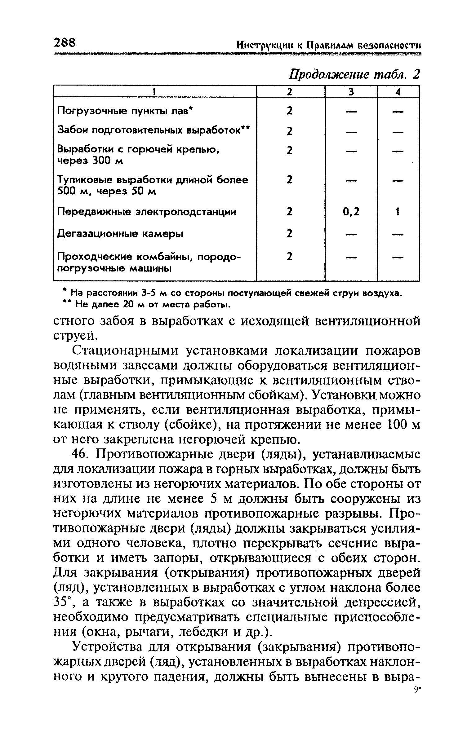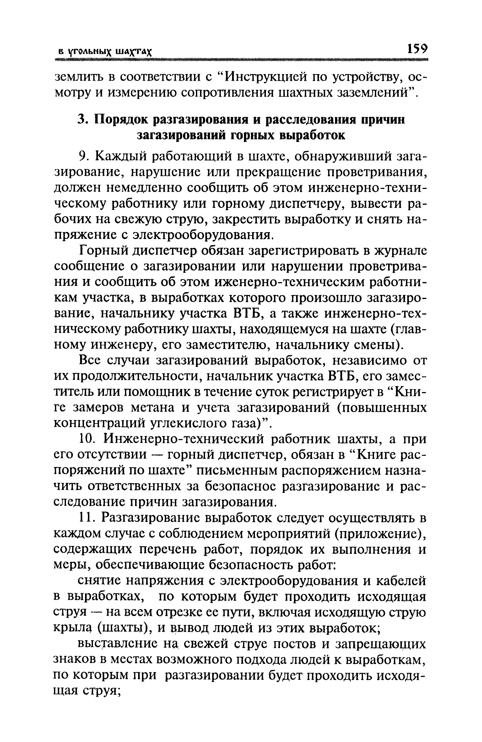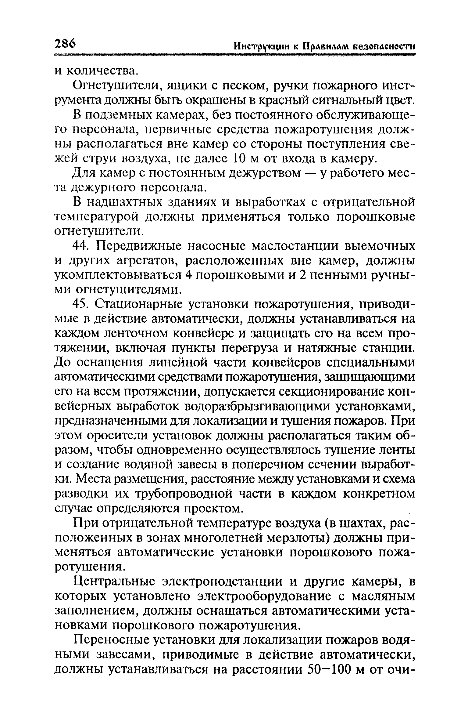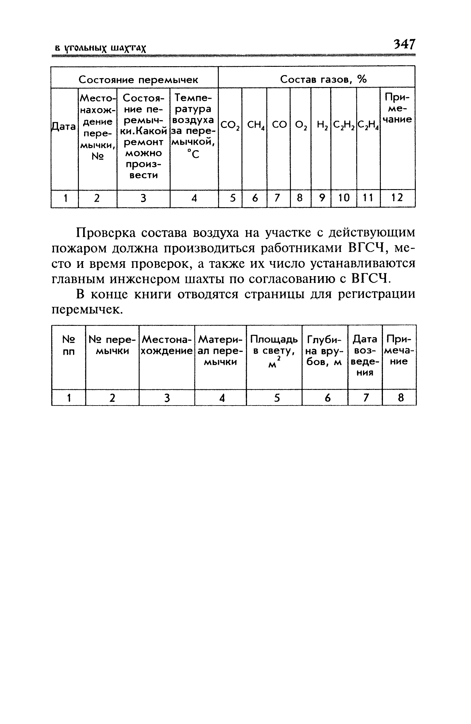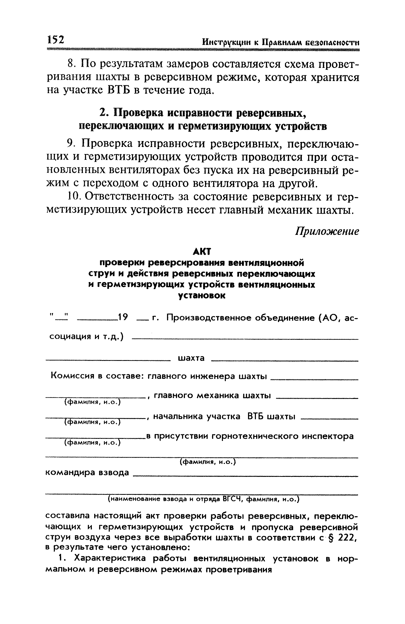 Правила безопасности в угольных шахтах (Инструкции). Книга 2| Статус: | справочные материалы, мп, тпр | | Название рус.: | Правила безопасности в угольных шахтах (Инструкции). Книга 2 | | Дата добавления в базу: | 01.02.2020 | | Дата актуализации: | 01.01.2021 | | Область применения: | В книгу 2 "Правил безопасности в угольных шахтах" включены Инструкции, определяющие вопросы безопасности при ведении горных работ, а также порядок выполнения ряда требований "Правил безопасности в угольных шахтах" (по составлению паспортов выемочных участков, проведению и креплению горных выработок; по ведению огневых работ в подземных выработках и надшахтных зданиях; по обеспечению безопасности при эксплуатации электромеханического оборудования, соблюдению пылегазового режима; противопожарной защите и др.). Приведены формы книг и журналов, ведение которых предусмотрено "Правилами безопасности в угольных шахтах". Все инструкции являются неотъемлемой частью "Правил безопасности в угольных шахтах» и на них полностью распространяются положения, изложенные в главе IХ "Правил безопасности в угольных шахтах" - "Ответственность за нарушение правил безопасности". | | Оглавление: | Инструкция по составлению паспортов выемочного участка проведения и крепления подземных выработок (к § 11, 113) Инструкция по безопасному производству работ в подземных электроустановках (к § 450, 541 - 543) Инструкция по ведению огневых работ в подземных выработках и надшахтных зданиях (к § 57, 533, 570) Инструкция по обучению работников шахт (к § 45, 49, 51) Инструкция по составлению планов ликвидации аварий (к § 16) Инструкция по контролю состава рудничного воздуха, определению газообильности и установлению категорий шахт по метану (к § 204, 273, 275, 276, 278, 220) Инструкция по безопасному применению холодильных установок (к § 206) Инструкция по реверсированию вснтиляционной струи и проверке действия реверсивных устройств вентиляционных установок (к § 222, 223) Инструкция по разгазированию горных выработок, расследованию, учету и предупреждению загазирований (к § 238) Инструкция по составлению вентиляционных планов (к § 272) Инструкция по электроснабжению и применению электрооборудования на шахтах, опасных по внезапным выбросам, разрабатывающих крутые пласты (к § 454) Инструкция по электроснабжению и применению электрооборудования в проветриваемых ВМП тупиковых выработок шахт, опасных по газу(к § 456) Инструкции по применению электрооборудования в рудничном нормальном исполнении и электрооборудования общего назначения в шахтах, опасных по газу и пыли (к § 463) Инструкция по выбору и проверке электрических аппаратов напряжением выше 1200 В (к § 497) Инструкция по определению токов короткого замыкания, выбору и проверке уставок максимальной токовой защиты в сетях напряжением до 1200 В (к § 499) Инструкция по устройству, осмотру и измерению сопротивления шахтных заземлений (к § 522, 550) Инструкция по осмотру и ревизии рудничного взрывобезопасного электрооборудования (к § 542) Инструкция по проверке максимальной токовой защиты шахтных аппаратов (к § 545) Инструкция по противопожарной защите угольных шахт (к § 553) Инструкция по предупреждению самовозгорания, тушению и разборке породных отвалов (к § 666) Книга осмотра стволов шахт (к § 182) Книга осмотра вентиляционных установок и проверки реверсирования (к § 223, 224) Книга учета работы вентиляцион