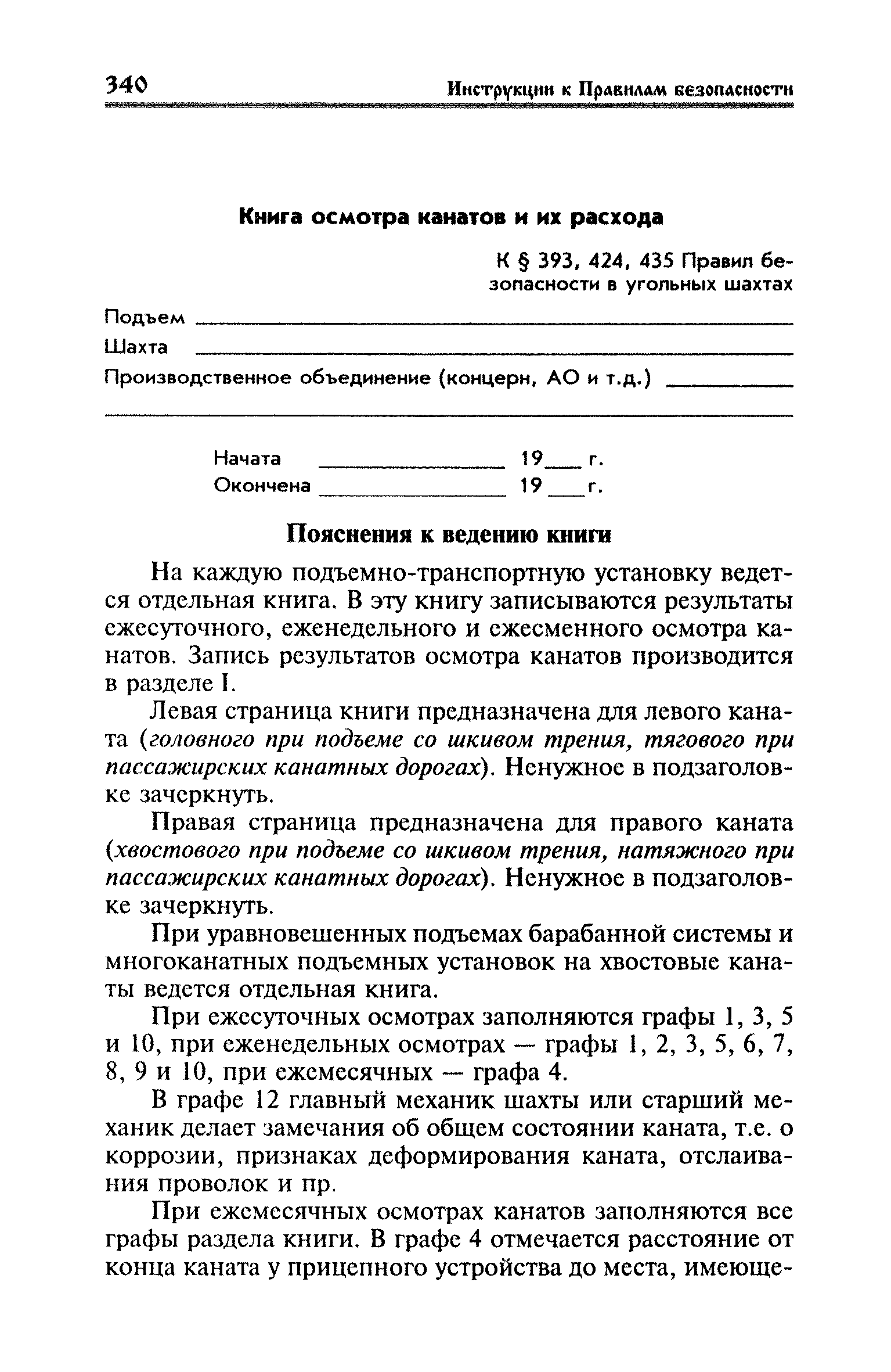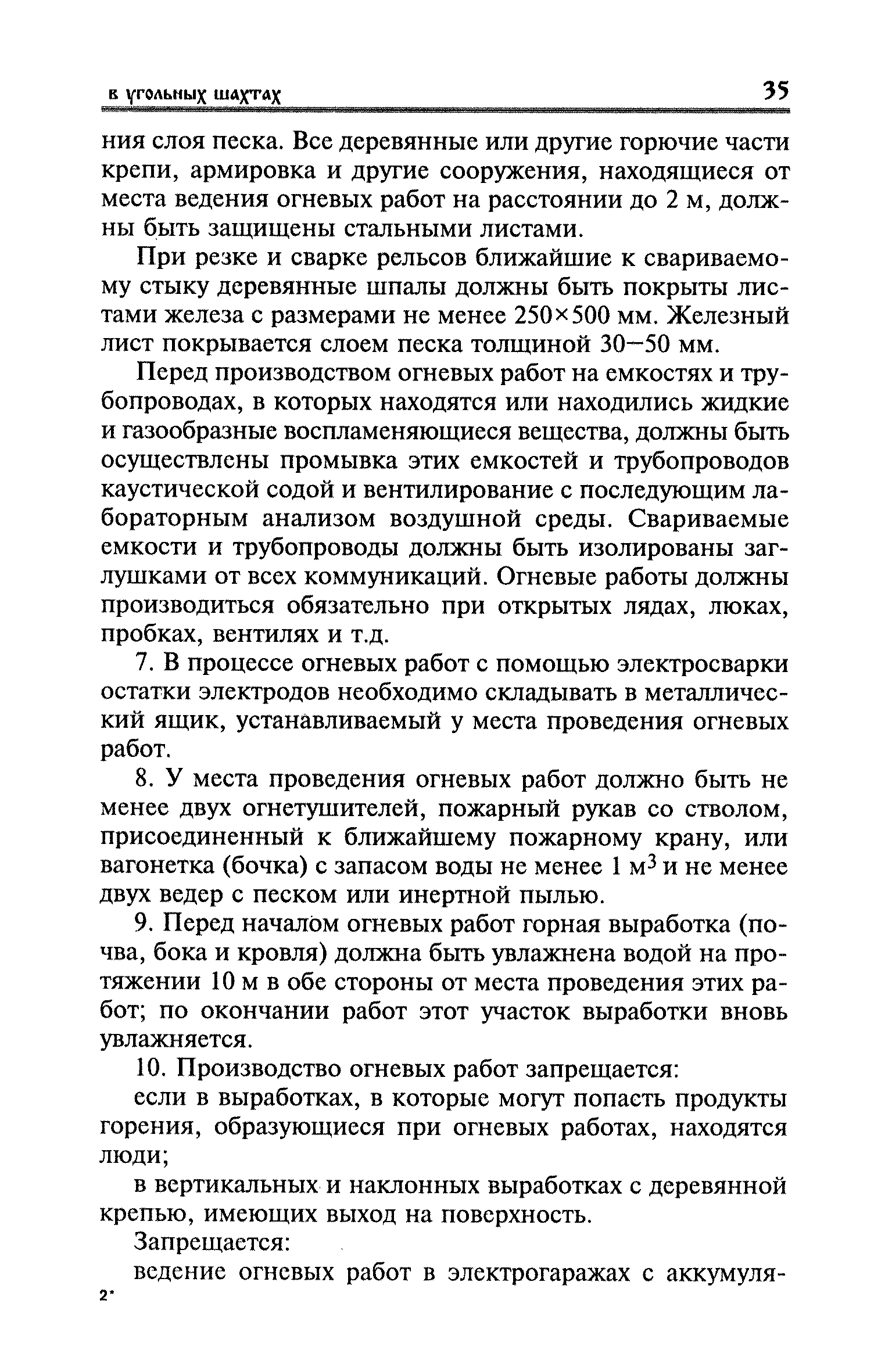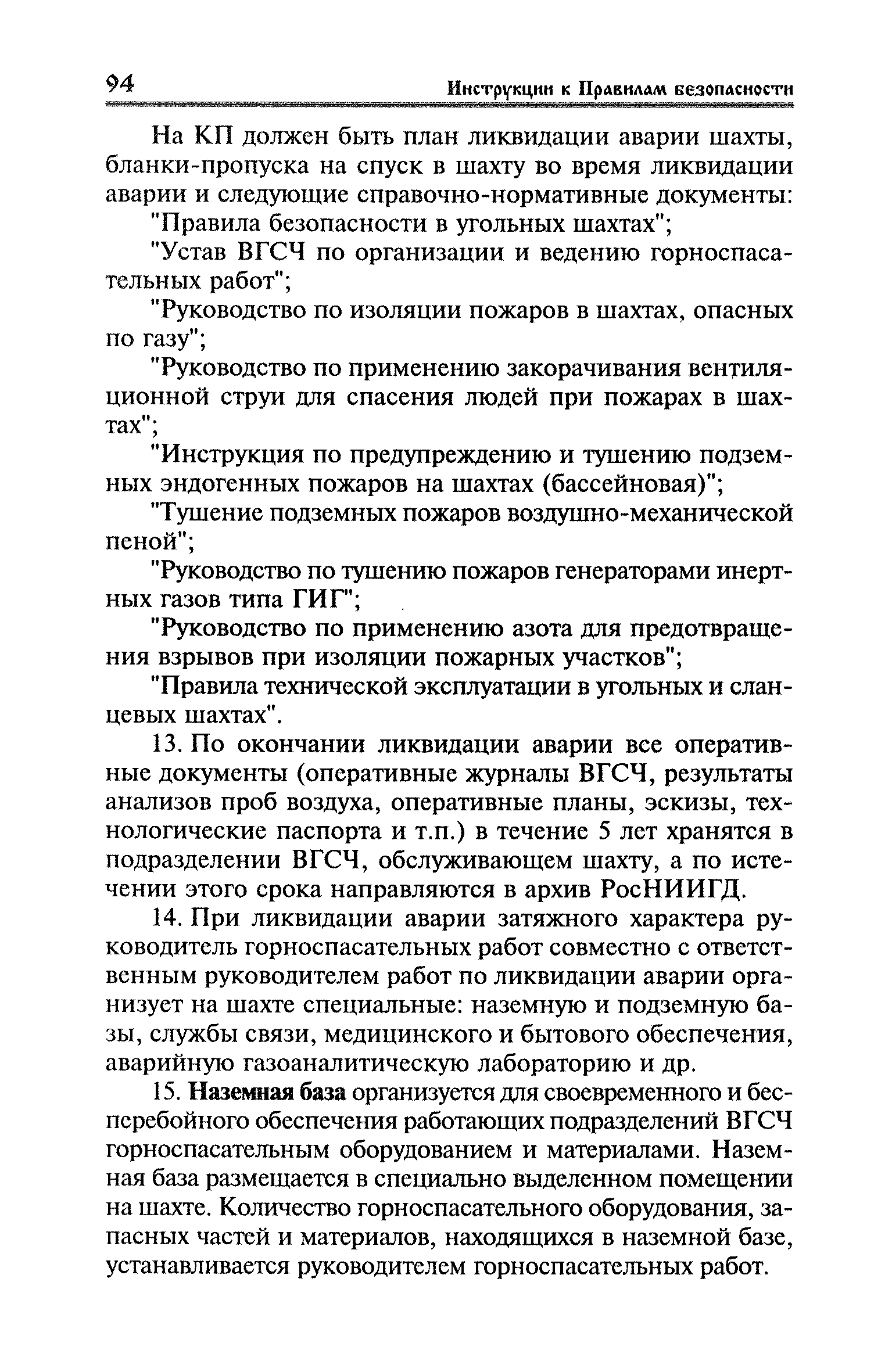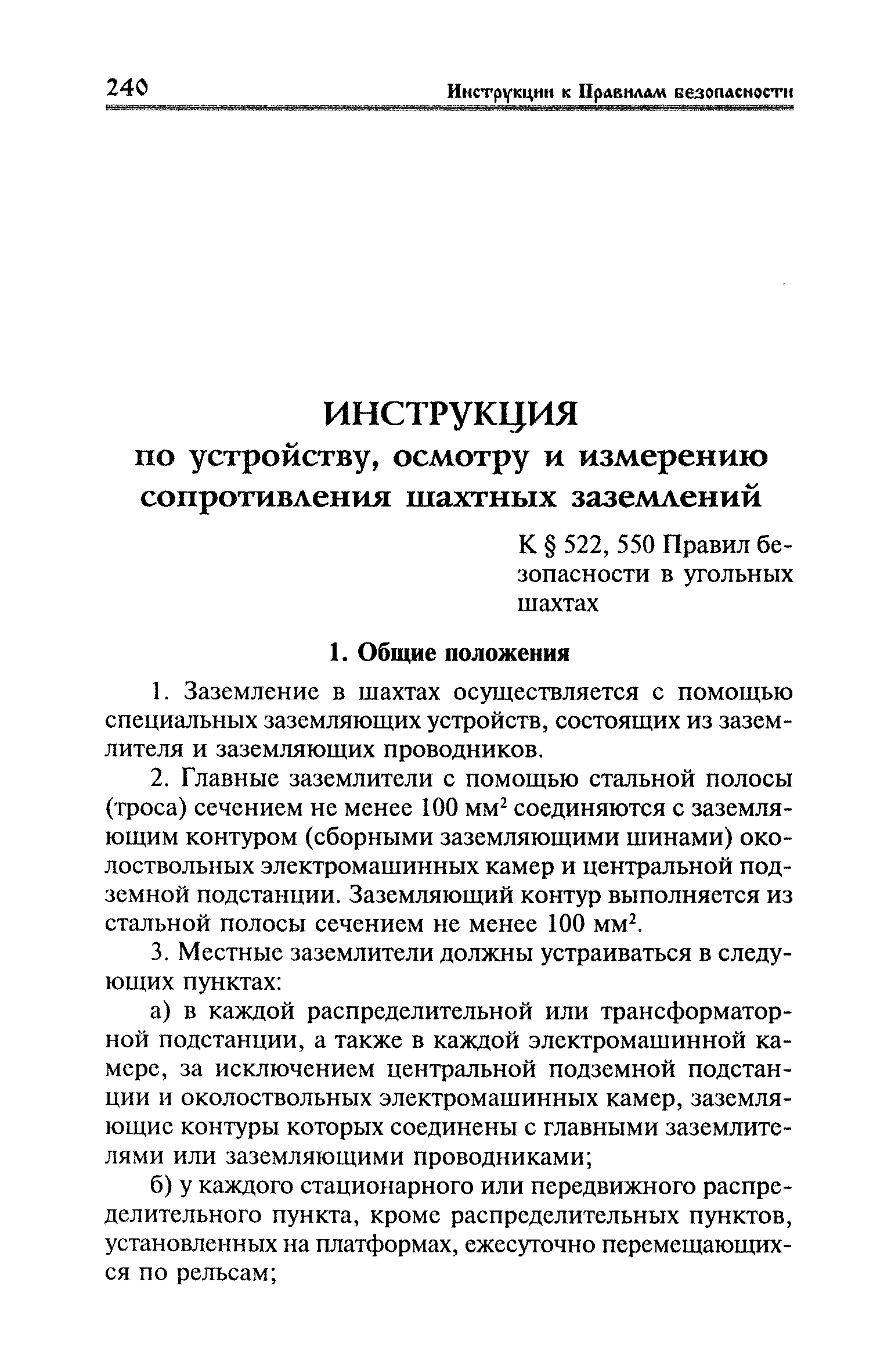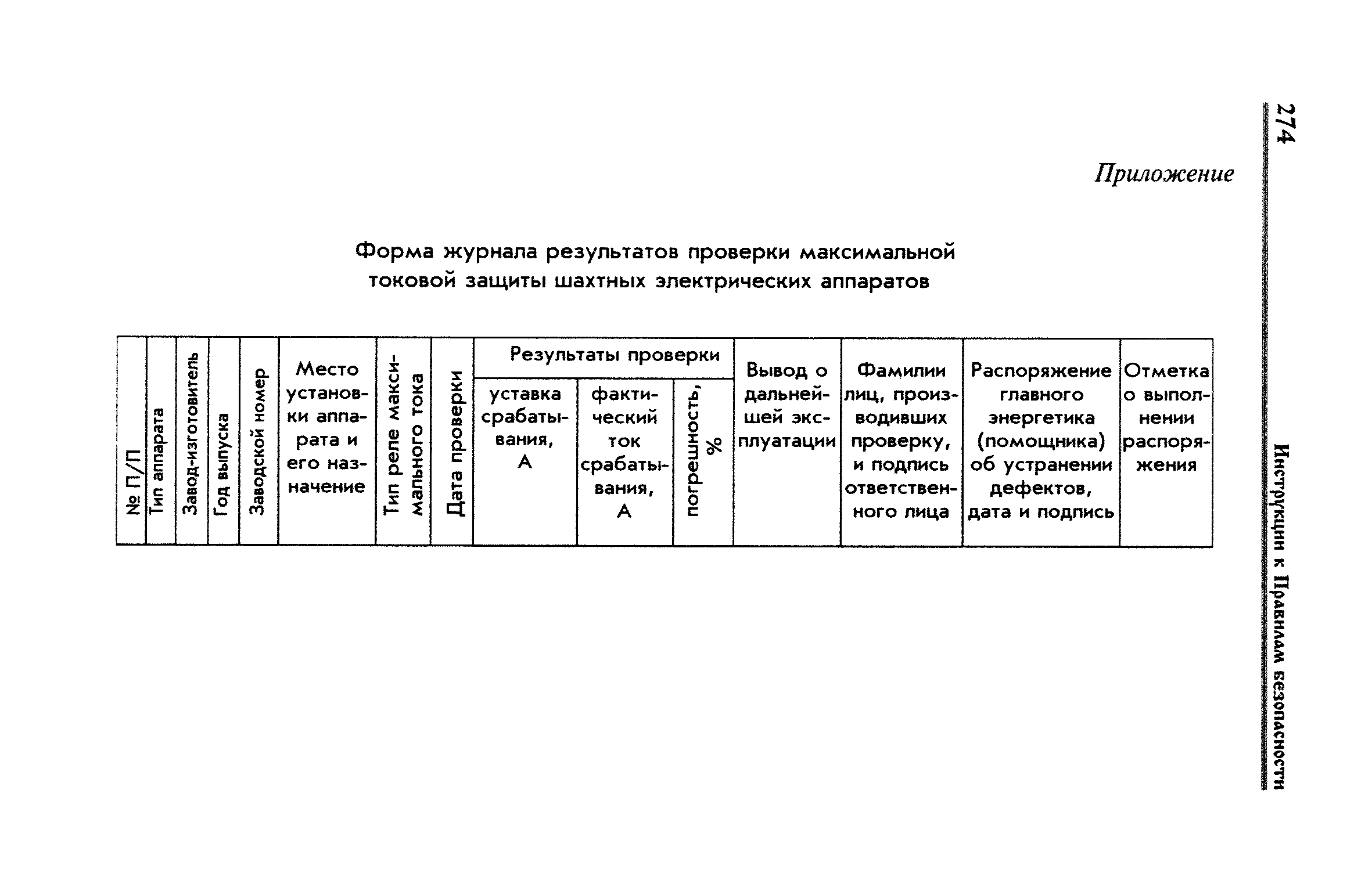 Правила безопасности в угольных шахтах (Инструкции). Книга 2| Статус: | справочные материалы, мп, тпр | | Название рус.: | Правила безопасности в угольных шахтах (Инструкции). Книга 2 | | Дата добавления в базу: | 01.02.2020 | | Дата актуализации: | 01.01.2021 | | Область применения: | В книгу 2 "Правил безопасности в угольных шахтах" включены Инструкции, определяющие вопросы безопасности при ведении горных работ, а также порядок выполнения ряда требований "Правил безопасности в угольных шахтах" (по составлению паспортов выемочных участков, проведению и креплению горных выработок; по ведению огневых работ в подземных выработках и надшахтных зданиях; по обеспечению безопасности при эксплуатации электромеханического оборудования, соблюдению пылегазового режима; противопожарной защите и др.). Приведены формы книг и журналов, ведение которых предусмотрено "Правилами безопасности в угольных шахтах". Все инструкции являются неотъемлемой частью "Правил безопасности в угольных шахтах» и на них полностью распространяются положения, изложенные в главе IХ "Правил безопасности в угольных шахтах" - "Ответственность за нарушение правил безопасности". | | Оглавление: | Инструкция по составлению паспортов выемочного участка проведения и крепления подземных выработок (к § 11, 113) Инструкция по безопасному производству работ в подземных электроустановках (к § 450, 541 - 543) Инструкция по ведению огневых работ в подземных выработках и надшахтных зданиях (к § 57, 533, 570) Инструкция по обучению работников шахт (к § 45, 49, 51) Инструкция по составлению планов ликвидации аварий (к § 16) Инструкция по контролю состава рудничного воздуха, определению газообильности и установлению категорий шахт по метану (к § 204, 273, 275, 276, 278, 220) Инструкция по безопасному применению холодильных установок (к § 206) Инструкция по реверсированию вснтиляционной струи и проверке действия реверсивных устройств вентиляционных установок (к § 222, 223) Инструкция по разгазированию горных выработок, расследованию, учету и предупреждению загазирований (к § 238) Инструкция по составлению вентиляционных планов (к § 272) Инструкция по электроснабжению и применению электрооборудования на шахтах, опасных по внезапным выбросам, разрабатывающих крутые пласты (к § 454) Инструкция по электроснабжению и применению электрооборудования в проветриваемых ВМП тупиковых выработок шахт, опасных по газу(к § 456) Инструкции по применению электрооборудования в рудничном нормальном исполнении и электрооборудования общего назначения в шахтах, опасных по газу и пыли (к § 463) Инструкция по выбору и проверке электрических аппаратов напряжением выше 1200 В (к § 497) Инструкция по определению токов короткого замыкания, выбору и проверке уставок максимальной токовой защиты в сетях напряжением до 1200 В (к § 499) Инструкция по устройству, осмотру и измерению сопротивления шахтных заземлений (к § 522, 550) Инструкция по осмотру и ревизии рудничного взрывобезопасного электрооборудования (к § 542) Инструкция по проверке максимальной токовой защиты шахтных аппаратов (к § 545) Инструкция по противопожарной защите угольных шахт (к § 553) Инструкция по предупреждению самовозгорания, тушению и разборке породных отвалов (к § 666) Книга осмотра стволов шахт (к § 182) Книга осмотра вентиляционных установок и проверки реверсирования (к § 223, 224) Книга учета работы вентиляцион