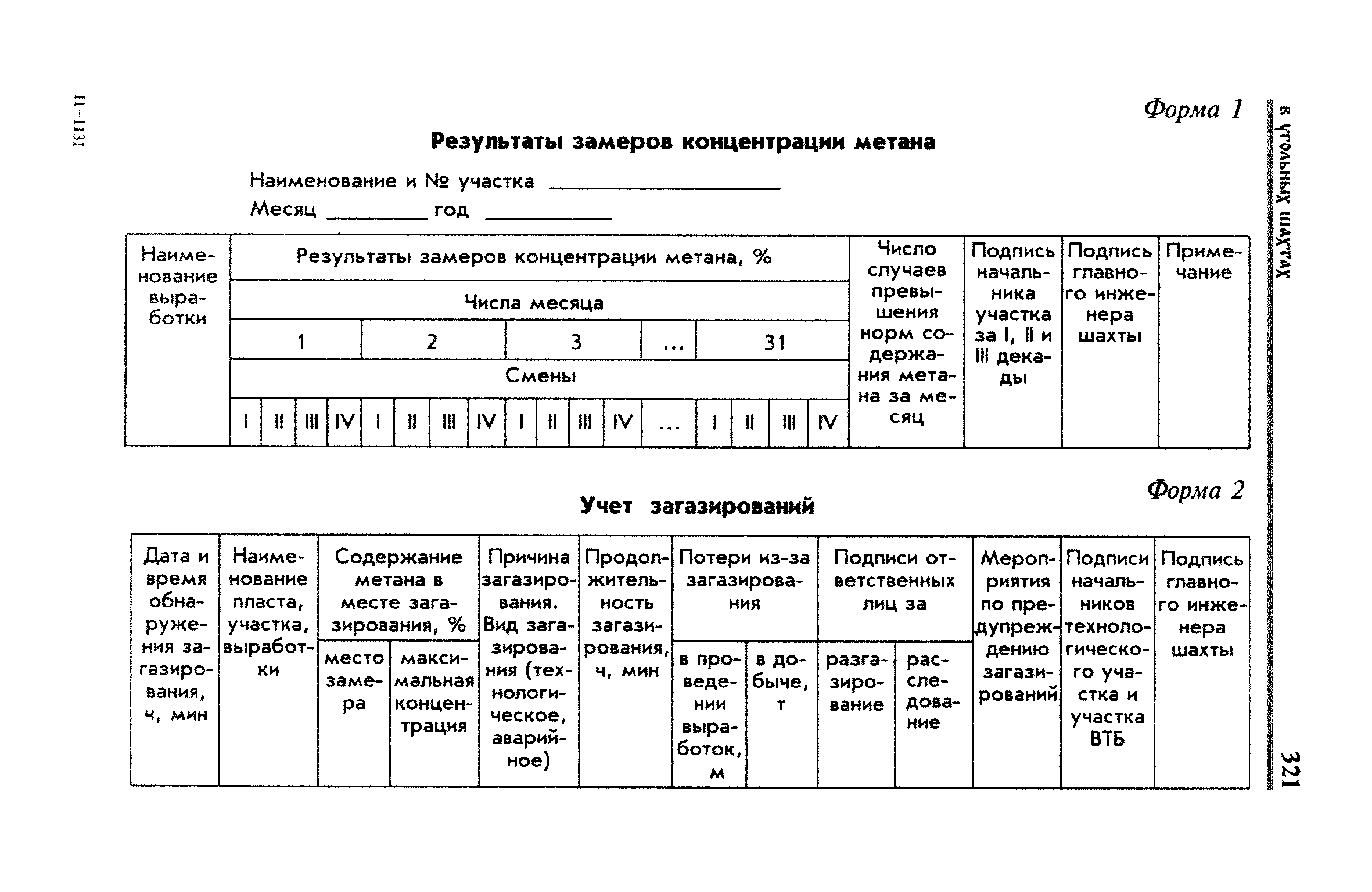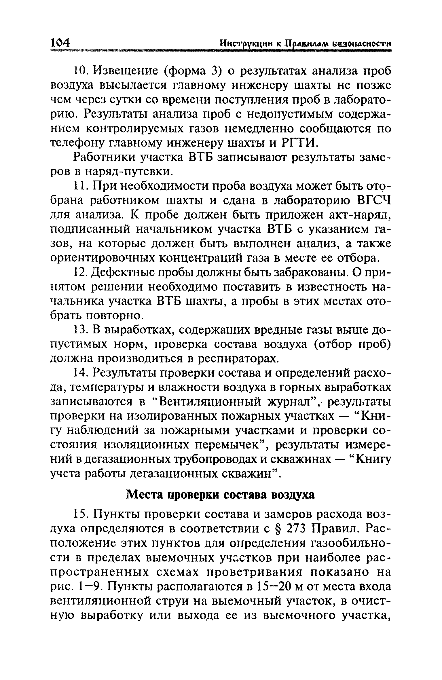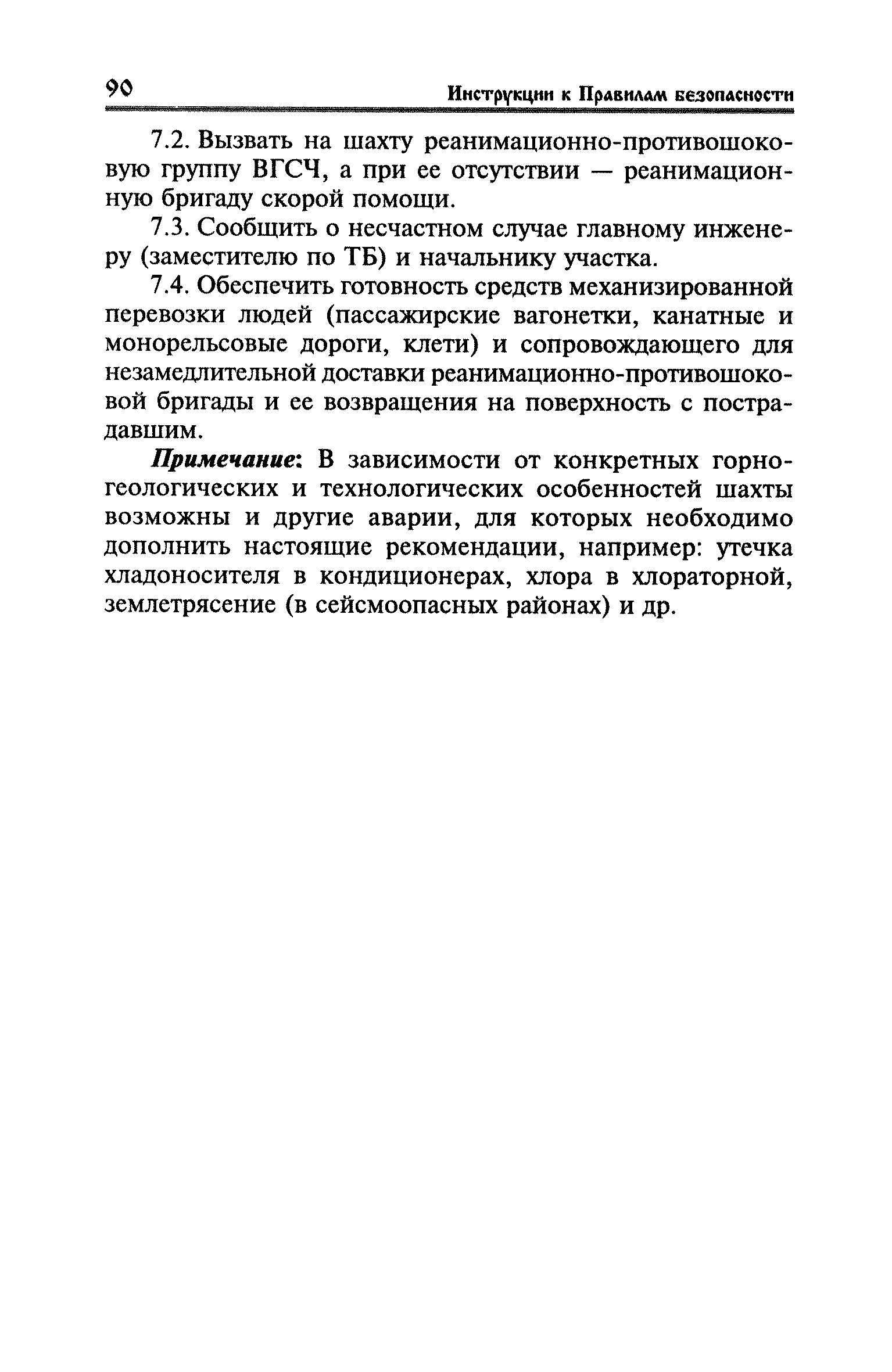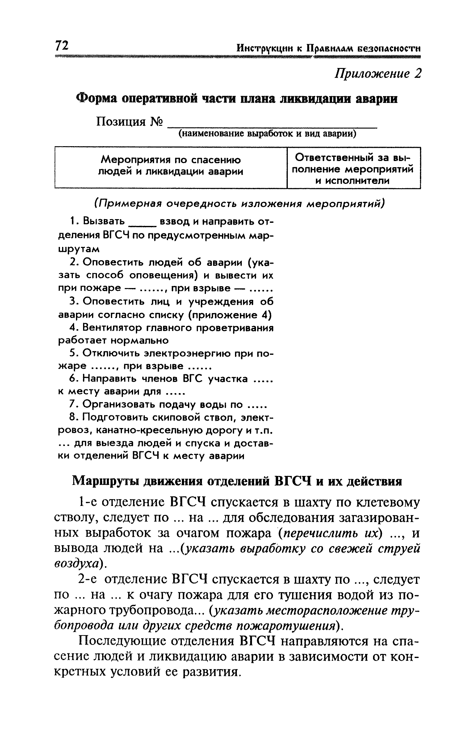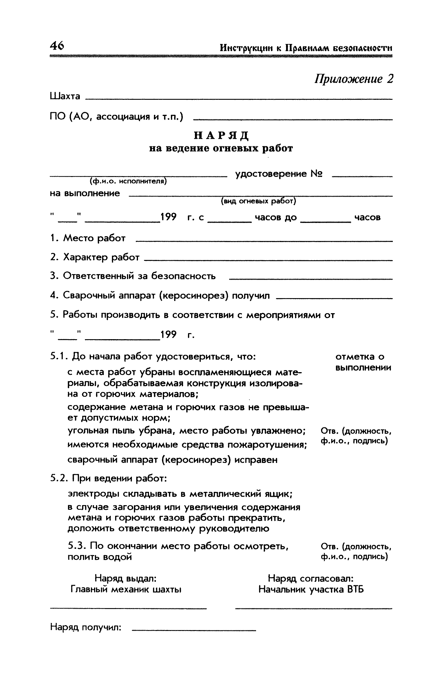 Правила безопасности в угольных шахтах (Инструкции). Книга 2| Статус: | справочные материалы, мп, тпр | | Название рус.: | Правила безопасности в угольных шахтах (Инструкции). Книга 2 | | Дата добавления в базу: | 01.02.2020 | | Дата актуализации: | 01.01.2021 | | Область применения: | В книгу 2 "Правил безопасности в угольных шахтах" включены Инструкции, определяющие вопросы безопасности при ведении горных работ, а также порядок выполнения ряда требований "Правил безопасности в угольных шахтах" (по составлению паспортов выемочных участков, проведению и креплению горных выработок; по ведению огневых работ в подземных выработках и надшахтных зданиях; по обеспечению безопасности при эксплуатации электромеханического оборудования, соблюдению пылегазового режима; противопожарной защите и др.). Приведены формы книг и журналов, ведение которых предусмотрено "Правилами безопасности в угольных шахтах". Все инструкции являются неотъемлемой частью "Правил безопасности в угольных шахтах» и на них полностью распространяются положения, изложенные в главе IХ "Правил безопасности в угольных шахтах" - "Ответственность за нарушение правил безопасности". | | Оглавление: | Инструкция по составлению паспортов выемочного участка проведения и крепления подземных выработок (к § 11, 113) Инструкция по безопасному производству работ в подземных электроустановках (к § 450, 541 - 543) Инструкция по ведению огневых работ в подземных выработках и надшахтных зданиях (к § 57, 533, 570) Инструкция по обучению работников шахт (к § 45, 49, 51) Инструкция по составлению планов ликвидации аварий (к § 16) Инструкция по контролю состава рудничного воздуха, определению газообильности и установлению категорий шахт по метану (к § 204, 273, 275, 276, 278, 220) Инструкция по безопасному применению холодильных установок (к § 206) Инструкция по реверсированию вснтиляционной струи и проверке действия реверсивных устройств вентиляционных установок (к § 222, 223) Инструкция по разгазированию горных выработок, расследованию, учету и предупреждению загазирований (к § 238) Инструкция по составлению вентиляционных планов (к § 272) Инструкция по электроснабжению и применению электрооборудования на шахтах, опасных по внезапным выбросам, разрабатывающих крутые пласты (к § 454) Инструкция по электроснабжению и применению электрооборудования в проветриваемых ВМП тупиковых выработок шахт, опасных по газу(к § 456) Инструкции по применению электрооборудования в рудничном нормальном исполнении и электрооборудования общего назначения в шахтах, опасных по газу и пыли (к § 463) Инструкция по выбору и проверке электрических аппаратов напряжением выше 1200 В (к § 497) Инструкция по определению токов короткого замыкания, выбору и проверке уставок максимальной токовой защиты в сетях напряжением до 1200 В (к § 499) Инструкция по устройству, осмотру и измерению сопротивления шахтных заземлений (к § 522, 550) Инструкция по осмотру и ревизии рудничного взрывобезопасного электрооборудования (к § 542) Инструкция по проверке максимальной токовой защиты шахтных аппаратов (к § 545) Инструкция по противопожарной защите угольных шахт (к § 553) Инструкция по предупреждению самовозгорания, тушению и разборке породных отвалов (к § 666) Книга осмотра стволов шахт (к § 182) Книга осмотра вентиляционных установок и проверки реверсирования (к § 223, 224) Книга учета работы вентиляцион