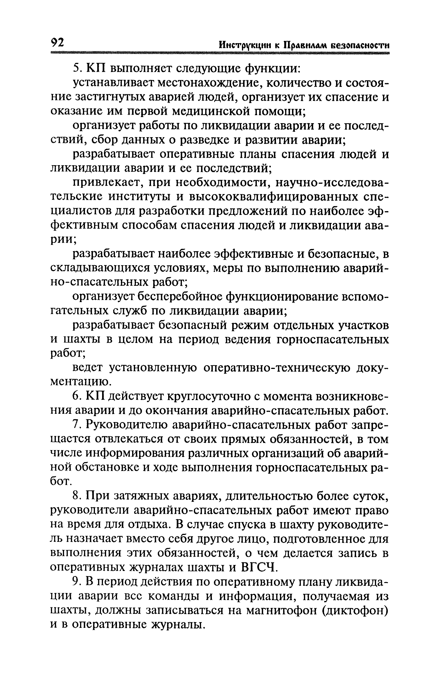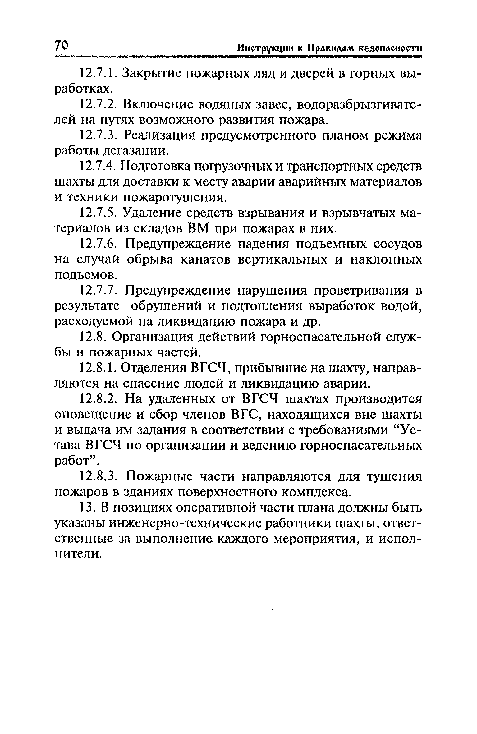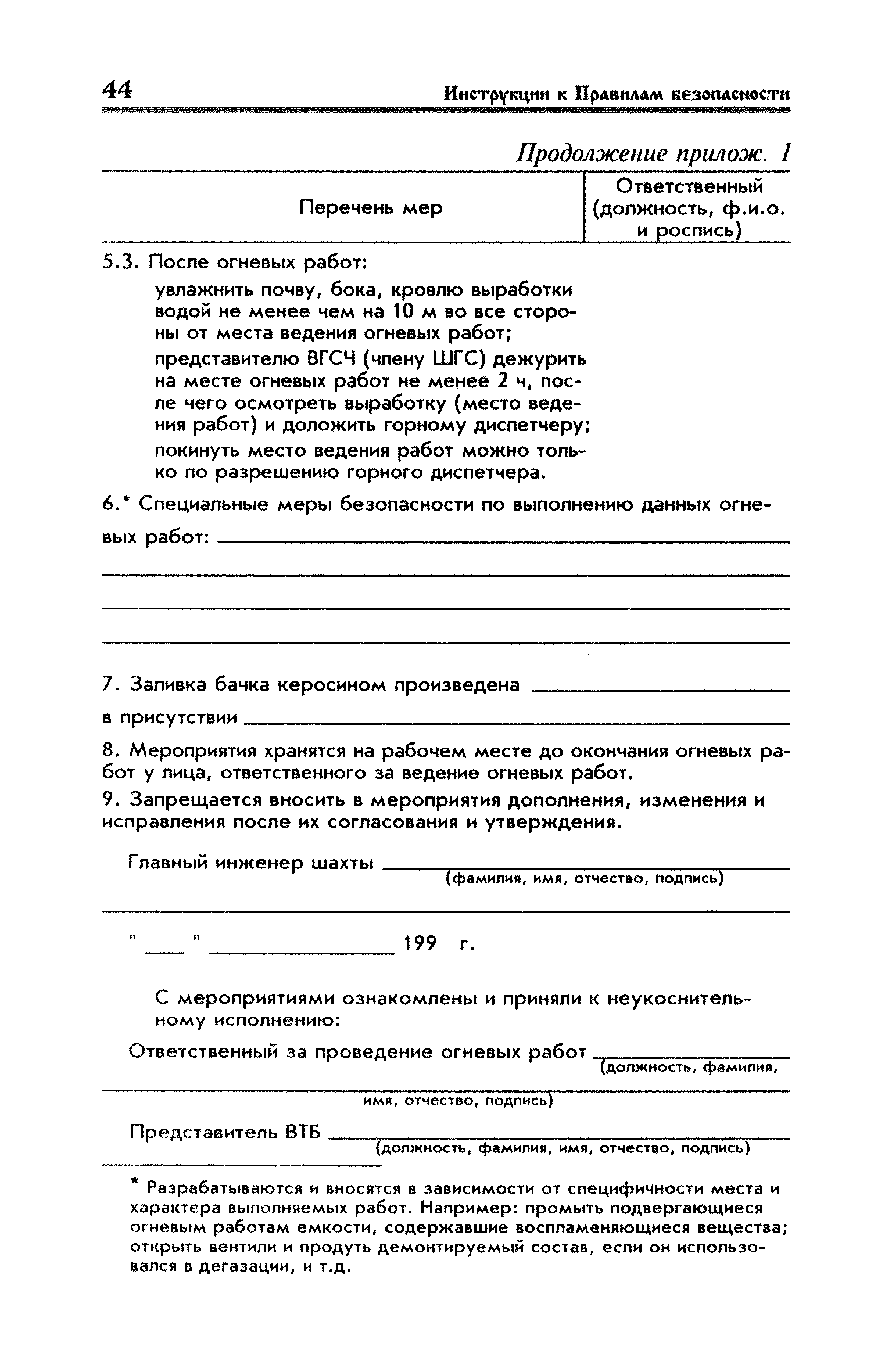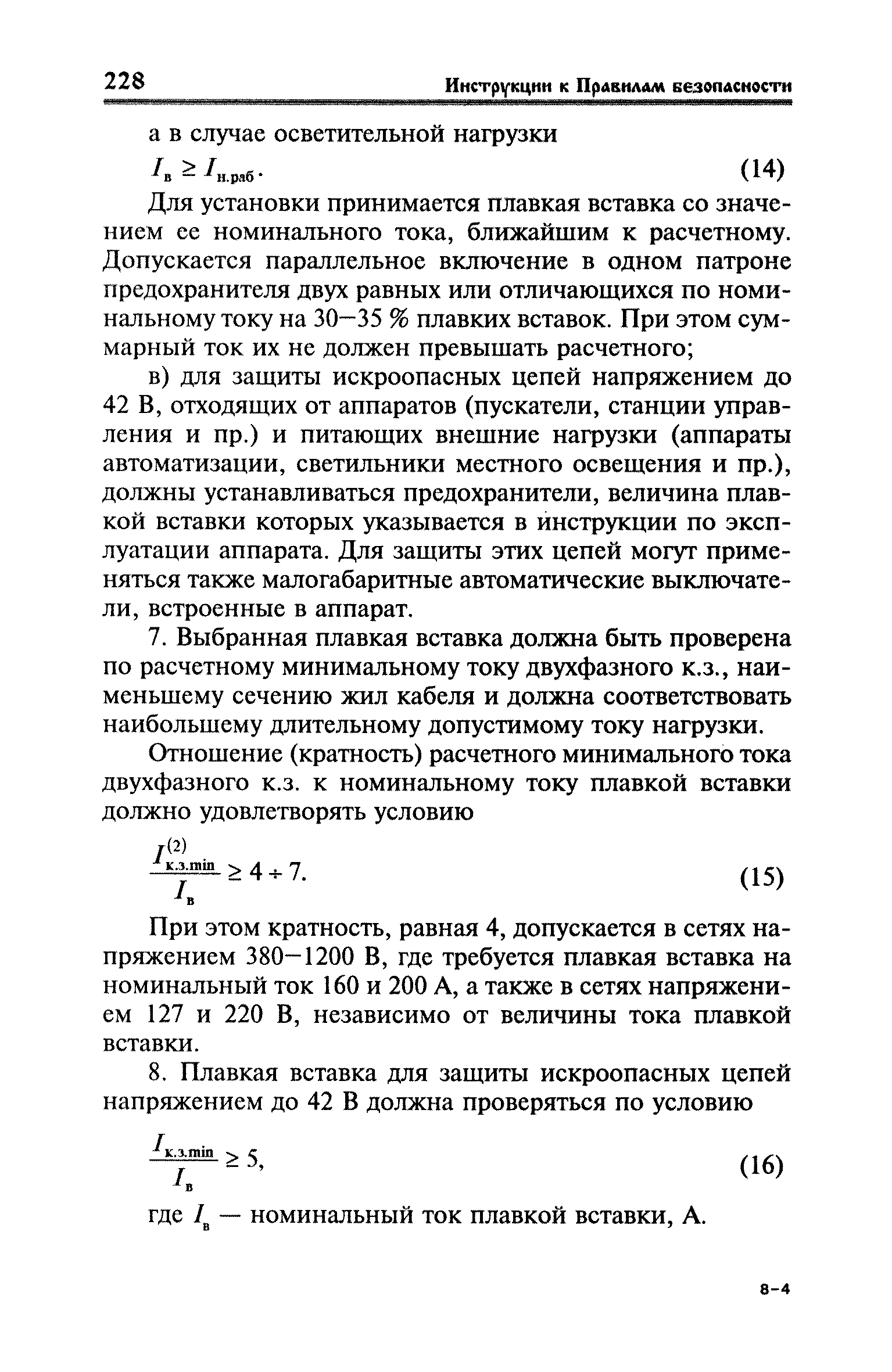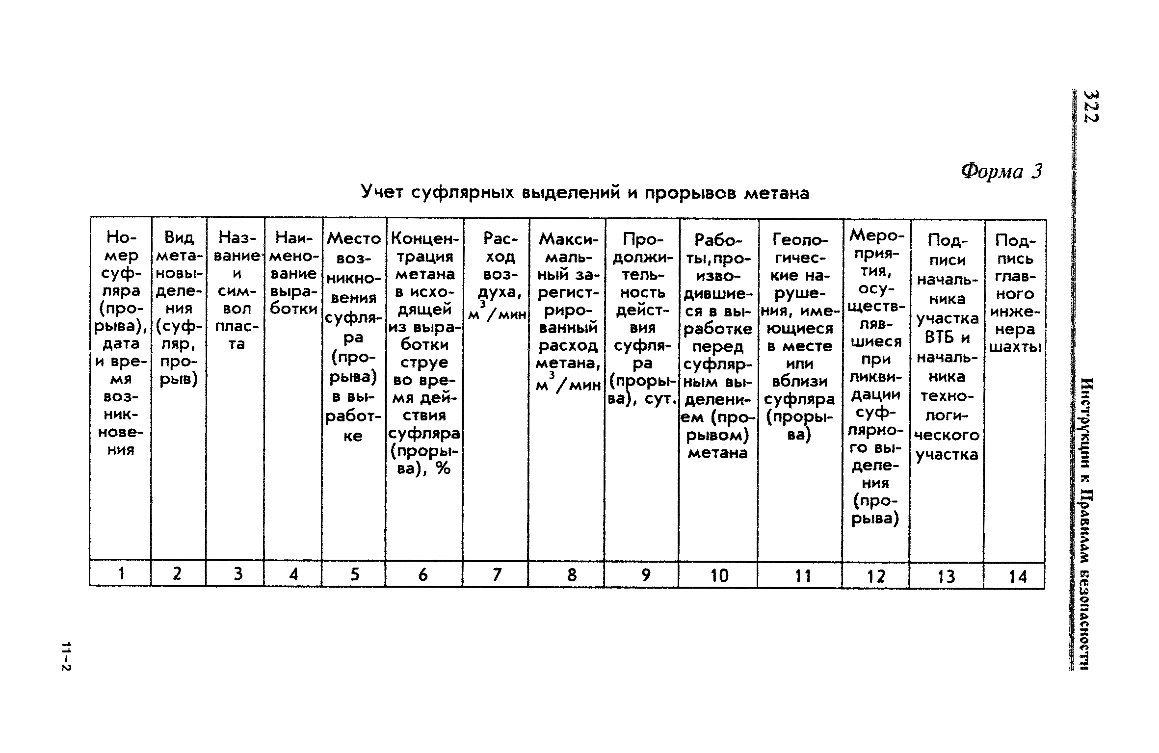 Правила безопасности в угольных шахтах (Инструкции). Книга 2| Статус: | справочные материалы, мп, тпр | | Название рус.: | Правила безопасности в угольных шахтах (Инструкции). Книга 2 | | Дата добавления в базу: | 01.02.2020 | | Дата актуализации: | 01.01.2021 | | Область применения: | В книгу 2 "Правил безопасности в угольных шахтах" включены Инструкции, определяющие вопросы безопасности при ведении горных работ, а также порядок выполнения ряда требований "Правил безопасности в угольных шахтах" (по составлению паспортов выемочных участков, проведению и креплению горных выработок; по ведению огневых работ в подземных выработках и надшахтных зданиях; по обеспечению безопасности при эксплуатации электромеханического оборудования, соблюдению пылегазового режима; противопожарной защите и др.). Приведены формы книг и журналов, ведение которых предусмотрено "Правилами безопасности в угольных шахтах". Все инструкции являются неотъемлемой частью "Правил безопасности в угольных шахтах» и на них полностью распространяются положения, изложенные в главе IХ "Правил безопасности в угольных шахтах" - "Ответственность за нарушение правил безопасности". | | Оглавление: | Инструкция по составлению паспортов выемочного участка проведения и крепления подземных выработок (к § 11, 113) Инструкция по безопасному производству работ в подземных электроустановках (к § 450, 541 - 543) Инструкция по ведению огневых работ в подземных выработках и надшахтных зданиях (к § 57, 533, 570) Инструкция по обучению работников шахт (к § 45, 49, 51) Инструкция по составлению планов ликвидации аварий (к § 16) Инструкция по контролю состава рудничного воздуха, определению газообильности и установлению категорий шахт по метану (к § 204, 273, 275, 276, 278, 220) Инструкция по безопасному применению холодильных установок (к § 206) Инструкция по реверсированию вснтиляционной струи и проверке действия реверсивных устройств вентиляционных установок (к § 222, 223) Инструкция по разгазированию горных выработок, расследованию, учету и предупреждению загазирований (к § 238) Инструкция по составлению вентиляционных планов (к § 272) Инструкция по электроснабжению и применению электрооборудования на шахтах, опасных по внезапным выбросам, разрабатывающих крутые пласты (к § 454) Инструкция по электроснабжению и применению электрооборудования в проветриваемых ВМП тупиковых выработок шахт, опасных по газу(к § 456) Инструкции по применению электрооборудования в рудничном нормальном исполнении и электрооборудования общего назначения в шахтах, опасных по газу и пыли (к § 463) Инструкция по выбору и проверке электрических аппаратов напряжением выше 1200 В (к § 497) Инструкция по определению токов короткого замыкания, выбору и проверке уставок максимальной токовой защиты в сетях напряжением до 1200 В (к § 499) Инструкция по устройству, осмотру и измерению сопротивления шахтных заземлений (к § 522, 550) Инструкция по осмотру и ревизии рудничного взрывобезопасного электрооборудования (к § 542) Инструкция по проверке максимальной токовой защиты шахтных аппаратов (к § 545) Инструкция по противопожарной защите угольных шахт (к § 553) Инструкция по предупреждению самовозгорания, тушению и разборке породных отвалов (к § 666) Книга осмотра стволов шахт (к § 182) Книга осмотра вентиляционных установок и проверки реверсирования (к § 223, 224) Книга учета работы вентиляцион