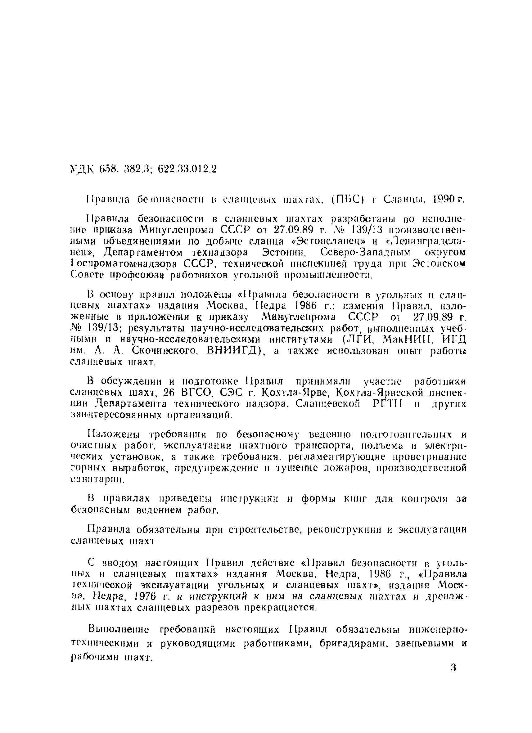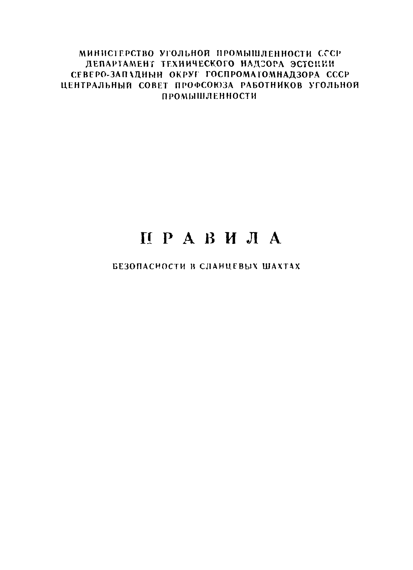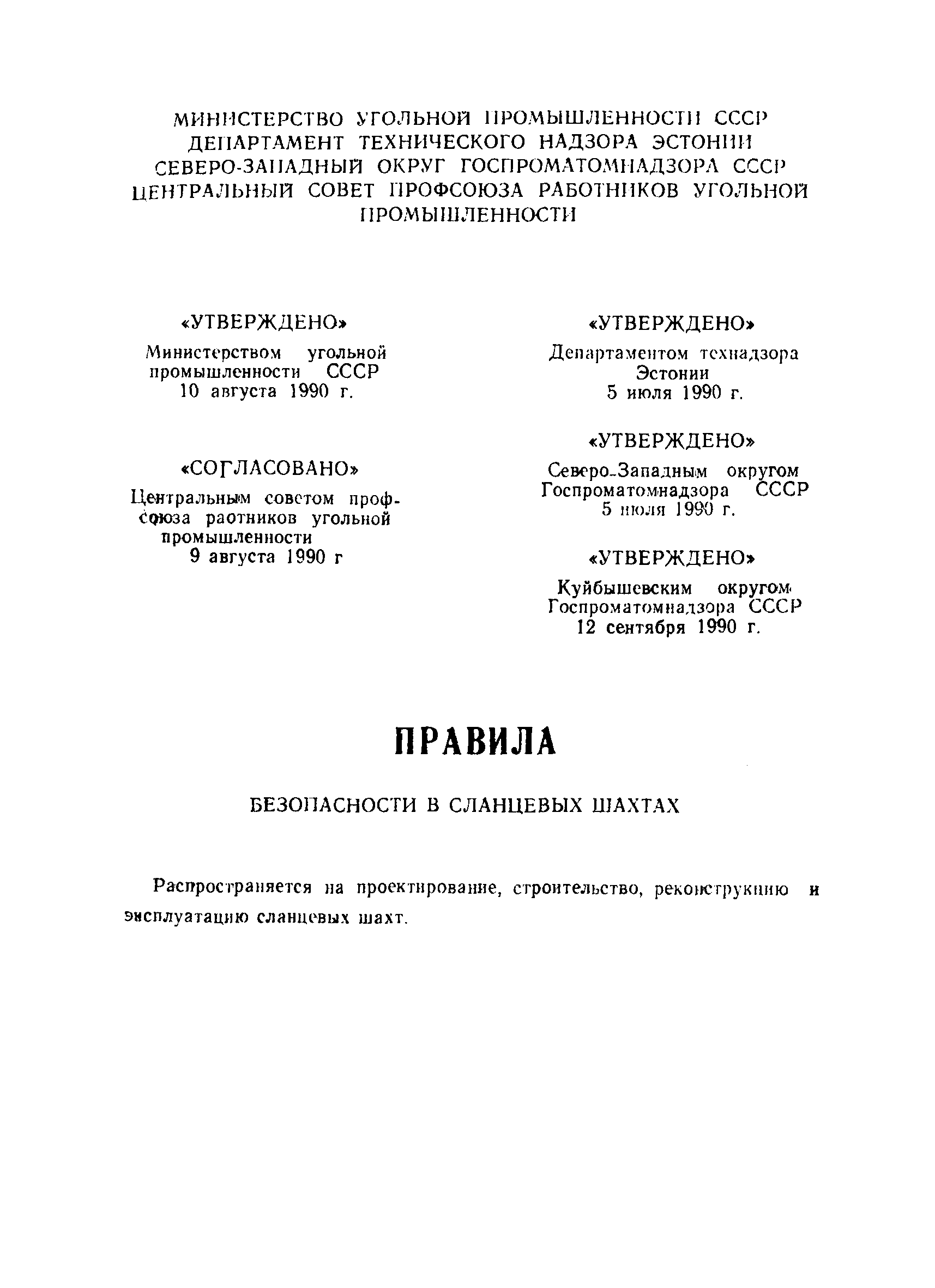 | Утверждён: | 10.08.1990 Министерство угольной промышленности СССР (USSR Ministry of the Coal Industry ) 05.07.1990 Департамент технадзора Эстонии 12.09.1990 Куйбышевский округ Госпроматомнадзора СССР 05.07.1990 Северо-Западный округ Госпроматомнадзора СССР