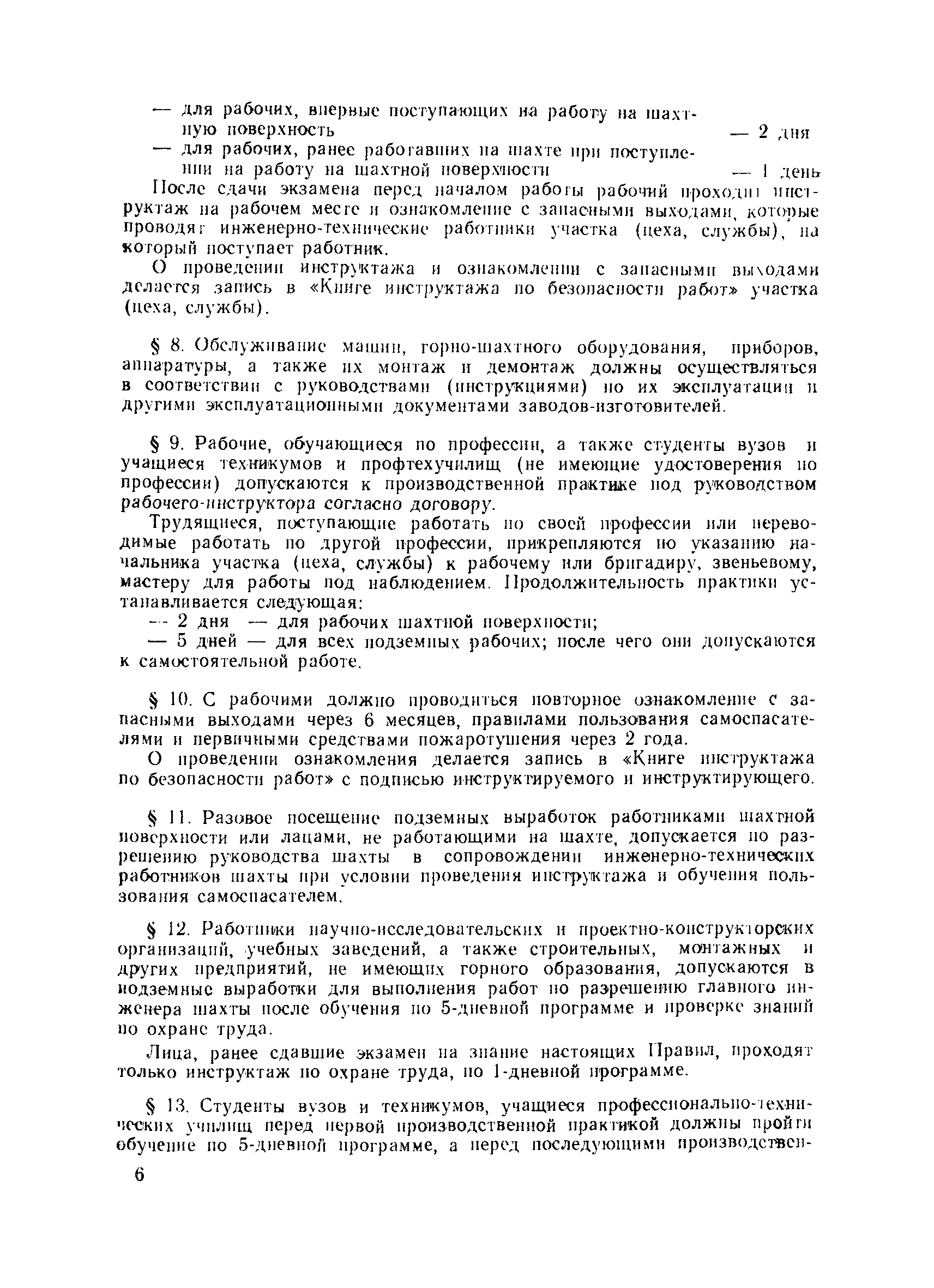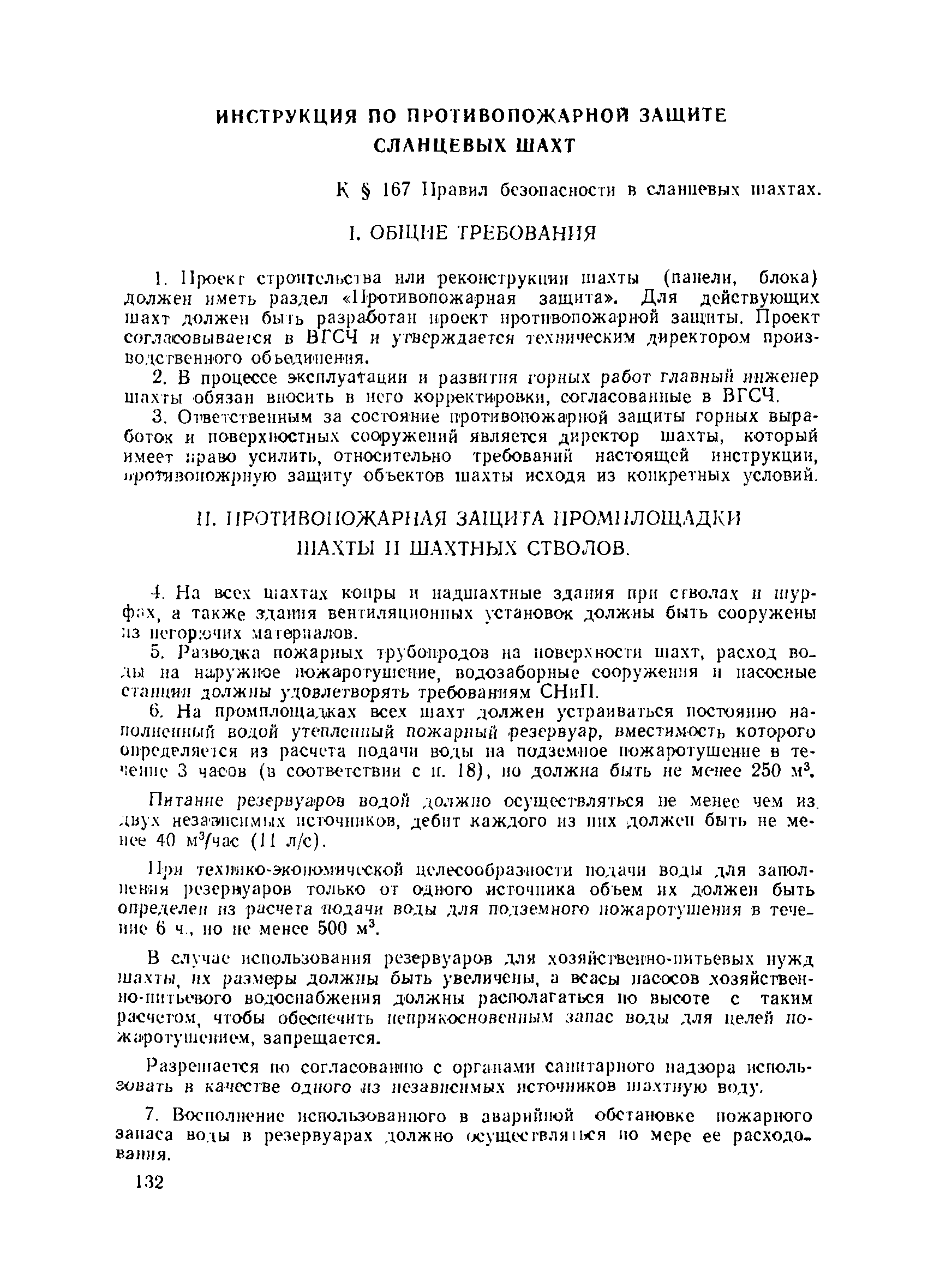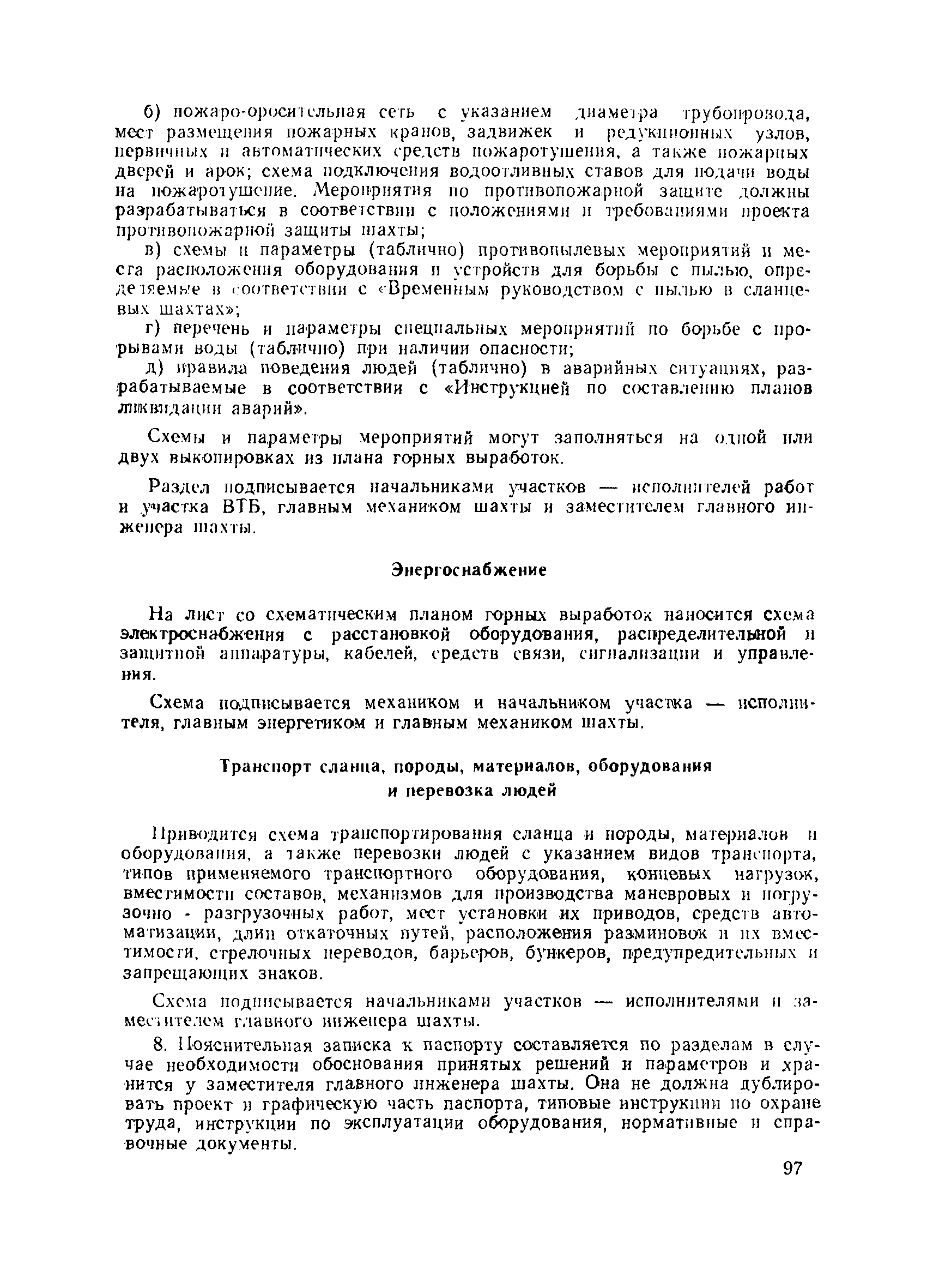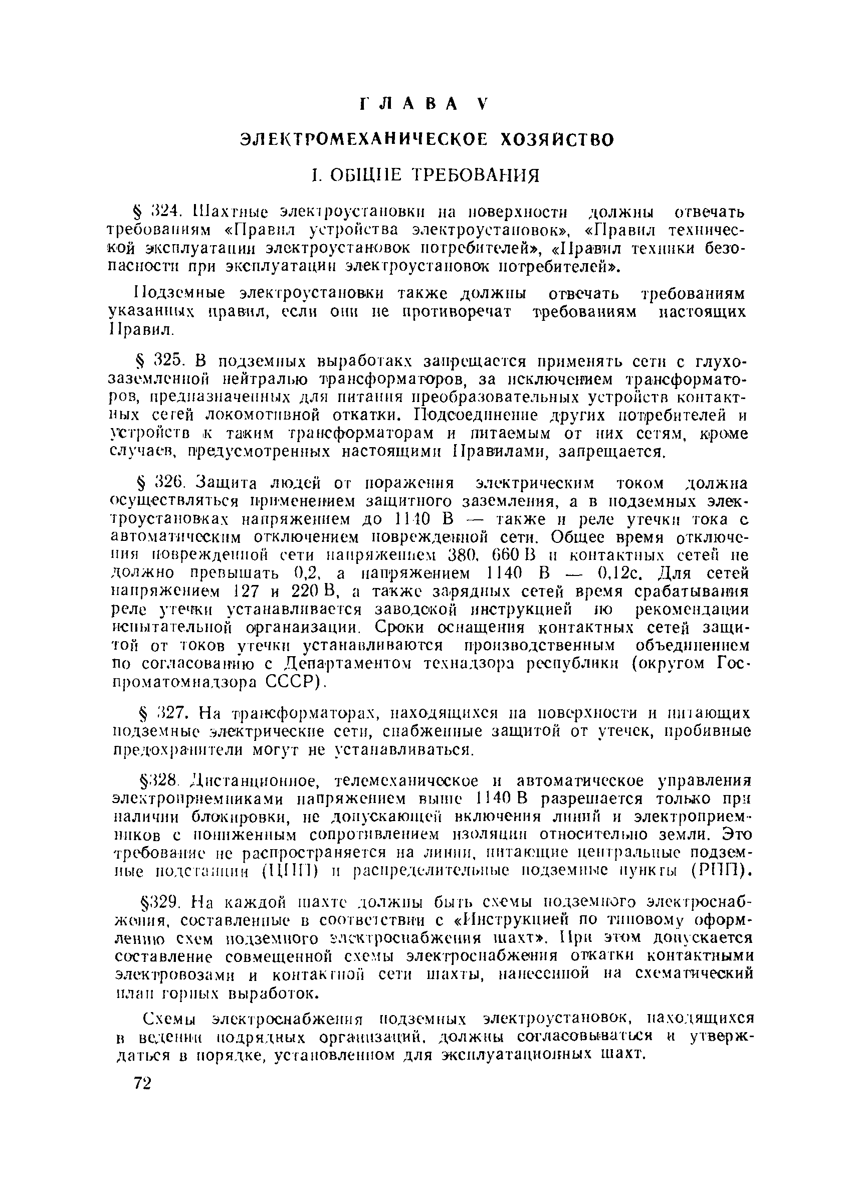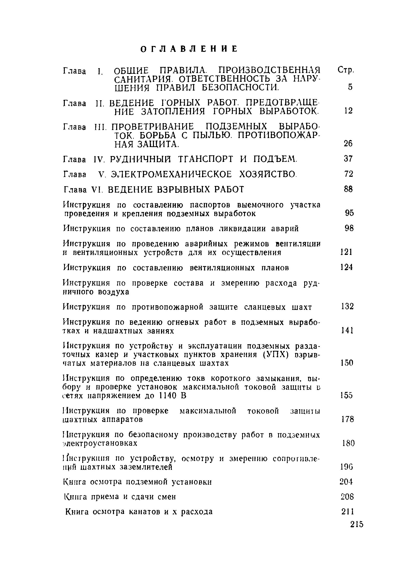 | Оглавление: | Глава I. Общие правила. Производственная санитария. Ответственность за нарушения правил безопасности Глава II. Ведение горных работ. Предотвращение затопления горных выработок Глава III. Проветривание подземных выработок. Борьба с пылью. Противопожарная защита. Глава IV. Рудничный транспорт и подъем. Глава V. Электромеханическое хозяйство. Глава VI. Ведение взрывных работ Инструкция по составлению паспортов выемочного участка проведения и крепления подземных выработок Инструкция по составлению планов ликвидации аварий Инструкция по проведению аварийных режимов вентиляции и вентиляционных устройств для их осуществления Инструкция по составлению вентиляционных планов Инструкция по проверке состава и измерению расхода рудничного воздуха Инструкция по противопожарной защите сланцевых шахт Инструкция по ведению огневых работ в подземных выработках и надшахтных зданиях Инструкция по устройству и эксплуатации подземных раздаточных камер и участковых пунктов хранения (УПХ) взрывчатых материалов на сланцевых шахтах Инструкция по определению тока короткого замыкания, выбору я проверке установок максимальной токовой защиты в сетях напряжением до 1140 В инструкция но проверке максимальной токовой защиты шахтных аппаратов Инструкция по безопасному производству работ в подземных электроустановках Инструкция по устройству, осмотру и измерению сопротивлений шахтных заземлителей Книга осмотра подземной установки Книга приема и сдачи смен Книга осмотра канатов и их расхода |