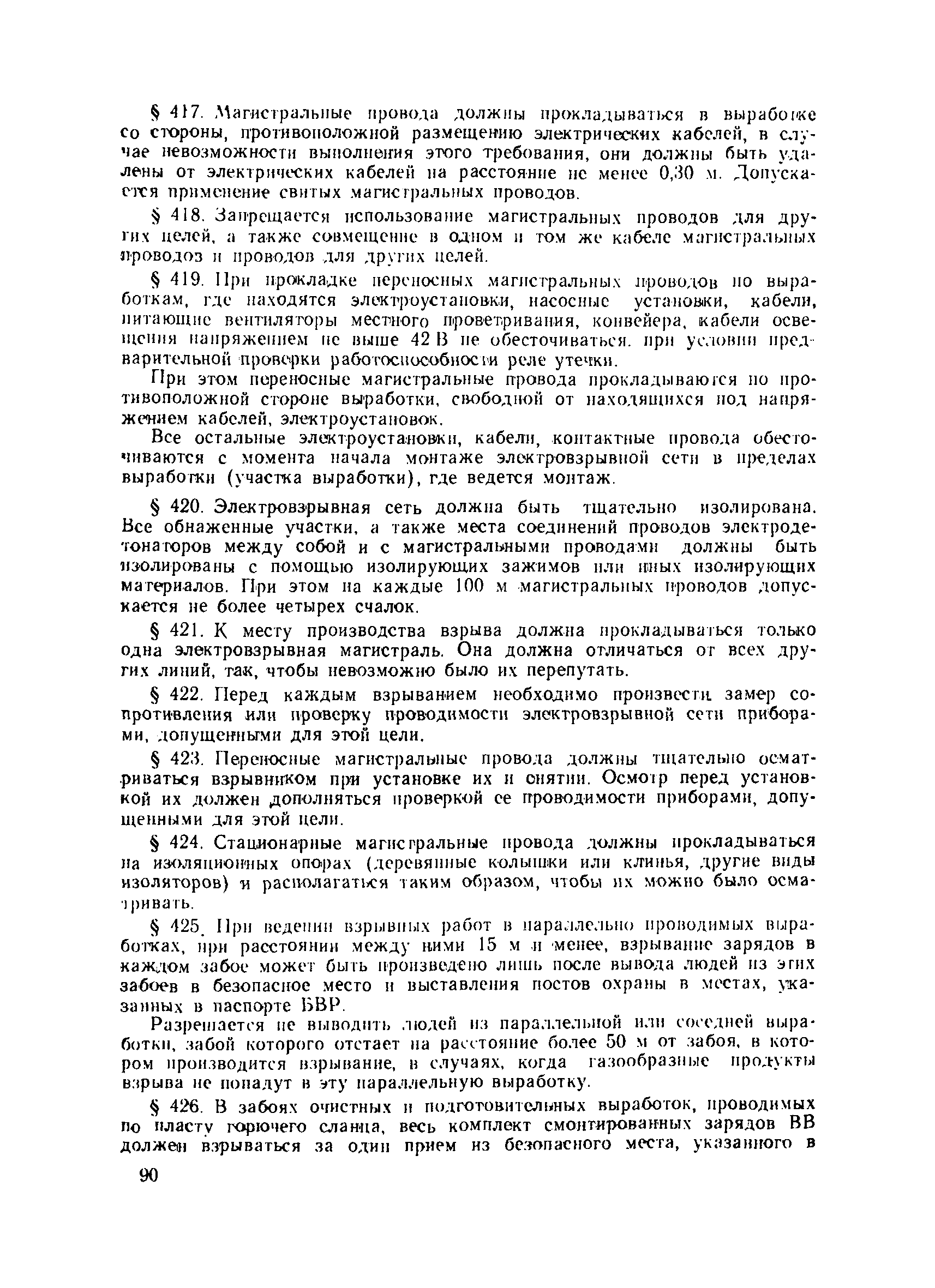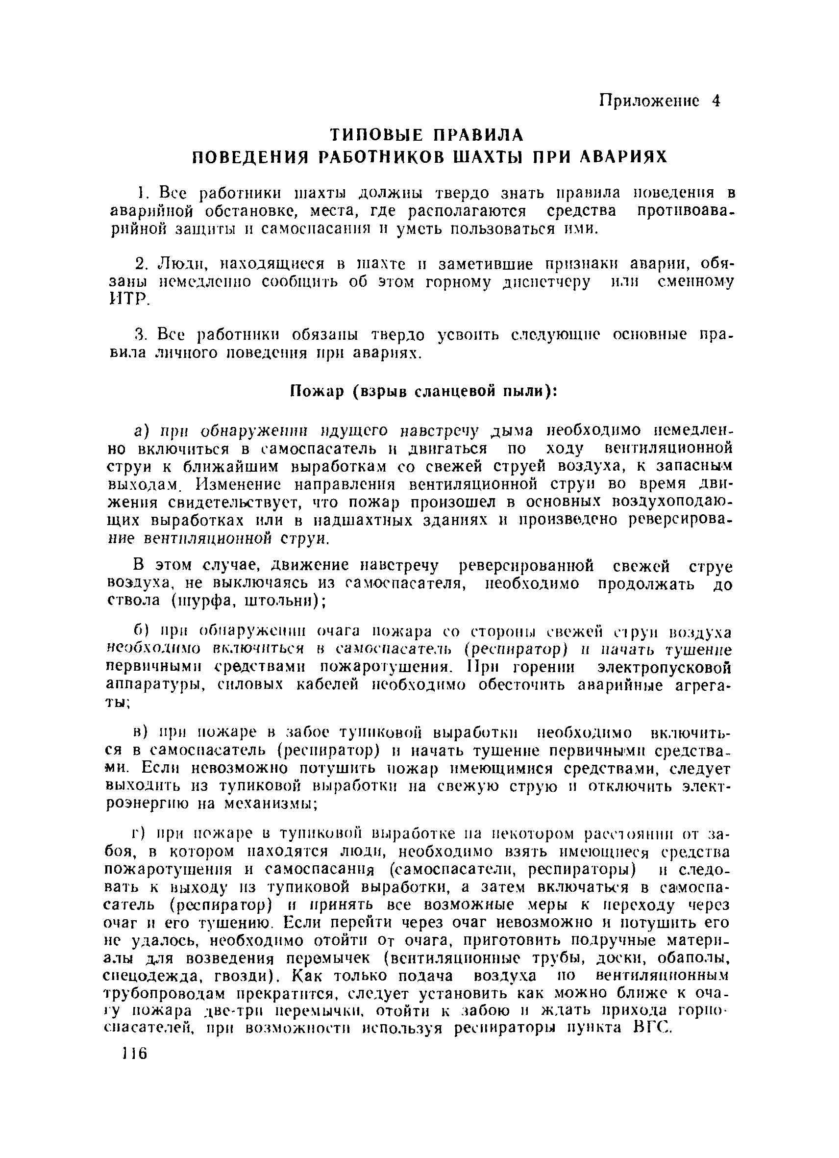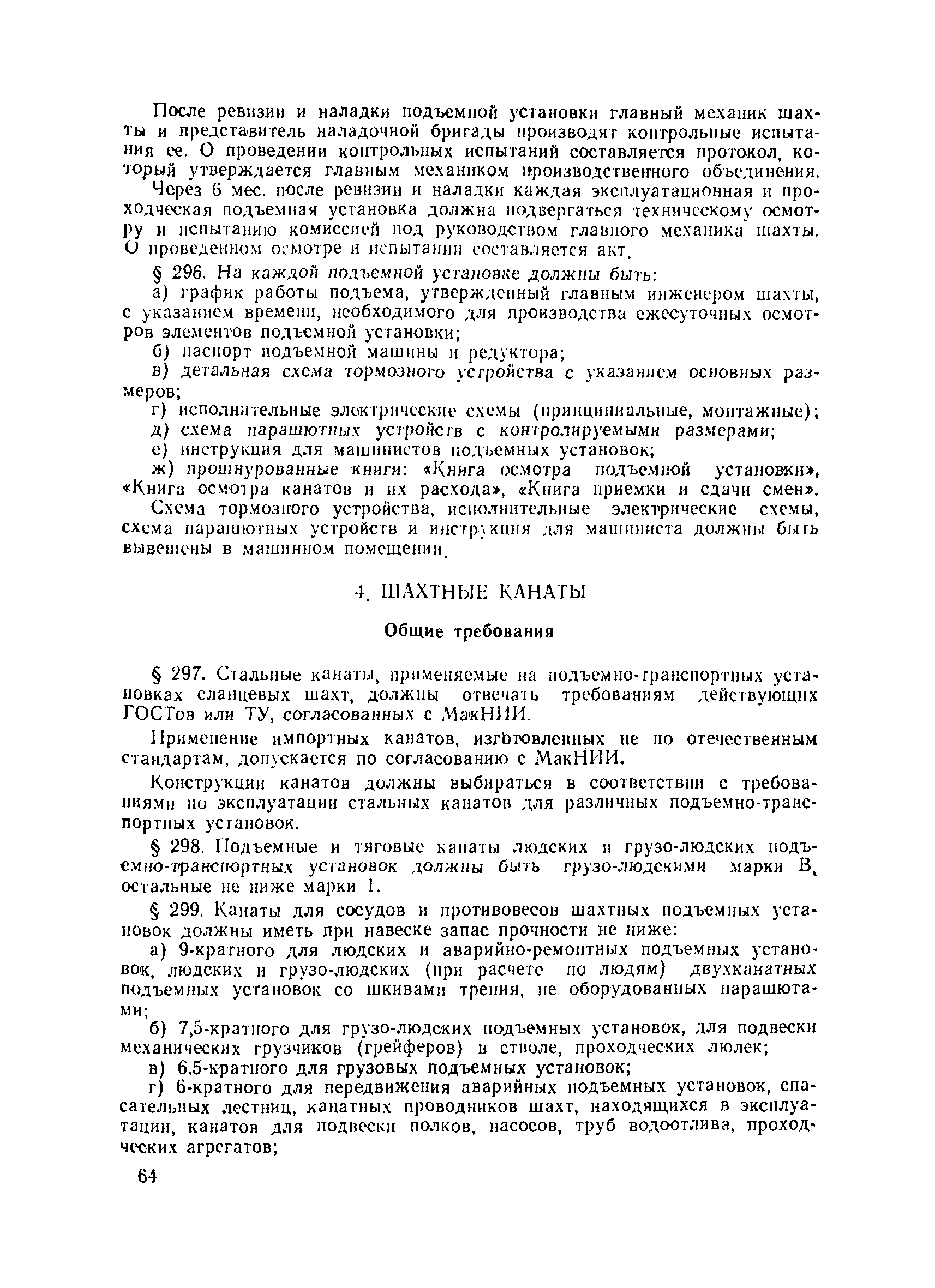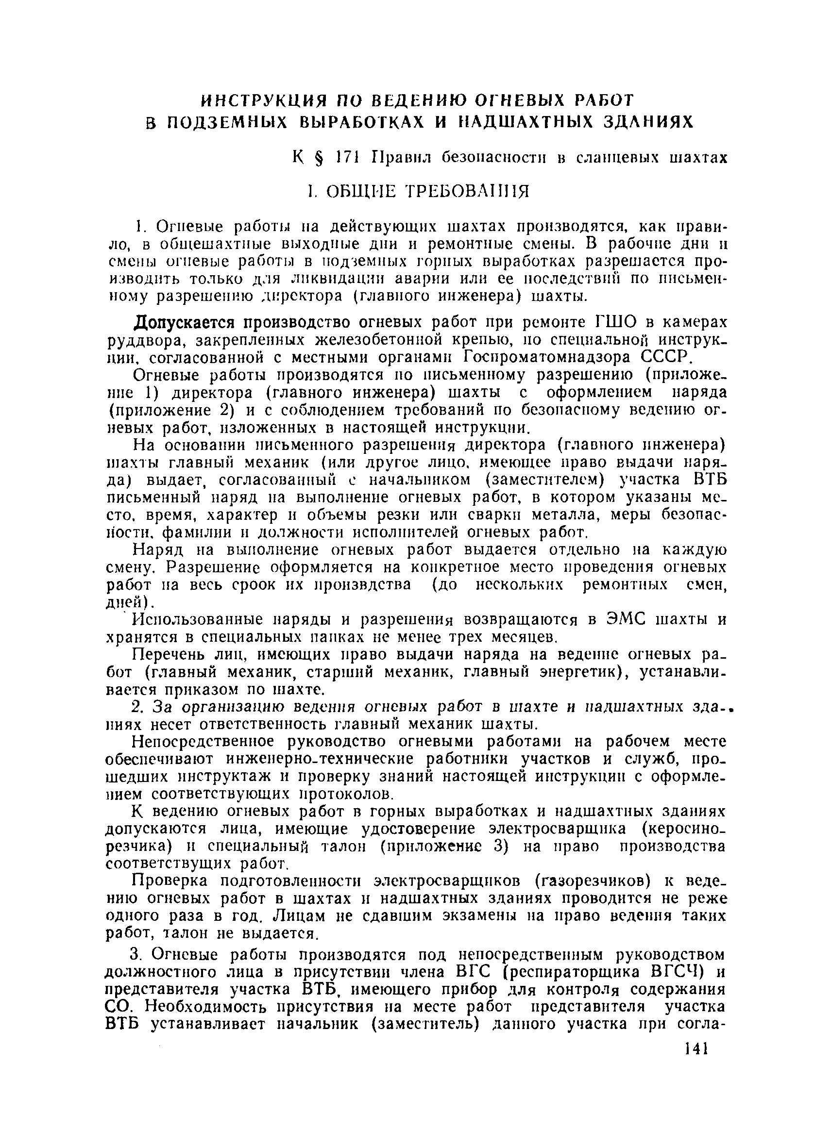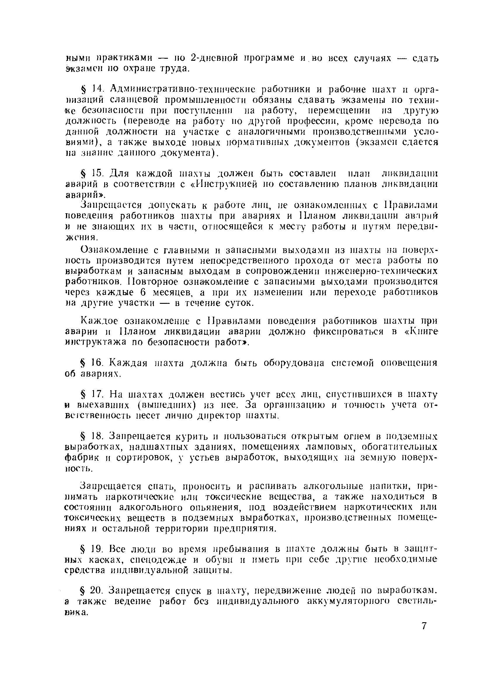| Оглавление: | Глава I. Общие правила. Производственная санитария. Ответственность за нарушения правил безопасности Глава II. Ведение горных работ. Предотвращение затопления горных выработок Глава III. Проветривание подземных выработок. Борьба с пылью. Противопожарная защита. Глава IV. Рудничный транспорт и подъем. Глава V. Электромеханическое хозяйство. Глава VI. Ведение взрывных работ Инструкция по составлению паспортов выемочного участка проведения и крепления подземных выработок Инструкция по составлению планов ликвидации аварий Инструкция по проведению аварийных режимов вентиляции и вентиляционных устройств для их осуществления Инструкция по составлению вентиляционных планов Инструкция по проверке состава и измерению расхода рудничного воздуха Инструкция по противопожарной защите сланцевых шахт Инструкция по ведению огневых работ в подземных выработках и надшахтных зданиях Инструкция по устройству и эксплуатации подземных раздаточных камер и участковых пунктов хранения (УПХ) взрывчатых материалов на сланцевых шахтах Инструкция по определению тока короткого замыкания, выбору я проверке установок максимальной токовой защиты в сетях напряжением до 1140 В инструкция но проверке максимальной токовой защиты шахтных аппаратов Инструкция по безопасному производству работ в подземных электроустановках Инструкция по устройству, осмотру и измерению сопротивлений шахтных заземлителей Книга осмотра подземной установки Книга приема и сдачи смен Книга осмотра канатов и их расхода |