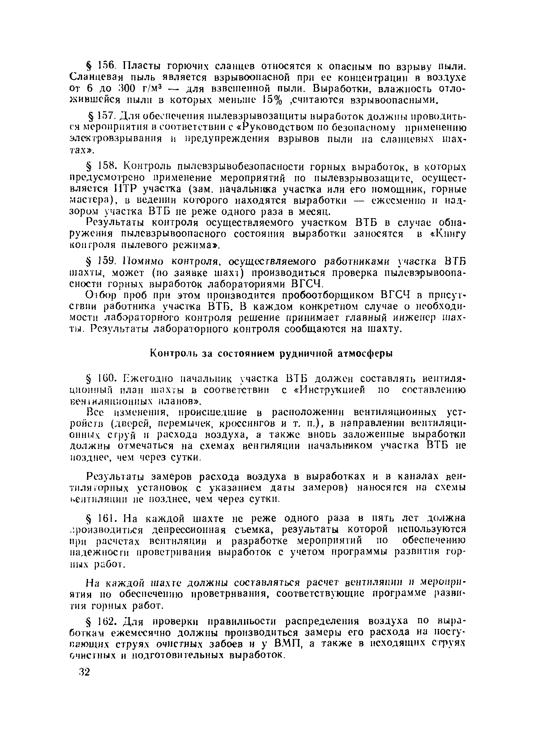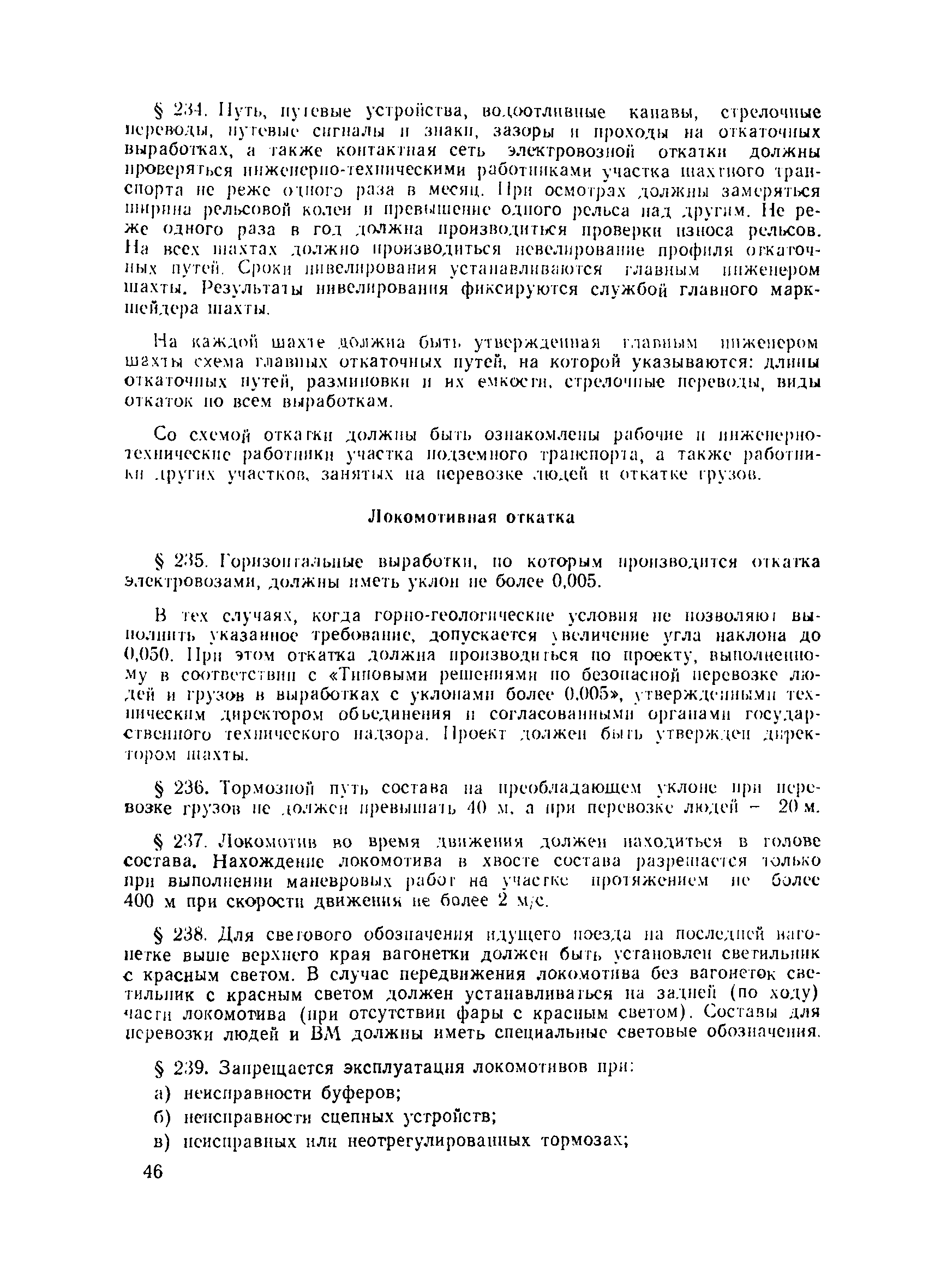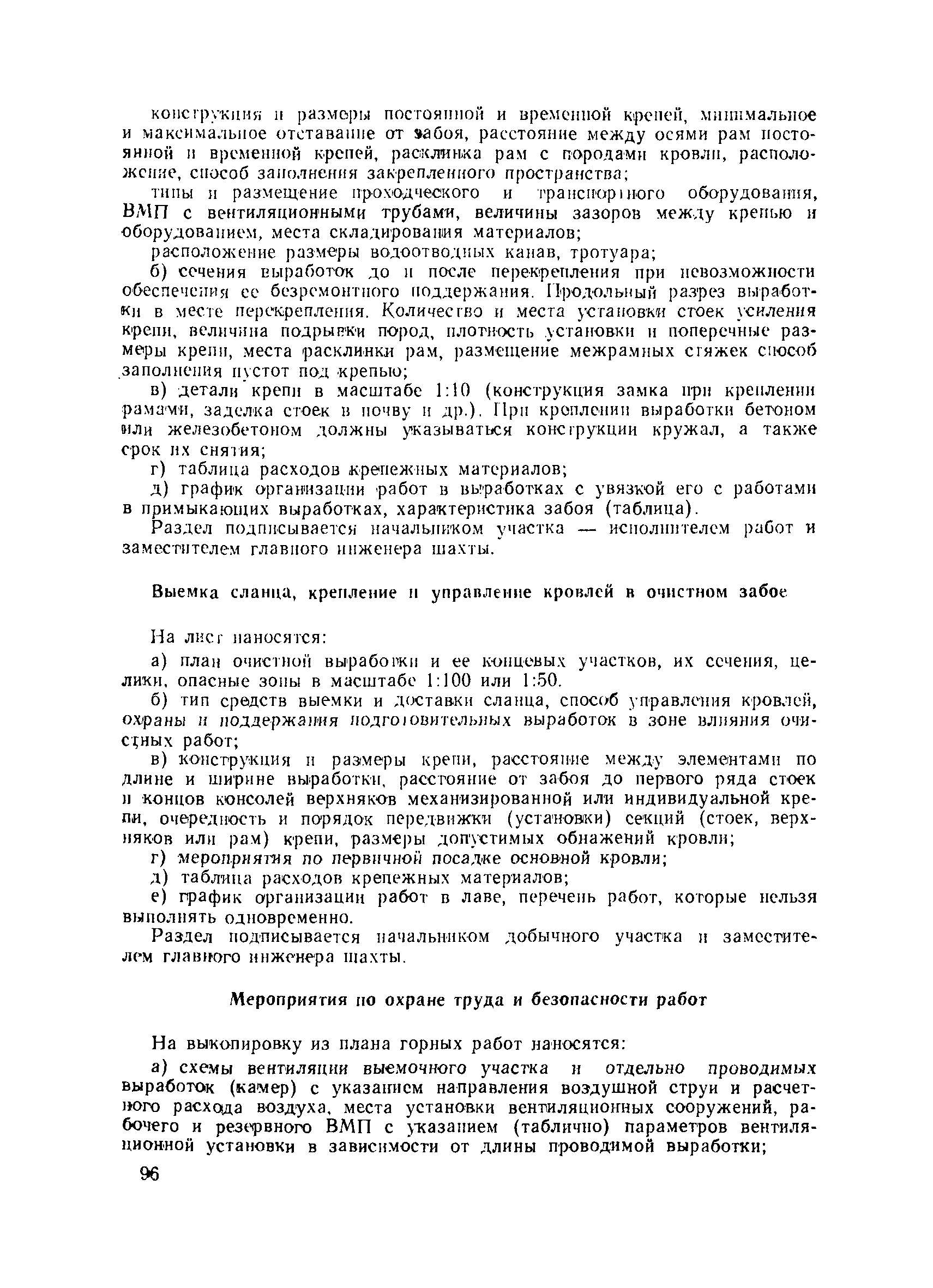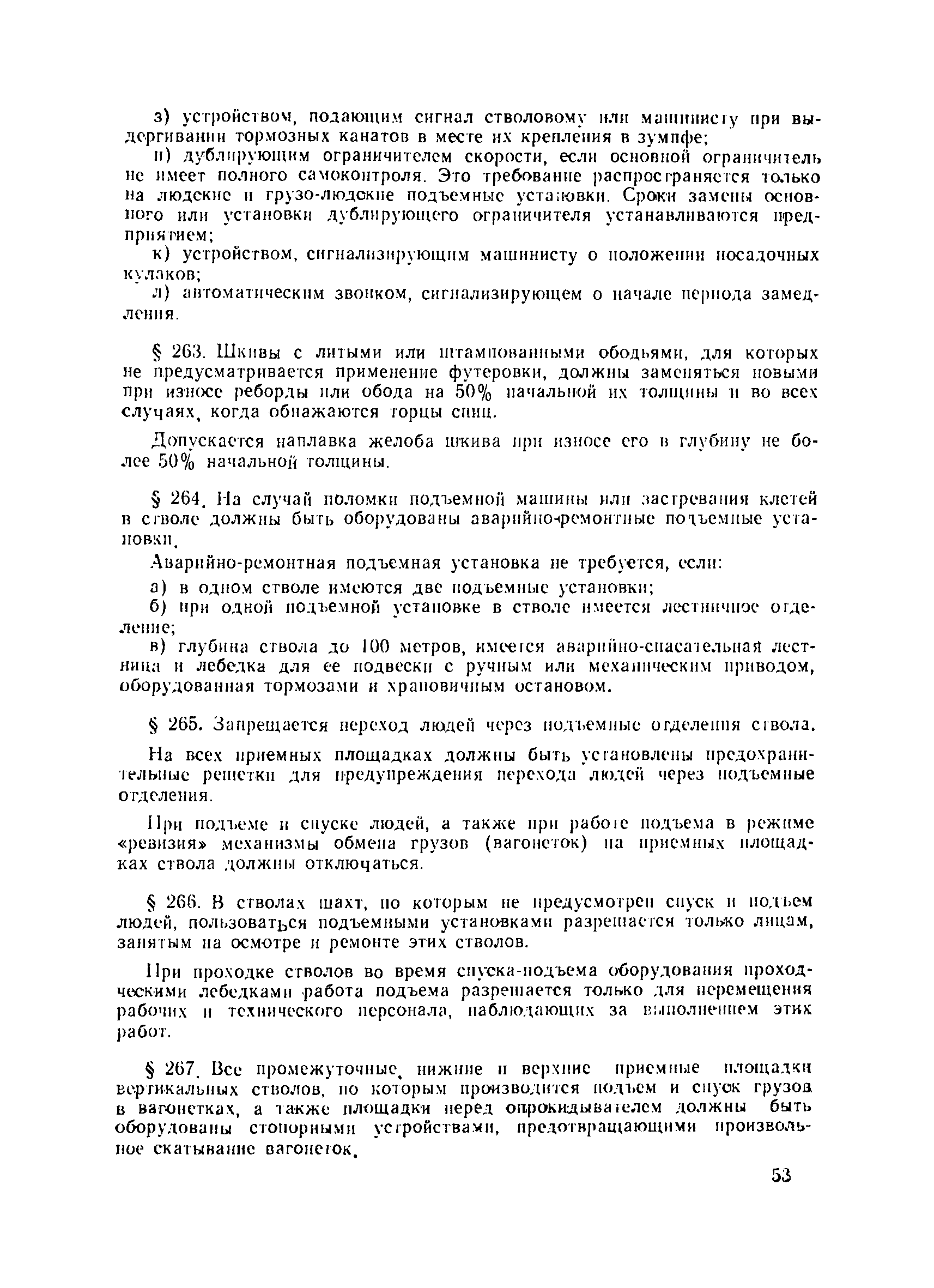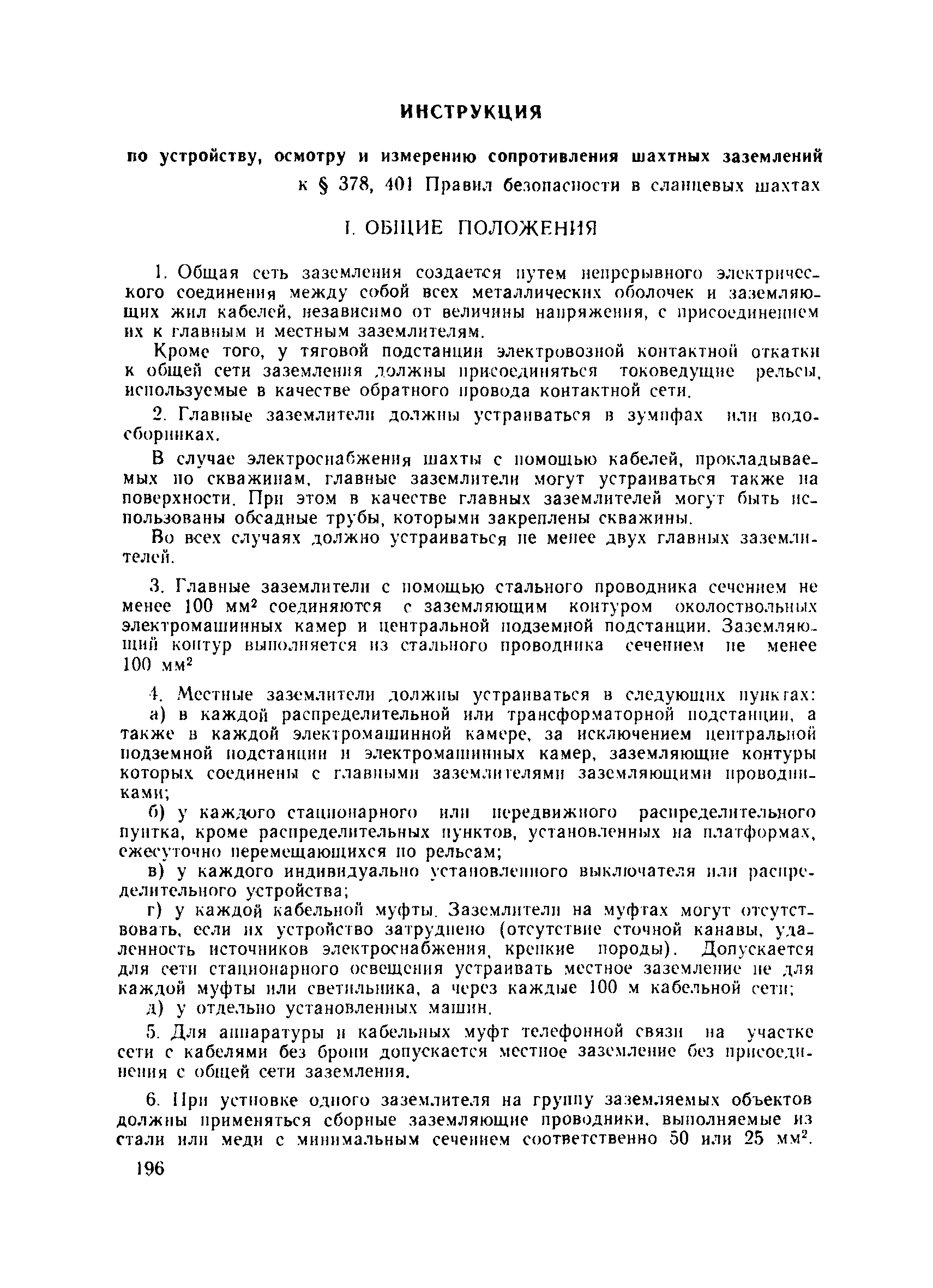 | Оглавление: | Глава I. Общие правила. Производственная санитария. Ответственность за нарушения правил безопасности Глава II. Ведение горных работ. Предотвращение затопления горных выработок Глава III. Проветривание подземных выработок. Борьба с пылью. Противопожарная защита. Глава IV. Рудничный транспорт и подъем. Глава V. Электромеханическое хозяйство. Глава VI. Ведение взрывных работ Инструкция по составлению паспортов выемочного участка проведения и крепления подземных выработок Инструкция по составлению планов ликвидации аварий Инструкция по проведению аварийных режимов вентиляции и вентиляционных устройств для их осуществления Инструкция по составлению вентиляционных планов Инструкция по проверке состава и измерению расхода рудничного воздуха Инструкция по противопожарной защите сланцевых шахт Инструкция по ведению огневых работ в подземных выработках и надшахтных зданиях Инструкция по устройству и эксплуатации подземных раздаточных камер и участковых пунктов хранения (УПХ) взрывчатых материалов на сланцевых шахтах Инструкция по определению тока короткого замыкания, выбору я проверке установок максимальной токовой защиты в сетях напряжением до 1140 В инструкция но проверке максимальной токовой защиты шахтных аппаратов Инструкция по безопасному производству работ в подземных электроустановках Инструкция по устройству, осмотру и измерению сопротивлений шахтных заземлителей Книга осмотра подземной установки Книга приема и сдачи смен Книга осмотра канатов и их расхода |
