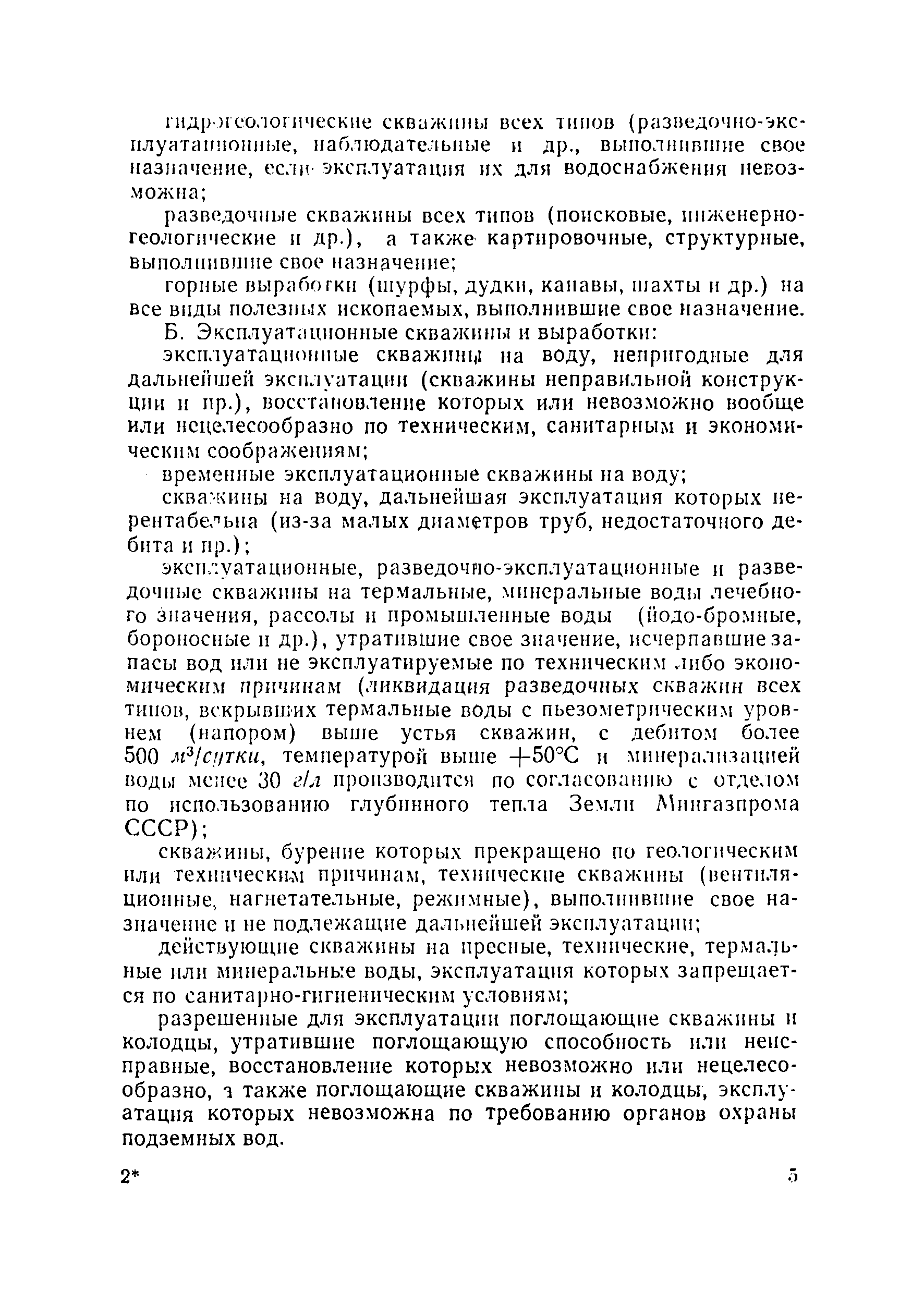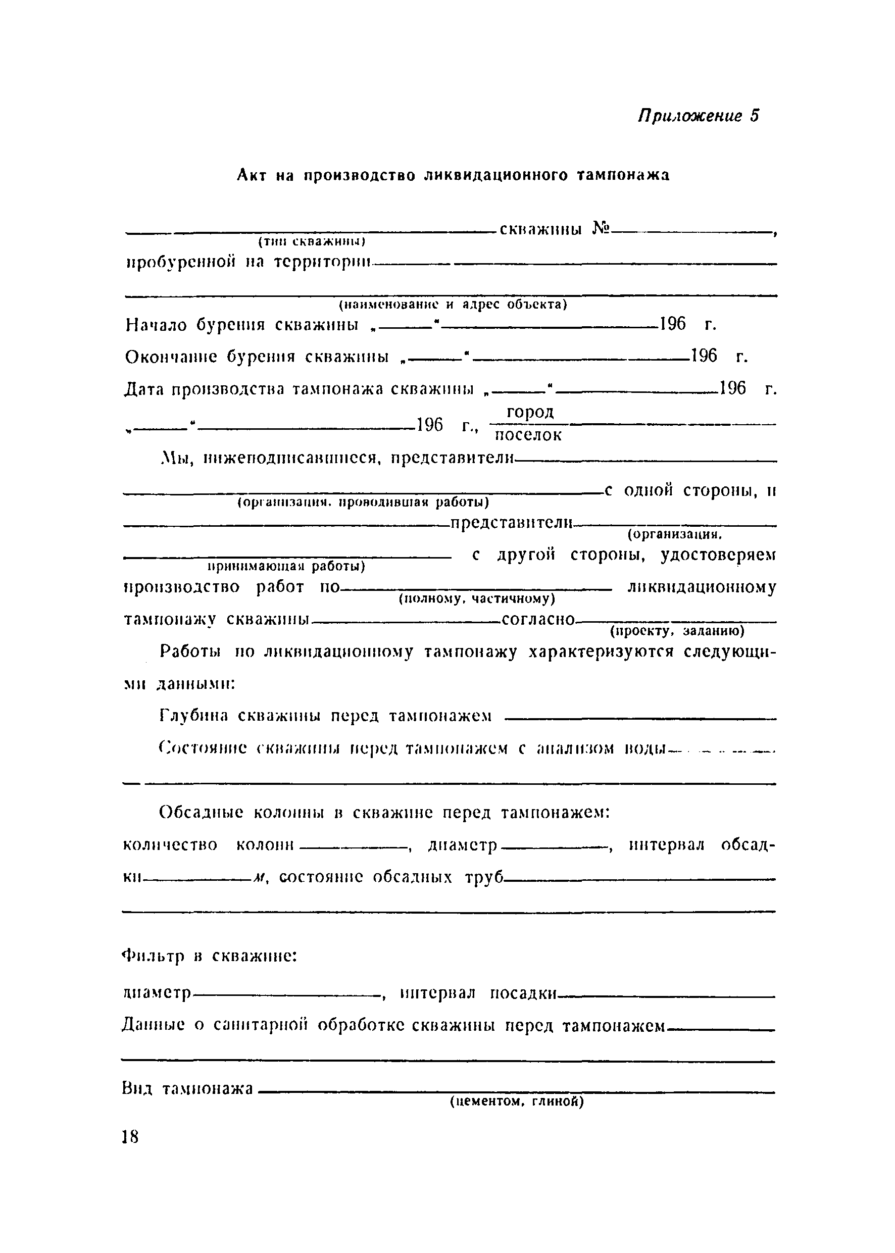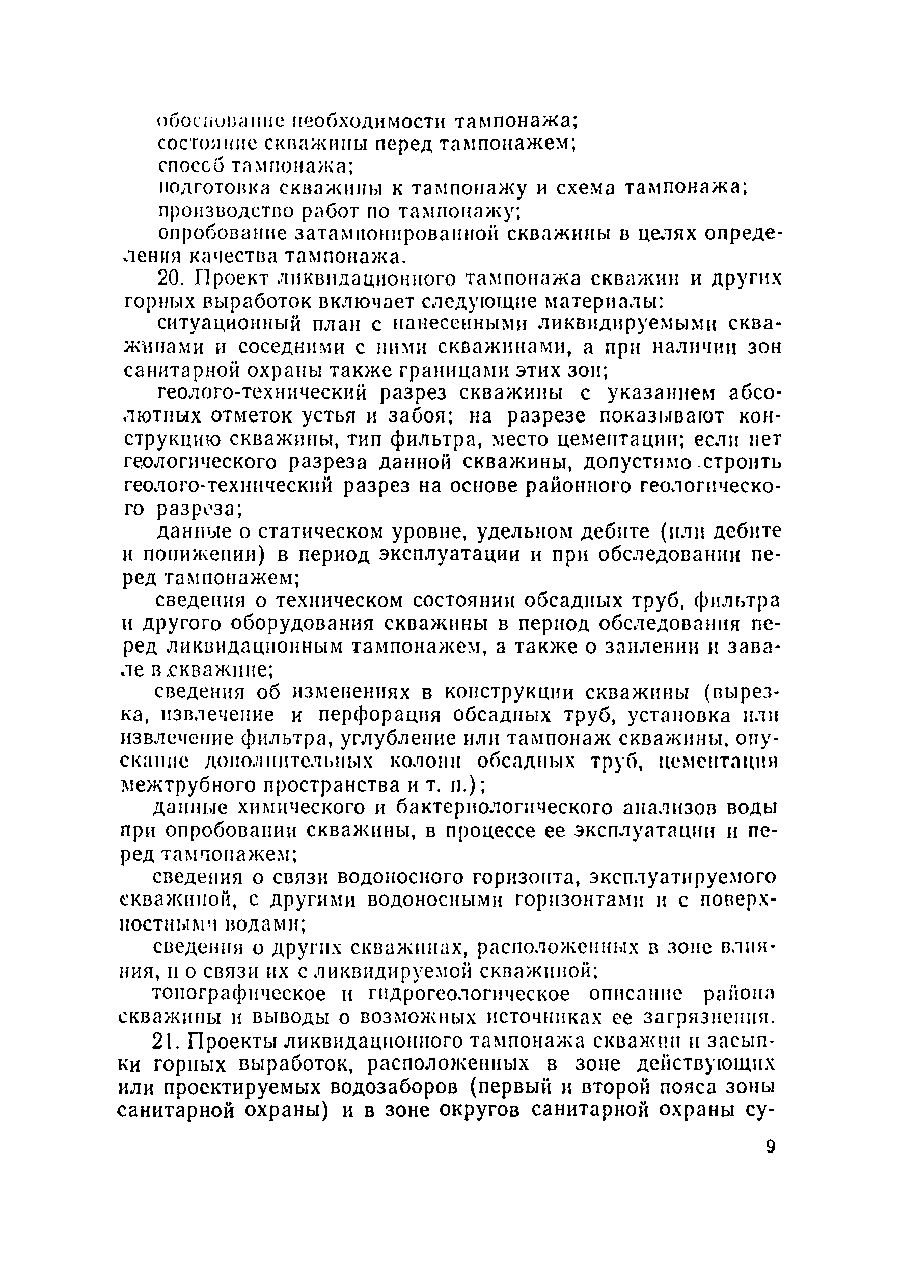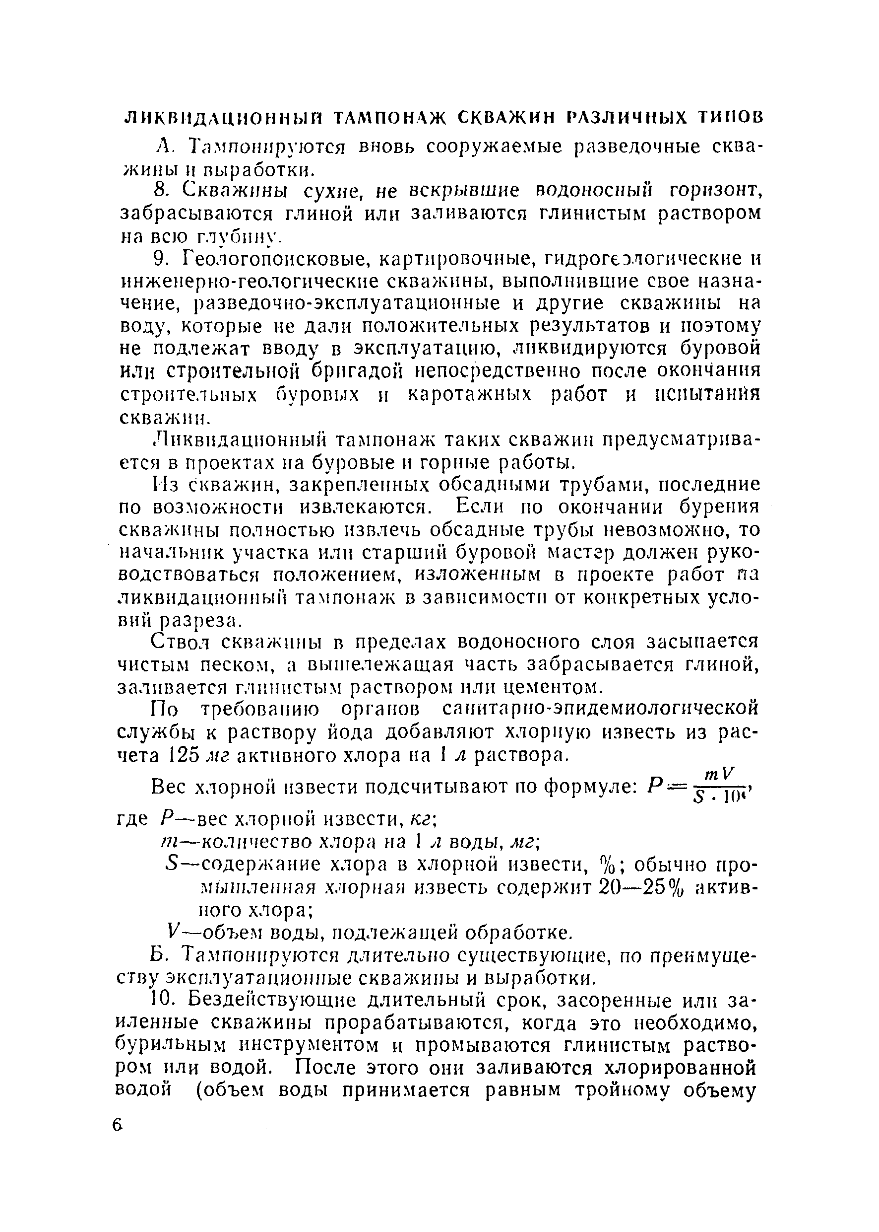 Правила и нормы техники безопасности и промышленной санитарии для проектирования, строительства и эксплуатации предприятий по производству активных углей| Статус: | справочные материалы, мп, тпр | | Название рус.: | Правила и нормы техники безопасности и промышленной санитарии для проектирования, строительства и эксплуатации предприятий по производству активных углей | | Дата добавления в базу: | 01.02.2020 | | Дата актуализации: | 01.01.2021 | | Область применения: | Правила являются обязательными для всех ведомств, предприятий, организаций и учреждений, независимо от их ведомственной подчиненности, а также для индивидуальных водопотребителей. | | Оглавление: | Общие положения Скважины и горные выработки, подлежащие ликвидации Ликвидационный тампонаж скважин различных типов Ликвидация самоизливающихся скважин Ликвидация скважин в зоне многолетней мерзлоты Частичный тампонаж Производство работ но ликвидации скважин и горных выработок Документация Приложение 1. Нормы количества глины и воды для приготовления 1 м3 глинистого раствора Приложение 2. Содержание глины, цемента и песка в растворах при сплошной заливке скважин в зависимости от поглощающих свойств пород, слагающих водоносный горизонт Приложение 3. Гранулометрический состав глины и песка, применяемых для глино-цементных и песчано-цементных растворов Приложение 4. Цементы для тампонажа скважин Приложение 5. Акт на производство ликвидационного тампонажа | | Утверждён: | 17.05.1961 Государственный комитет Совета Министров СССР по химии 21.12.1960 Президиум Центрального комитета профессионального Союза рабочих нефтяной и химической промышленности (13)