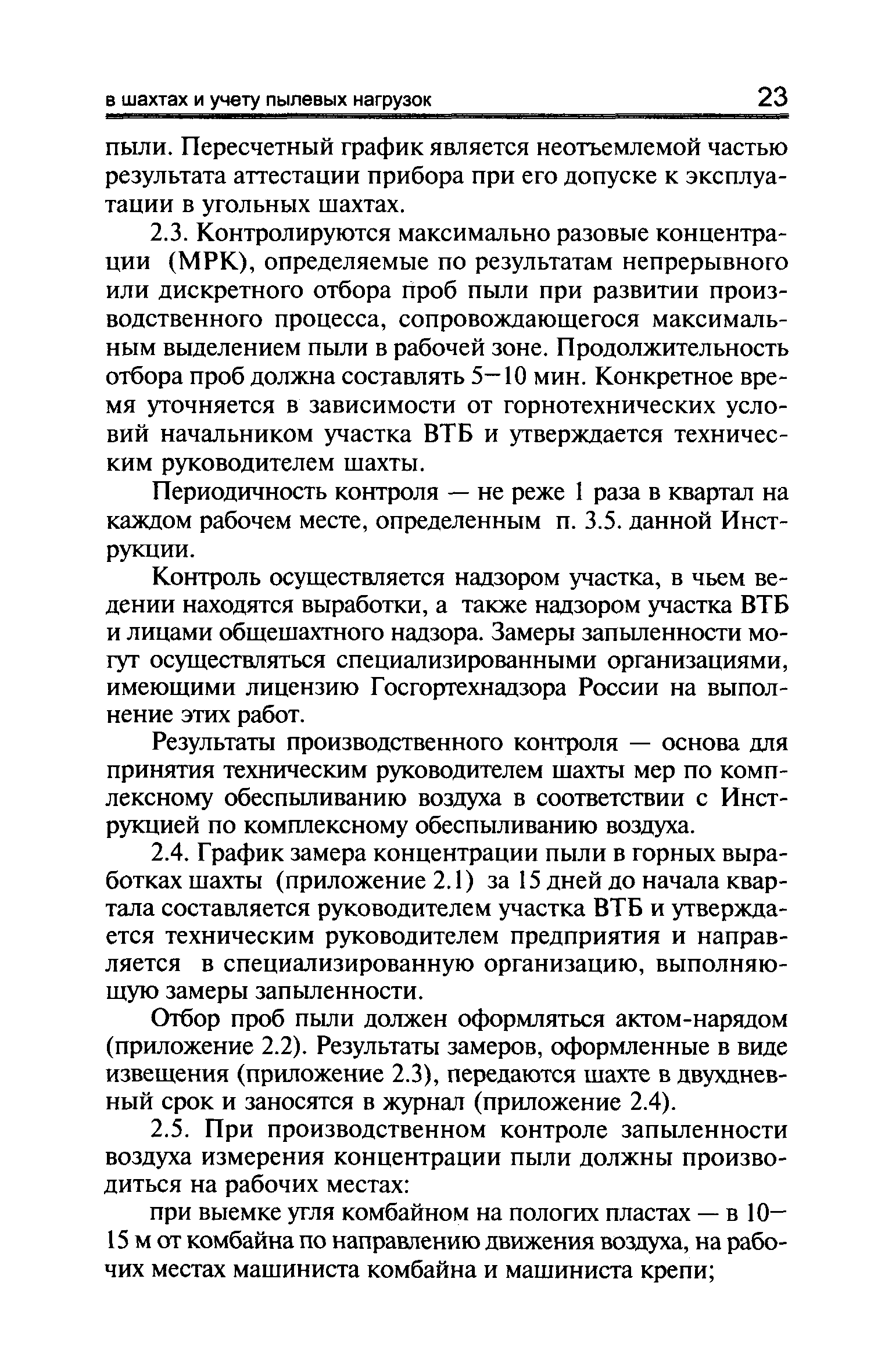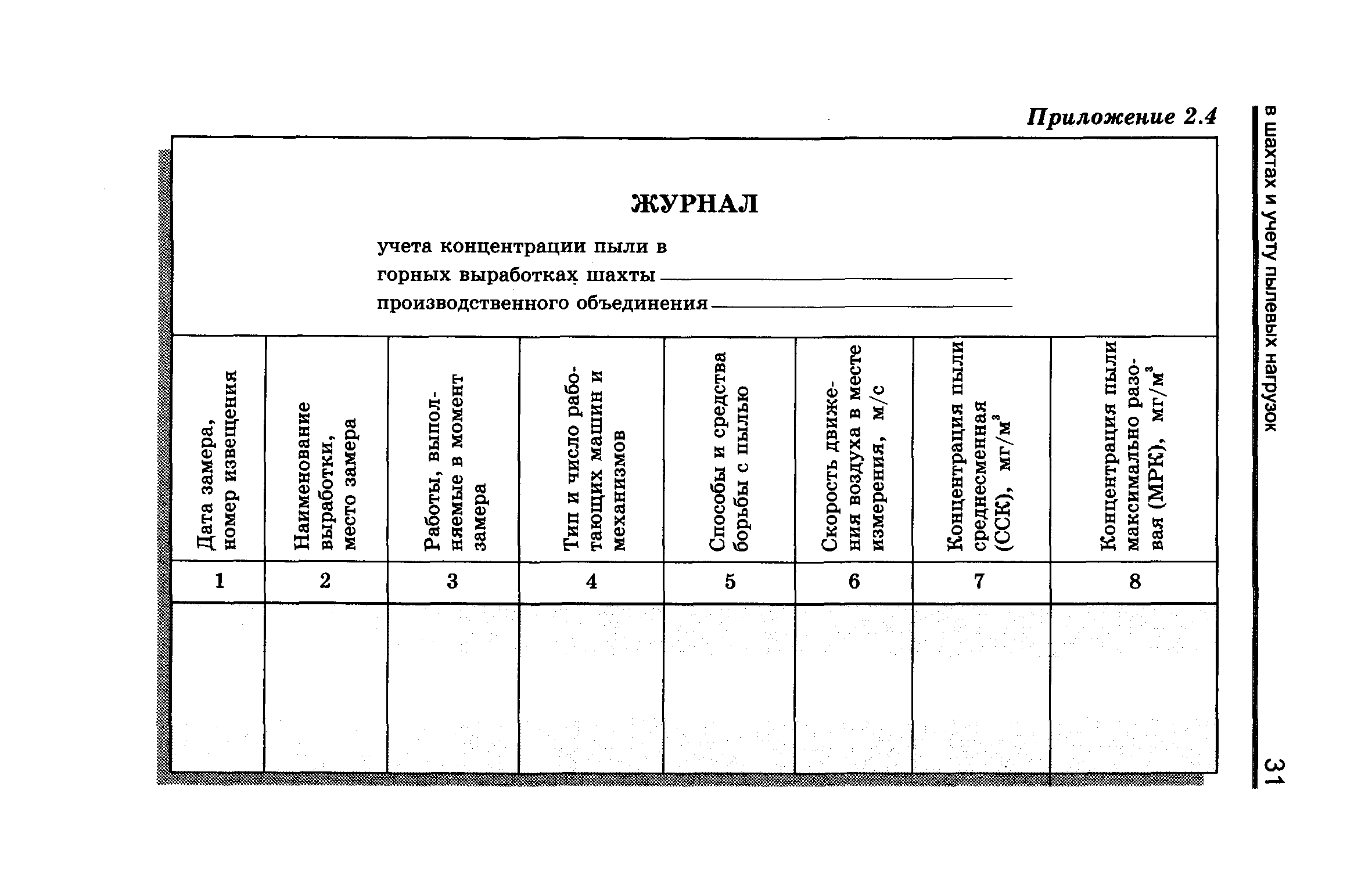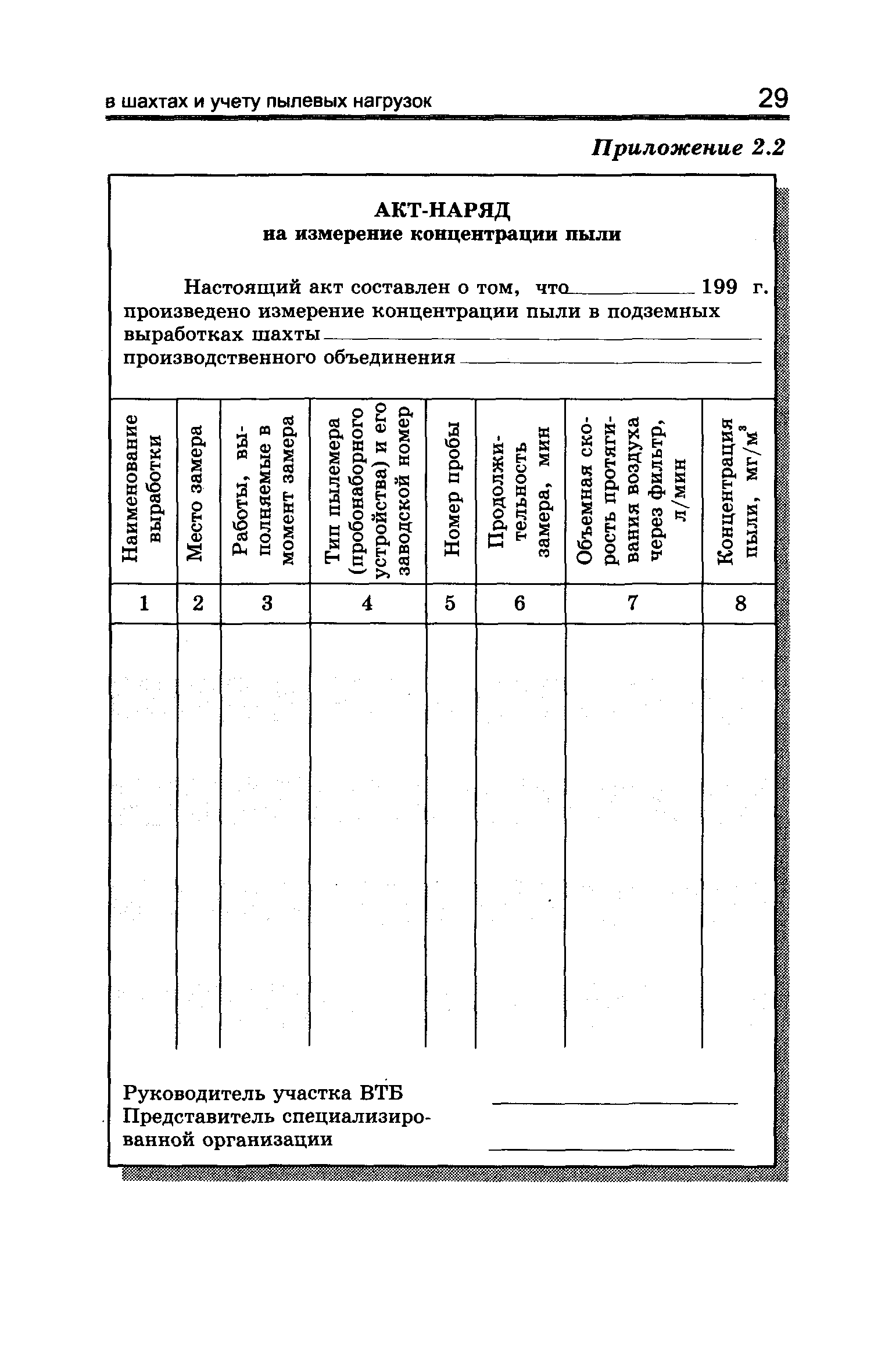 | Оглавление: | 1. Общие положения 2. Производственный контроль 3. Контроль пылевой нагрузки 4. Государственный и общественный контроль Приложение 2.1 График замера концентрации пыли в горных выработках Приложение 2.2 Акт-наряд на измерение концентрации пыли Приложение 2.3 Извещение о результатах замеров концентрации пыли в горных выработках Приложение 2.4 Журнал учета концентрации пыли Приложение 2.5 Предельно допустимые концентрации распространенных в угольных шахтах аэрозолей Приложение 2.6 Журнал учета пылевых нагрузок рабочих и ИТР участка |