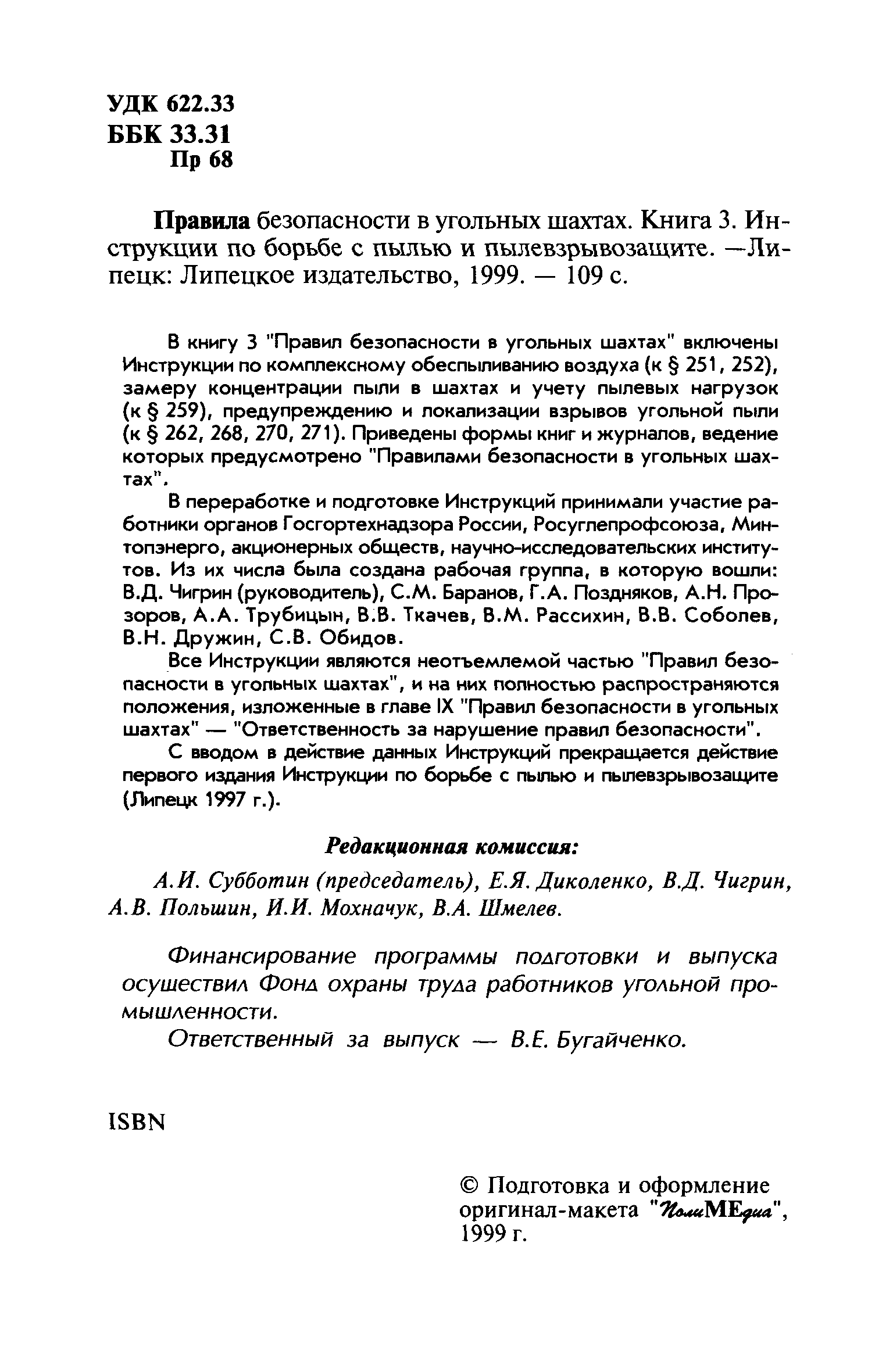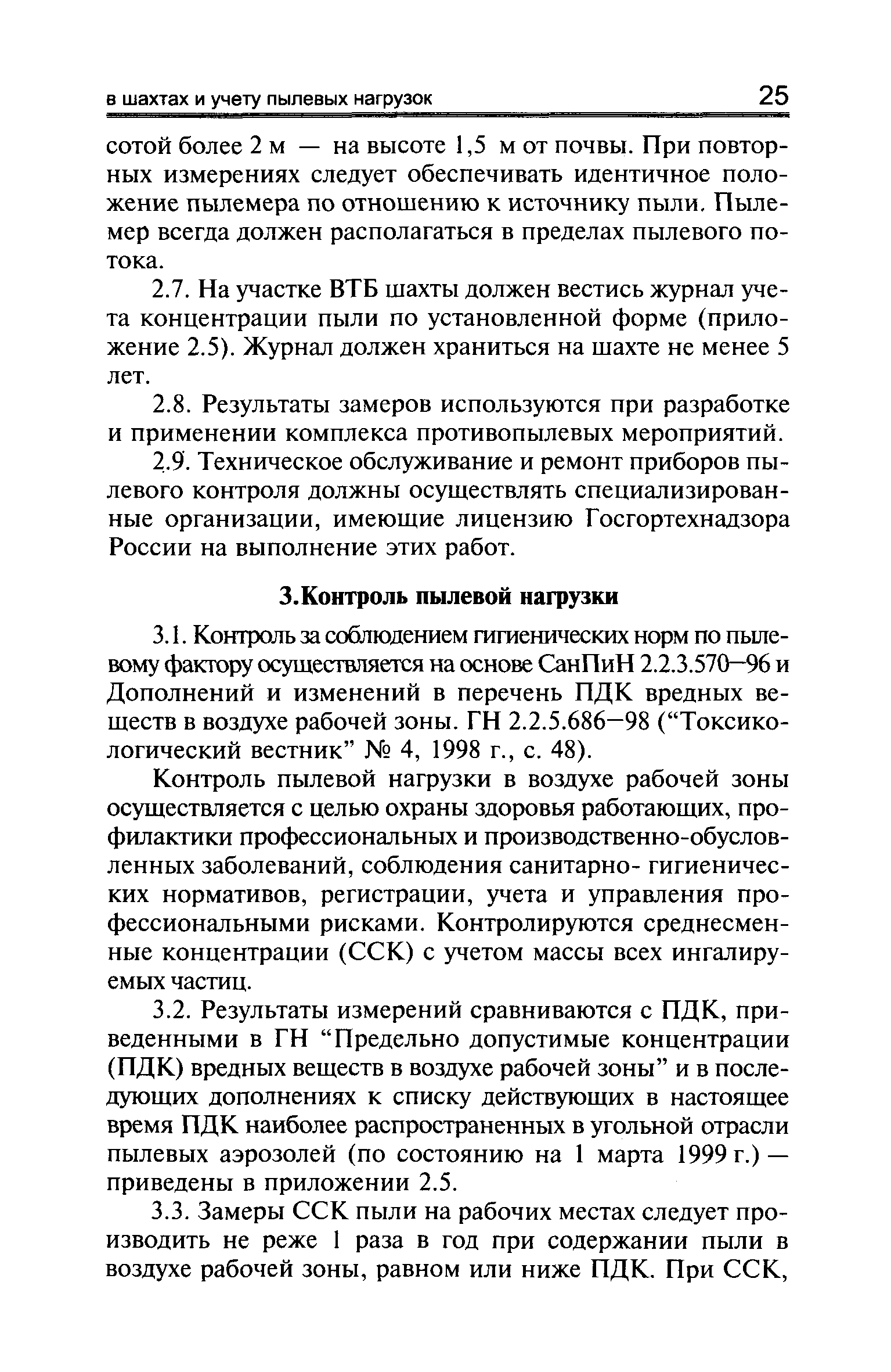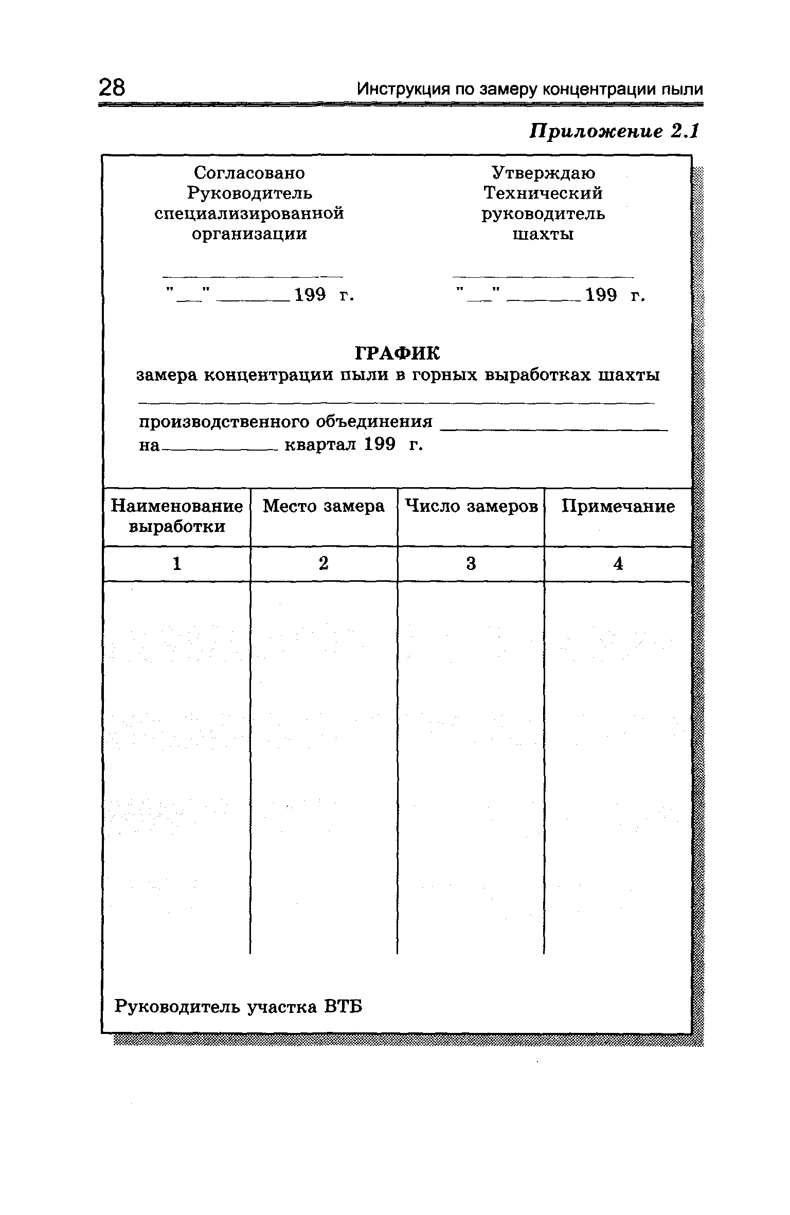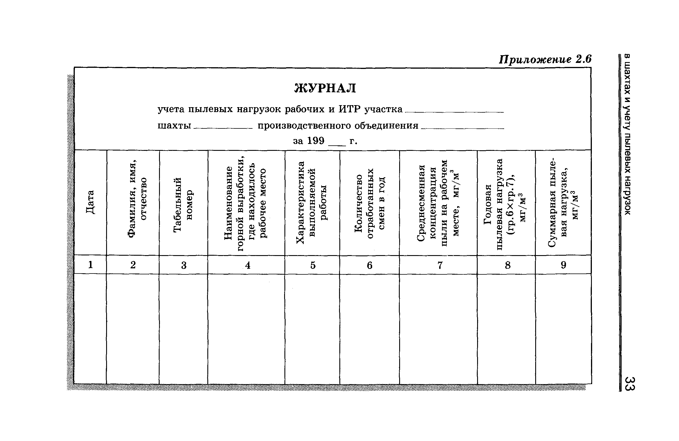 | Оглавление: | 1. Общие положения 2. Производственный контроль 3. Контроль пылевой нагрузки 4. Государственный и общественный контроль Приложение 2.1 График замера концентрации пыли в горных выработках Приложение 2.2 Акт-наряд на измерение концентрации пыли Приложение 2.3 Извещение о результатах замеров концентрации пыли в горных выработках Приложение 2.4 Журнал учета концентрации пыли Приложение 2.5 Предельно допустимые концентрации распространенных в угольных шахтах аэрозолей Приложение 2.6 Журнал учета пылевых нагрузок рабочих и ИТР участка |