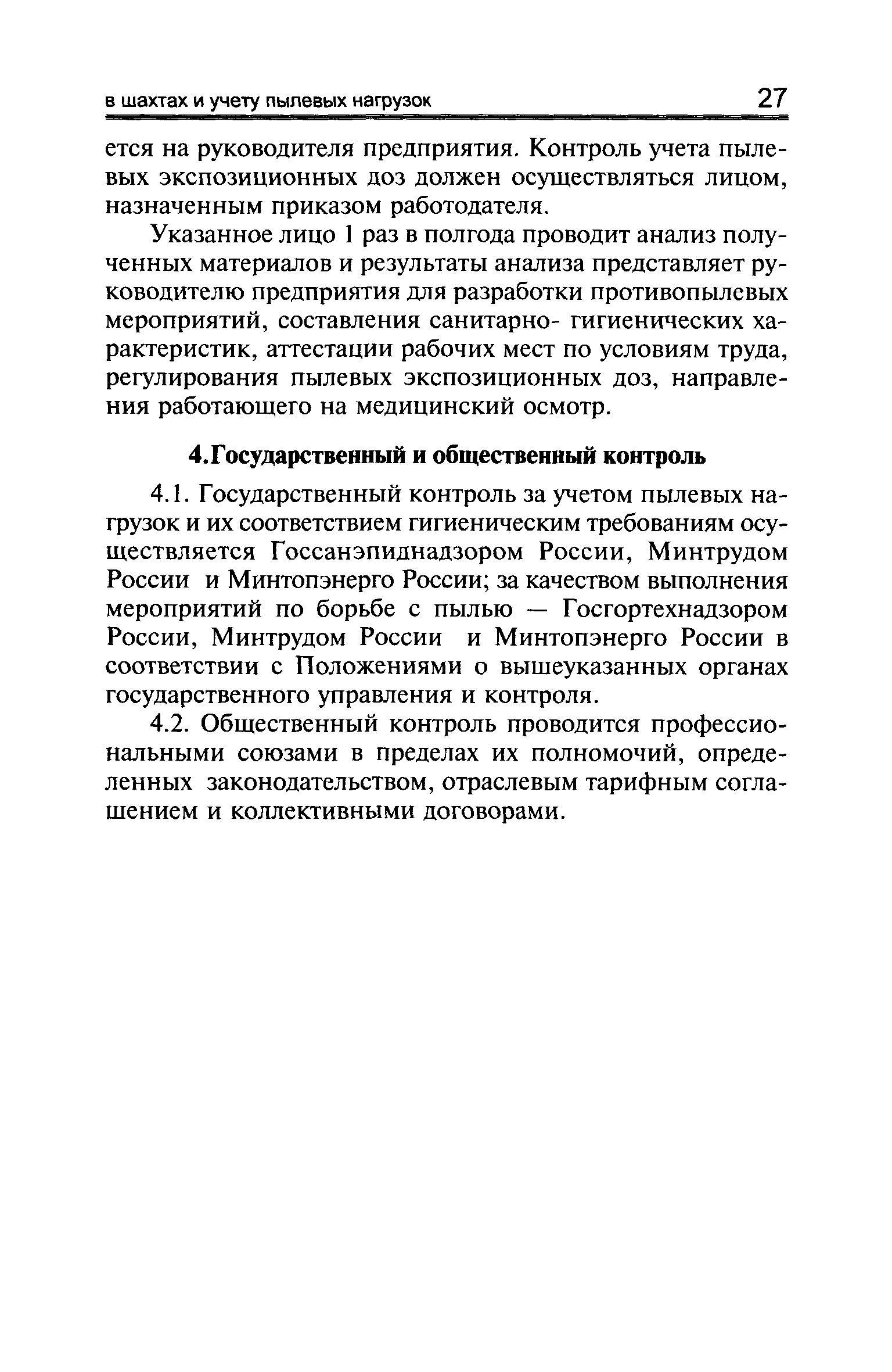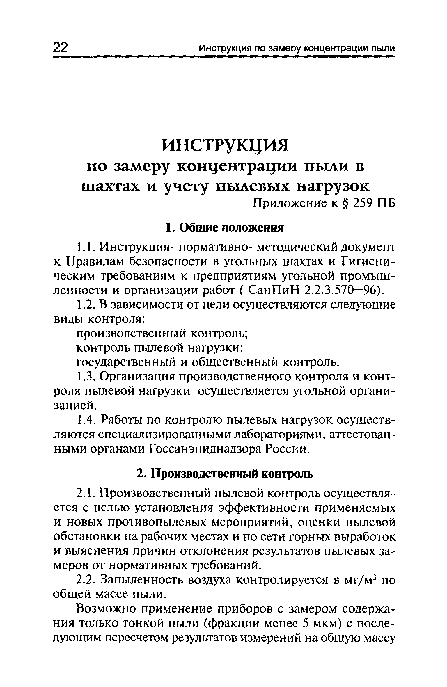 | Область применения: | Инструкция нормативно-методический документ к Правилам безопасности в угольных шахтах и Гигиеническим требованиям к предприятиям угольной промышленности и организации работ (СанПиН 2.2.3.570-96). В зависимости от цели осуществляются следующие виды контроля: производственный контроль; контроль пылевой нагрузки; государственный и общественный контроль. Организация производственного контроля и контроля пылевой нагрузки осуществляется угольной организацией. Работы по контролю пылевых нагрузок осуществляются специализированными лабораториями, аттестованными органами Госсанэпиднадзора России. |
