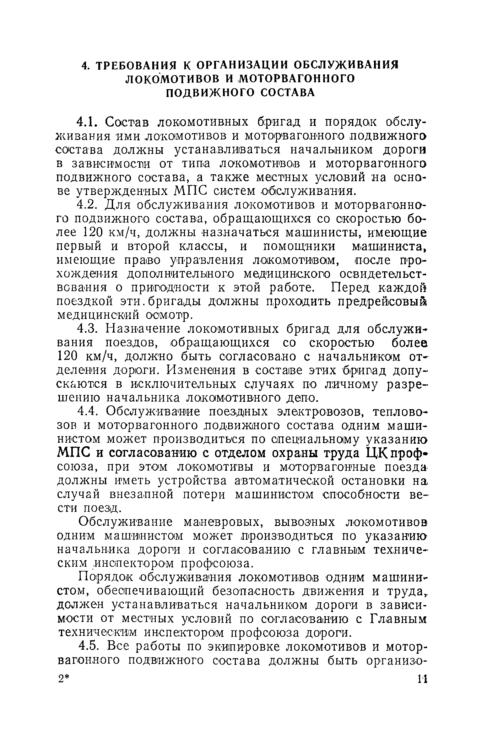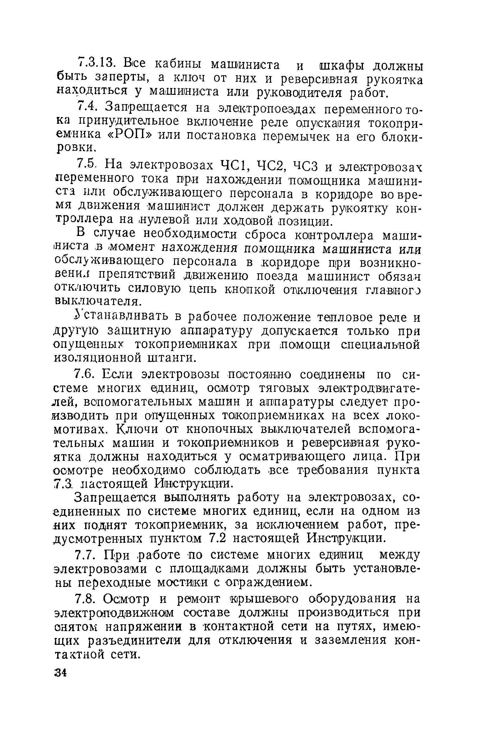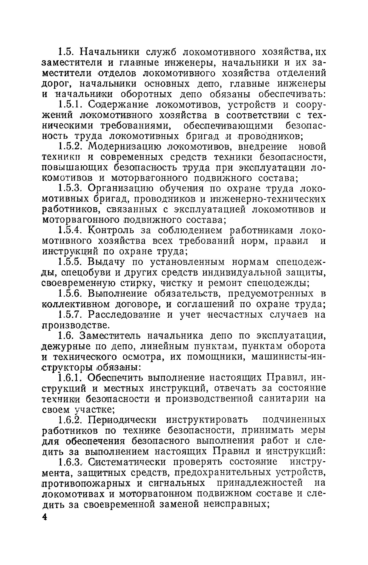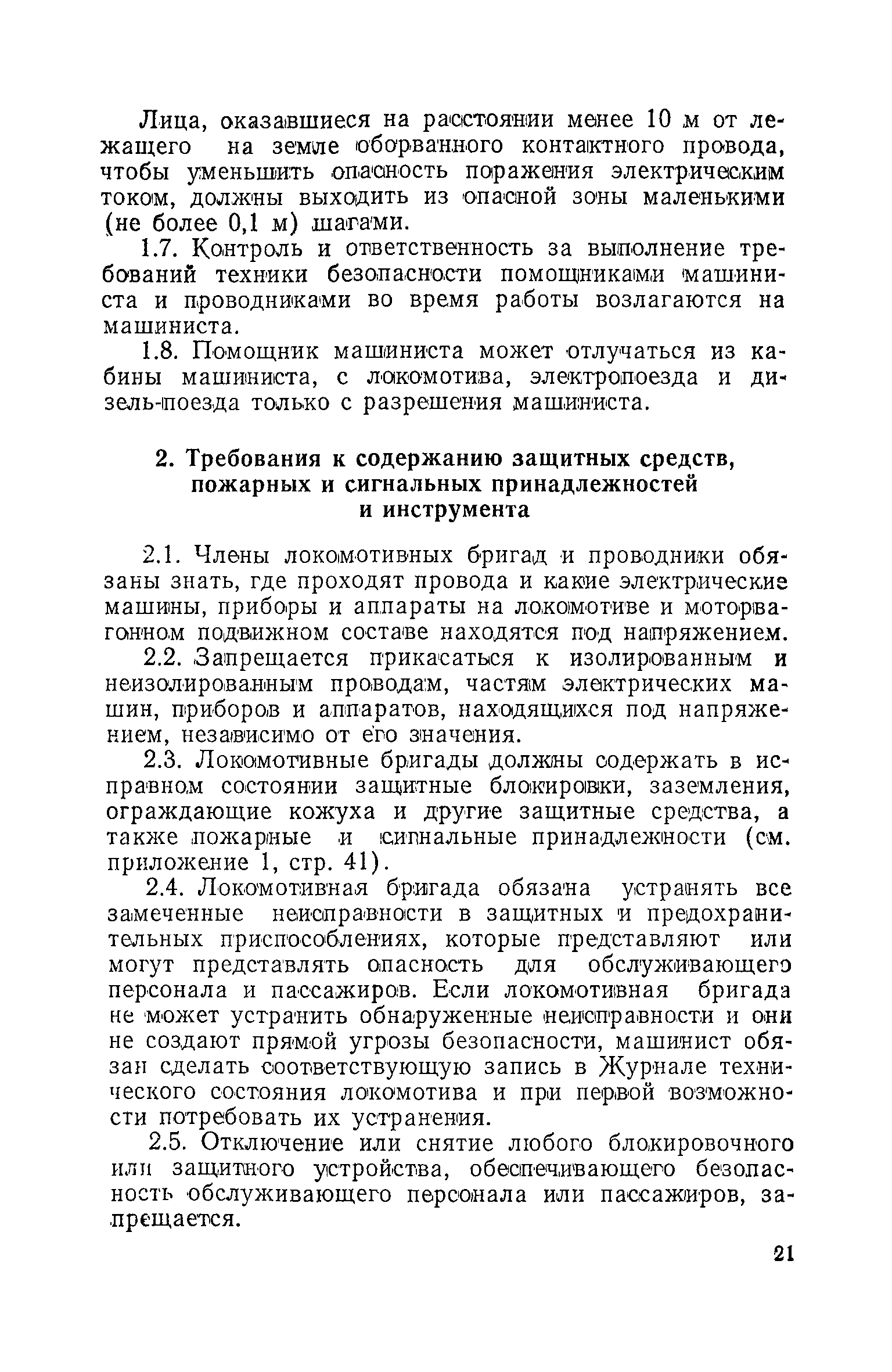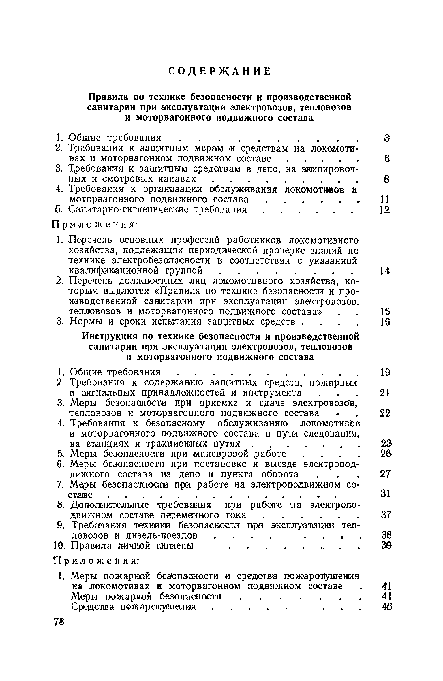 Правила и инструкция по технике безопасности и производственной санитарии при эксплуатации электровозов, тепловозов и моторвагонного подвижного состава| Статус: | справочные материалы, мп, тпр | | Название рус.: | Правила и инструкция по технике безопасности и производственной санитарии при эксплуатации электровозов, тепловозов и моторвагонного подвижного состава | | Дата добавления в базу: | 01.02.2020 | | Дата актуализации: | 01.01.2021 | | Область применения: | Правила устанавливают основные требования по обеспечению безопасных условий труда при эксплуатации электровозов, тепловозов и моторвагонного подвижного состава. Все работы по обслуживанию электровозов, тепловозов и моторвагонного подвижного состава на железных дорогах МПС должны производиться при обязательном выполнении настоящих Правил. В Правилах по технике безопасности и производственной санитарии при эксплуатации электровозов, тепловозов и моторвагонного подвижного состава приведены основные требовании по обеспечению безопасных условий труда при эксплуатации электровозов, тепловозов в моторвагонного подвижного состава. В Инструкции приведены требования по безопасному выполнению работ локомотивными бригадам и проводниками при обслуживании локомотивов и моторвагонного подвижного состава. | | Оглавление: | Правила по технике безопасности и производственной санитарии при эксплуатации электровозов, тепловозов н моторвагонного подвижного состава 1. Общие требования 2. Требования к защитным мерам и средствам на локомотивах и моторвагонном подвижном составе 3. Требования к защитным средствам в депо, на экипировочных и смотровых канавах 4. Требования к организации обслуживания локомотивов и моторвагонного подвижного состава 5. Санитарно-гигиенические требования Приложение 1. Перечень основных профессий работников локомотивного хозяйства, подлежащих периодической проверке знаний по технике электробезопасности в соответствии с указанной квалификационной группой Приложение 2. Перечень должностных лиц локомотивного хозяйства, которым выдаются «Правила по технике безопасности и производственной санитарии при эксплуатации электровозов, тепловозов и моторвагонного подвижного состава» Приложение 3. Нормы и сроки испытания защитных средств Инструкция по технике безопасности и производственной санитарии при эксплуатации электровозов, тепловозов и моторвагонного подвижного состава 1. Общие требования 2. Требования к содержанию защитных средств, пожарных и сигнальных принадлежностей и инструмента 3. Меры безопасности при приемке и сдаче электровозов, тепловозов и моторвагонного подвижного состава 4. Требования к безопасному обслуживанию локомотивов и моторвагонного подвижного состава в пути следования, на станциях и тракционных путях 5. Меры безопасности при маневровой работе 6. Меры безопасности при постановке и выезде электроподвижного состава из дело и пункта оборота . 7. Меры безопасности при работе на электроподвижном составе 8. Дополнительные требования при работе на электроподвижном составе переменного тока 9. Требования техники безопасности при эксплуатации тепловозов и дизель-поездов 10, Правила личной гигиены Приложение 1. Меры пожарной безопасности и средства пожаротушения локомотивах и моторвагонном подвижном составе Приложение 2. Первая 