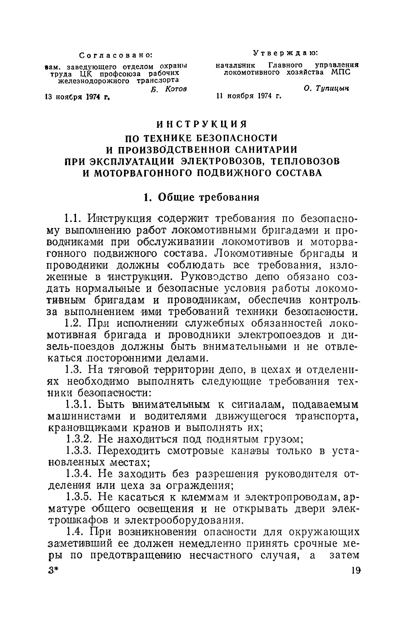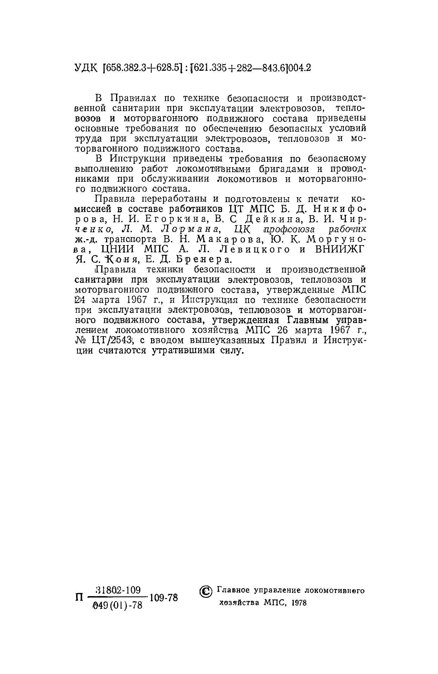 | | Заменяет собой: | - «Инструкция по технике безопасности при эксплуатации электровозов, тепловозов и моторвагонного подвижного состава» (Утв. МПС 26 марта 1967 г № ЦТ/2543)