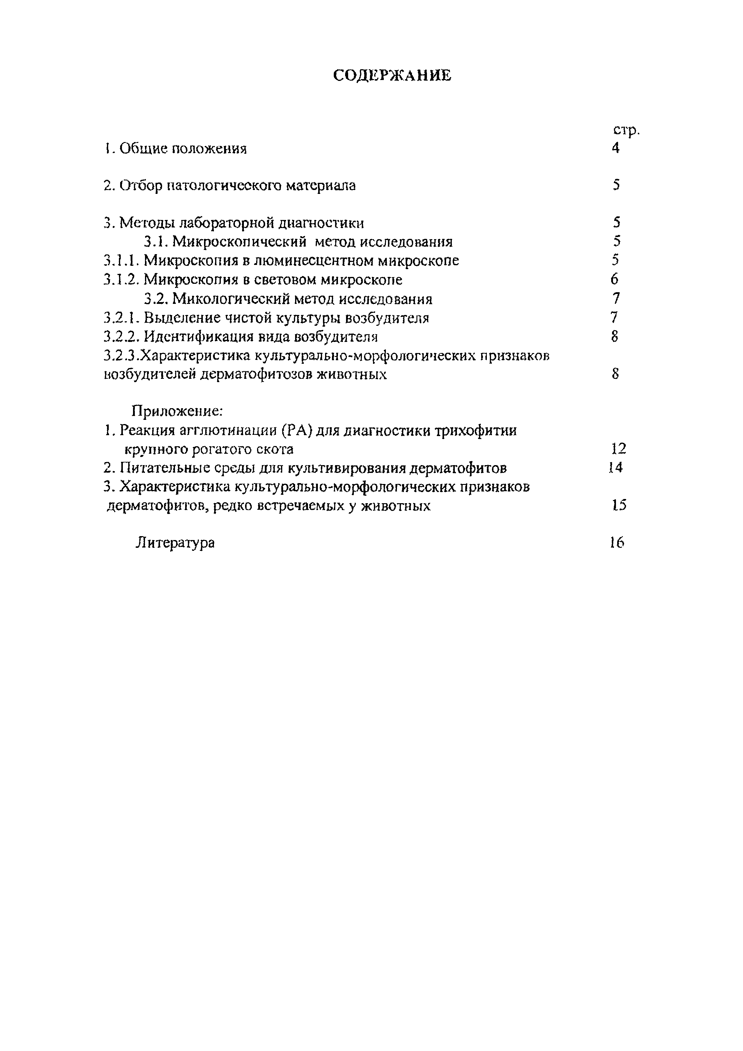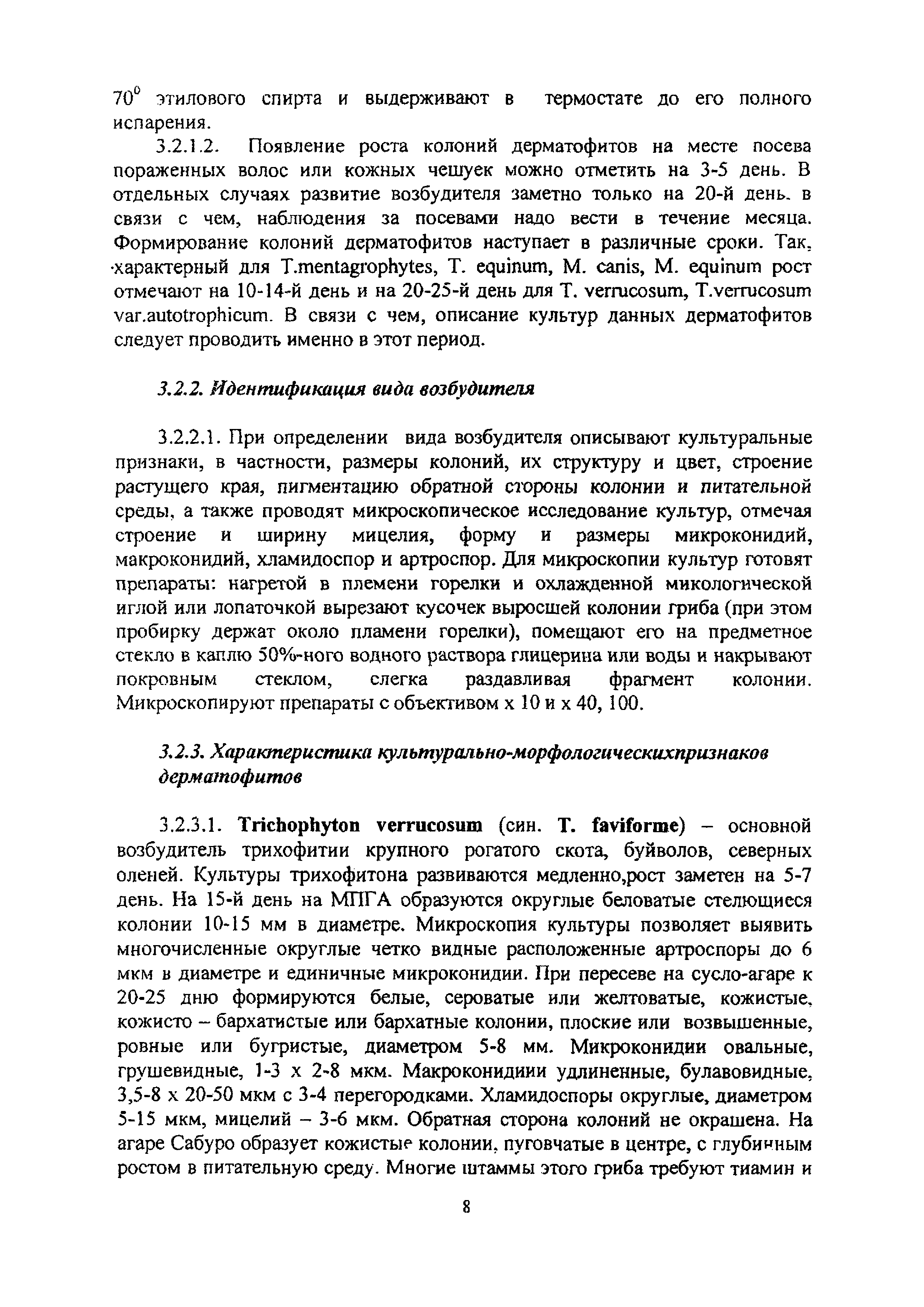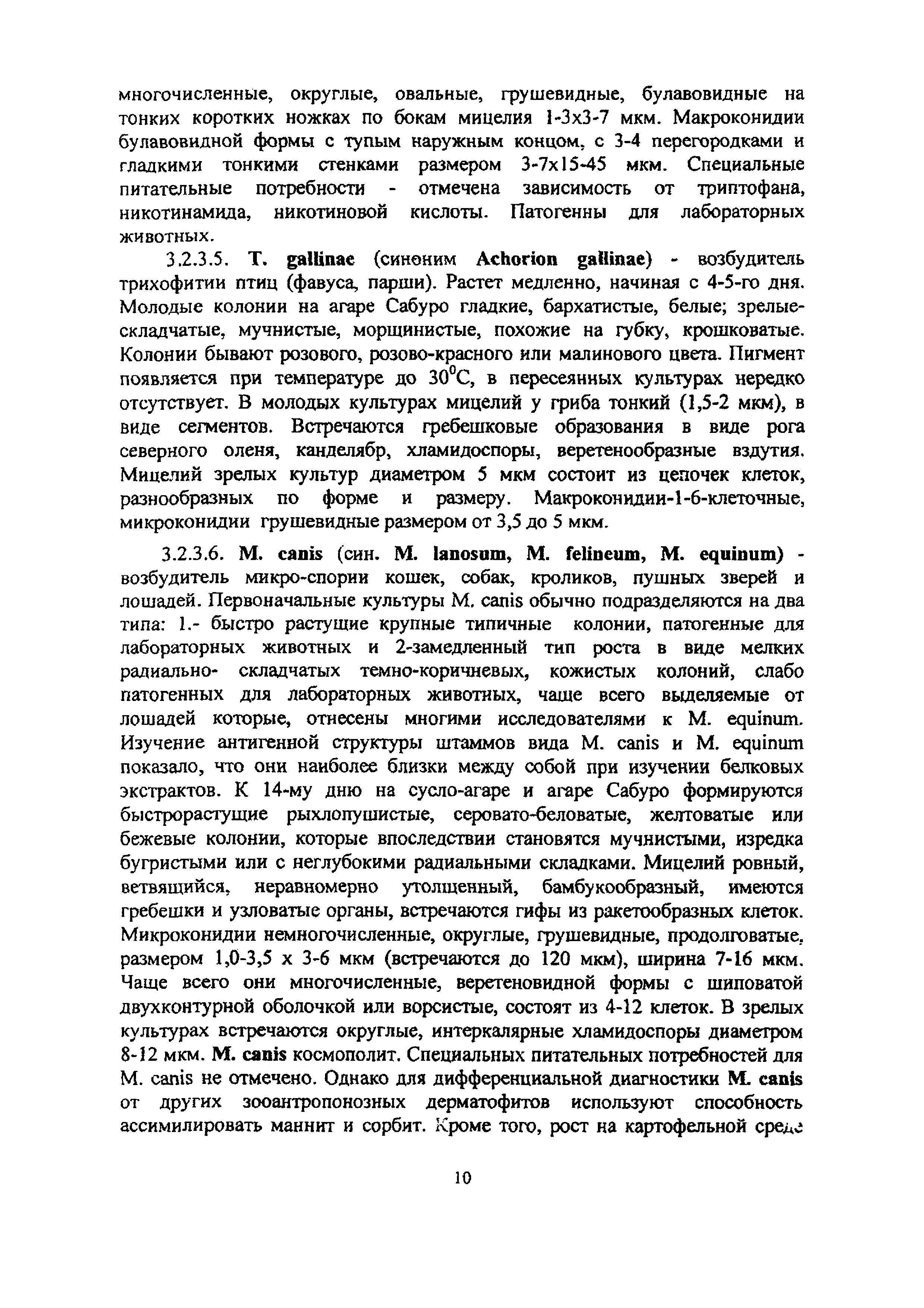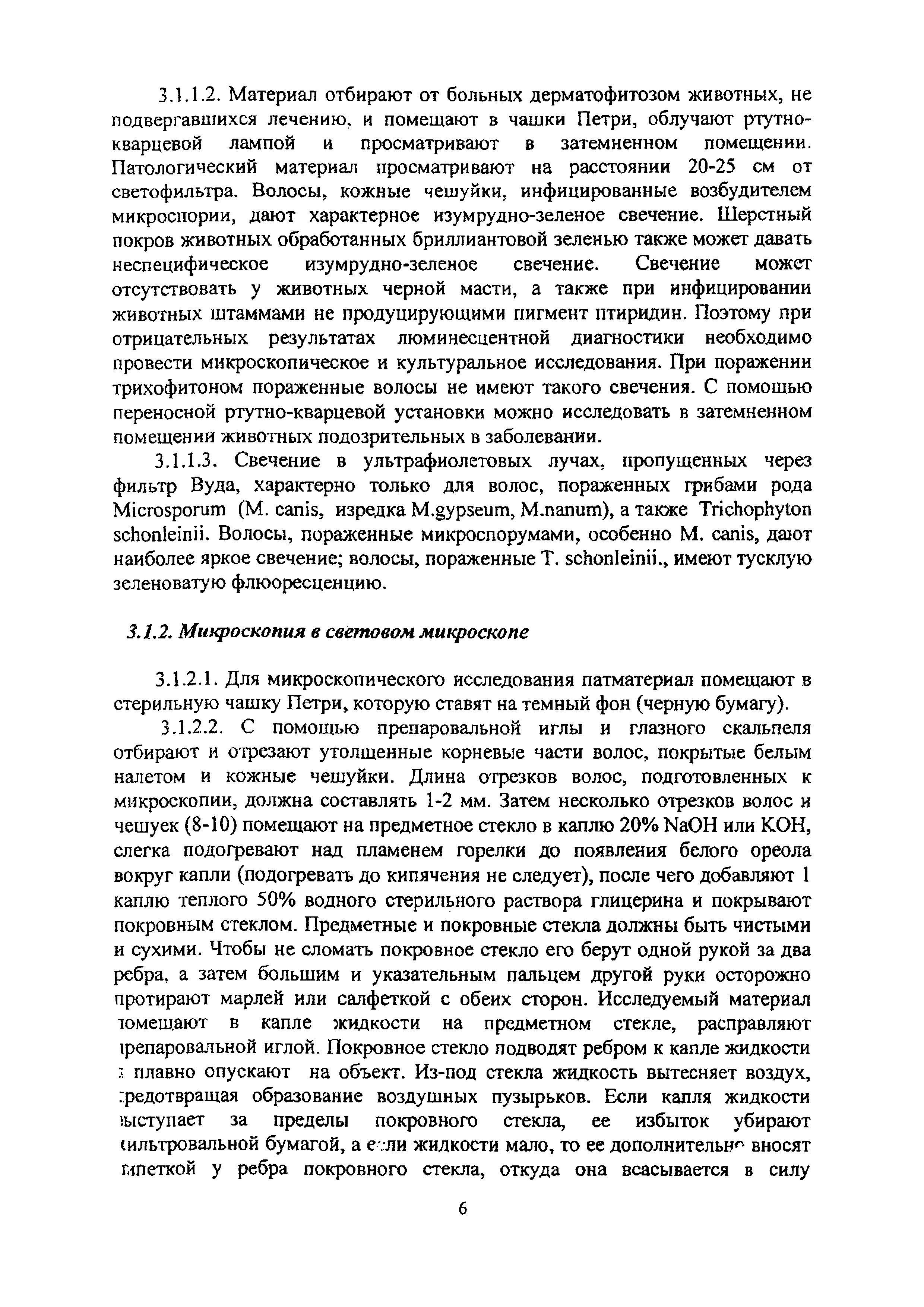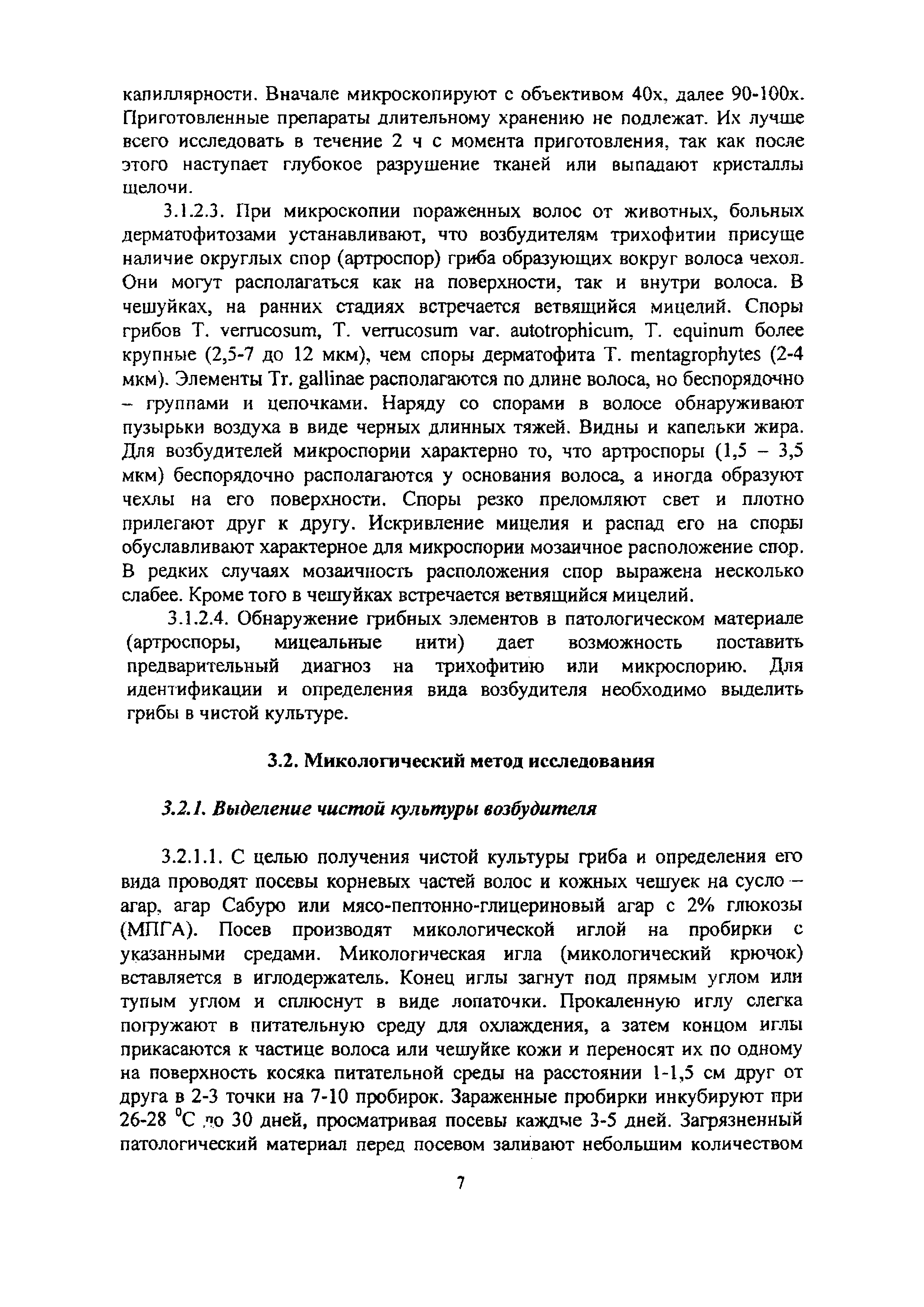 Методические указания по лабораторной диагностике дерматофитозов животных| Статус: | информационный документ | | Название рус.: | Методические указания по лабораторной диагностике дерматофитозов животных | | Дата добавления в базу: | 01.02.2020 | | Дата актуализации: | 01.01.2021 | | Оглавление: | 1 Общие положения 2 Отбор патологического материала 3 Методы лабораторной диагностики 3.1 Микроскопический метод исследования 3.1.1 Микроскопия в люминесцентном микроскопе 3.1.2 Микроскопия в световом микроскопе 3.2 Микологический метод исследования 3.2.1 Выделение чистой культуры возбудителя 3.2.2 Идентификация вида возбудителя 3.2.3 .Характеристика культурально-морфологических признаков возбудителей дерматофитозов животных Приложение 1. Реакция агглютинации (РА) для диагностики трихофитии крупного рогатого скота Приложение 2. Питательные среды для культивирования дерматофитов Приложение 3. Характеристика культурально-морфологических признаков дерматофитов, редко встречаемых у животных | | Утверждён: | 18.03.2008 Управление ветеринарии Министерства сельского хозяйства РФ