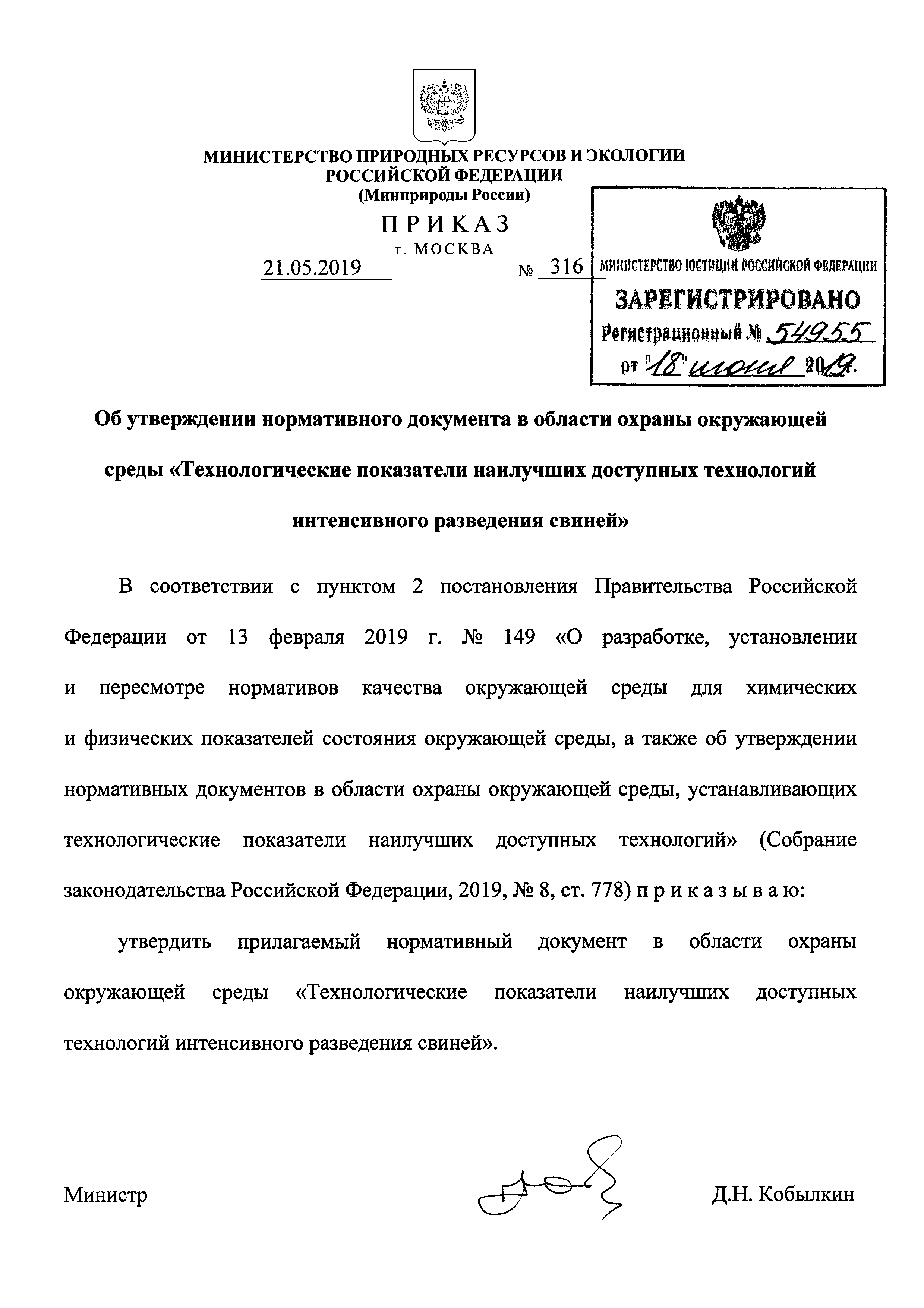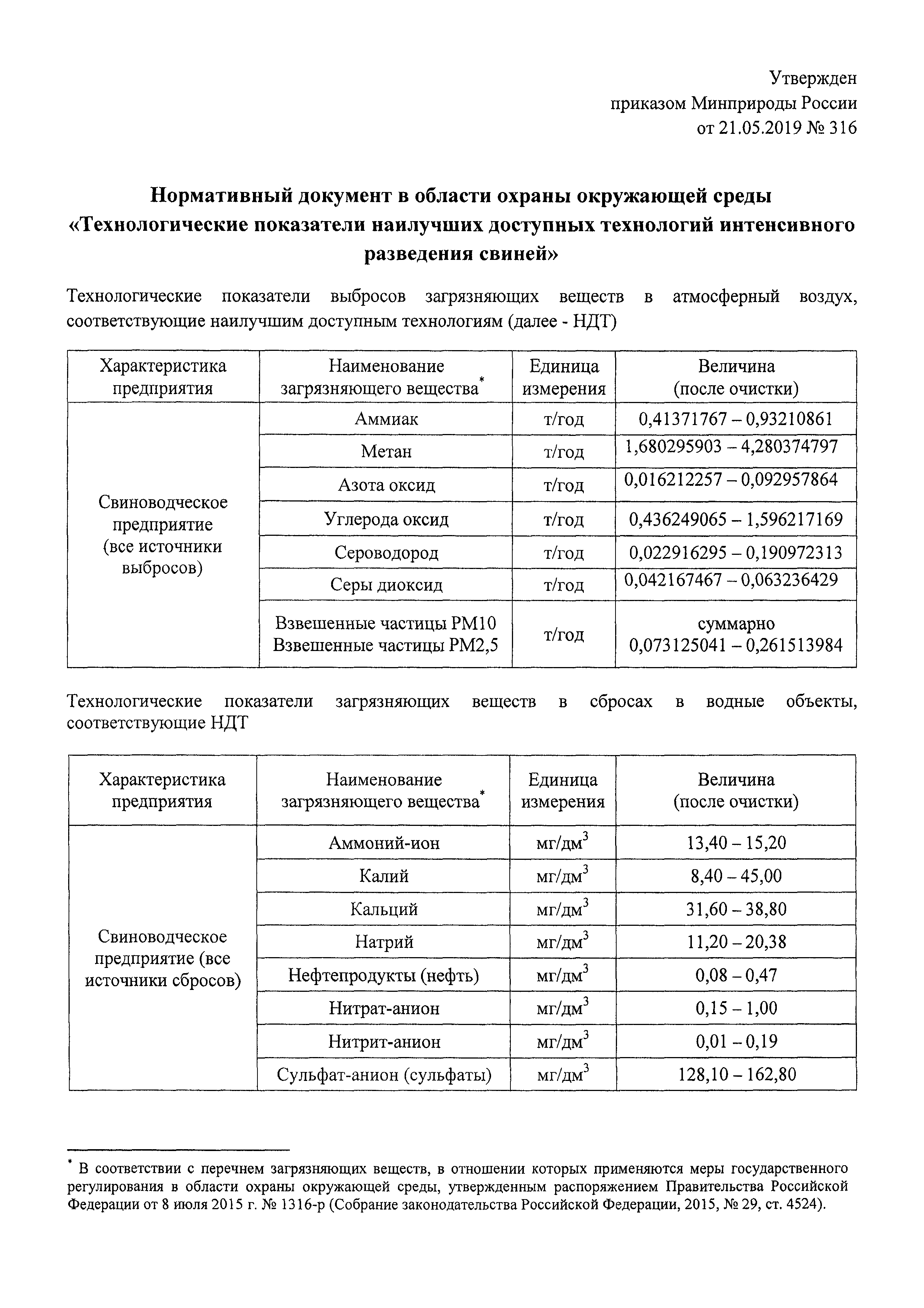 Нормативный документ в области охраны окружающей среды "Технологические показатели наилучших доступных технологий интенсивного разведения свиней"| Статус: | действует | | Название рус.: | Нормативный документ в области охраны окружающей среды "Технологические показатели наилучших доступных технологий интенсивного разведения свиней" | | Дата добавления в базу: | 01.02.2020 | | Дата актуализации: | 01.01.2021 | | Дата введения: | 30.06.2019 | | Утверждён: | 21.05.2019 Министерство природных ресурсов и экологии Российской Федерации (316)