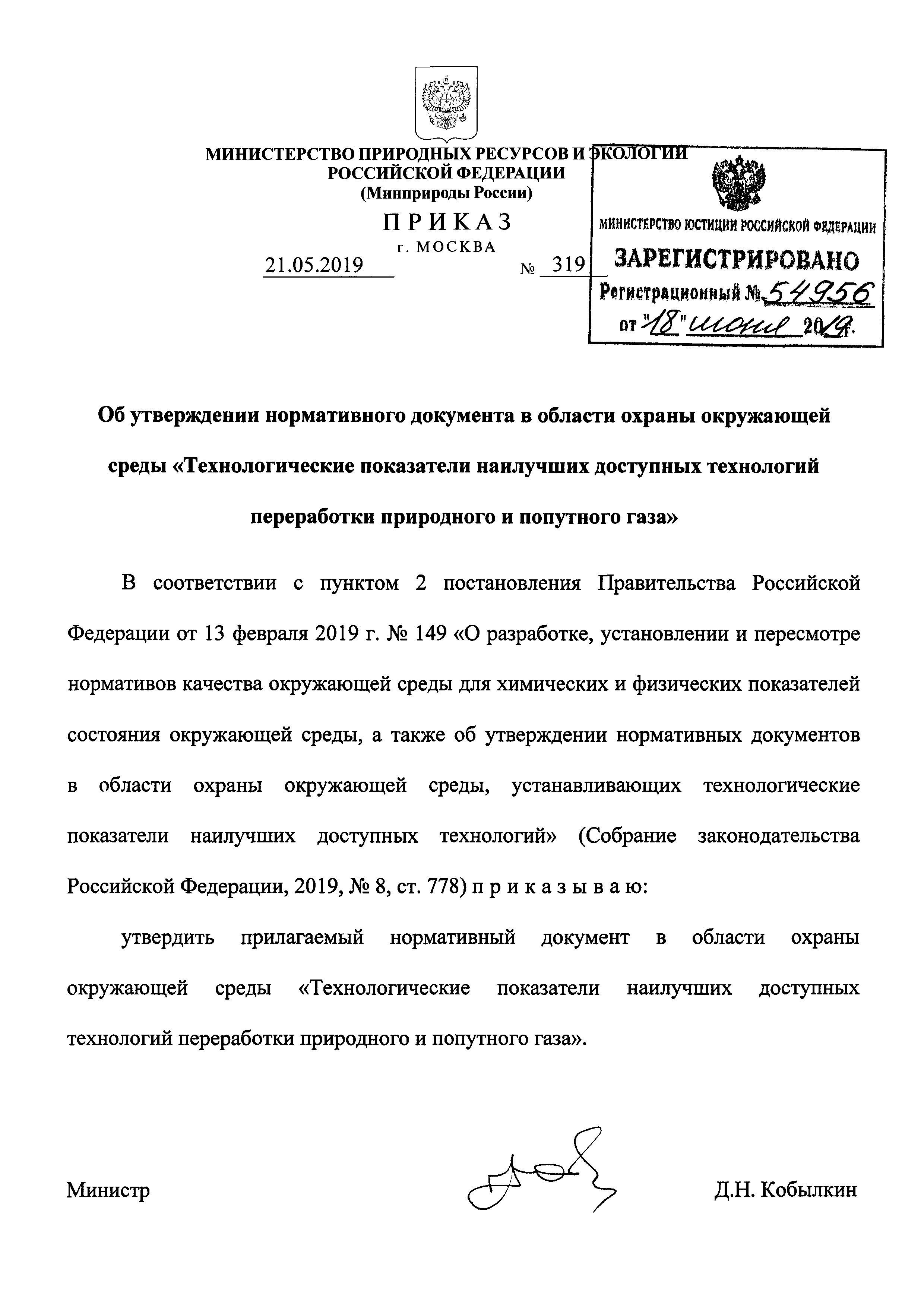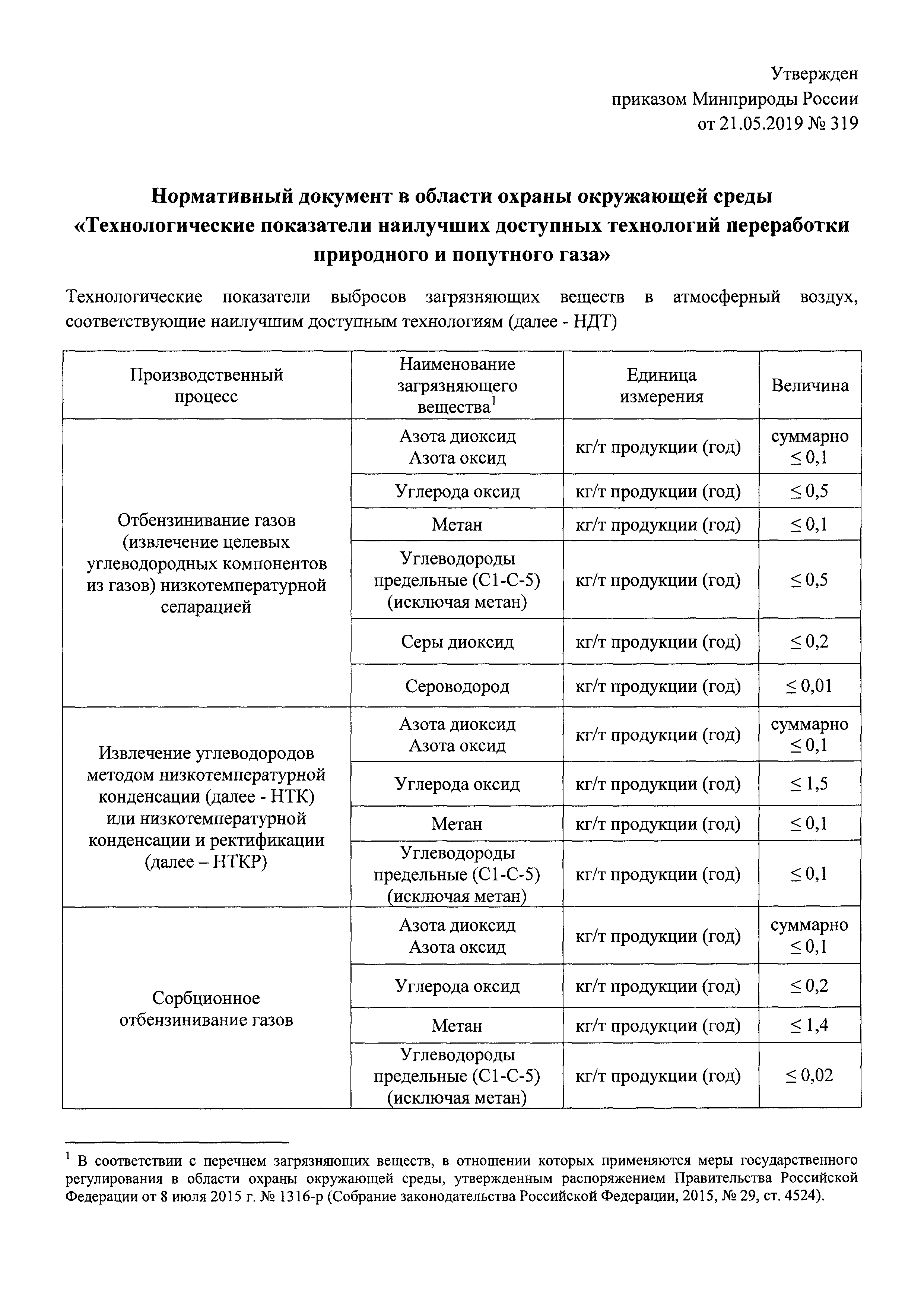 Нормативный документ в области охраны окружающей среды "Технологические показатели наилучших доступных технологий переработки природного и попутного газа"| Статус: | действует | | Название рус.: | Нормативный документ в области охраны окружающей среды "Технологические показатели наилучших доступных технологий переработки природного и попутного газа" | | Дата добавления в базу: | 01.02.2020 | | Дата актуализации: | 01.01.2021 | | Дата введения: | 30.06.2019 | | Утверждён: | 21.05.2019 Министерство природных ресурсов и экологии Российской Федерации (319)