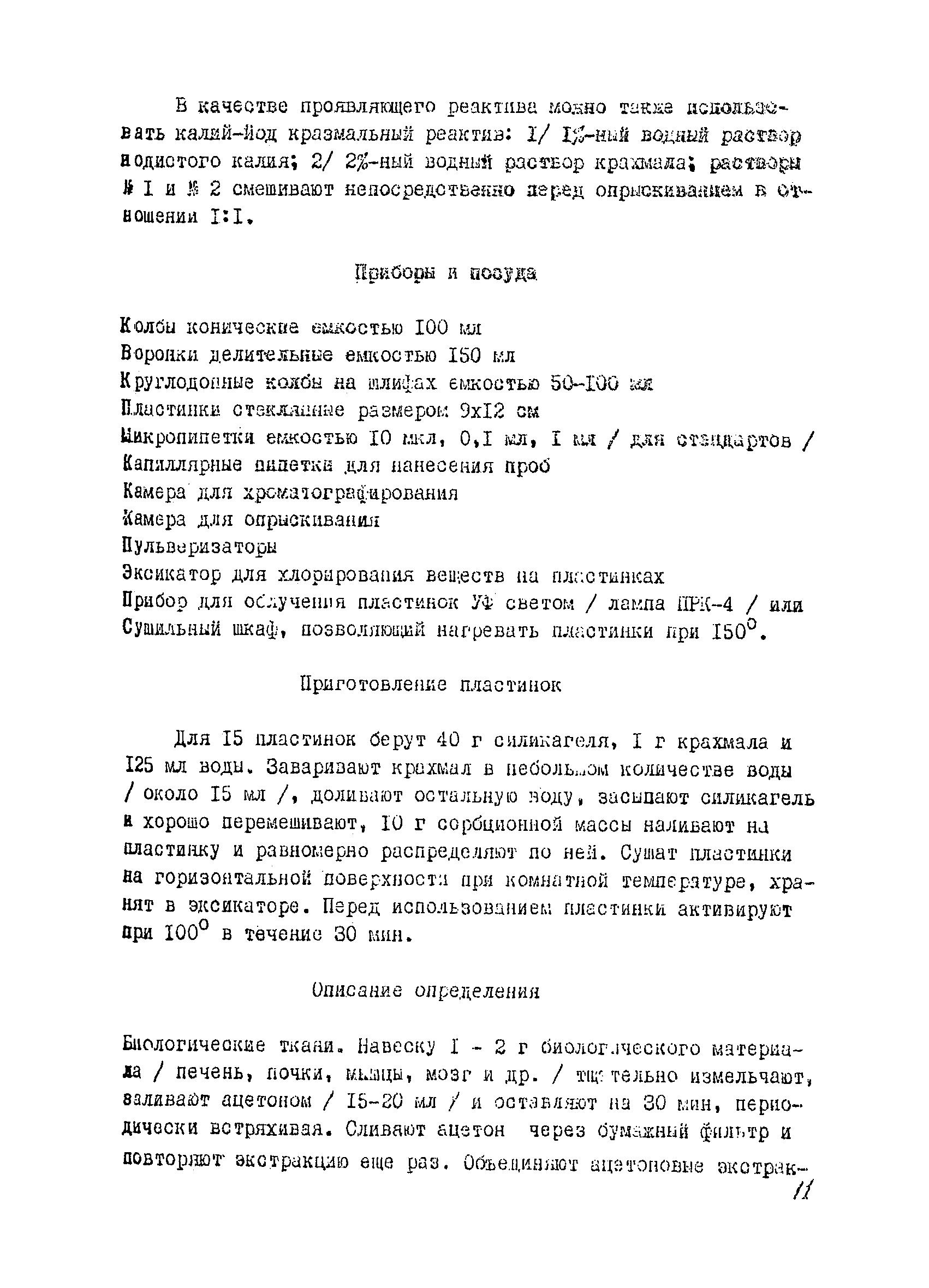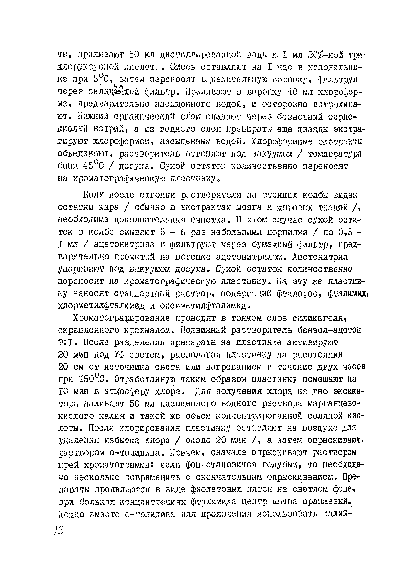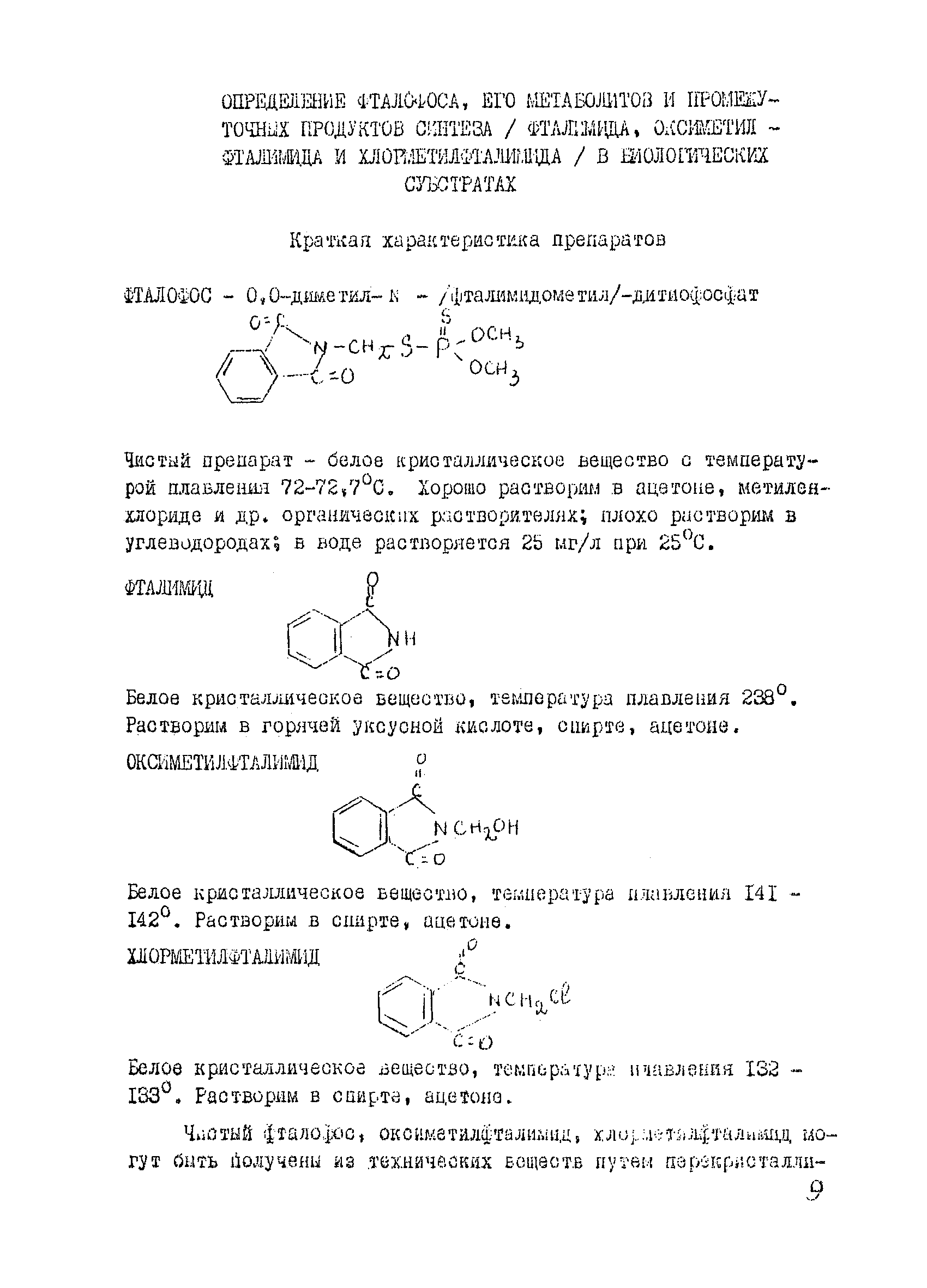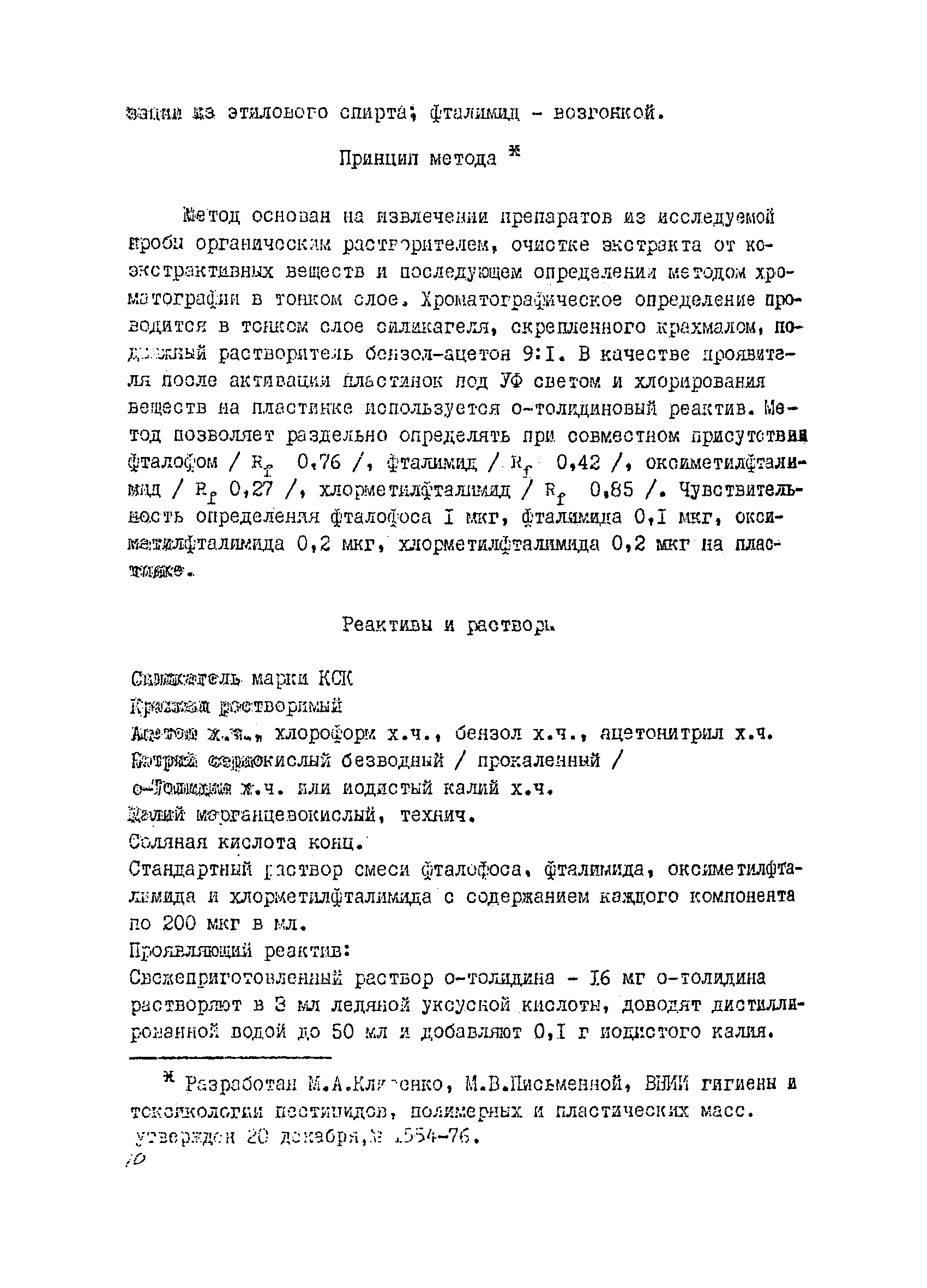 Определение фталофоса, его метаболитов и промежуточных продуктов синтеза (фталимида, оксиметил-фталимида и хлорметилфталимида) в биологических субстратах| Статус: | информационный документ | | Название рус.: | Определение фталофоса, его метаболитов и промежуточных продуктов синтеза (фталимида, оксиметил-фталимида и хлорметилфталимида) в биологических субстратах | | Дата добавления в базу: | 01.02.2020 | | Дата актуализации: | 01.01.2021 | | Оглавление: | Краткая характеристика препаратов Принцип метода Реактивы и растворы Приборы и посуда Приготовление пластинок Описание определения | | Утверждён: | Государственная комиссия по химическим средствам борьбы с вредителями, болезнями растений и сорняками при МСХ СССР