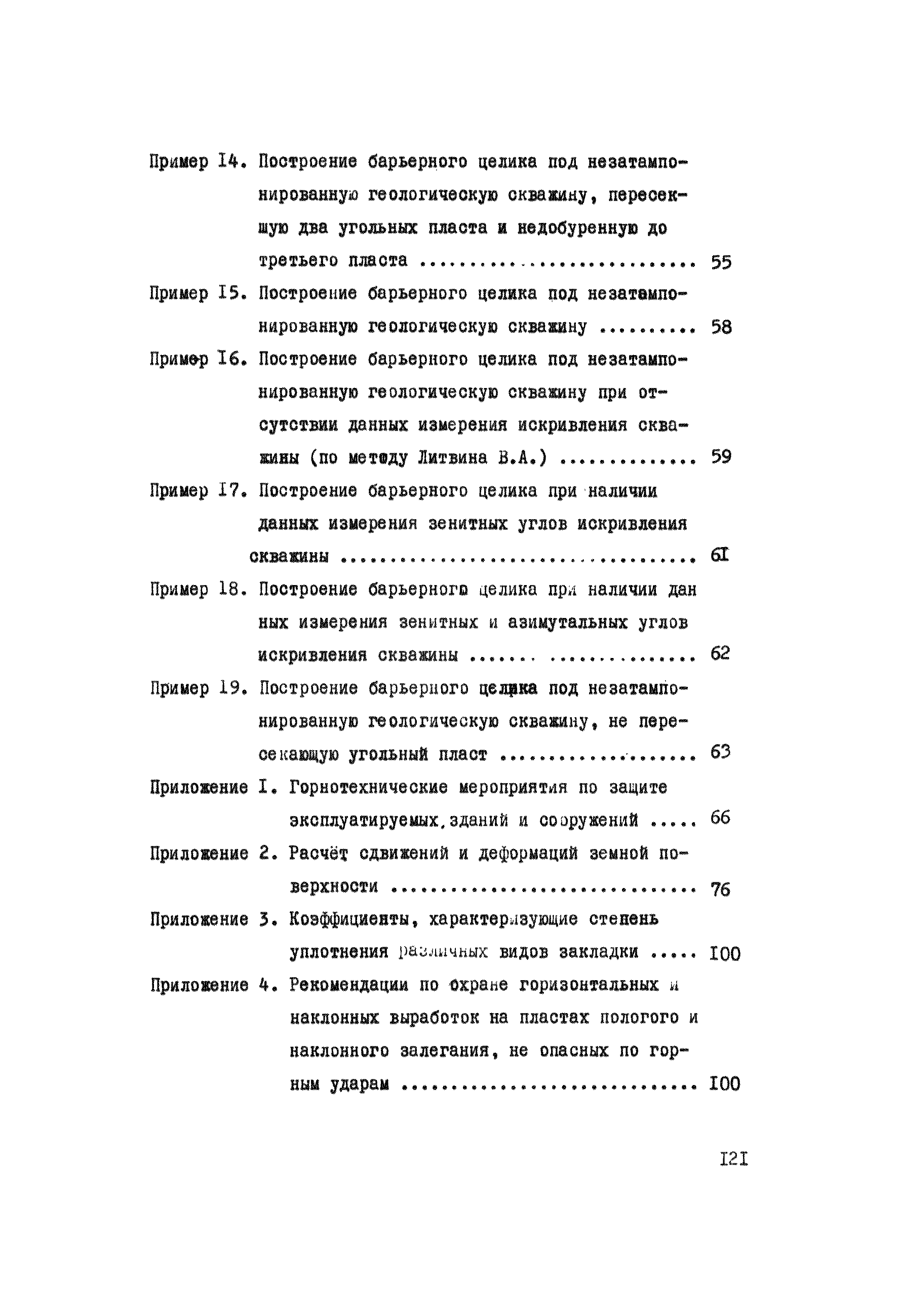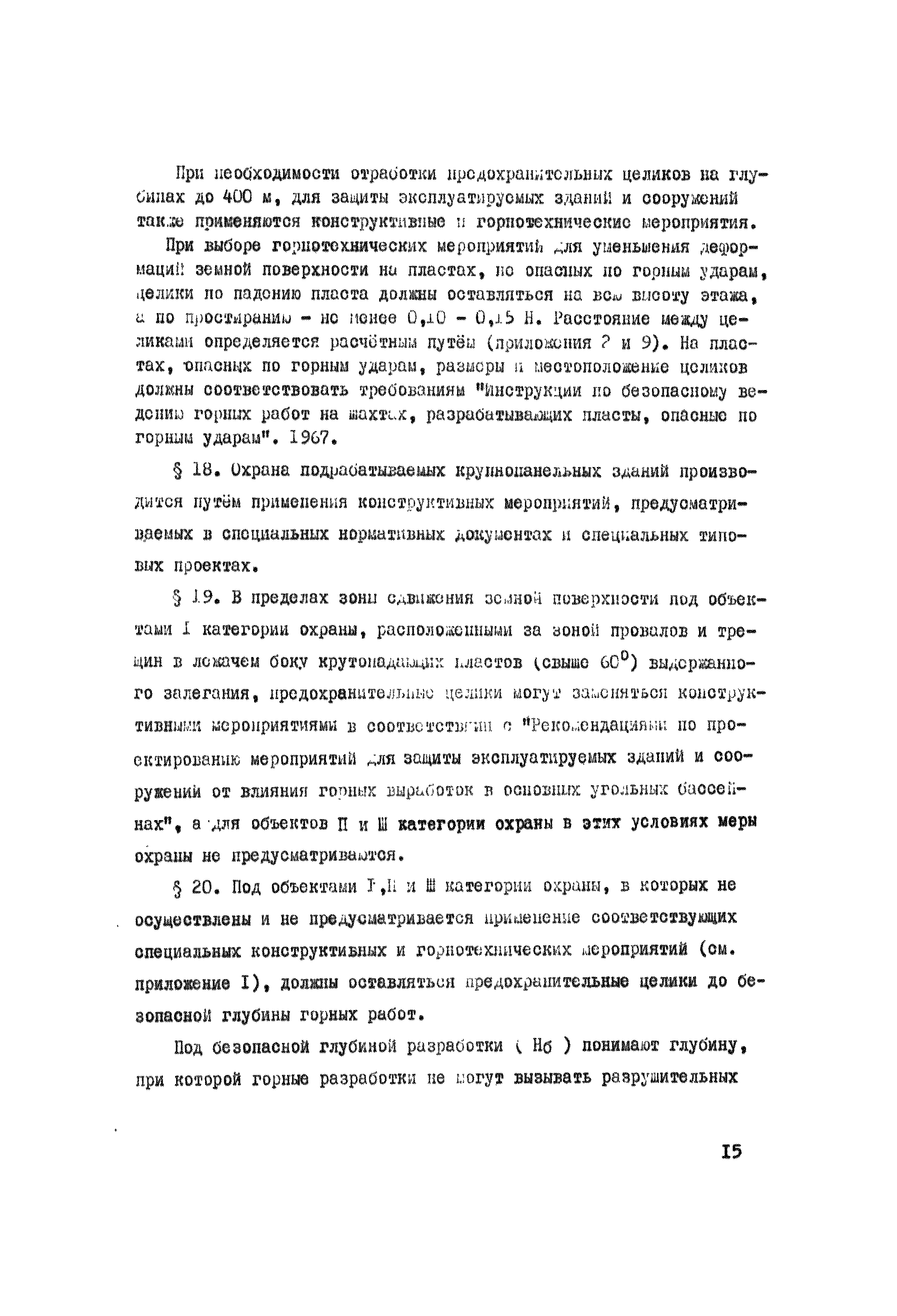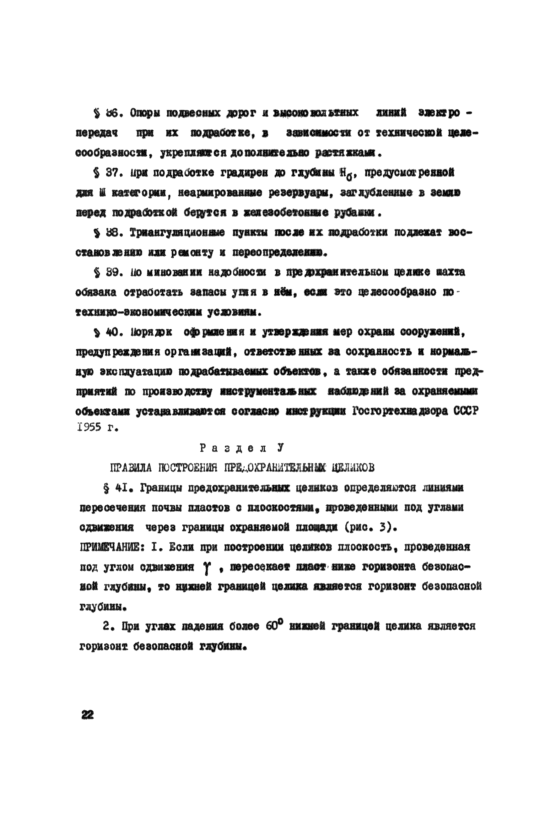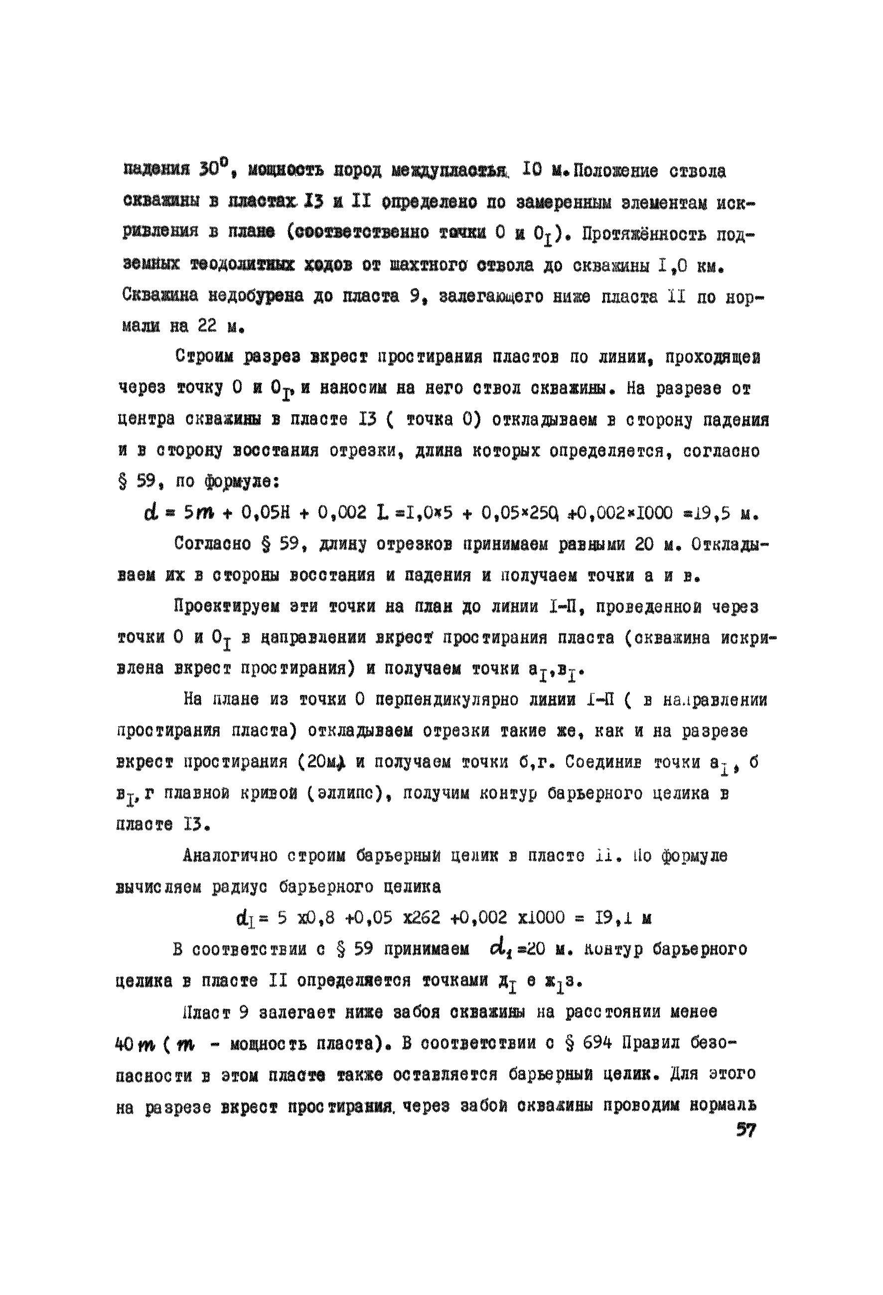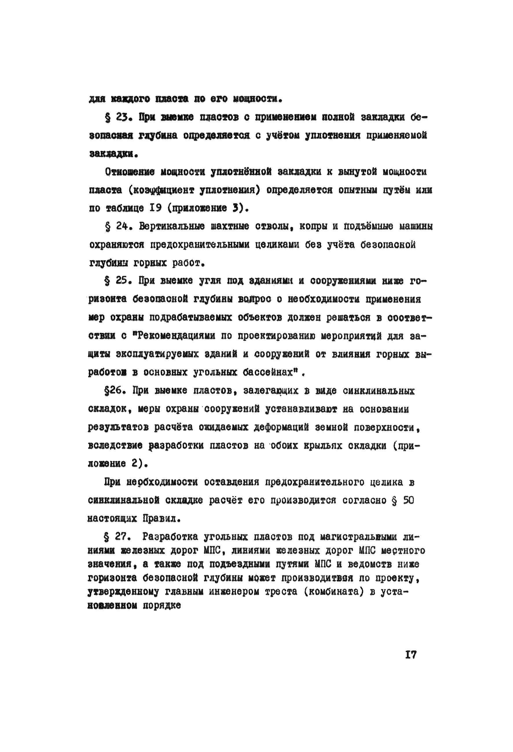 Правила охраны сооружений и природных объектов от вредного влияния подземных горных разработок в Кизеловском угольном бассейне| Статус: | отменен | | Название рус.: | Правила охраны сооружений и природных объектов от вредного влияния подземных горных разработок в Кизеловском угольном бассейне | | Дата добавления в базу: | 01.02.2020 | | Дата актуализации: | 01.01.2021 | | Область применения: | Правила являются основным и руководящим пособием для работников производства и проектных организаций по выбору мер охраны зданий, сооружений, природных объектов от вредного влияния горных выработок на шахтах Кизеловского бассейна. В Правилах даются нормы и методы защиты охраняемых объектов, излагается методика построения предохранительных целиков и приводятся основные требования для выемки угля под различными объектами. | | Оглавление: | Раздел I Определение границ зоны опасного влияния подземных разработок на подрабатываемые сооружения и другие объекты Раздел II Установление продолжительности процесса сдвижения Раздел III Разделение объектов на категории охраны Раздел IV Меры охраны сооружений и природных объектов от вредного влияния подземных разработок Раздел V Правила построения предохранительных целиков Раздел VI Правила построения барьерных целиков для охраны геологических скважин Раздел VII Примеры построения предохранительных целиков Пример 1 Построение предохранительных целиков в трех пластах для охраны зданий Пример 2 Построение предохранительных целиков для охраны магистральной железной дороги МПС Пример 3 Построение предохранительного целика для охраны реки Пример 4 Построение предохранительного целика для охраны наклонного шахтного ствола при угле падения пластов не менее 60 градусов Пример 5 Построение предохранительного целика в пласте с невыдержанными элементами залегания Пример 6 Построение предохранительного целика для охраны промплощадки Пример 7 Построение предохранительного целика минимальных размеров для охраны сооружения, расположенного диагонально к простиранию пласта Пример 8 Построение предохранительного целика для охраны сооружения I категории, расположенного в лежачем боку крутопадающего пласта Пример 9 Построение предохранительного целика для охраны сооружения I категории, расположенного в висячем боку крутопадающего пласта Пример 10 Построение предохранительного целика при опрокинутом залегании пласта/объект расположен в висячем боку/ Пример 11 Построение предохранительного целика при опрокинутом залегании пласта/объект расположен в лежачем боку/ Пример 12 Построение предохранительного целика для охраны сооружения, расположенного над крылом синклинальной складки Пример 13 Построение предохранительного целика для охраны сооружения I категории, расположенного над осью антиклинальной складки Пример 14 Построение барьерного целика под незатампонированную геологическую скважину, пересекшую для угольных пласта и недобуренную до третьего пласта Пример 15 Построение барьерного целика под незатампонированную геологическую скважину Пример 16 Построение барьерного целика под незатампонированную геологическую скважину при отсутствии данных измерения искривления скважины Пример 17 Построение барьерного целика при наличии данных измерения зенитных углов искривления скважины Пример 18 Постро