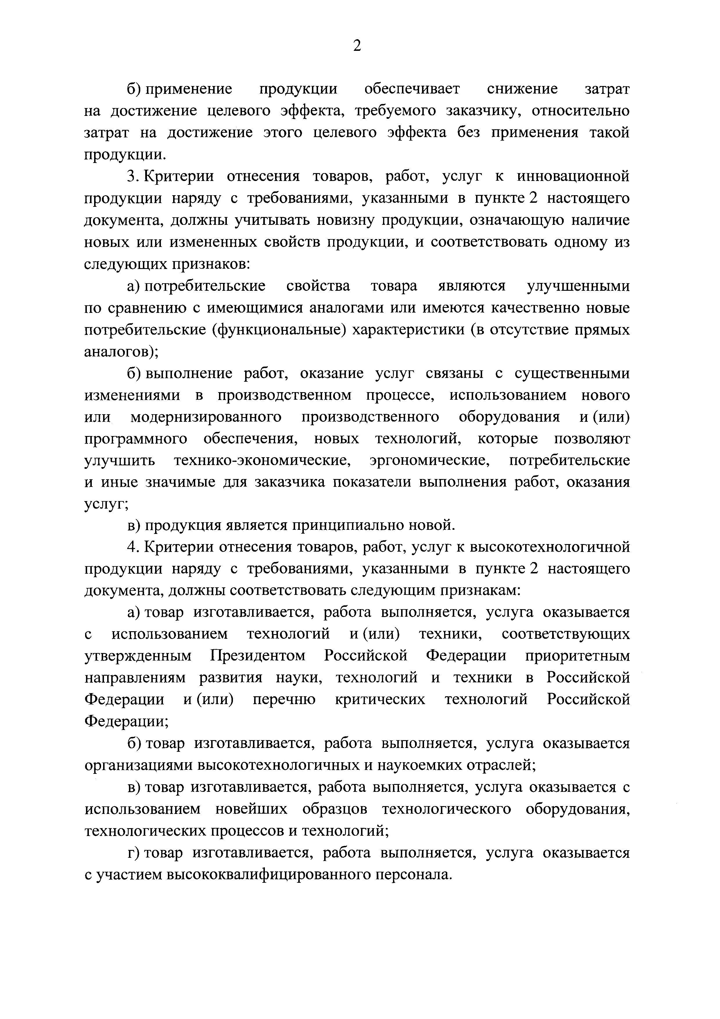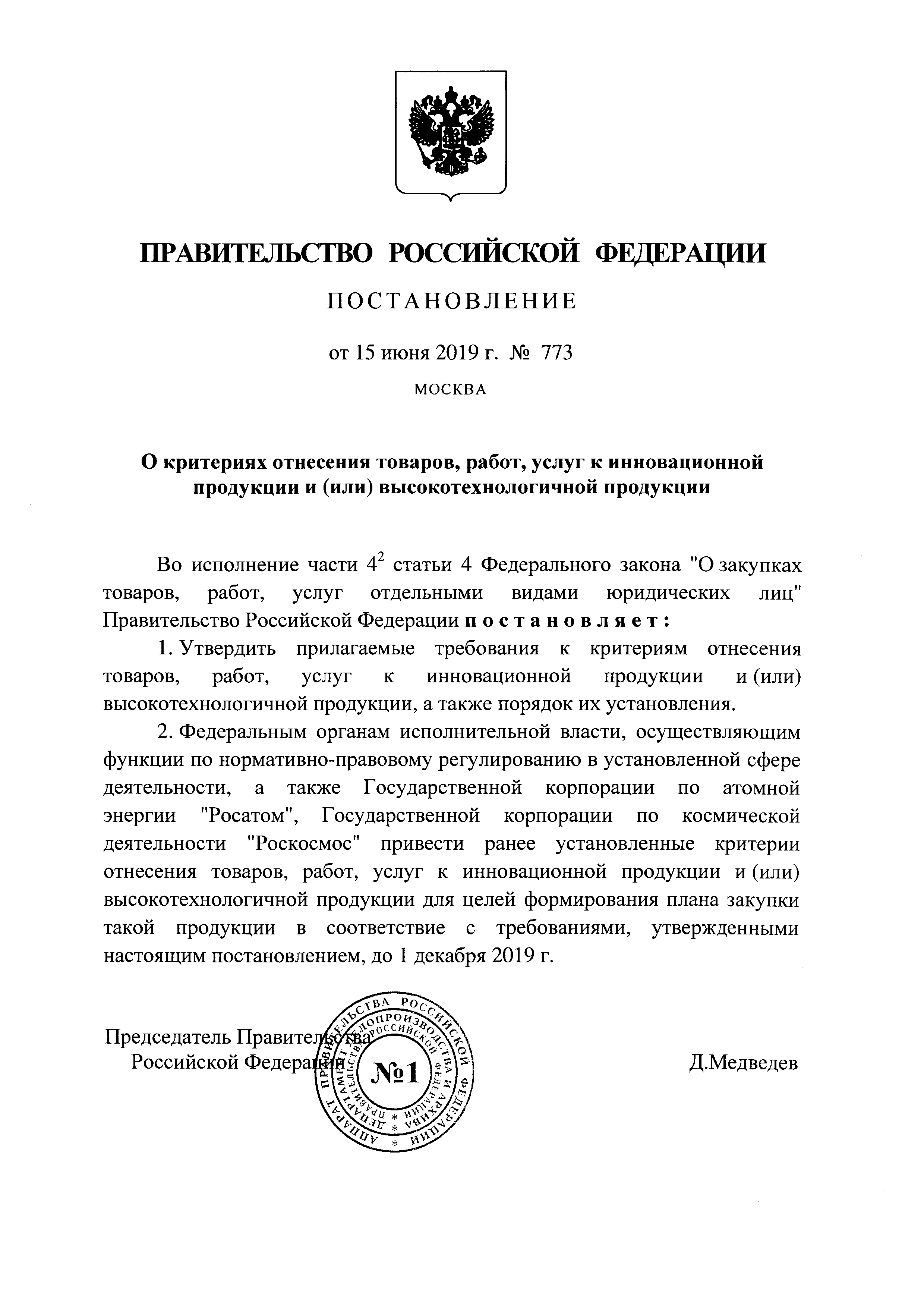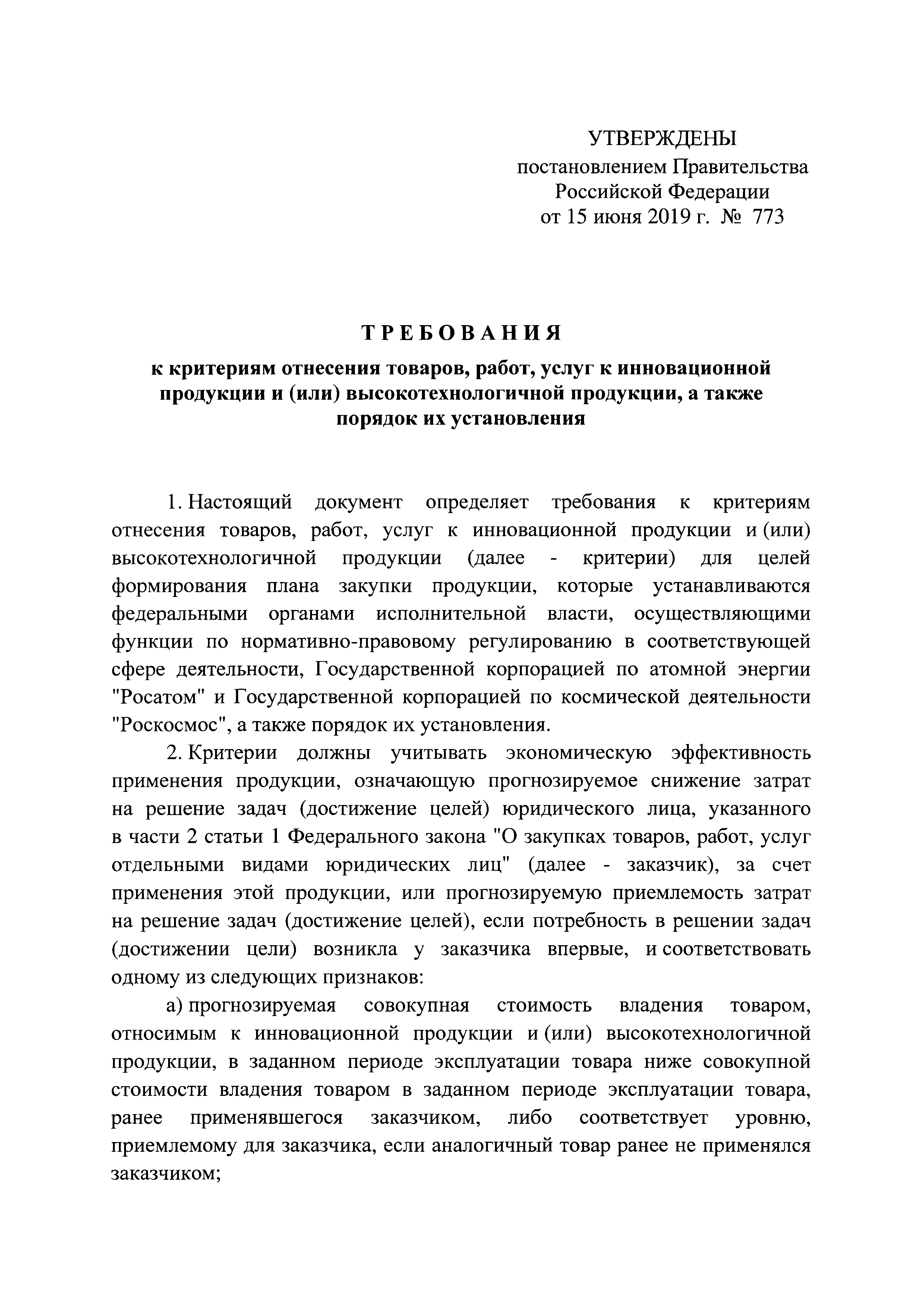 Требования к критериям отнесения товаров, работ, услуг к инновационной продукции и (или) высокотехнологичной продукции, а также порядок их установления| Статус: | действует | | Название рус.: | Требования к критериям отнесения товаров, работ, услуг к инновационной продукции и (или) высокотехнологичной продукции, а также порядок их установления | | Дата добавления в базу: | 01.02.2020 | | Дата актуализации: | 01.01.2021 | | Дата введения: | 26.06.2019 | | Область применения: | Документ определяет требования к критериям отнесения товаров, работ, услуг к инновационной продукции и (или) высокотехнологичной продукции для целей формирования плана закупки продукции, которые устанавливаются федеральными органами исполнительной власти, осуществляющими функции по нормативно-правовому регулированию в соответствующей сфере деятельности, Государственной корпорацией по атомной энергии "Росатом" и Государственной корпорацией по космической деятельности "Роскосмос", а также порядок их установления | | Утверждён: | 15.06.2019 Правительство Российской Федерации (773)