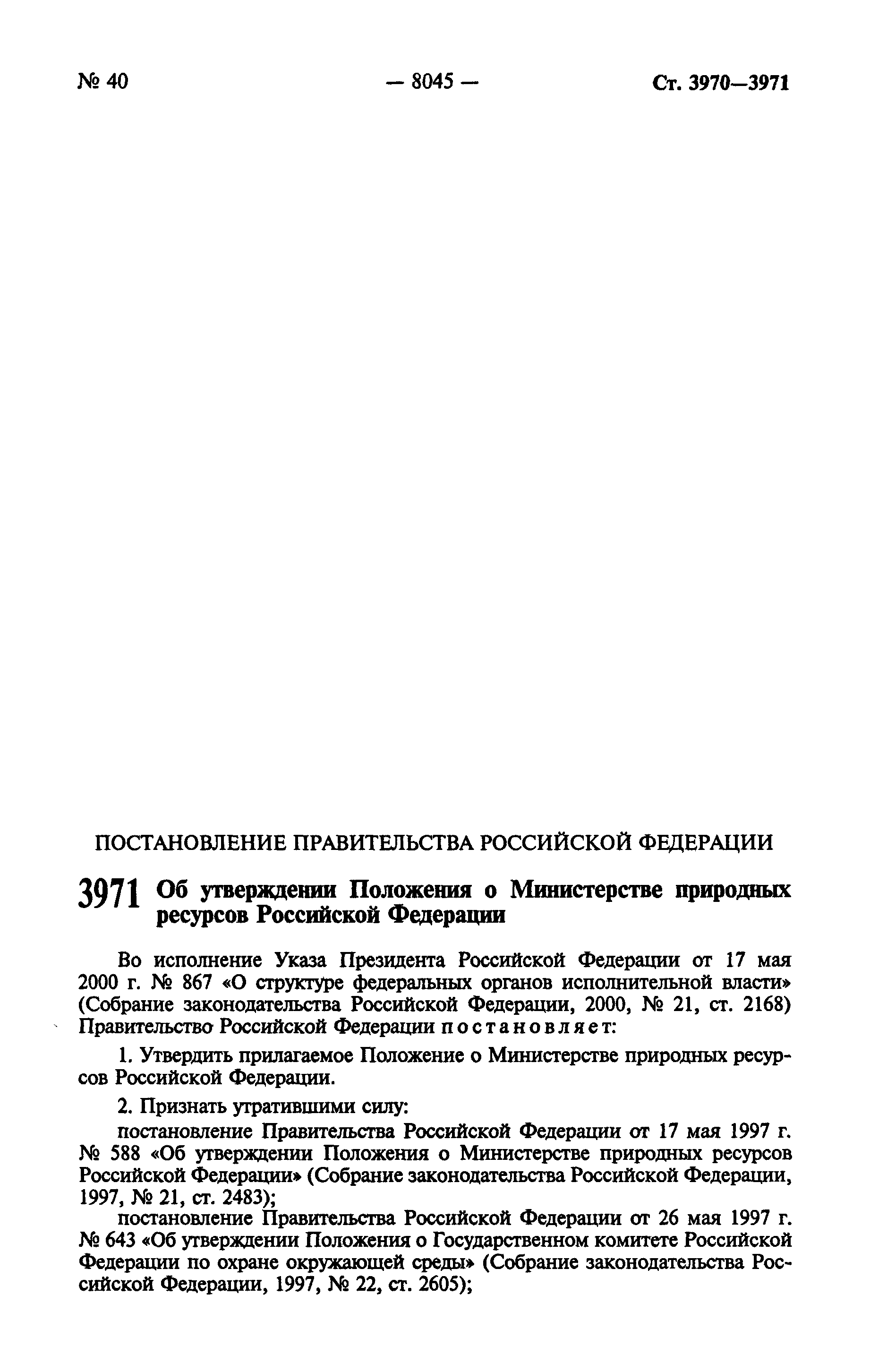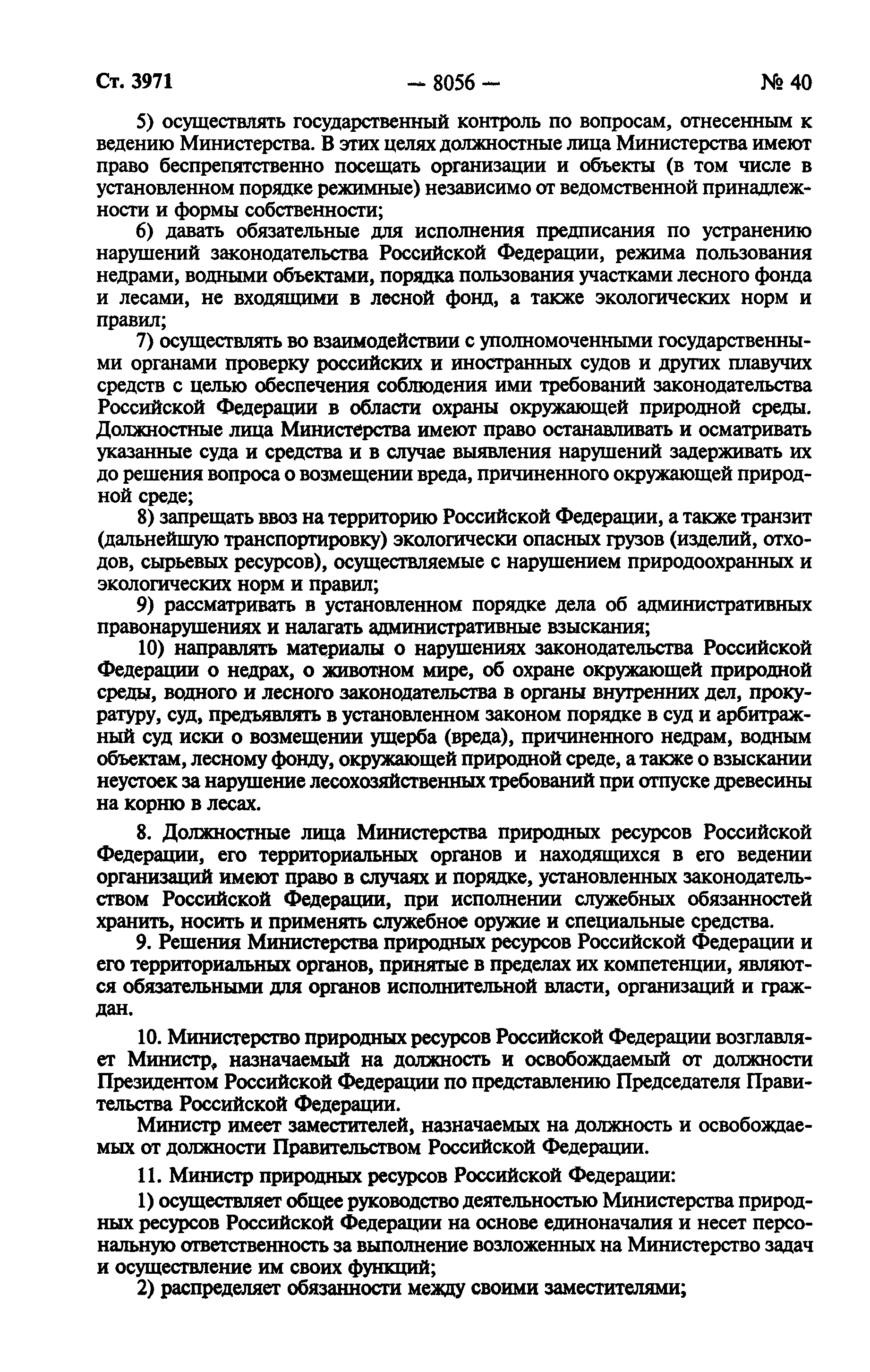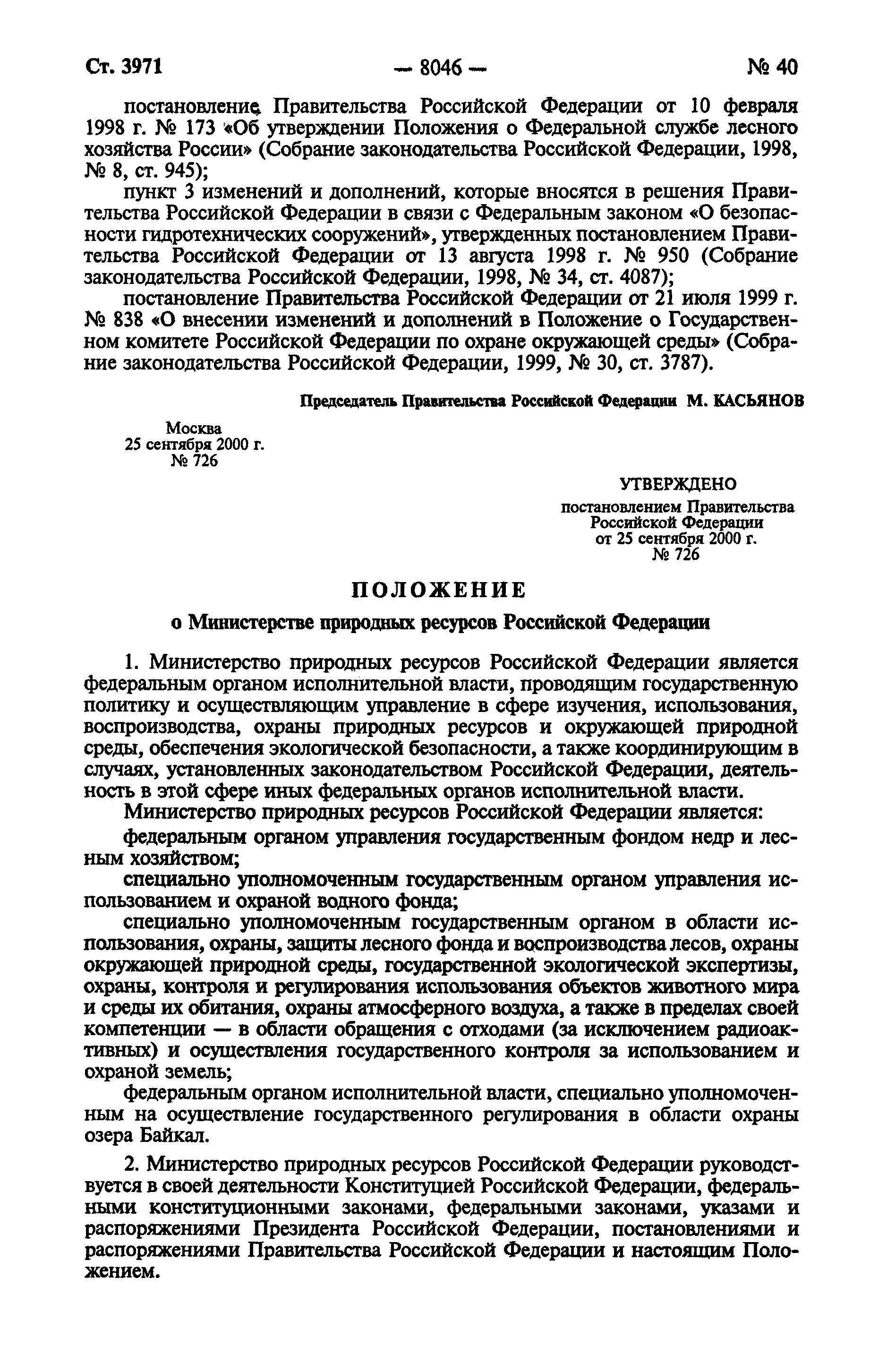 Положение о Министерстве природных ресурсов Российской Федерации| Статус: | утратил силу | | Название рус.: | Положение о Министерстве природных ресурсов Российской Федерации | | Дата добавления в базу: | 01.02.2020 | | Дата актуализации: | 01.01.2021 | | Дата введения: | 10.10.2000 | | Дата окончания срока действия: | 05.08.2004 | | Утверждён: | 02.10.2000 Правительство Российской Федерации (726)
