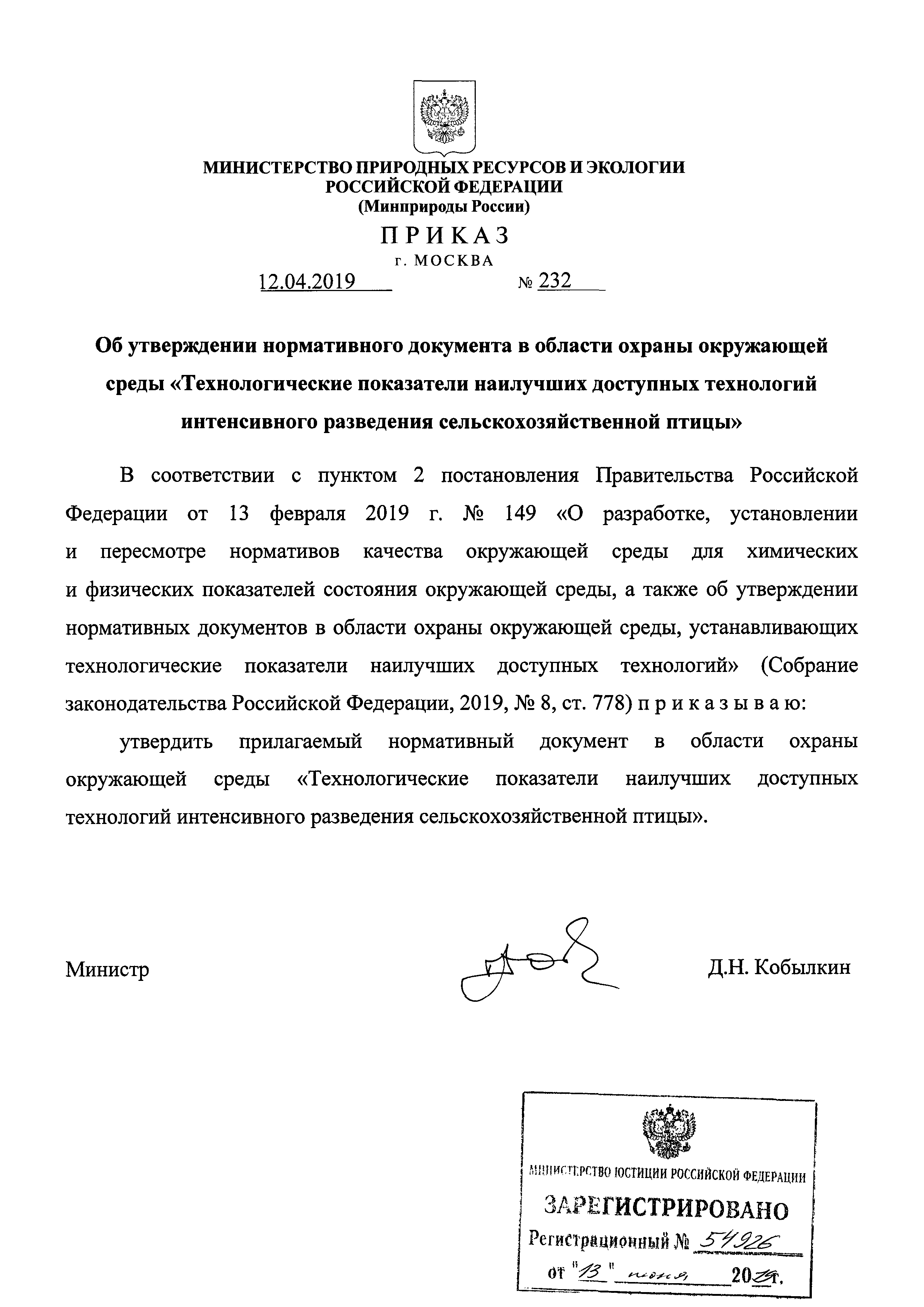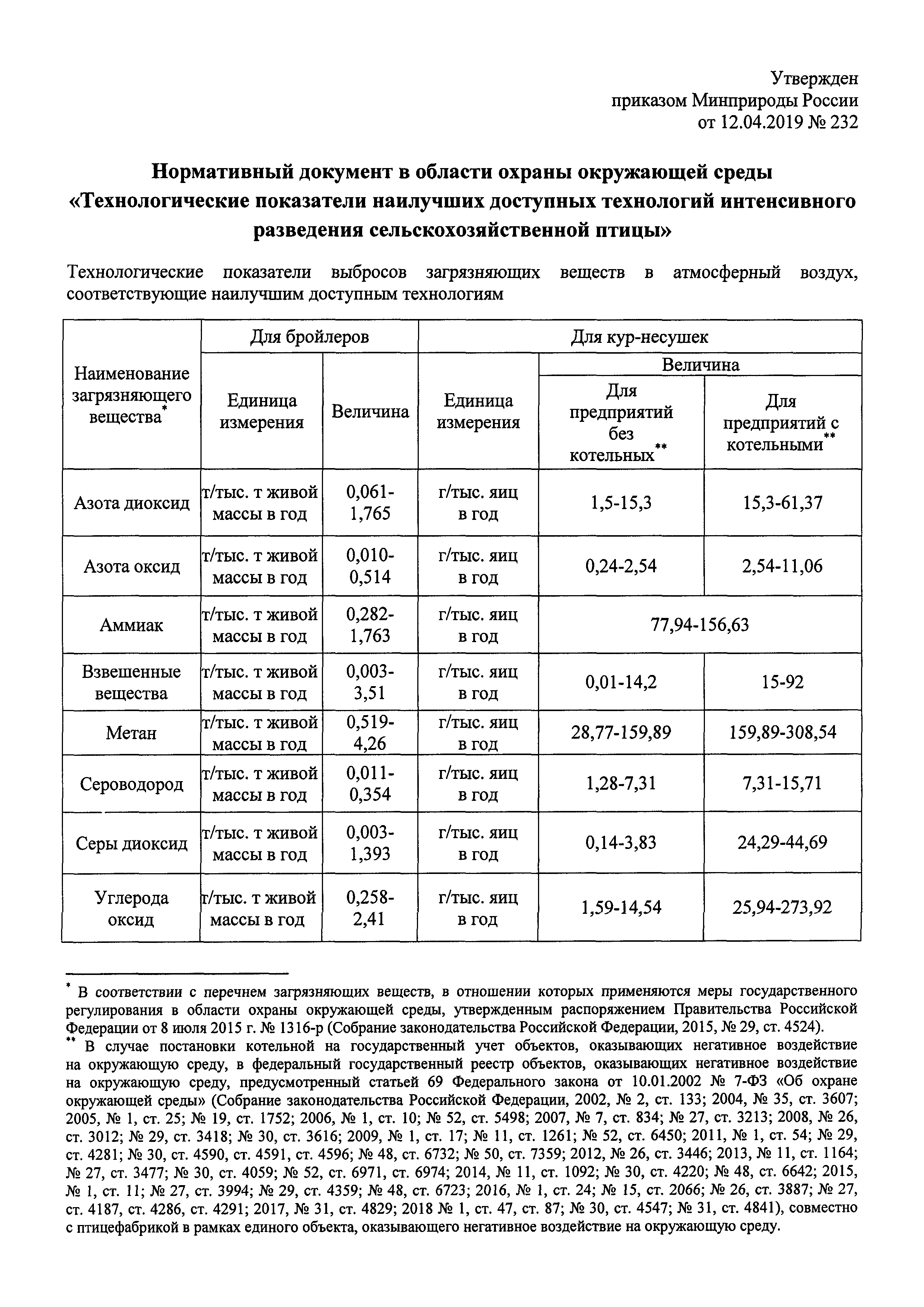 Нормативный документ в области охраны окружающей среды "Технологические показатели наилучших доступных технологий интенсивного разведения сельскохозяйственной птицы"| Статус: | действует | | Название рус.: | Нормативный документ в области охраны окружающей среды "Технологические показатели наилучших доступных технологий интенсивного разведения сельскохозяйственной птицы" | | Дата добавления в базу: | 01.02.2020 | | Дата актуализации: | 01.01.2021 | | Дата введения: | 25.06.2019 | | Утверждён: | 12.04.2019 Министерство природных ресурсов и экологии Российской Федерации (232)