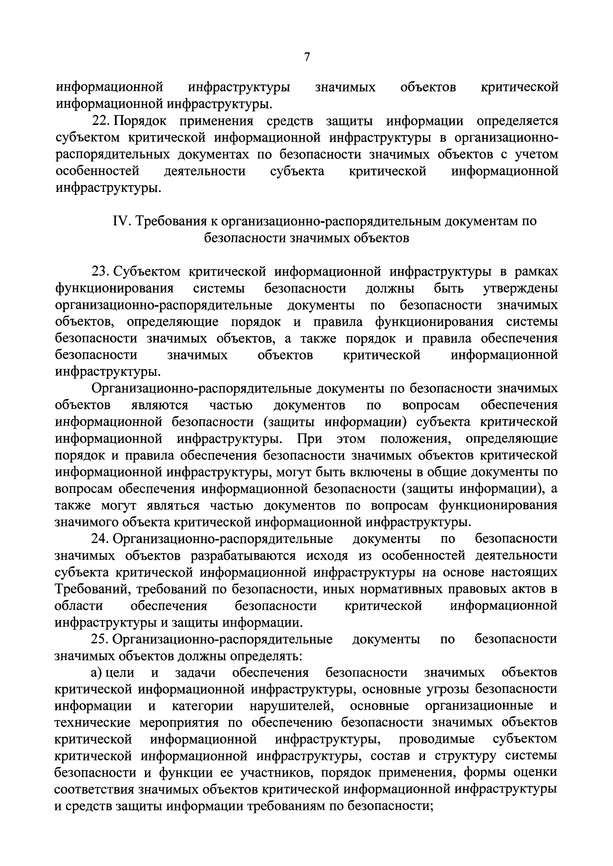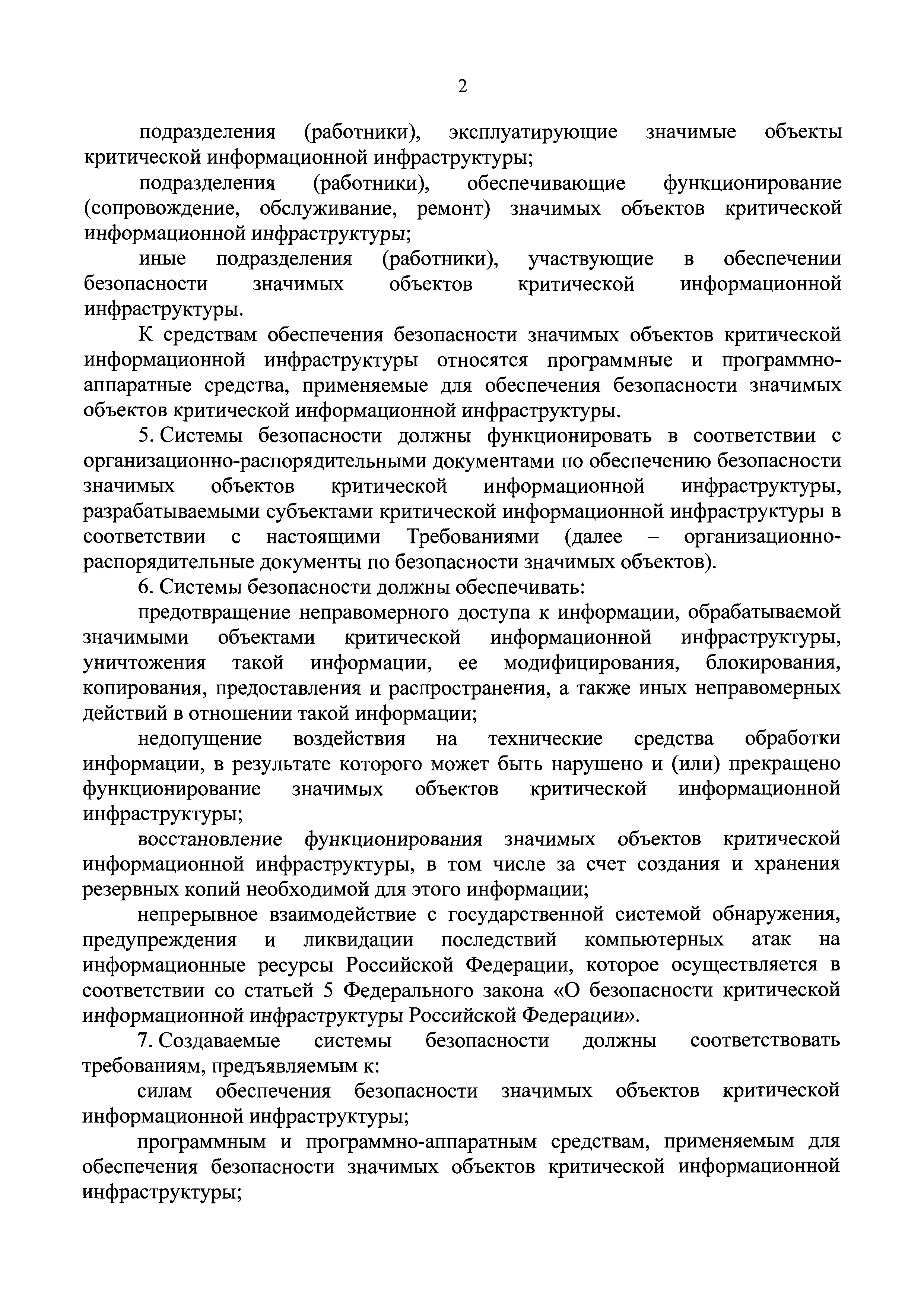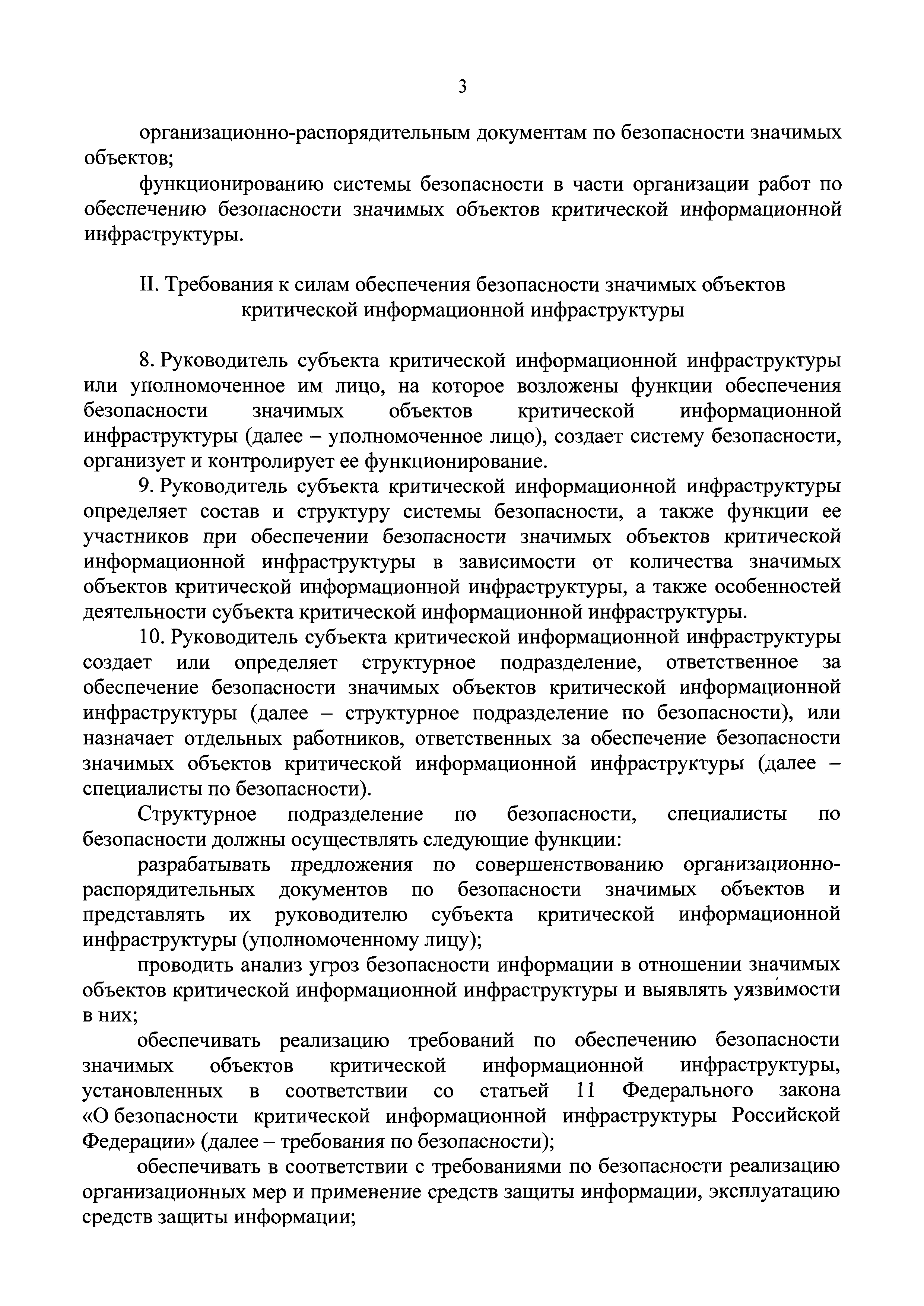| Оглавление: | I. Общие положения II. Требования к силам обеспечения безопасности значимых объектов критической информационной инфраструктуры III. Требования к программным и программно-аппаратным средствам, применяемым для обеспечения безопасности значимых объектов критической информационной инфраструктуры IV. Требования к организационно-распорядительным документам по безопасности значимых объектов V. Требования к функционированию системы безопасности в части организации работ по обеспечению безопасности значимых объектов критической информационной инфраструктуры |