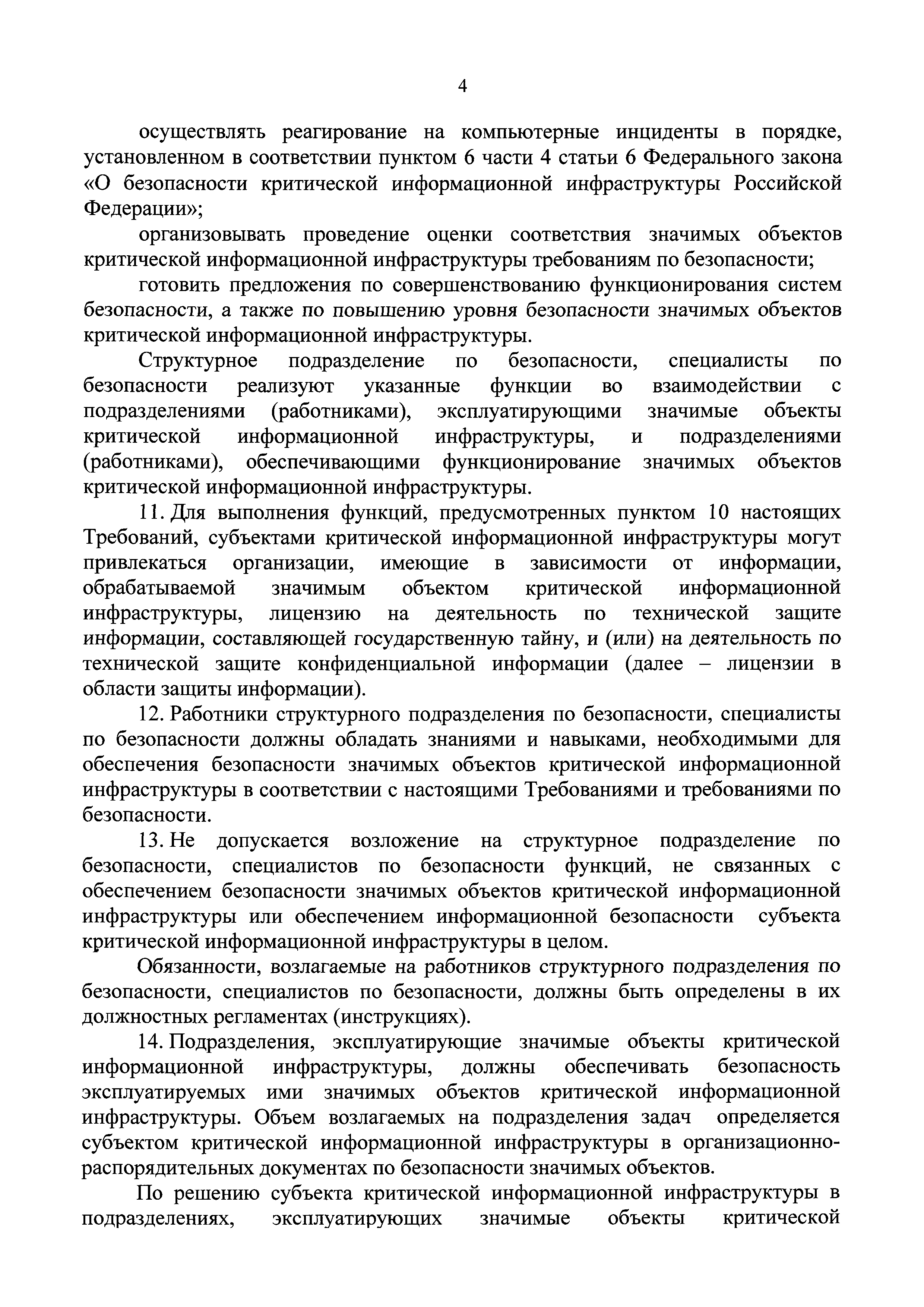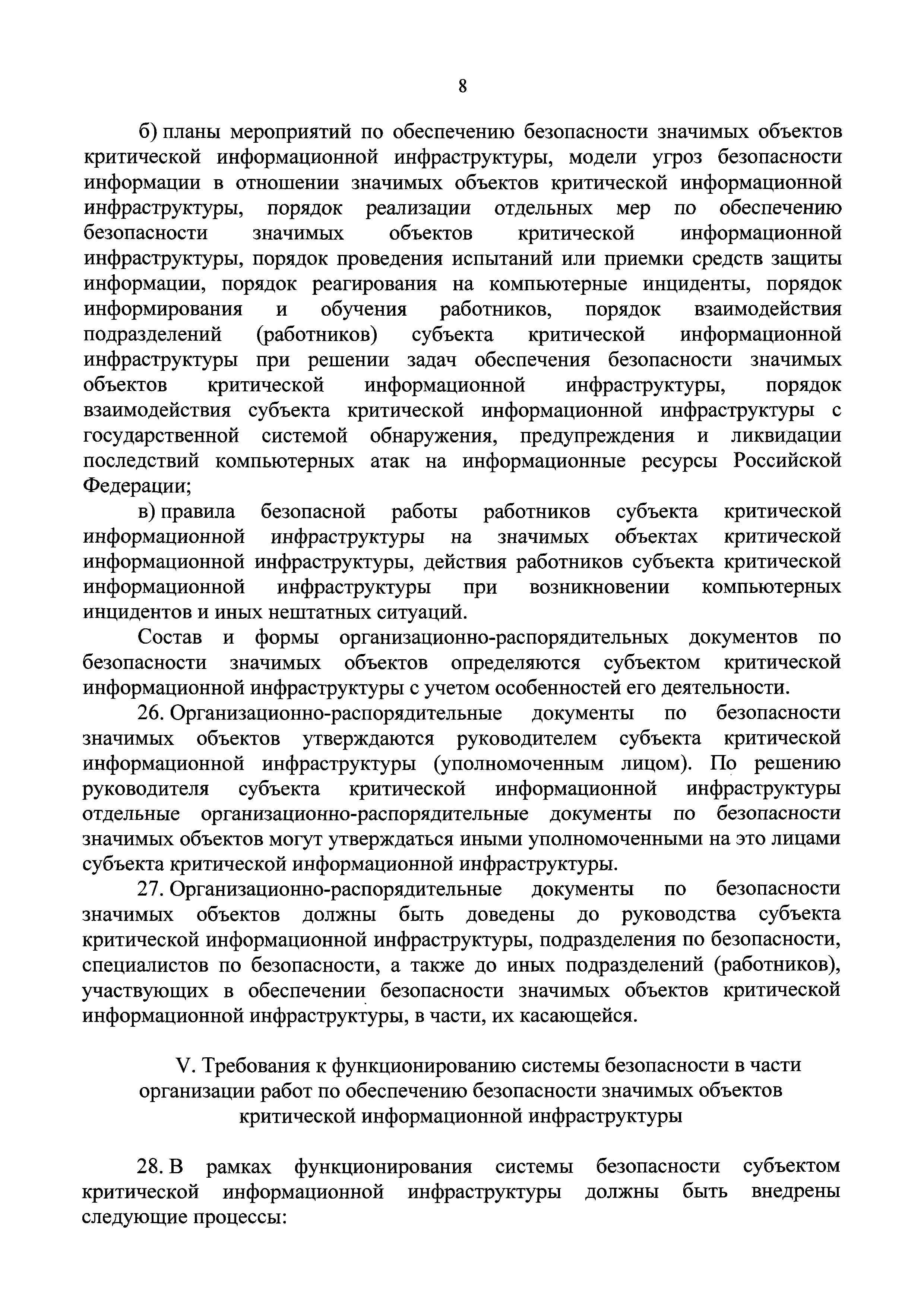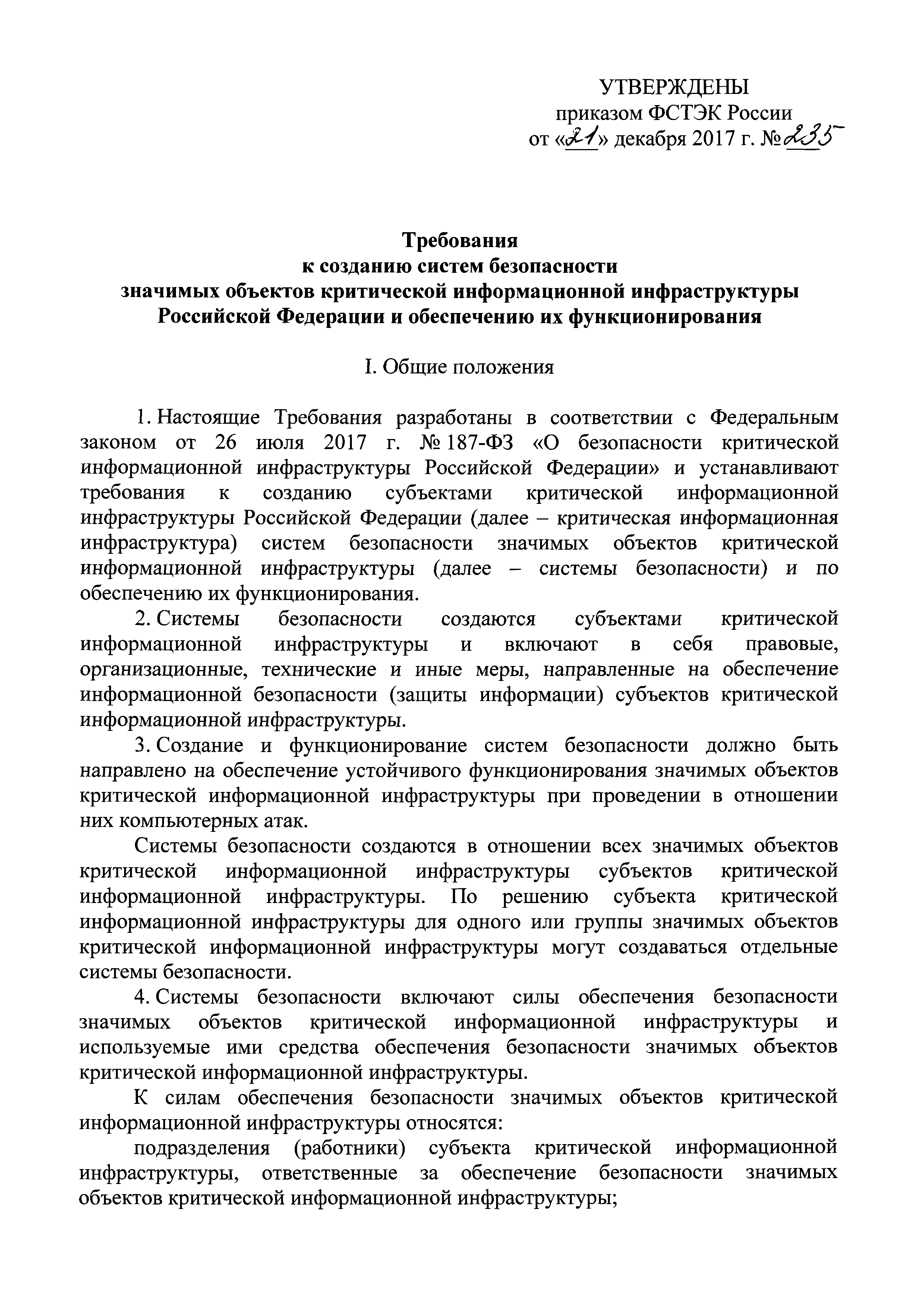 | Оглавление: | I. Общие положения II. Требования к силам обеспечения безопасности значимых объектов критической информационной инфраструктуры III. Требования к программным и программно-аппаратным средствам, применяемым для обеспечения безопасности значимых объектов критической информационной инфраструктуры IV. Требования к организационно-распорядительным документам по безопасности значимых объектов V. Требования к функционированию системы безопасности в части организации работ по обеспечению безопасности значимых объектов критической информационной инфраструктуры |